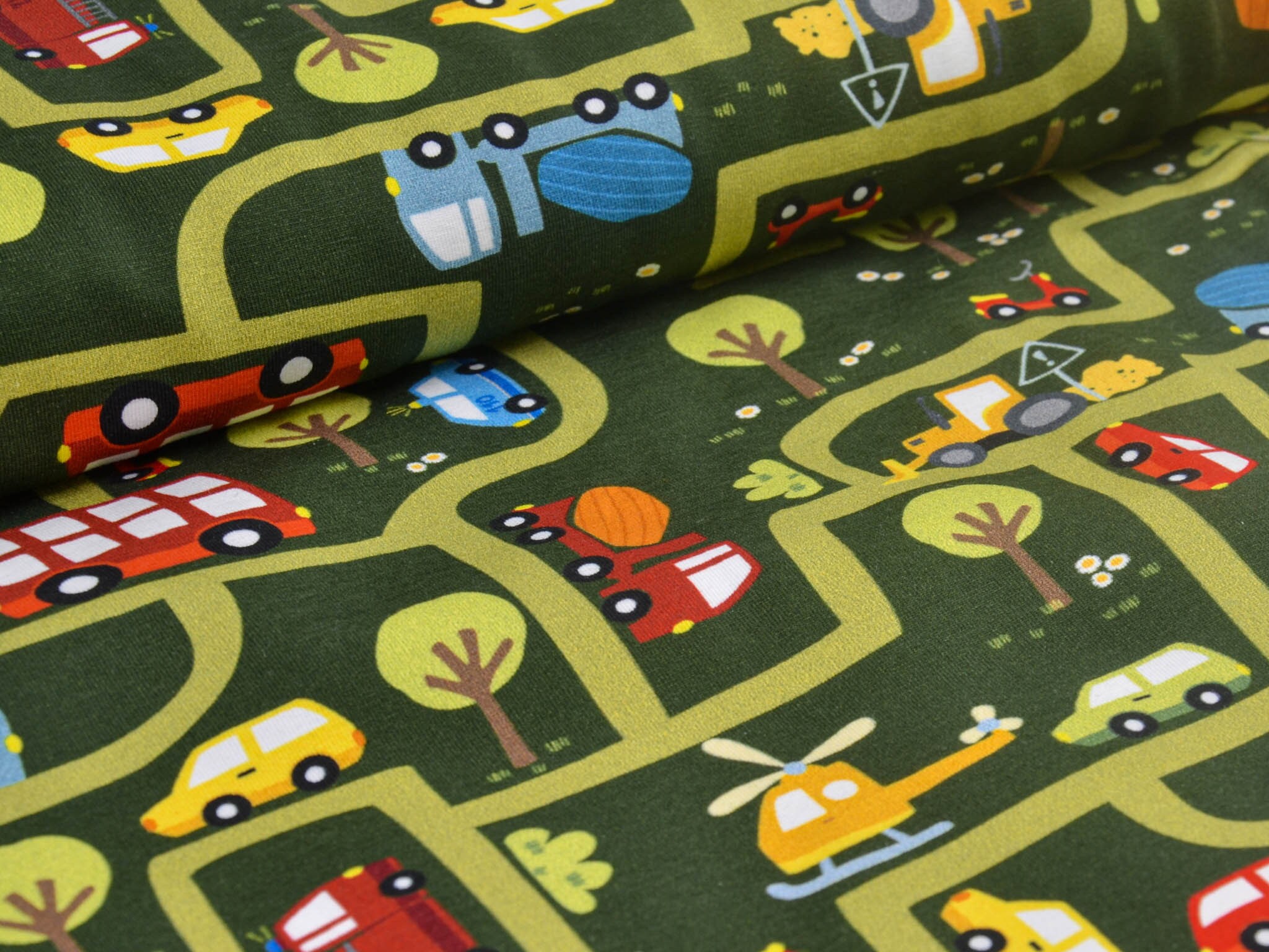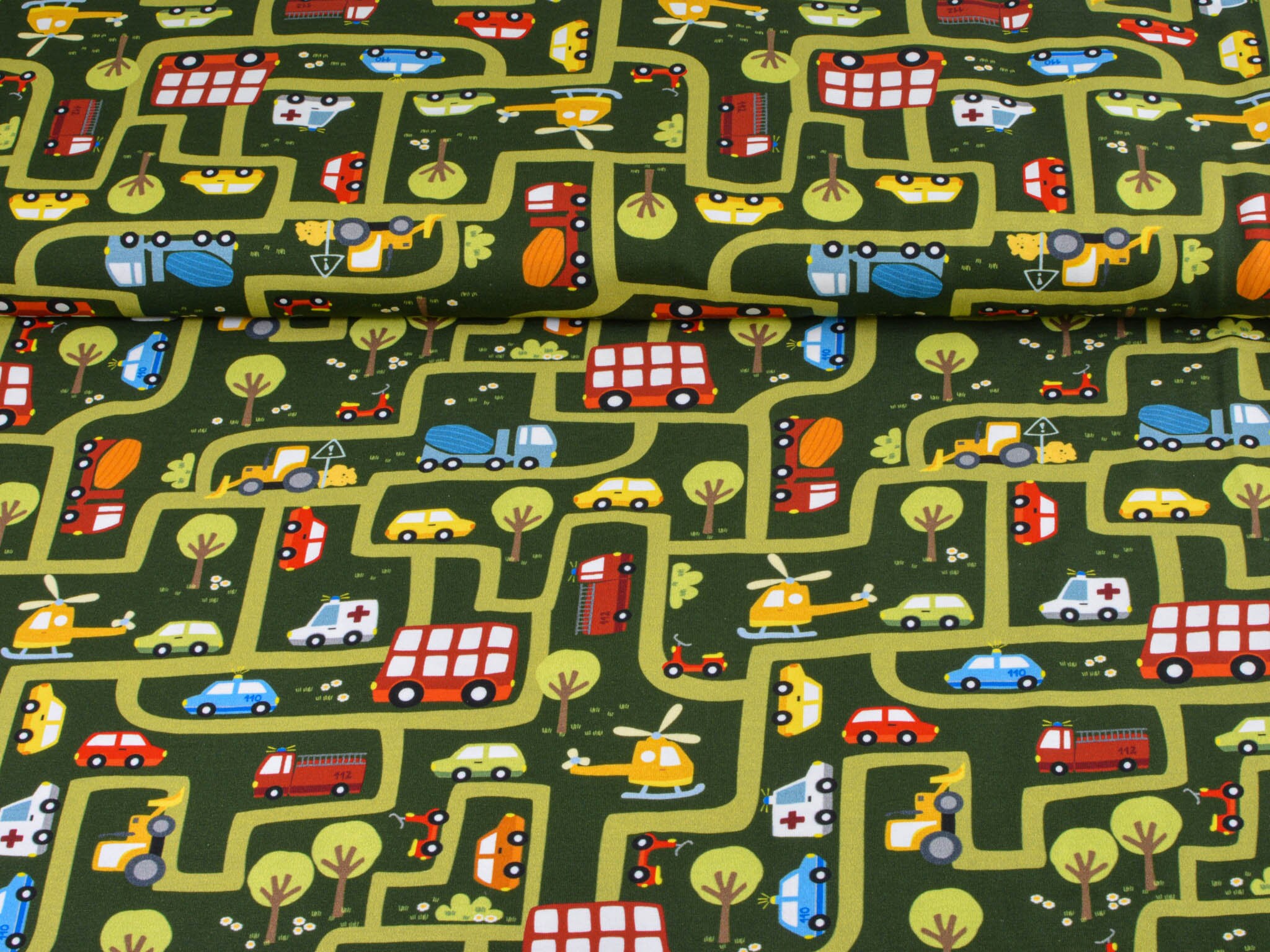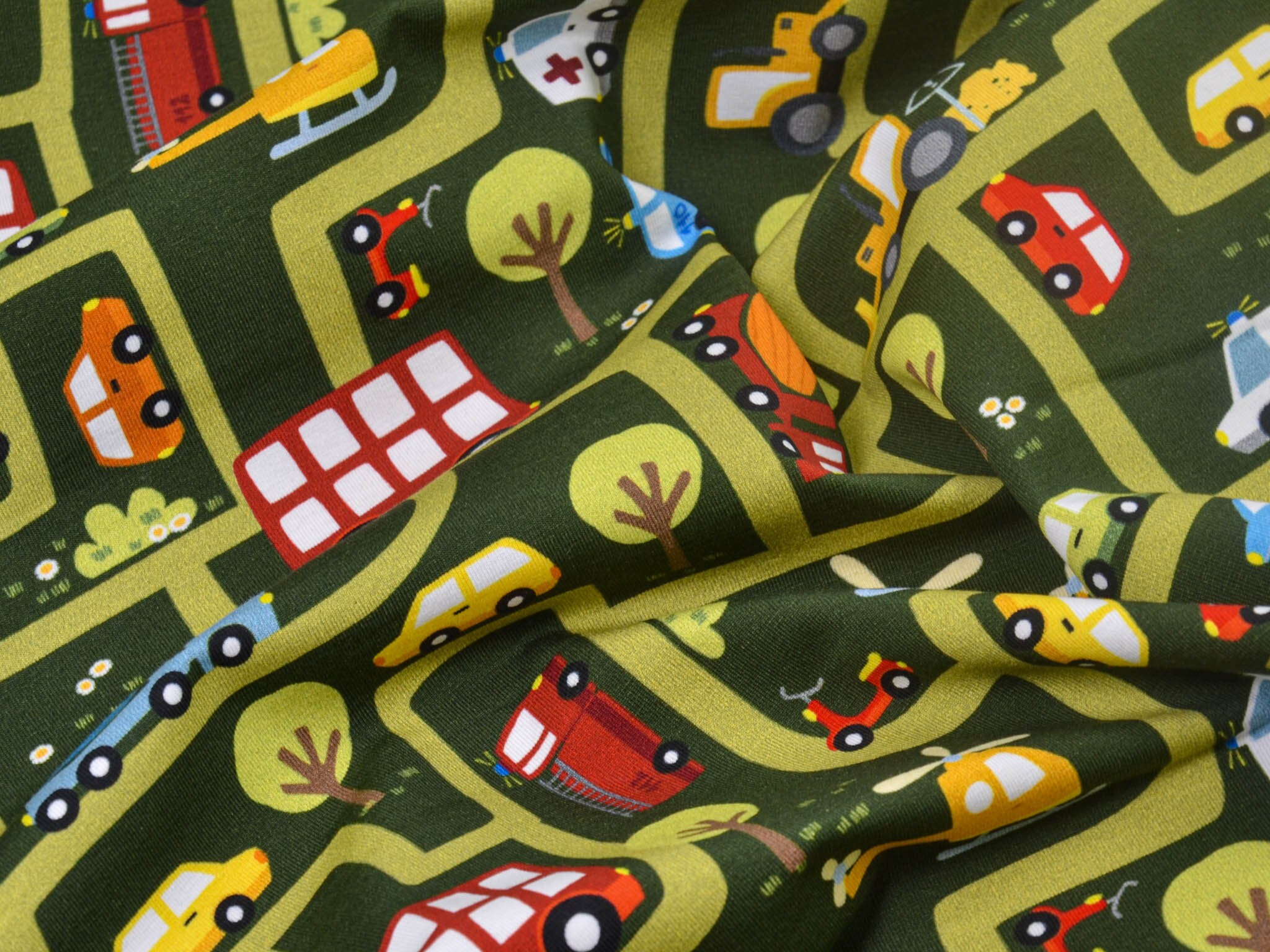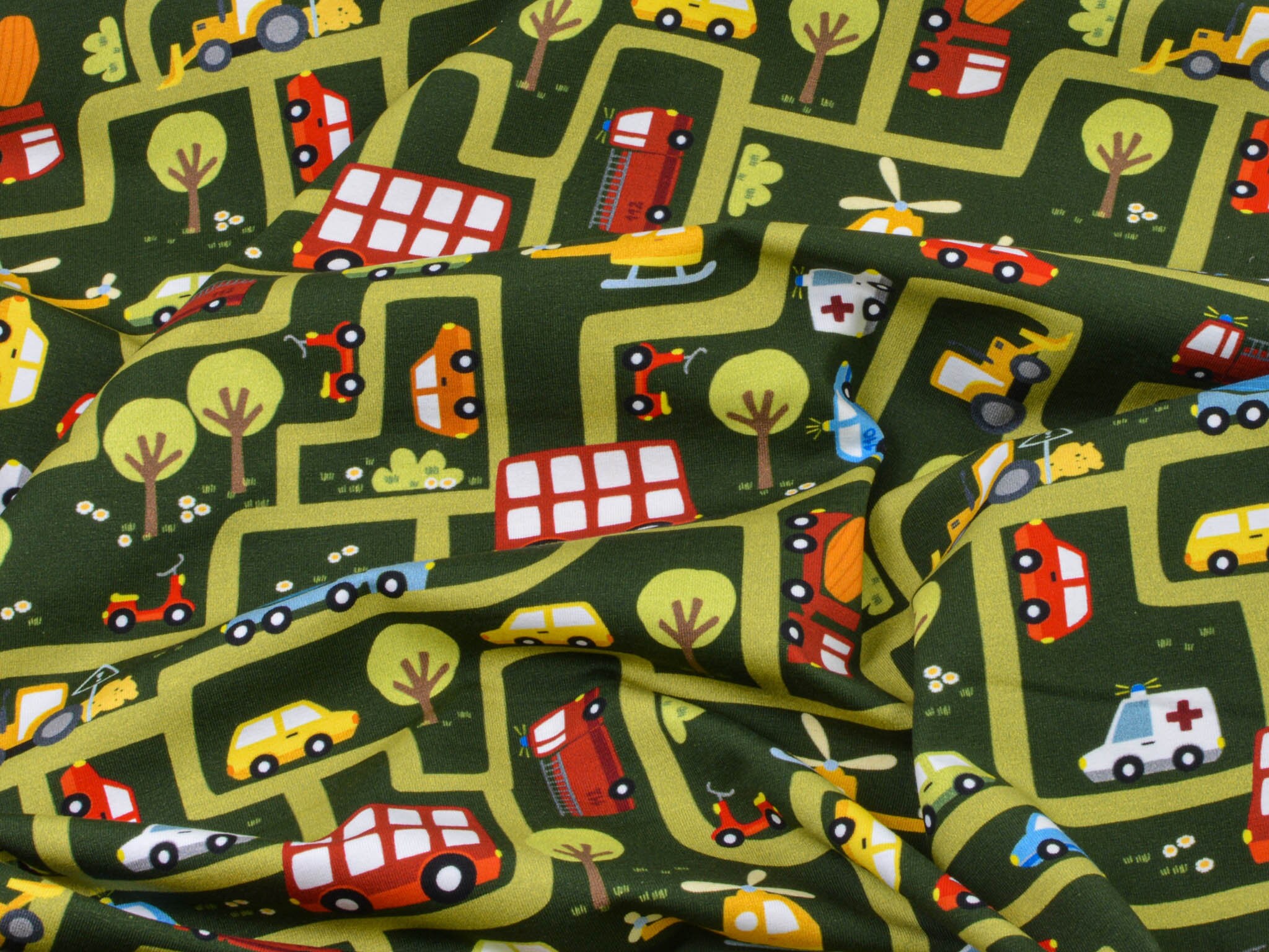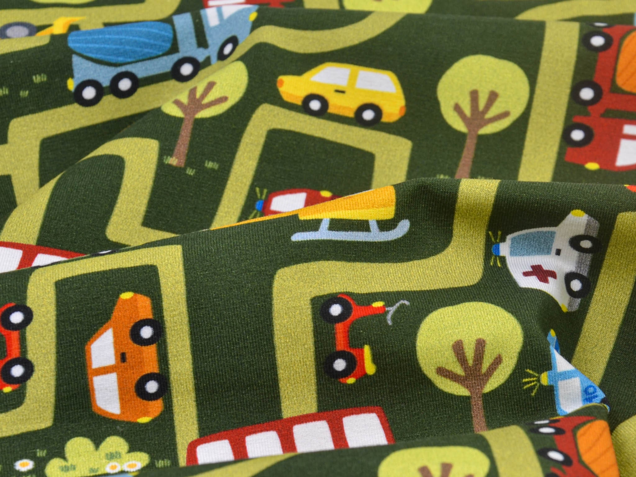 High-quality printed jersey from Hilco. The green jersey features a printed road motif. The road system includes cars, helicopters, ambulances, fire trucks, and much more. You can sew great T-shirts, bloomers, long-sleeved shirts, or hats from this cotton jersey.
