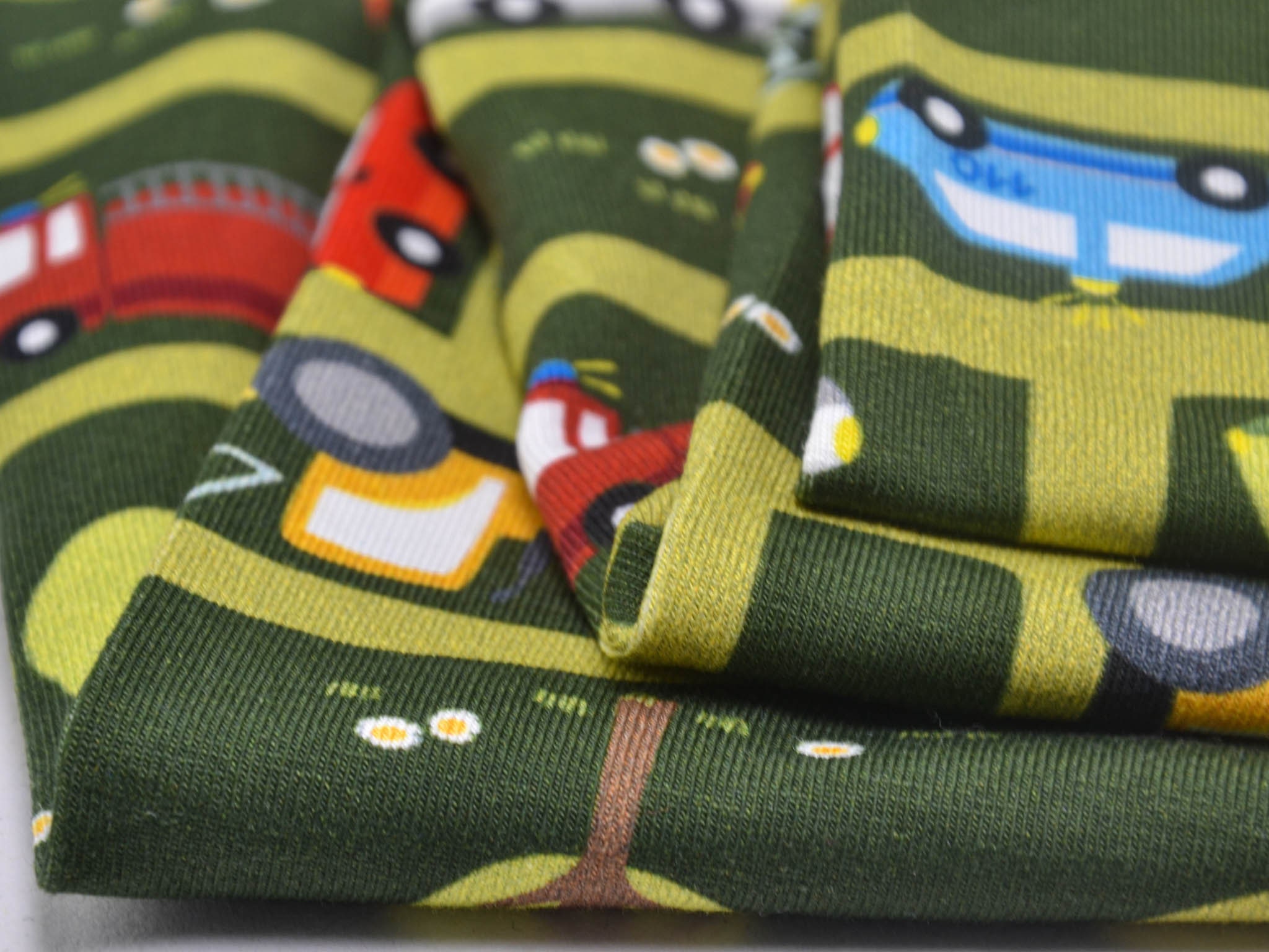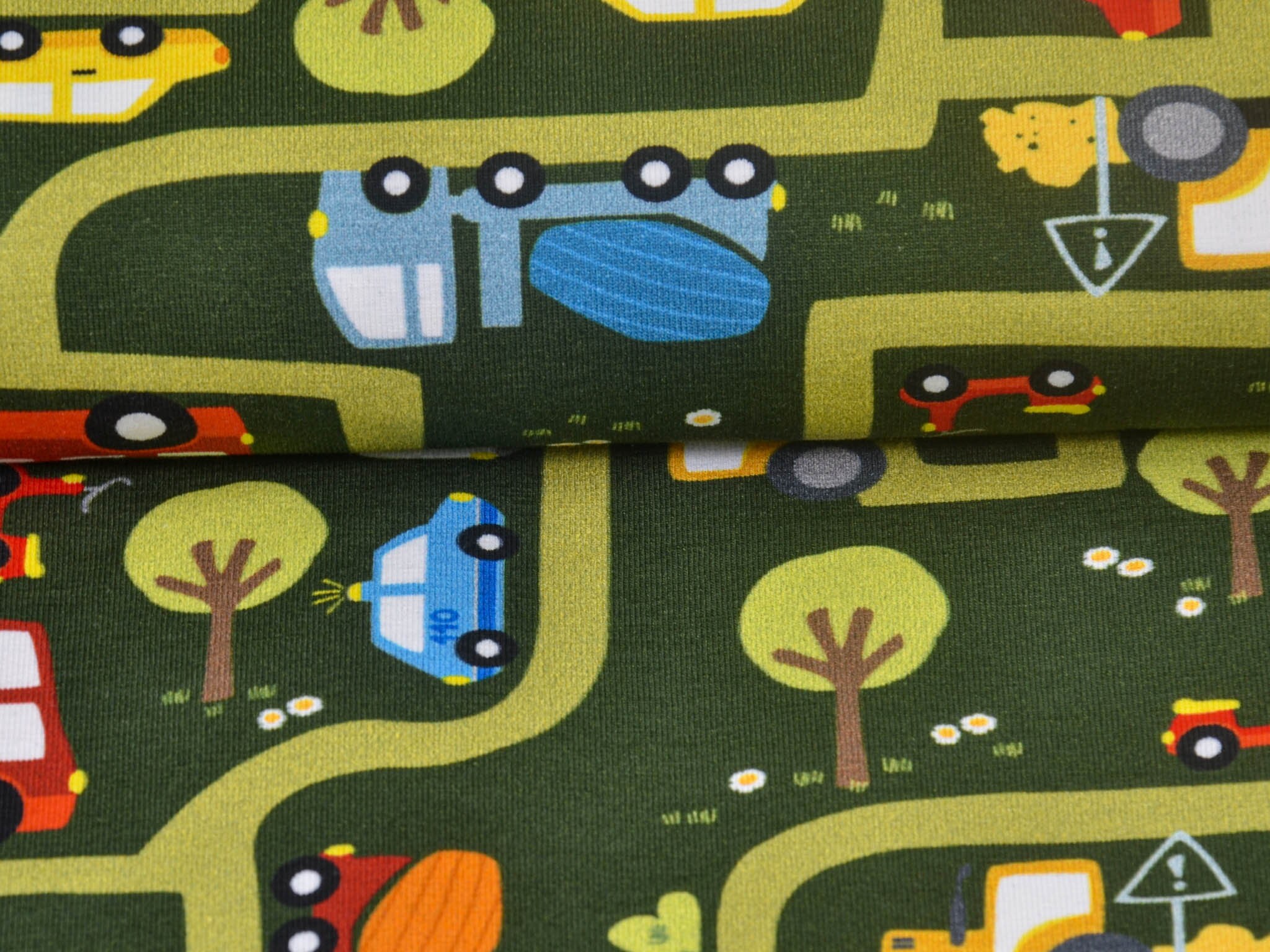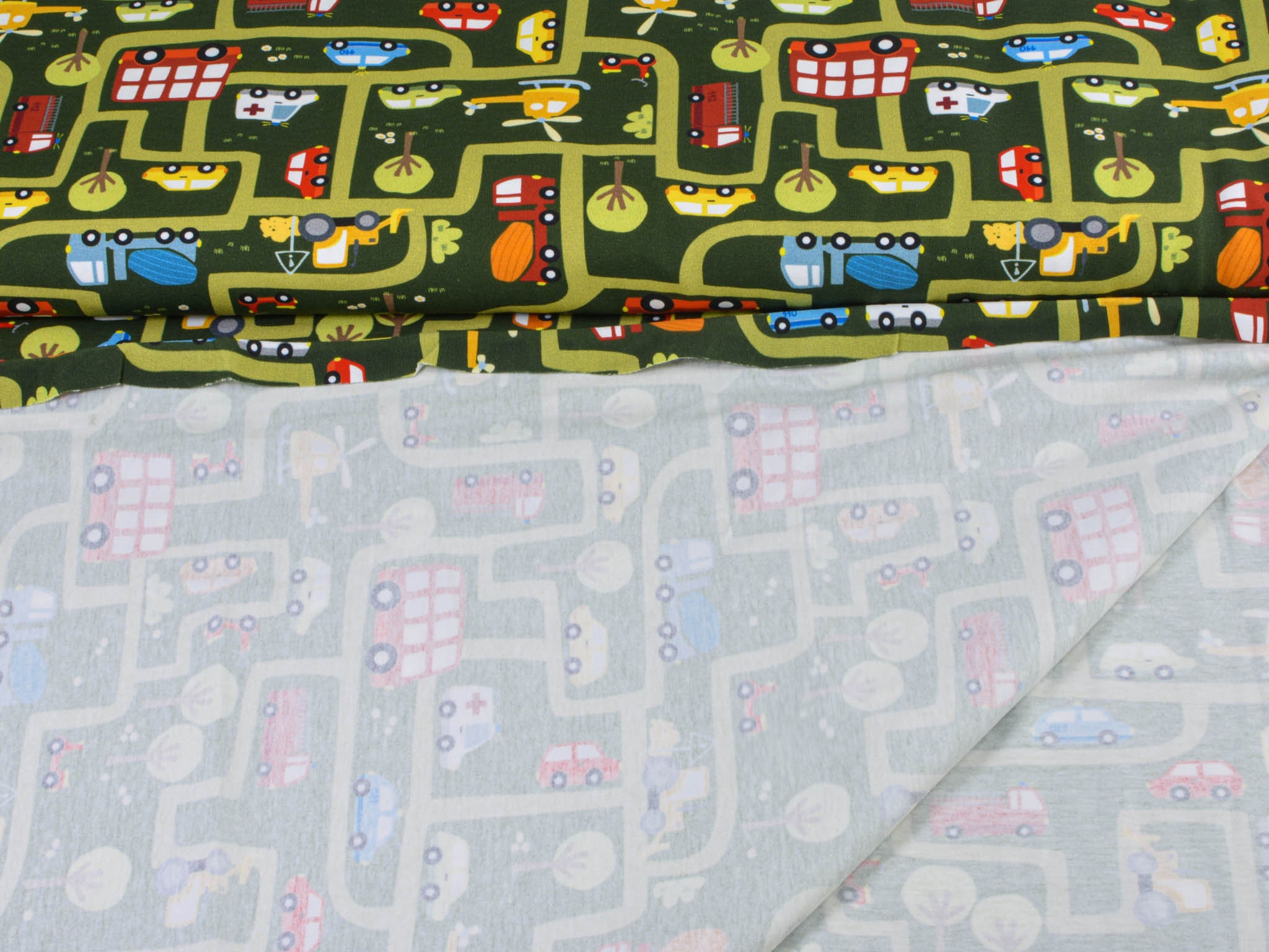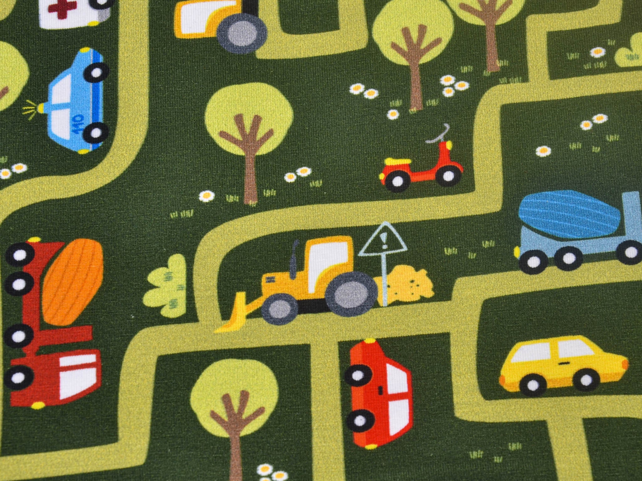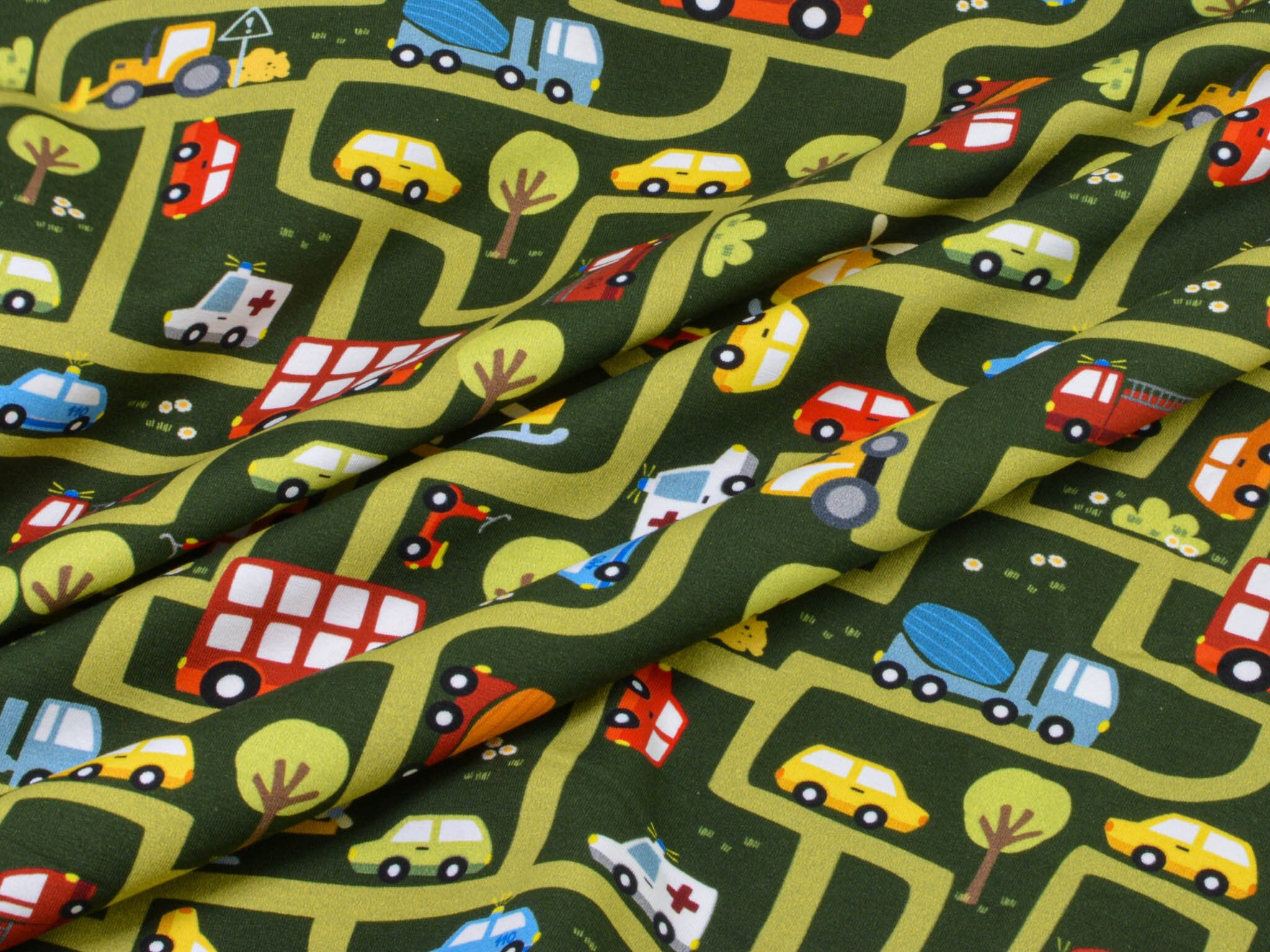 High-quality printed jersey from Hilco. The green jersey features a printed road motif. The road system includes cars, helicopters, ambulances, fire trucks, and much more. You can sew great T-shirts, bloomers, long-sleeved shirts, or hats from this cotton jersey.