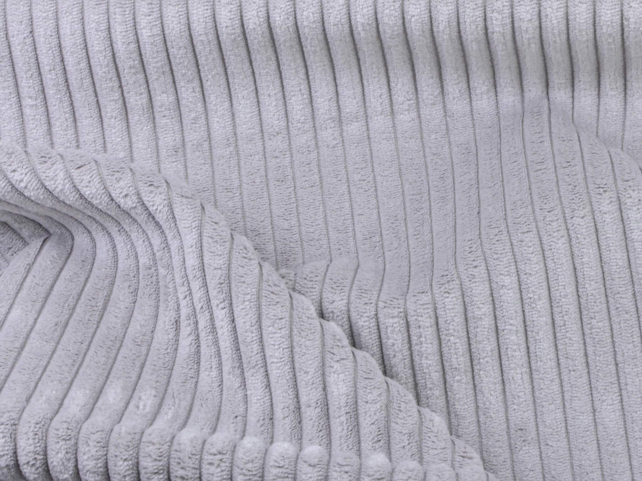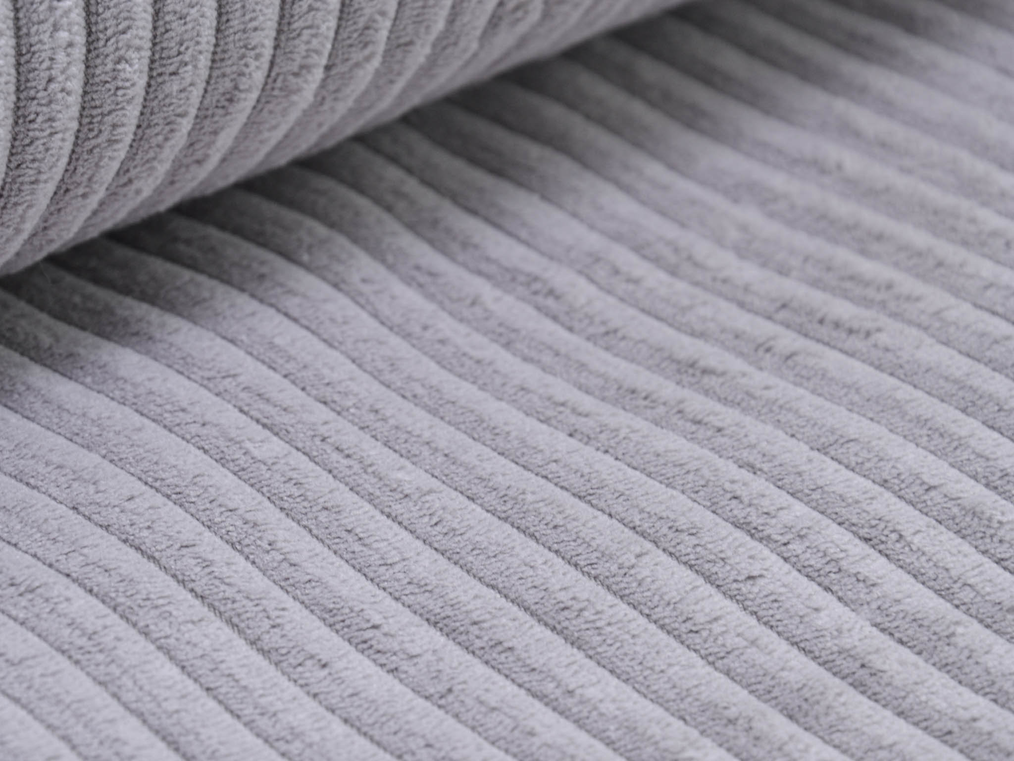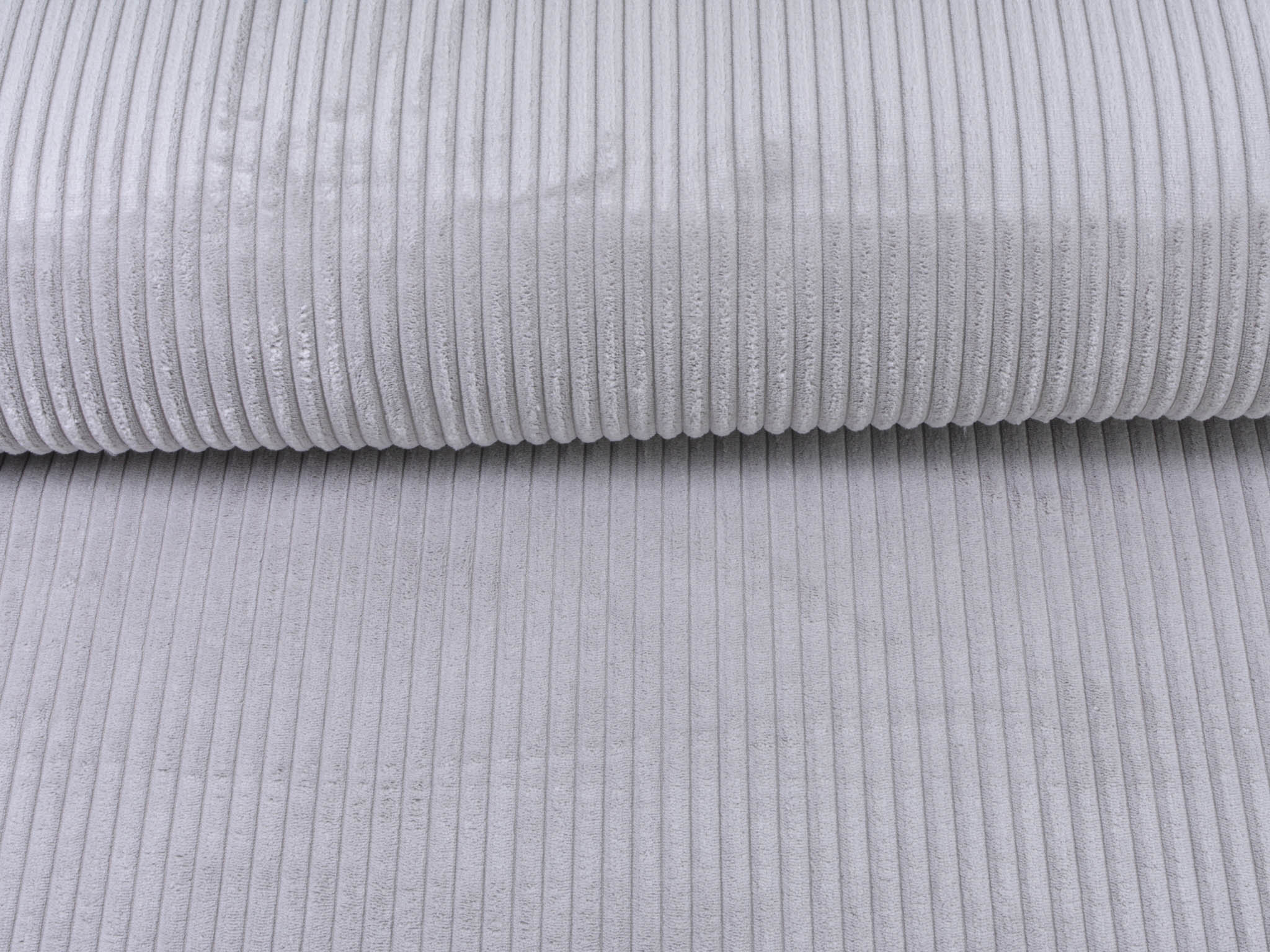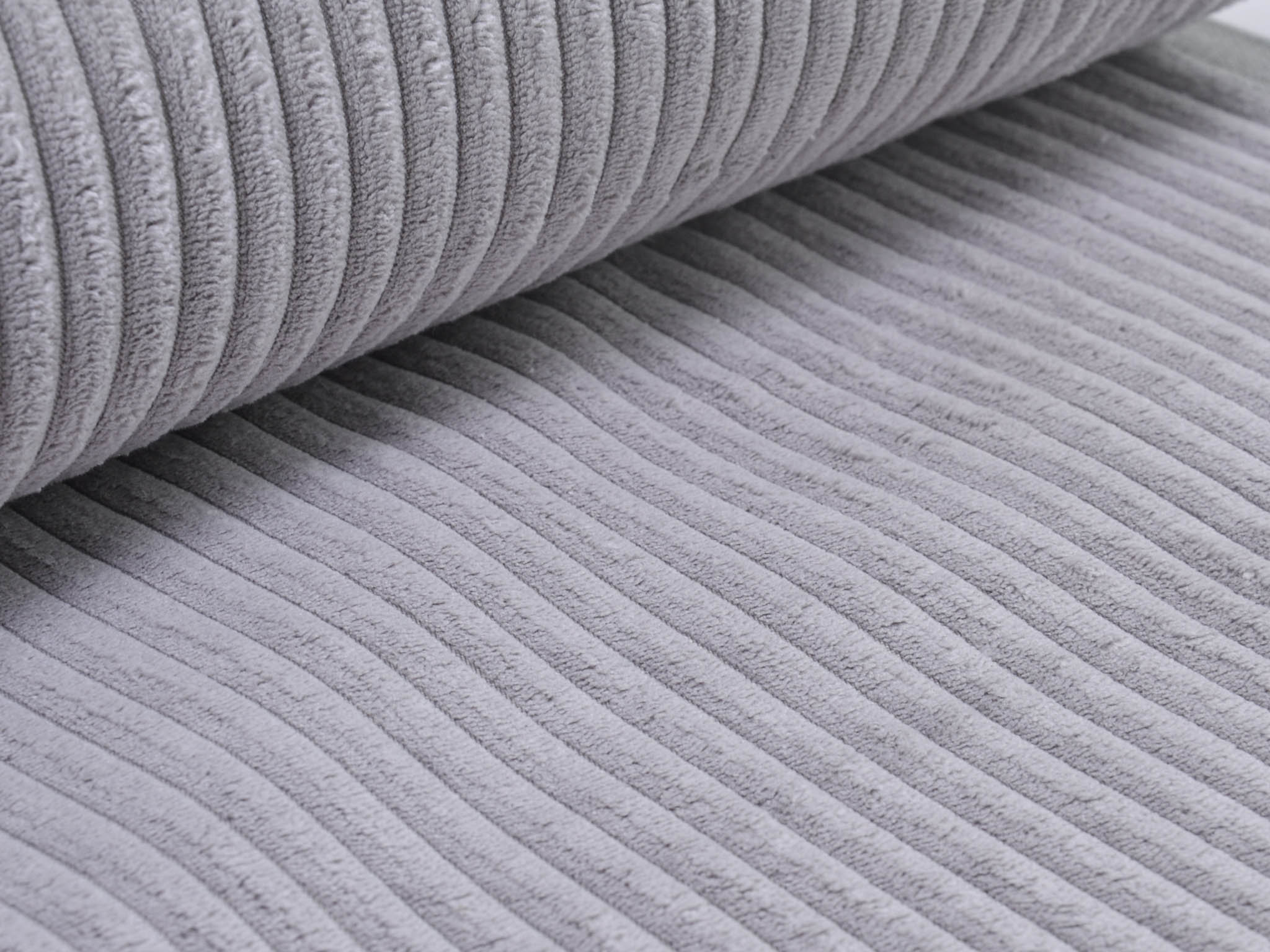 Wide corduroy fabric in light grey. Each rib is approximately 1 cm wide. The cord has a velvety, soft feel. You can use it for upholstering armchairs, chairs, and sofas. Sew stylish fanny packs, tote bags, cushions, makeup bags, and much more from this wonderful fabric.