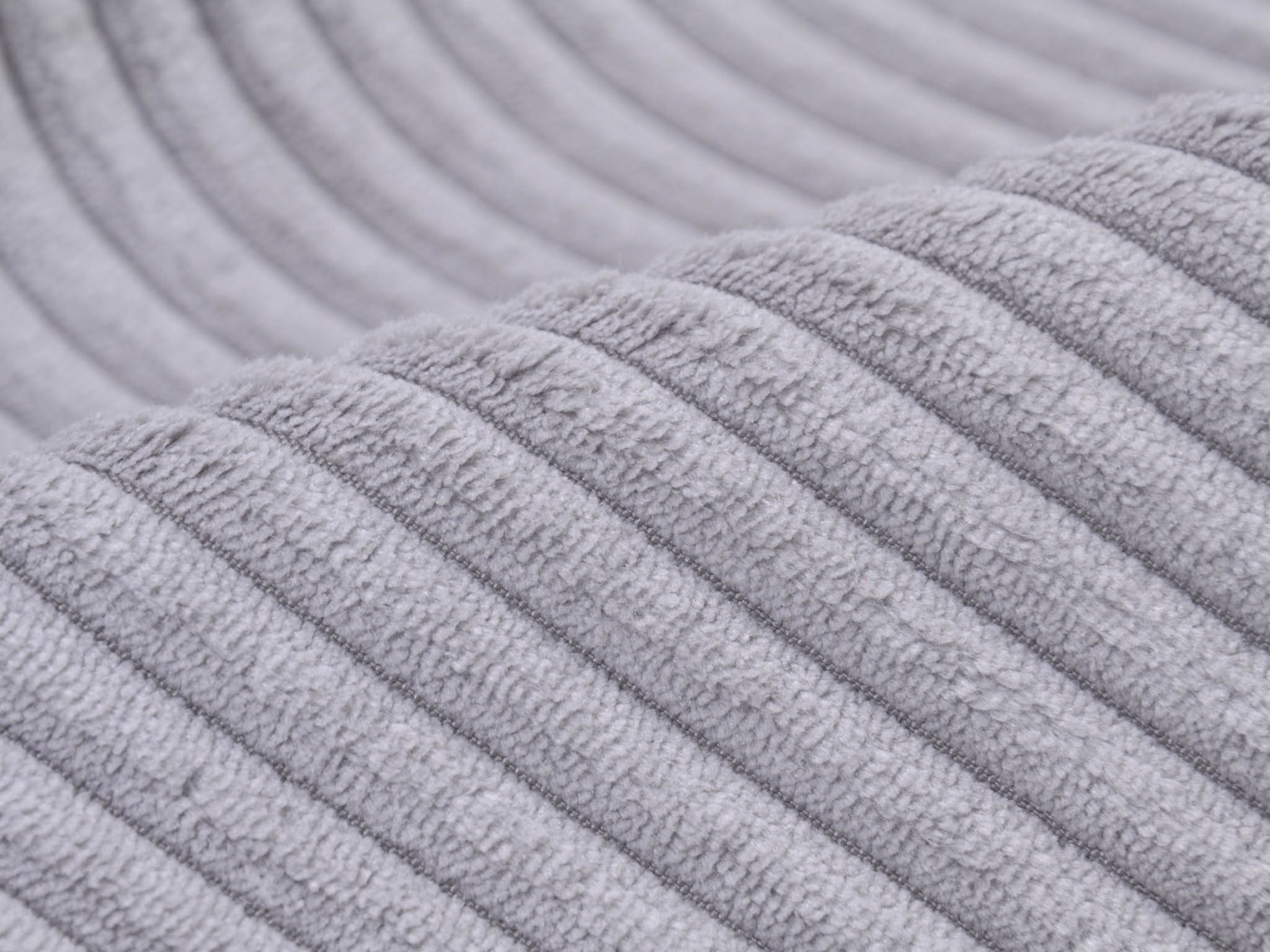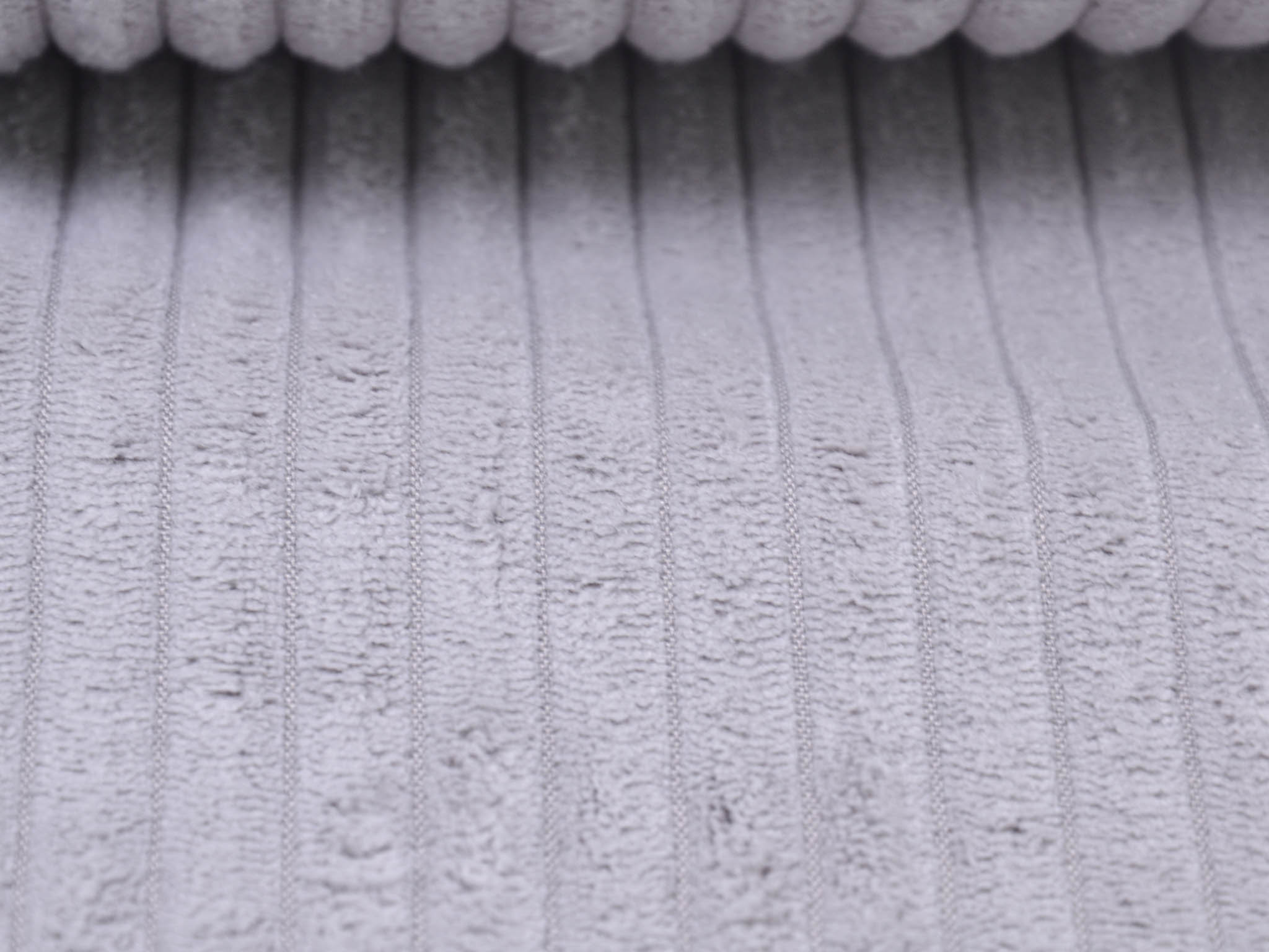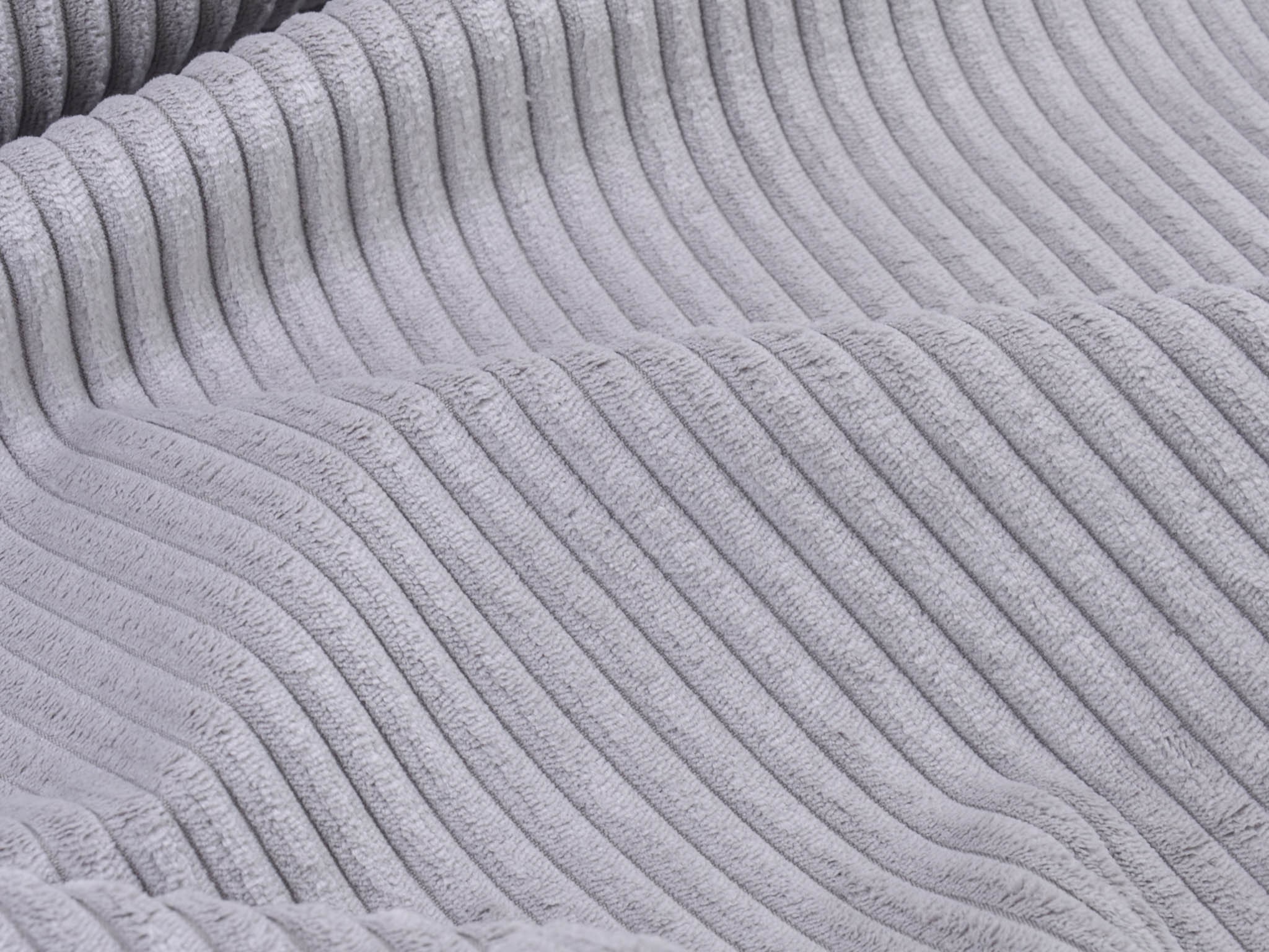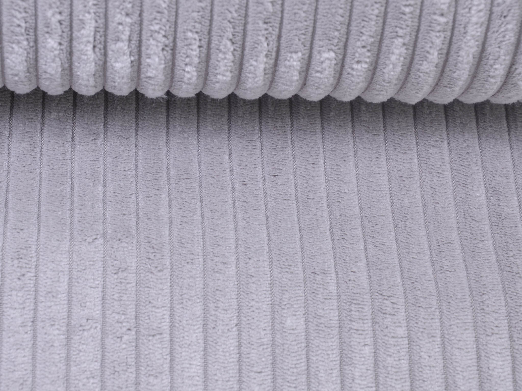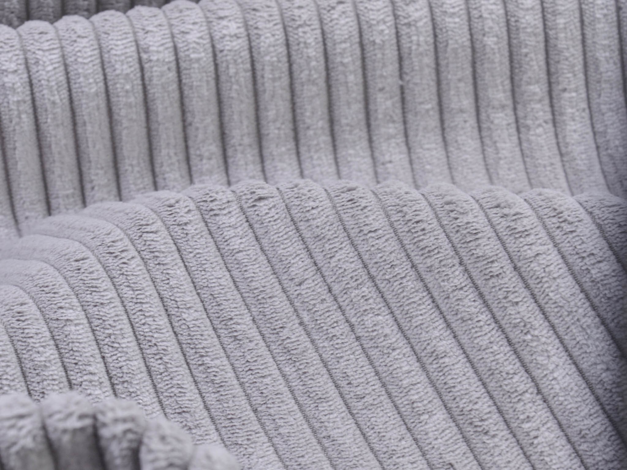 Wide corduroy fabric in light grey. Each rib is approximately 1 cm wide. The cord has a velvety, soft feel. You can use it for upholstering armchairs, chairs, and sofas. Sew stylish fanny packs, tote bags, cushions, makeup bags, and much more from this wonderful fabric.