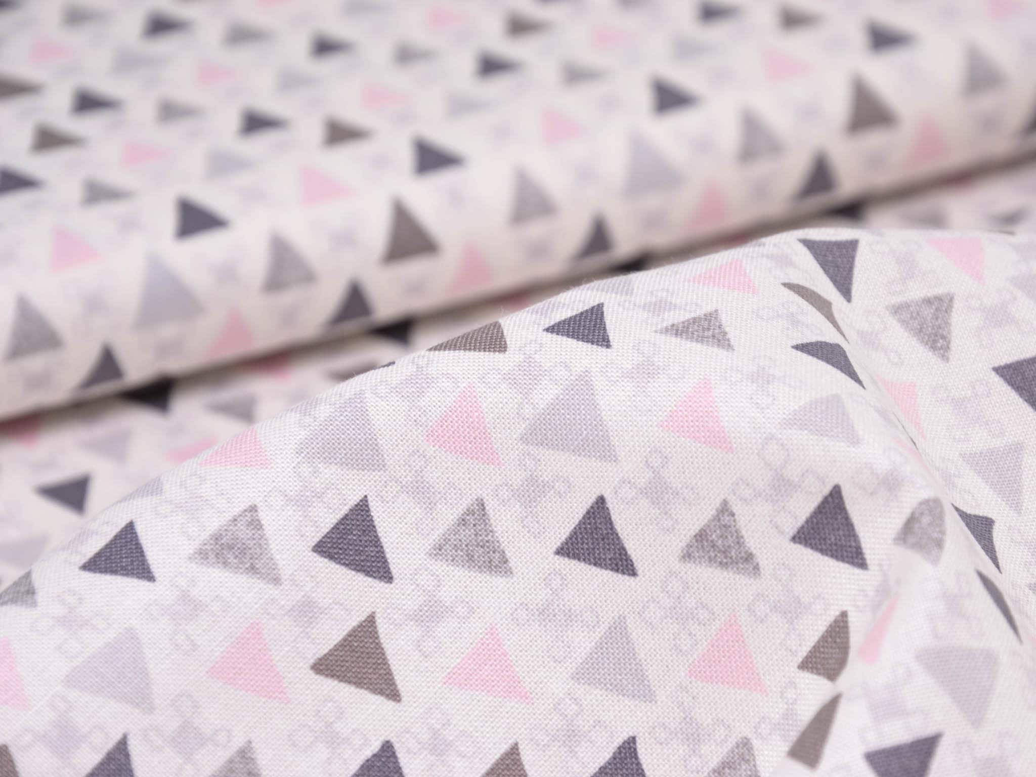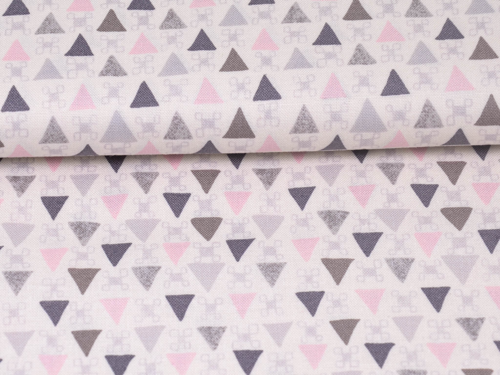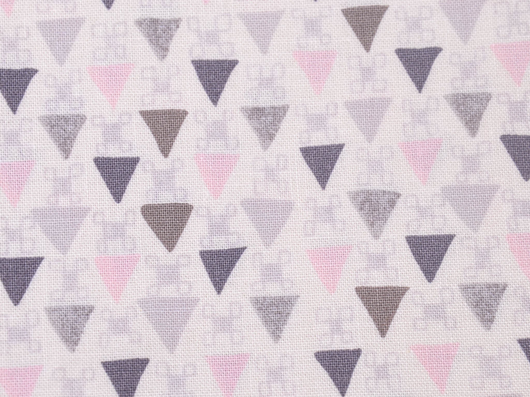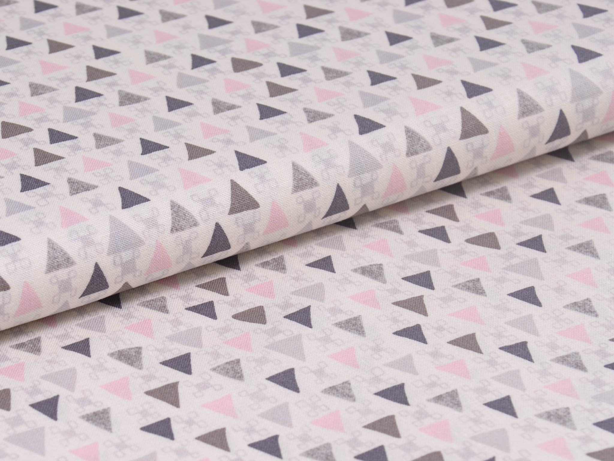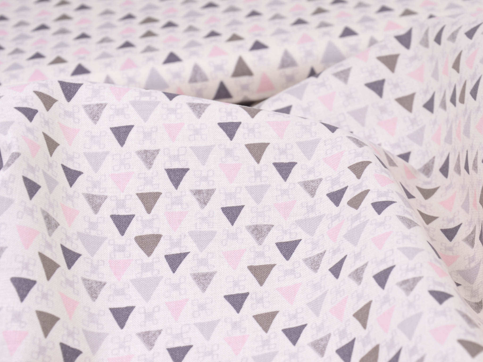 Hochwertiger Patchwork Stoff aus Baumwolle. Der Grund ist creme-weiß, darauf sind kleine Dreiecke in grau und rosa. Du kannst den Stoff zum Patchworken verwenden. Aber auch zum Nähen von Utensilos, Kissen, als Taschenfutter und vielem mehr.