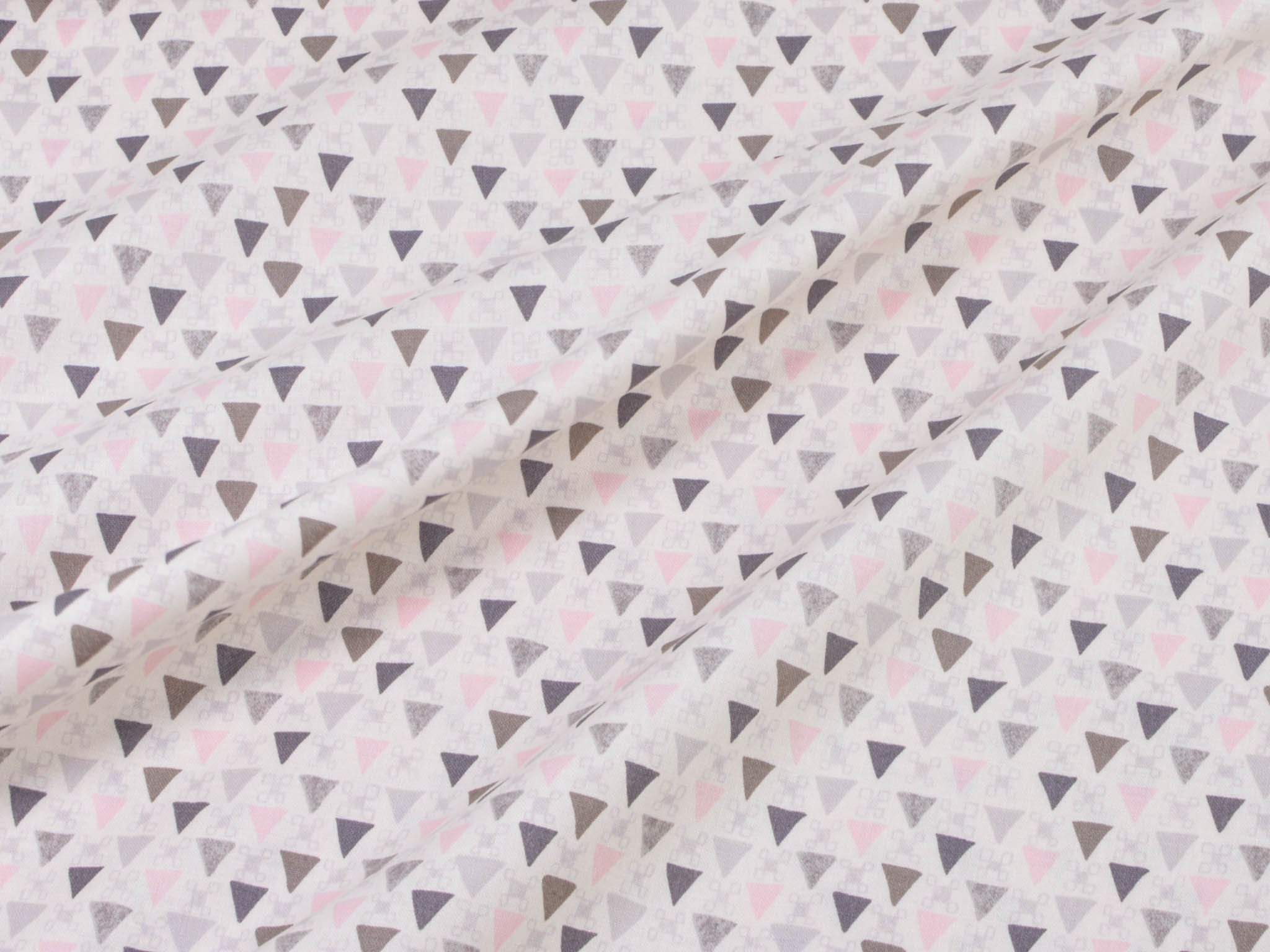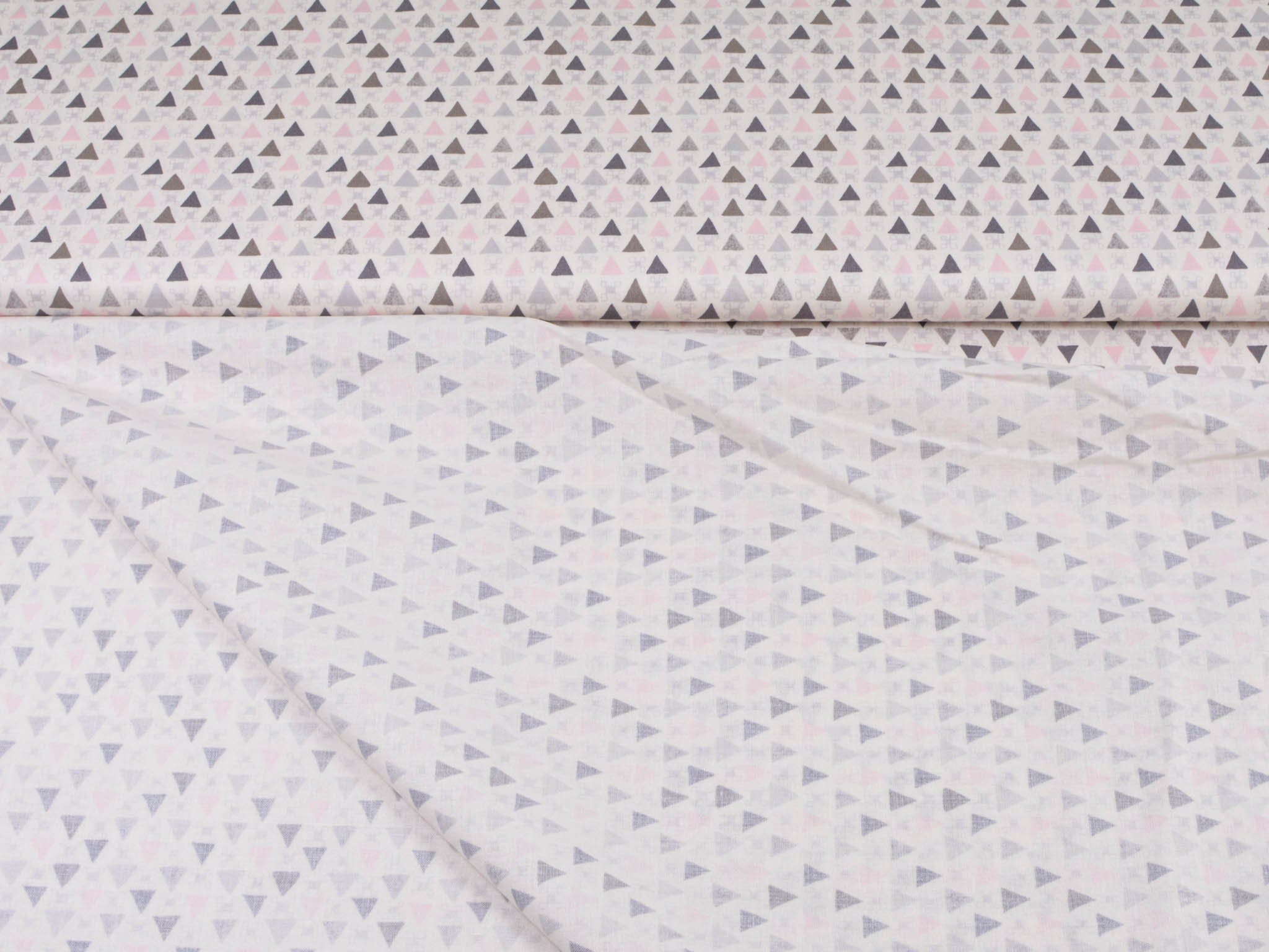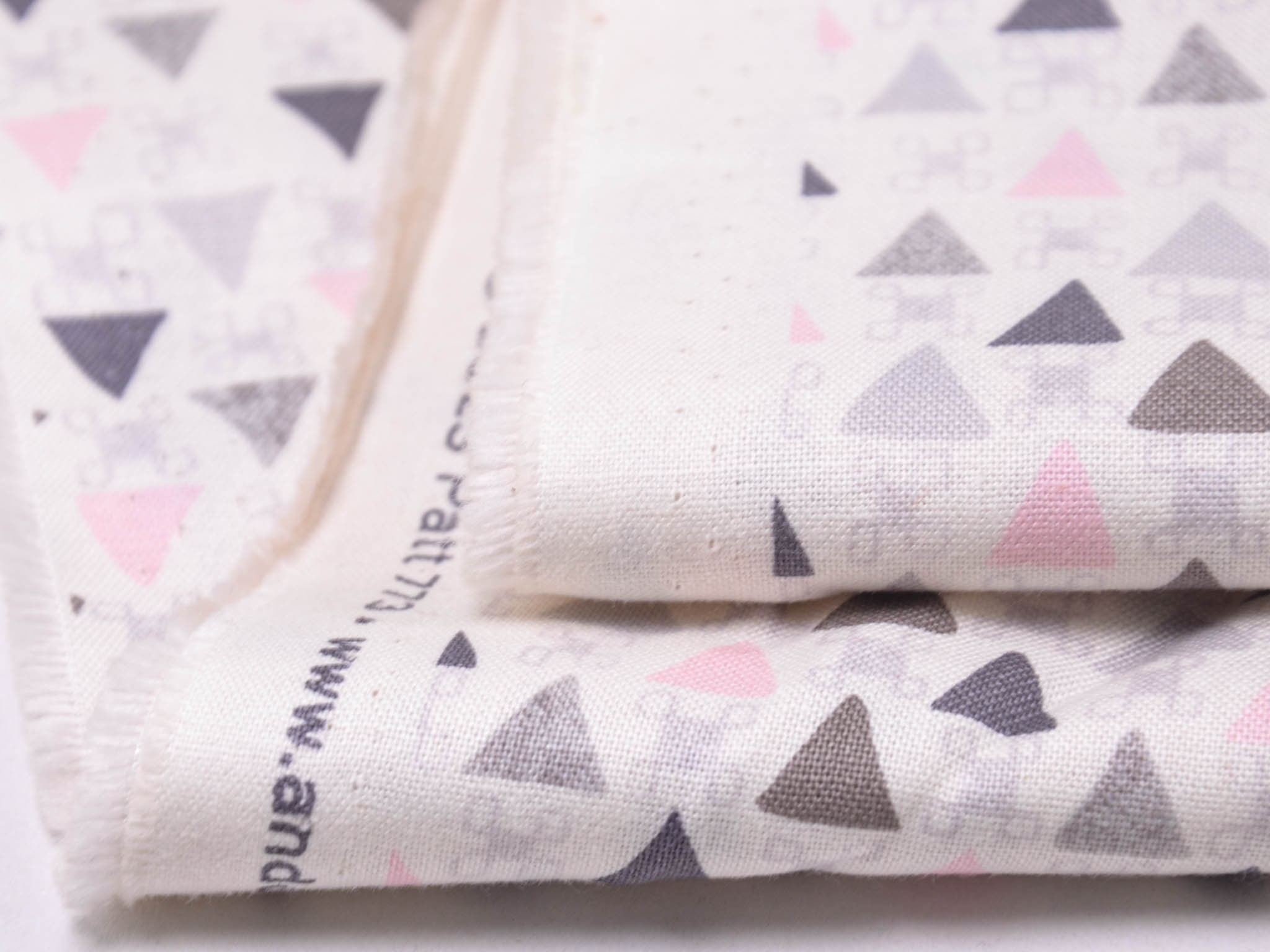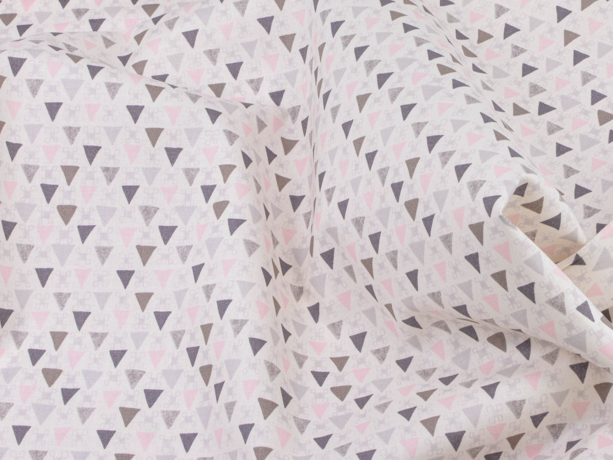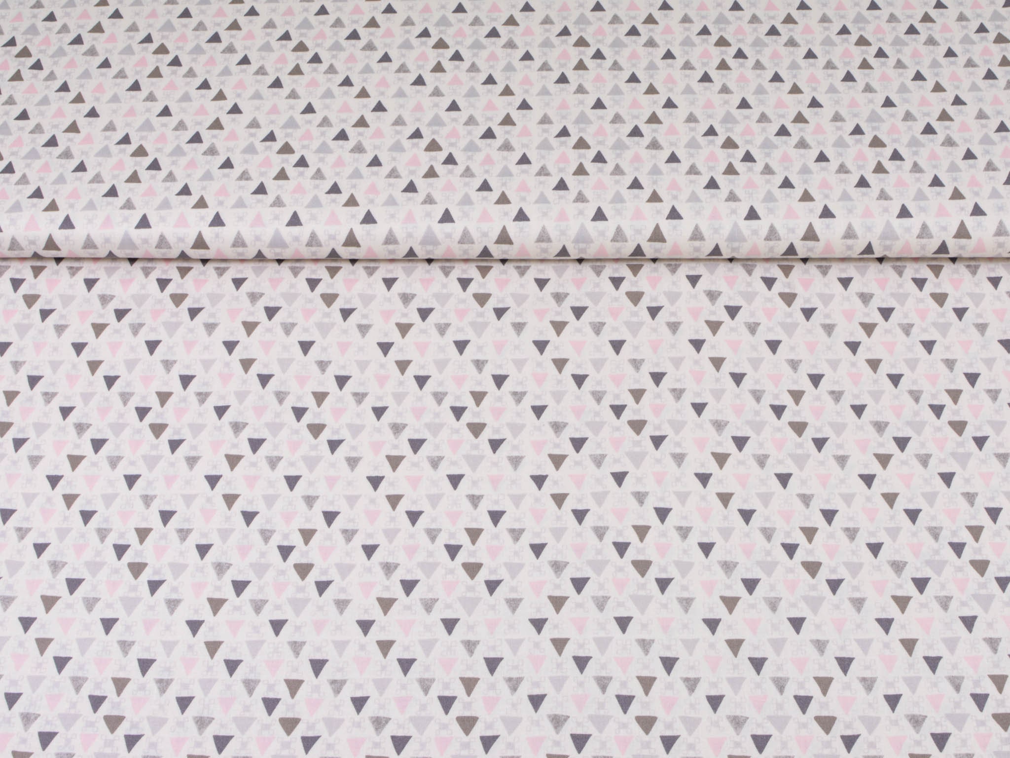 Hochwertiger Patchwork Stoff aus Baumwolle. Der Grund ist creme-weiß, darauf sind kleine Dreiecke in grau und rosa. Du kannst den Stoff zum Patchworken verwenden. Aber auch zum Nähen von Utensilos, Kissen, als Taschenfutter und vielem mehr.