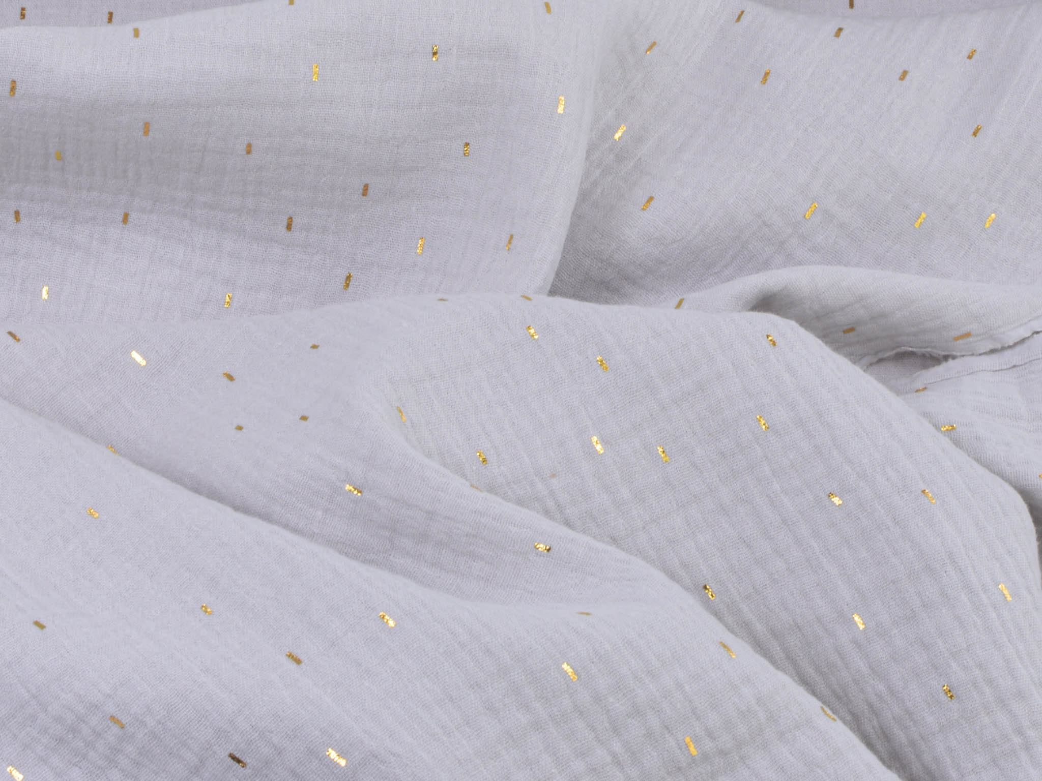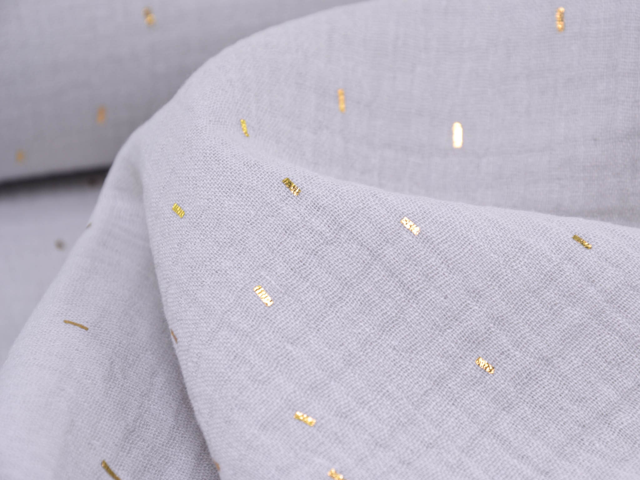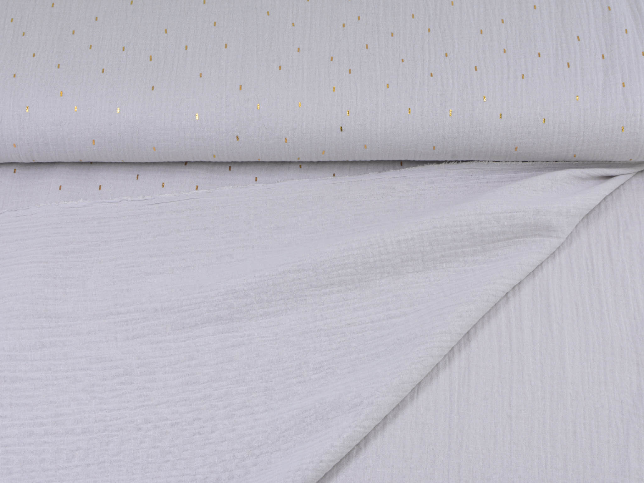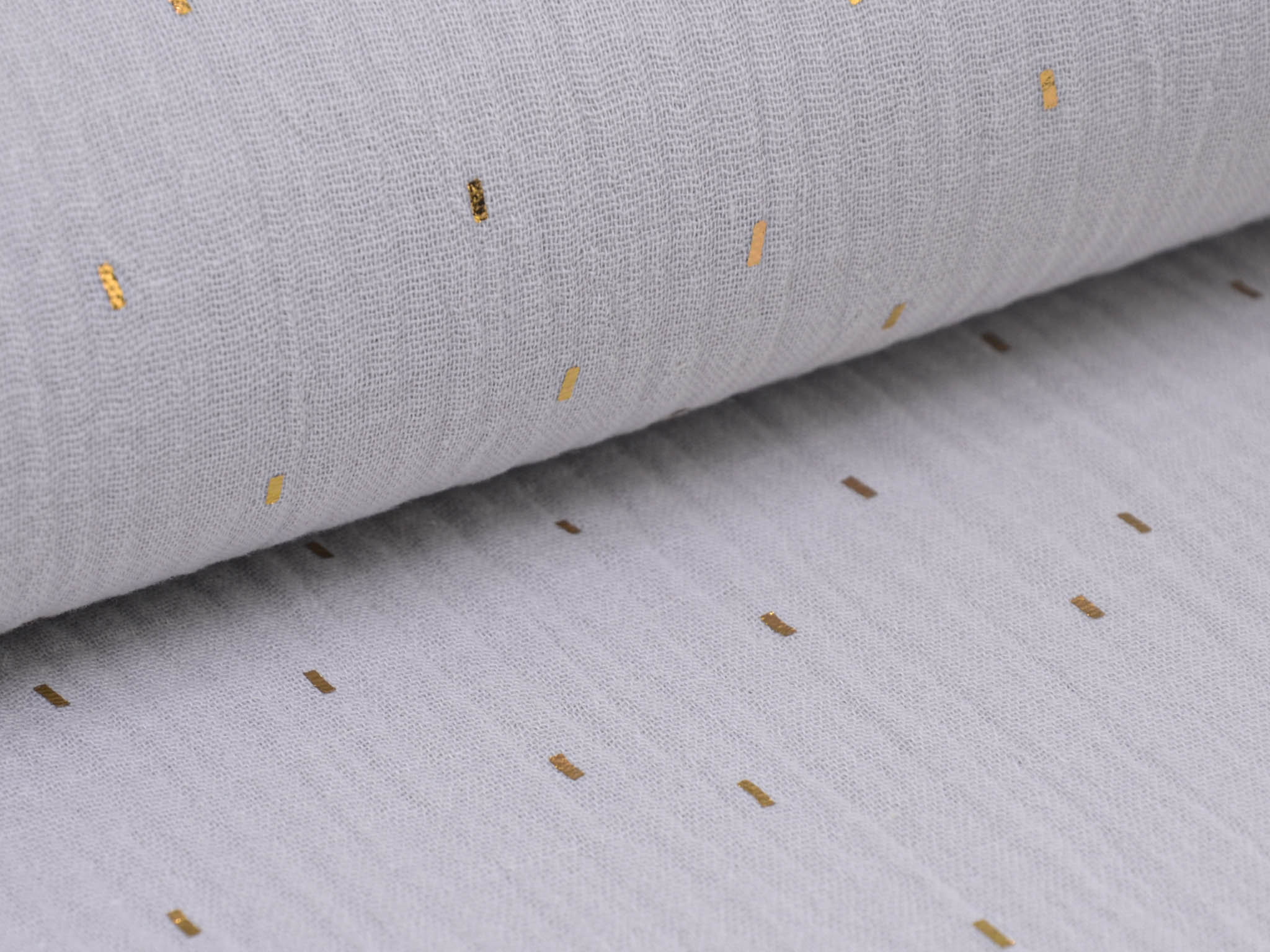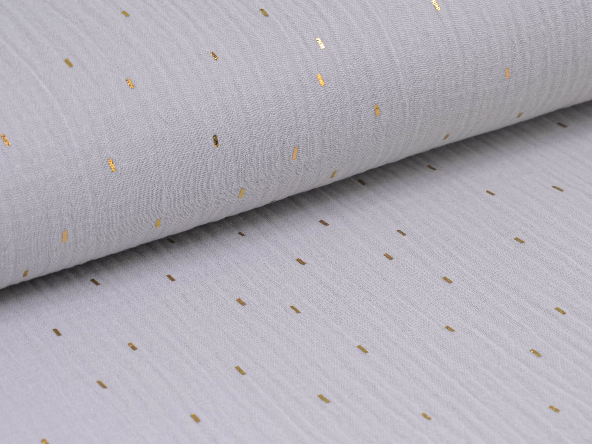 Organic Musselin in hellgrau mit kleinen Strichen in Gold Dünner, doppellagiger Musselin mit Crinkle-Effekt. Der Musselin mit weichem Fall kann wunderbar zum Nähen von Tüchern, Kleidern, Blusen, Kuschelkissen, Röcken und so vielem mehr verwendet werden.