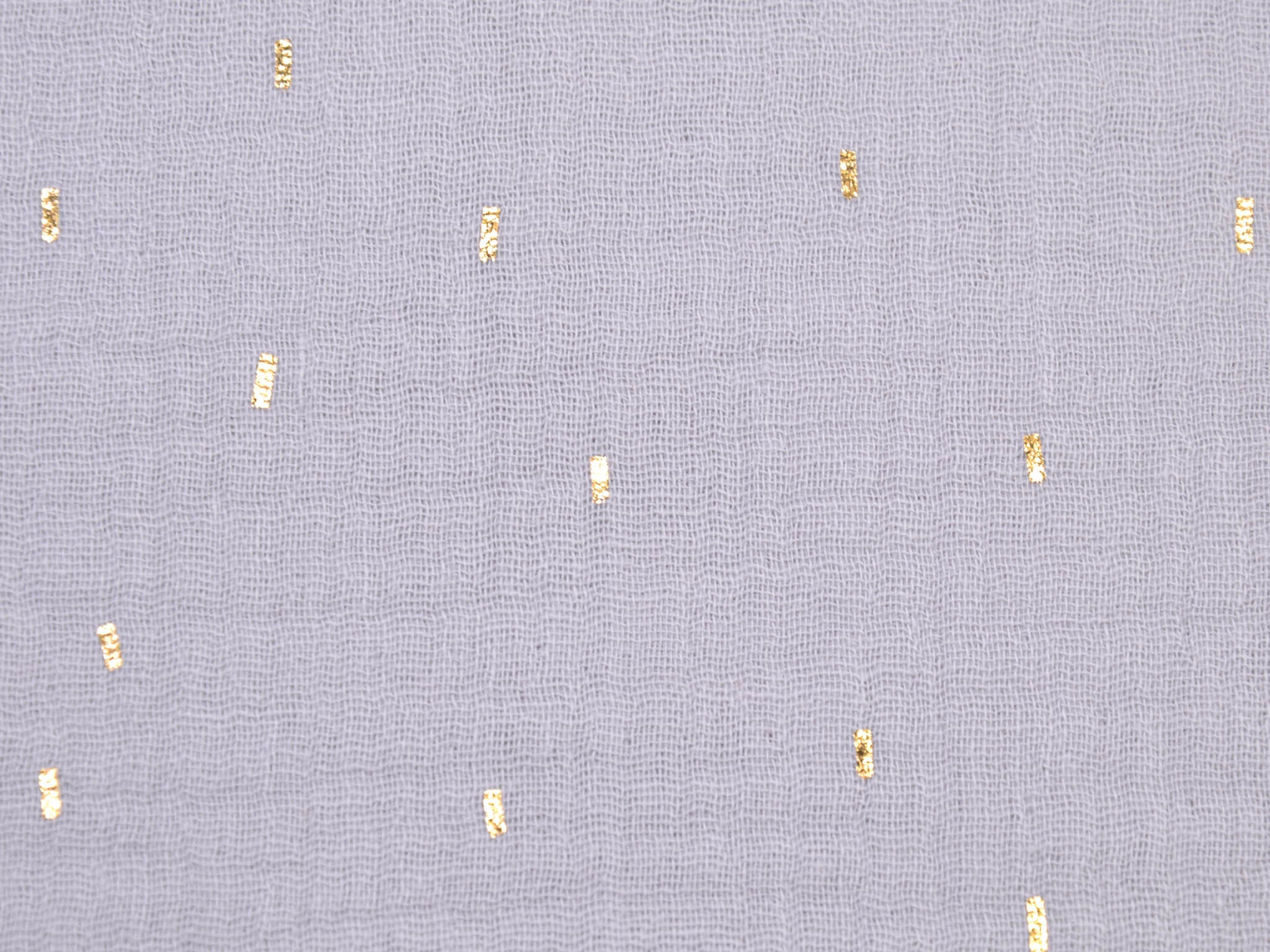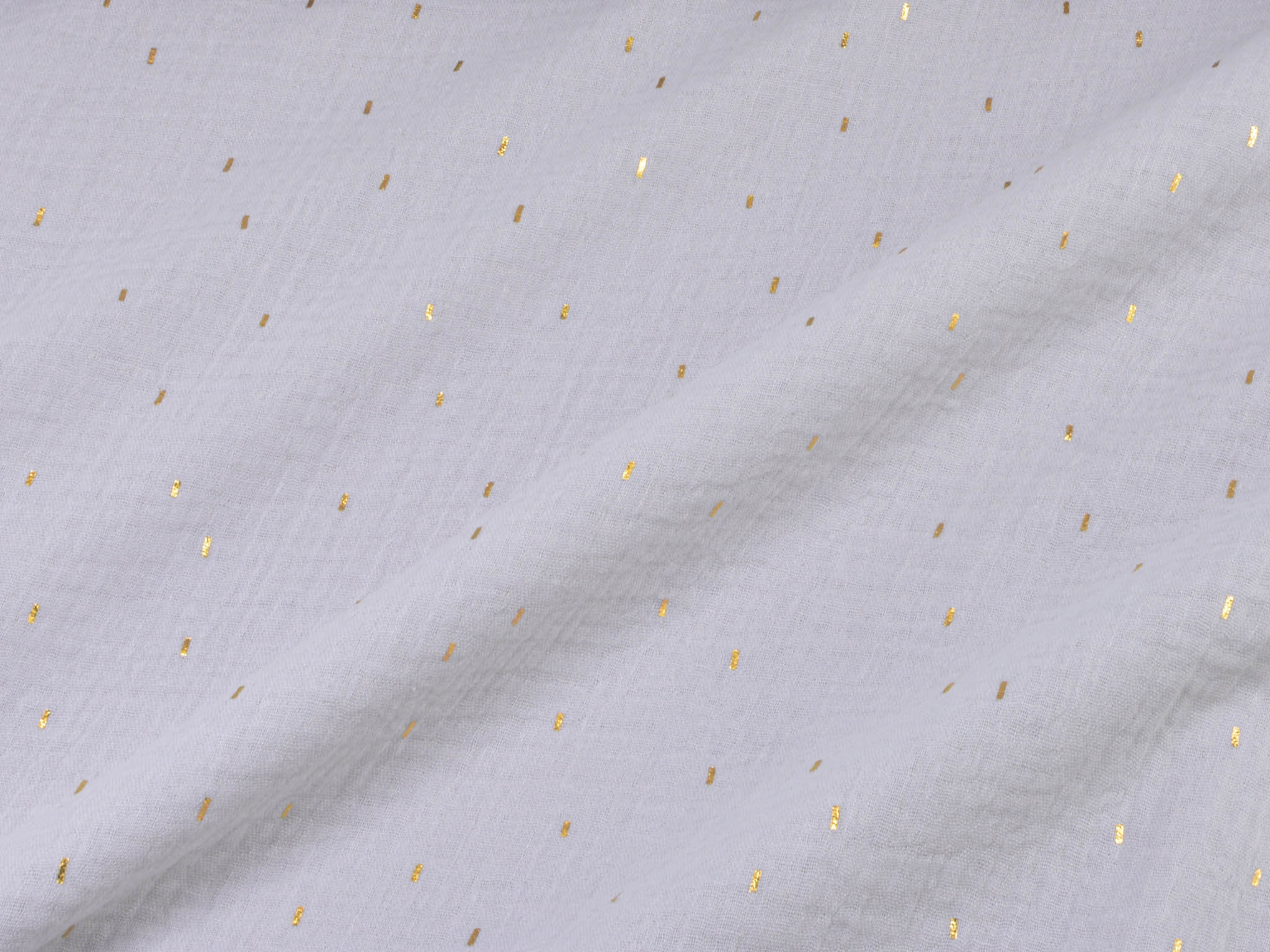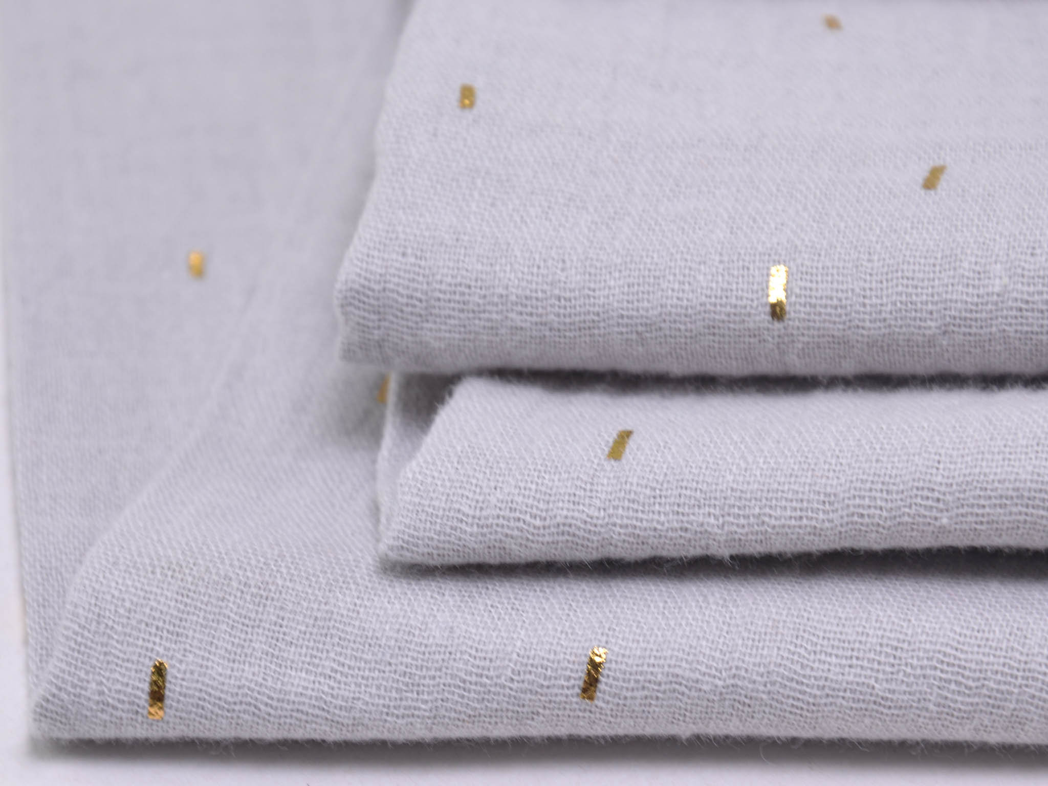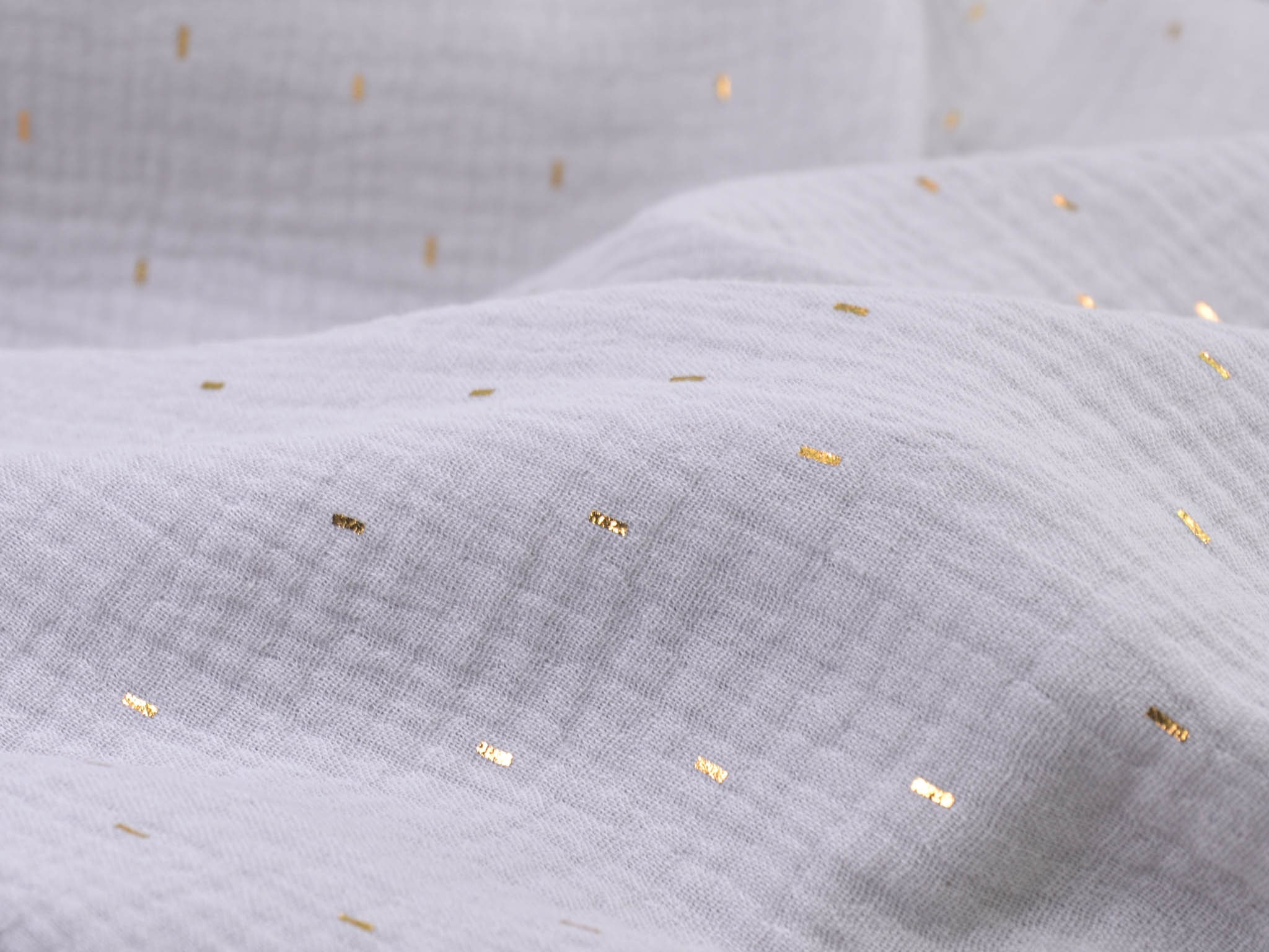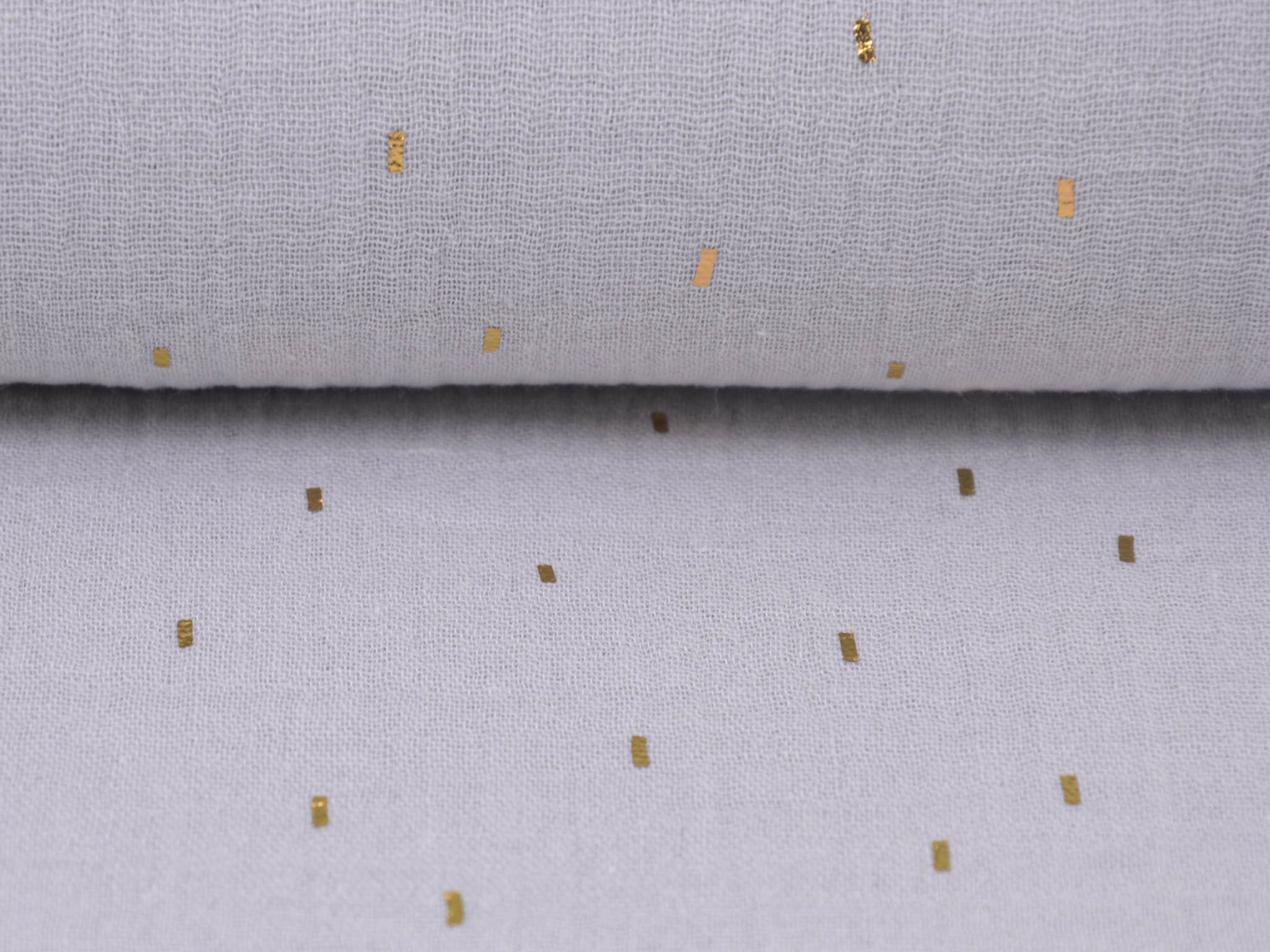 Organic Musselin in hellgrau mit kleinen Strichen in Gold Dünner, doppellagiger Musselin mit Crinkle-Effekt. Der Musselin mit weichem Fall kann wunderbar zum Nähen von Tüchern, Kleidern, Blusen, Kuschelkissen, Röcken und so vielem mehr verwendet werden.