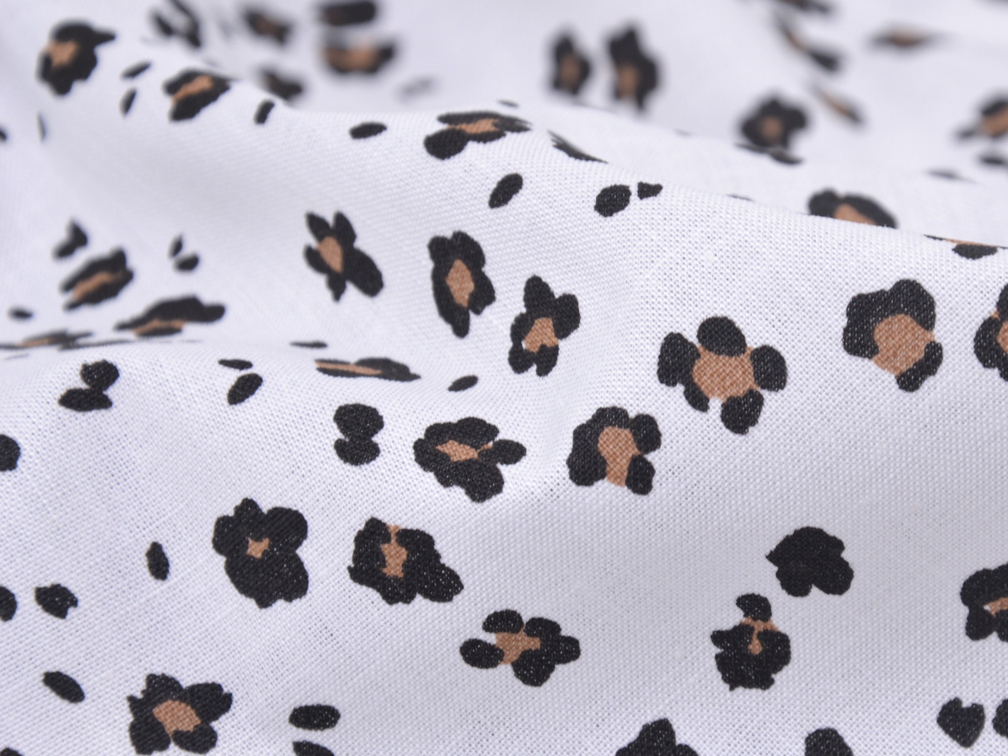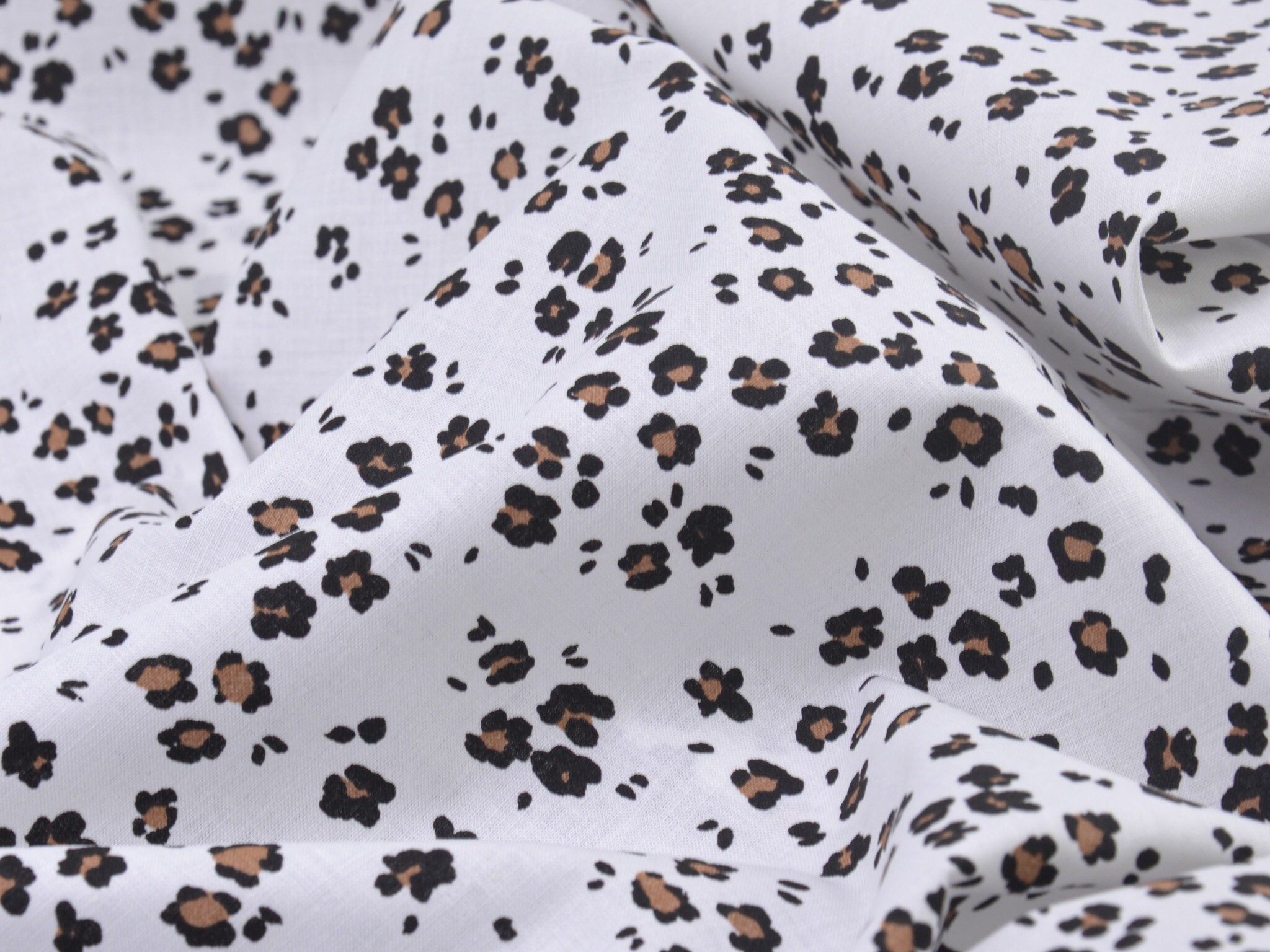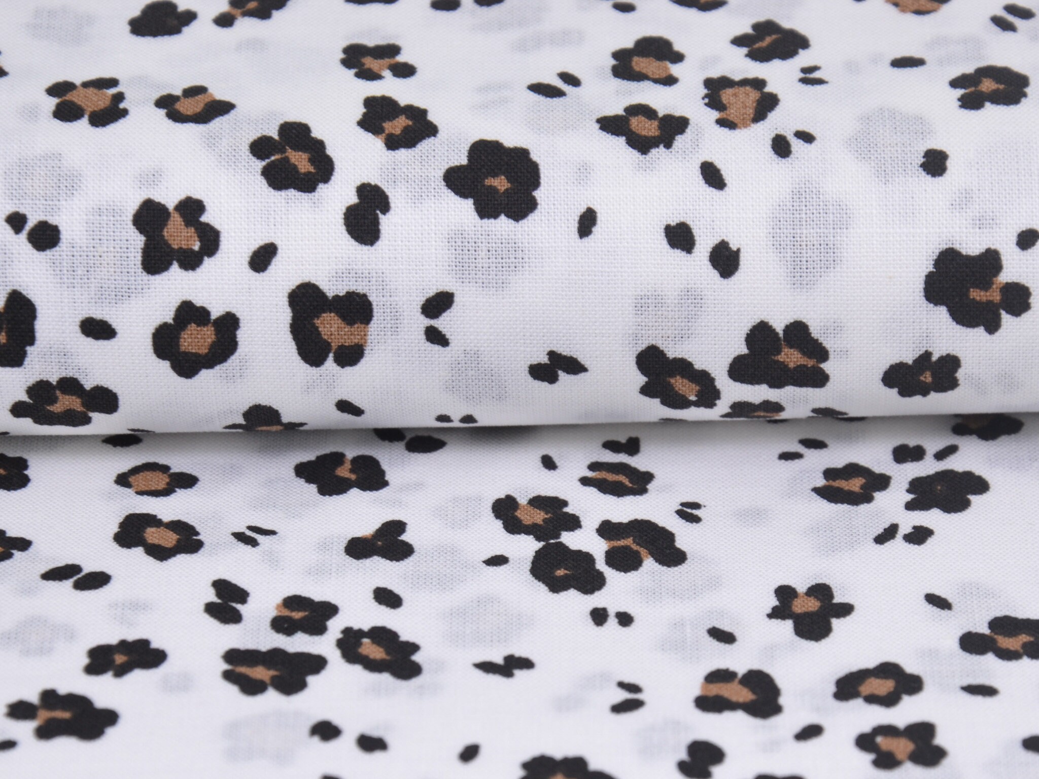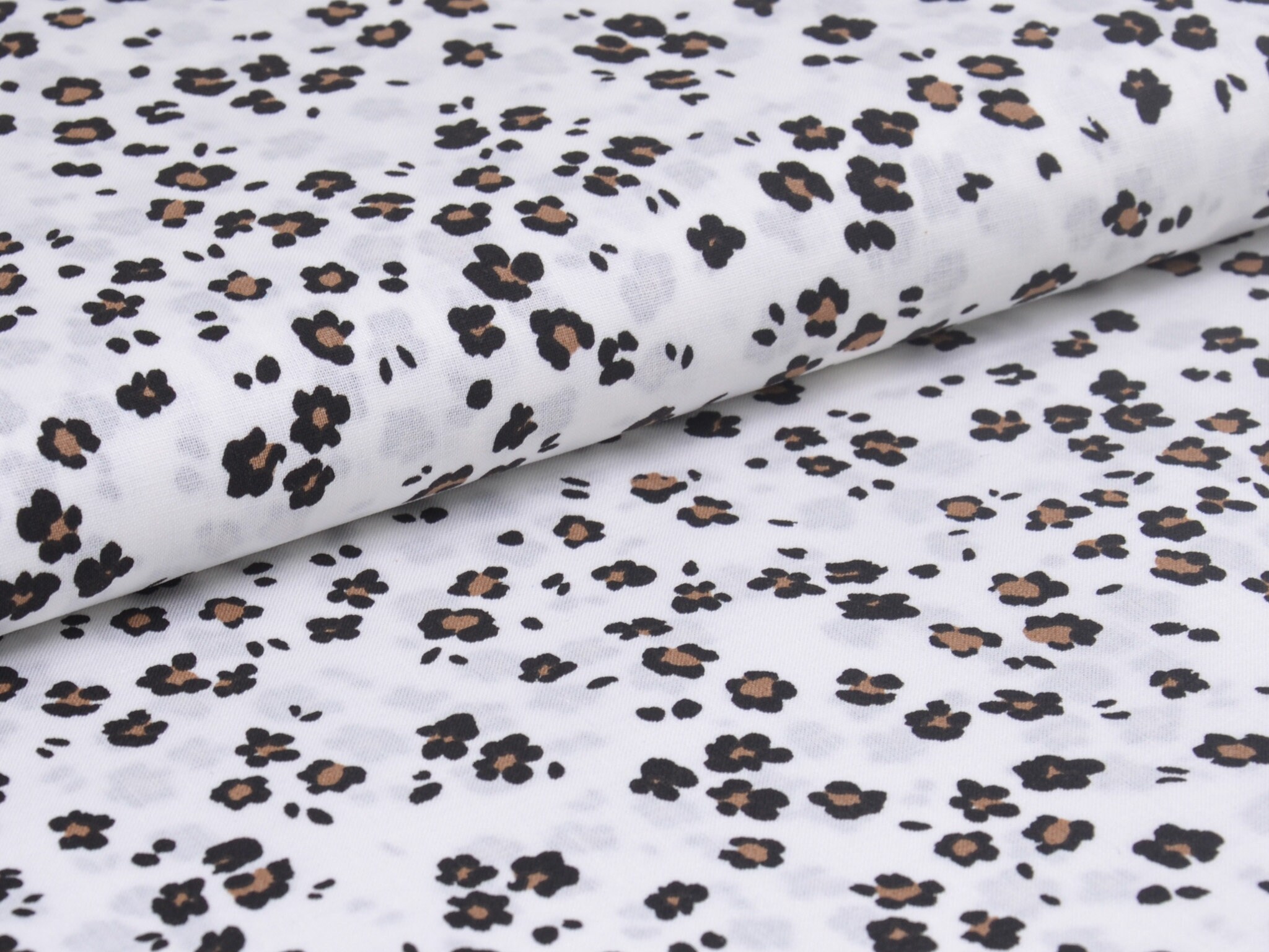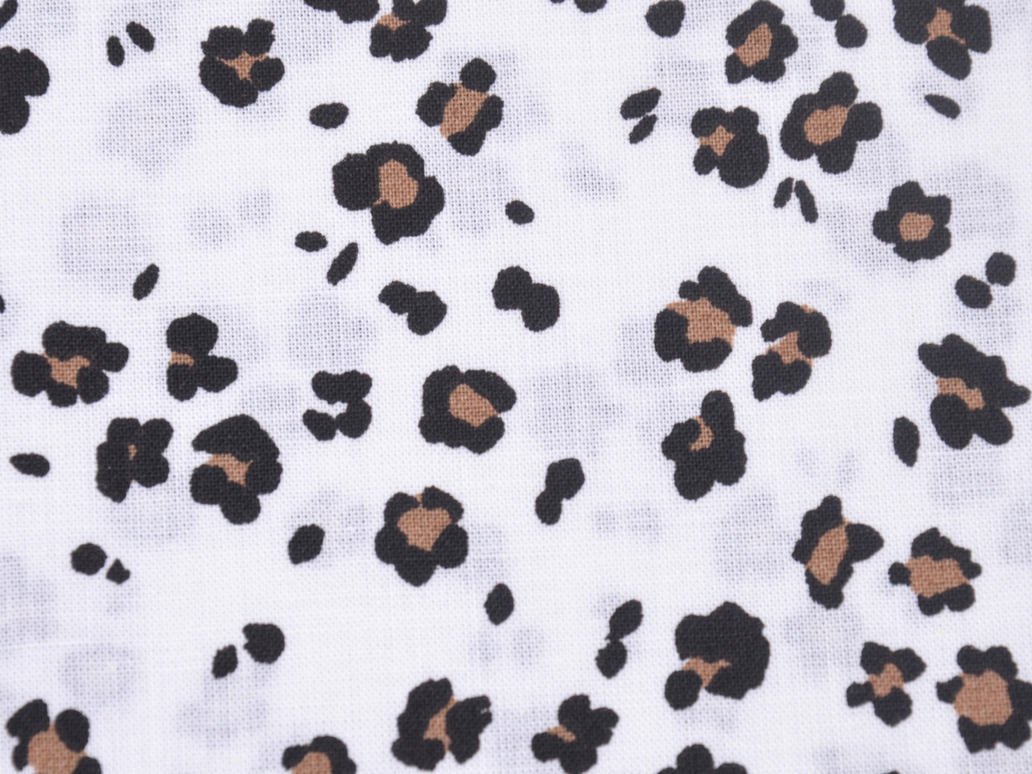Dünner Baumwollstoff in weiß mit kleinem, Leo-Muster in schwarz und beige. Der Stoff ist glatt und matt. Du kannst ihn zum Nähen von Accessoire, Kissen, Deko und vielem mehr nehmen. Außerdem ist die Baumwolle perfekt zum Füttern von Mänteln, Jacken und Westen geeignet.