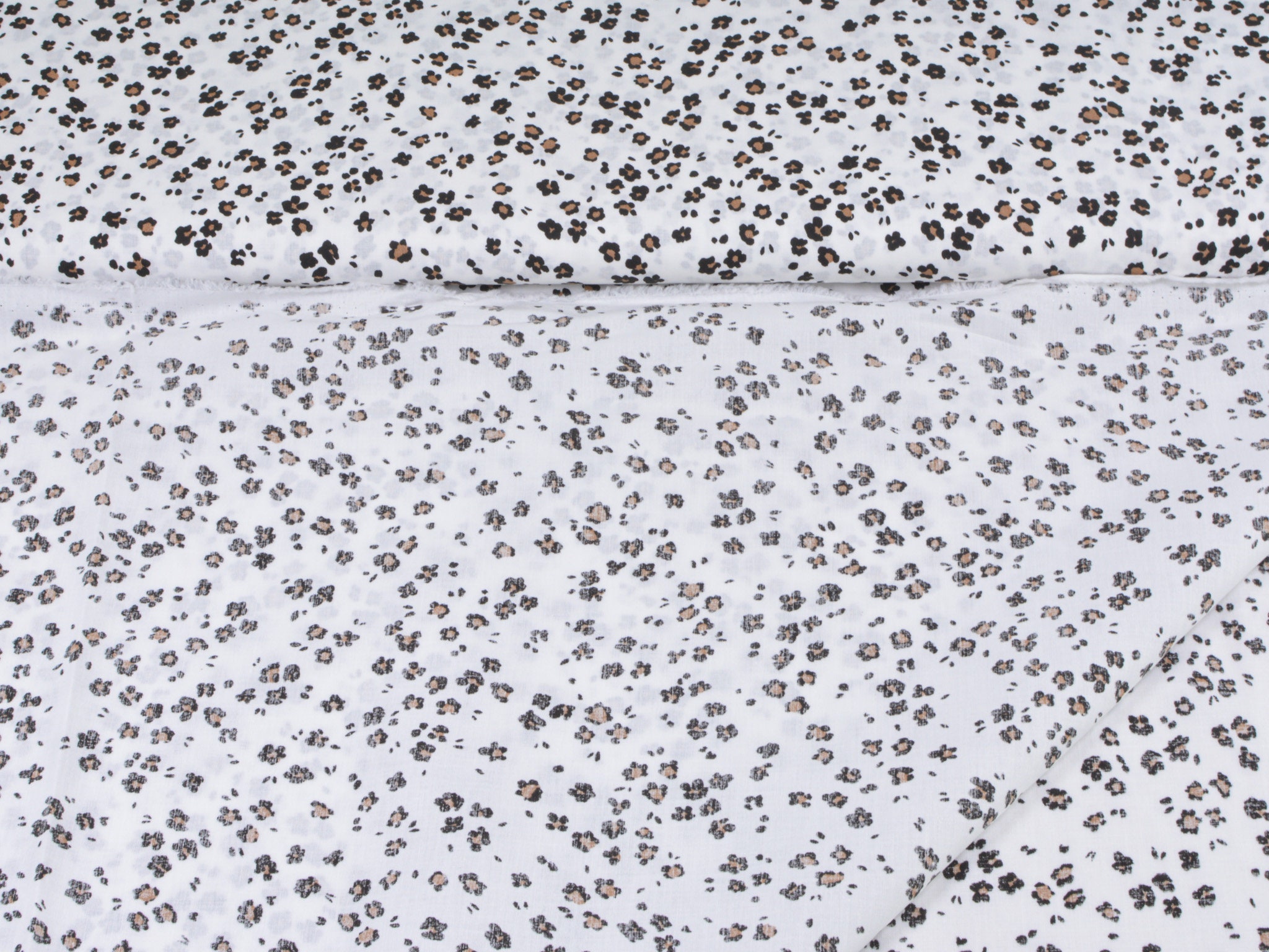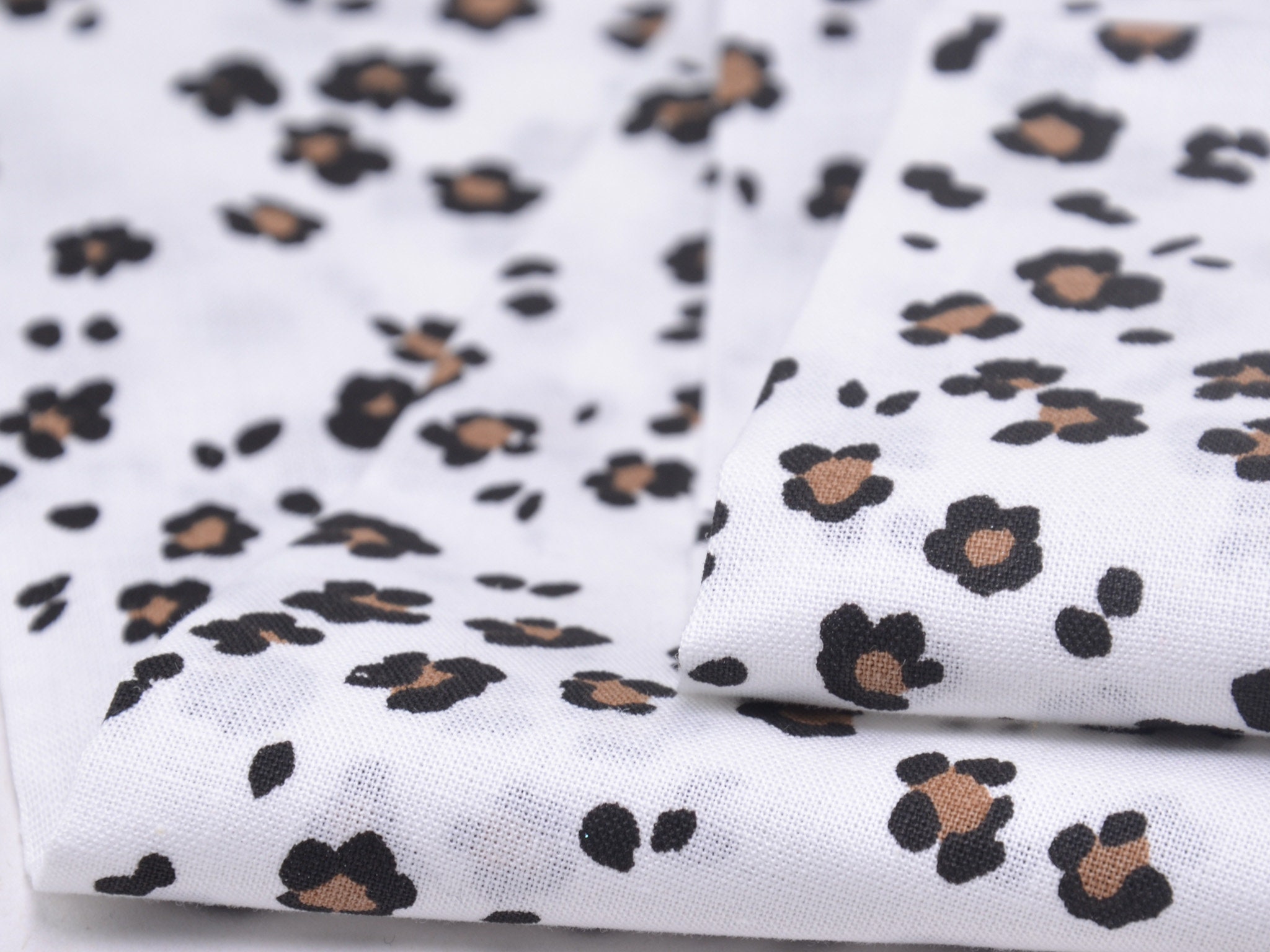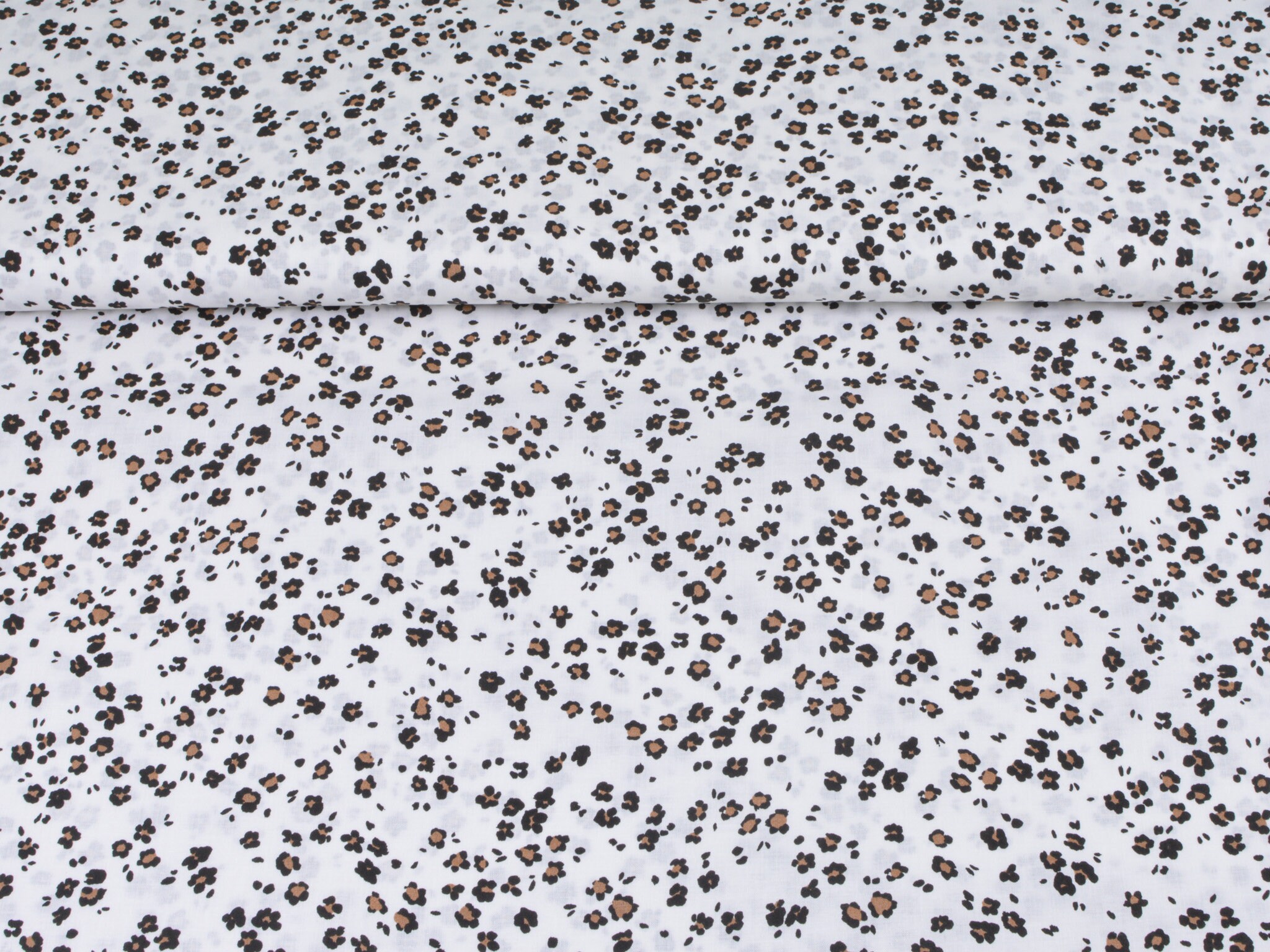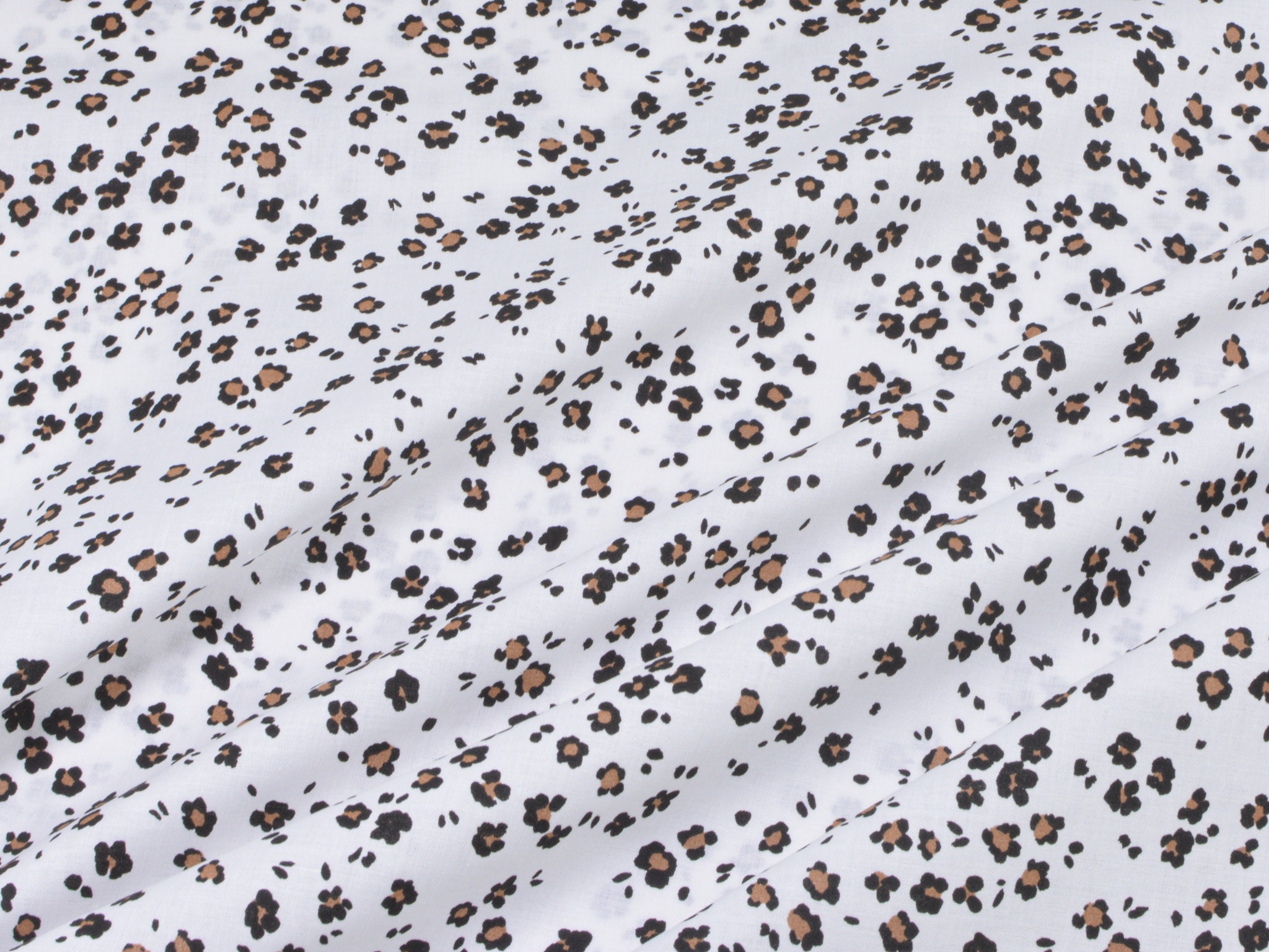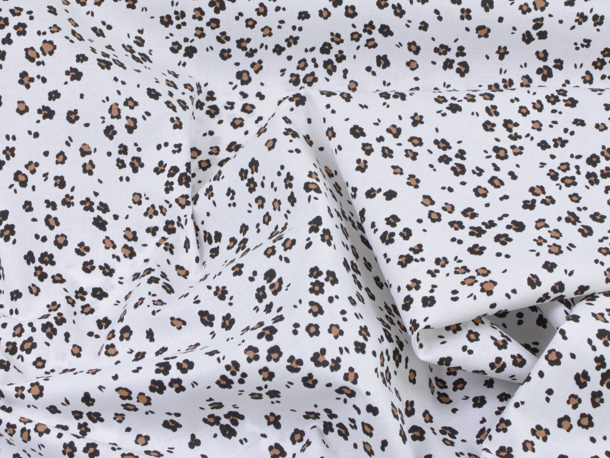 Dünner Baumwollstoff in weiß mit kleinem, Leo-Muster in schwarz und beige. Der Stoff ist glatt und matt. Du kannst ihn zum Nähen von Accessoire, Kissen, Deko und vielem mehr nehmen. Außerdem ist die Baumwolle perfekt zum Füttern von Mänteln, Jacken und Westen geeignet.