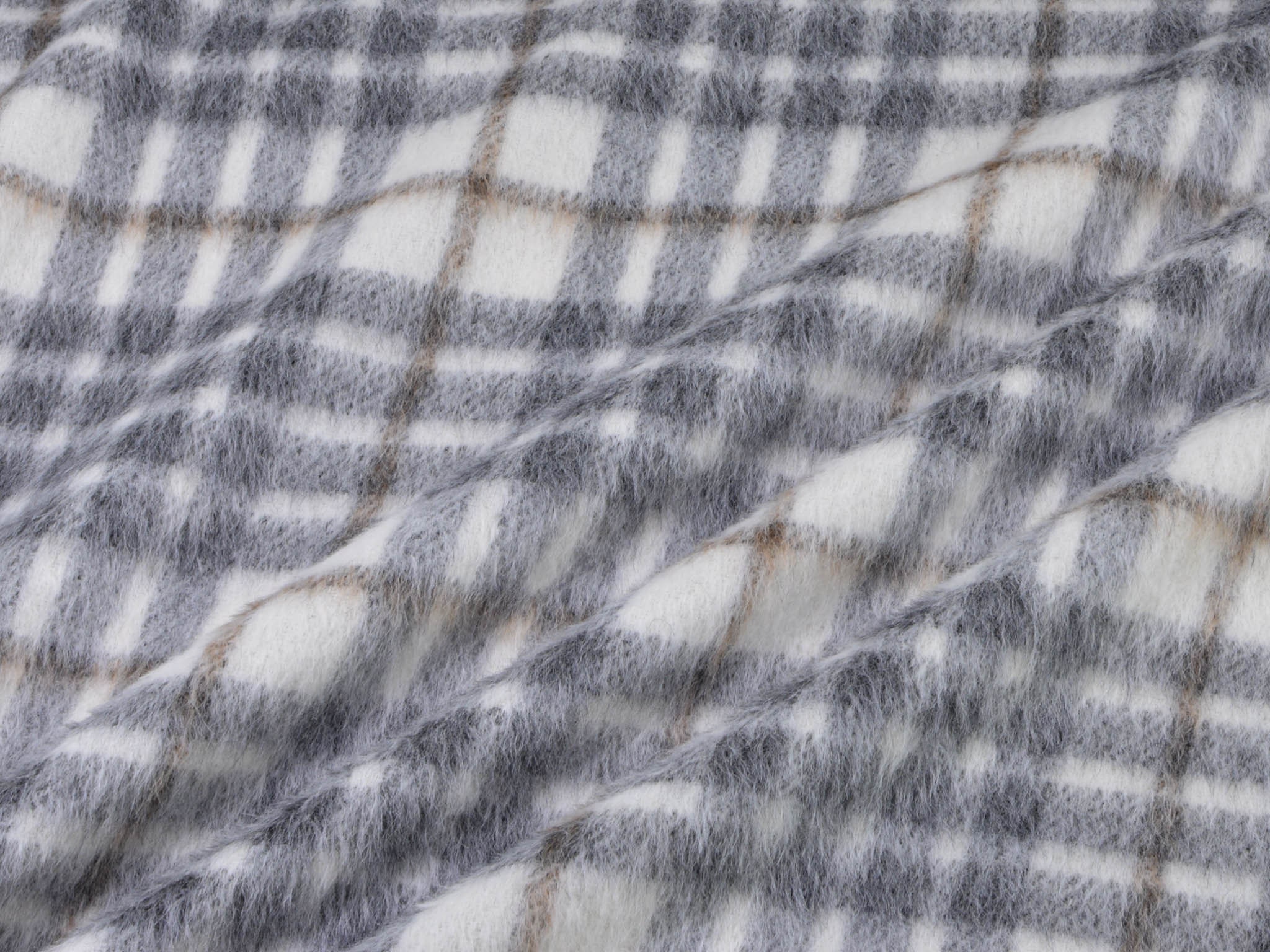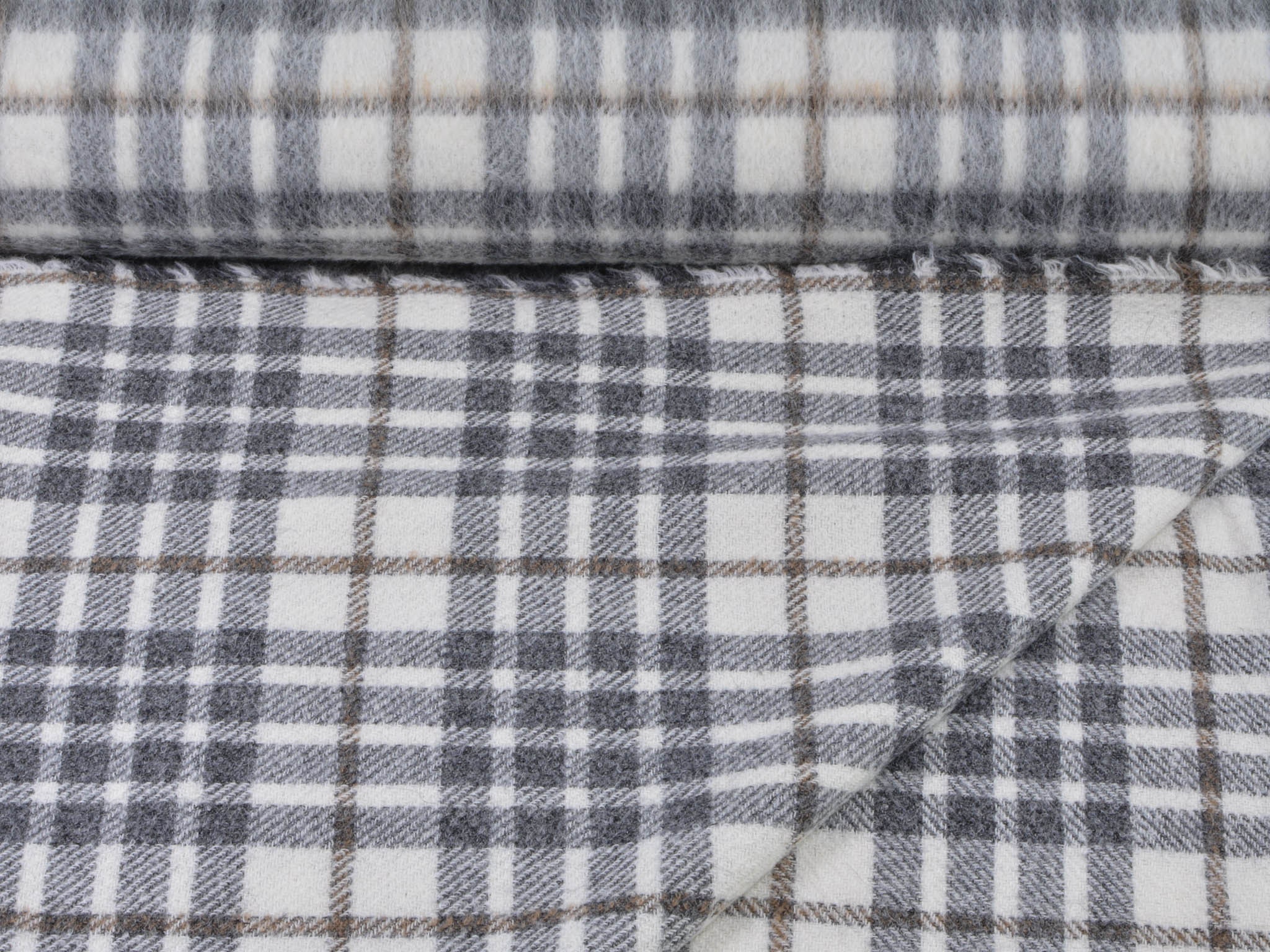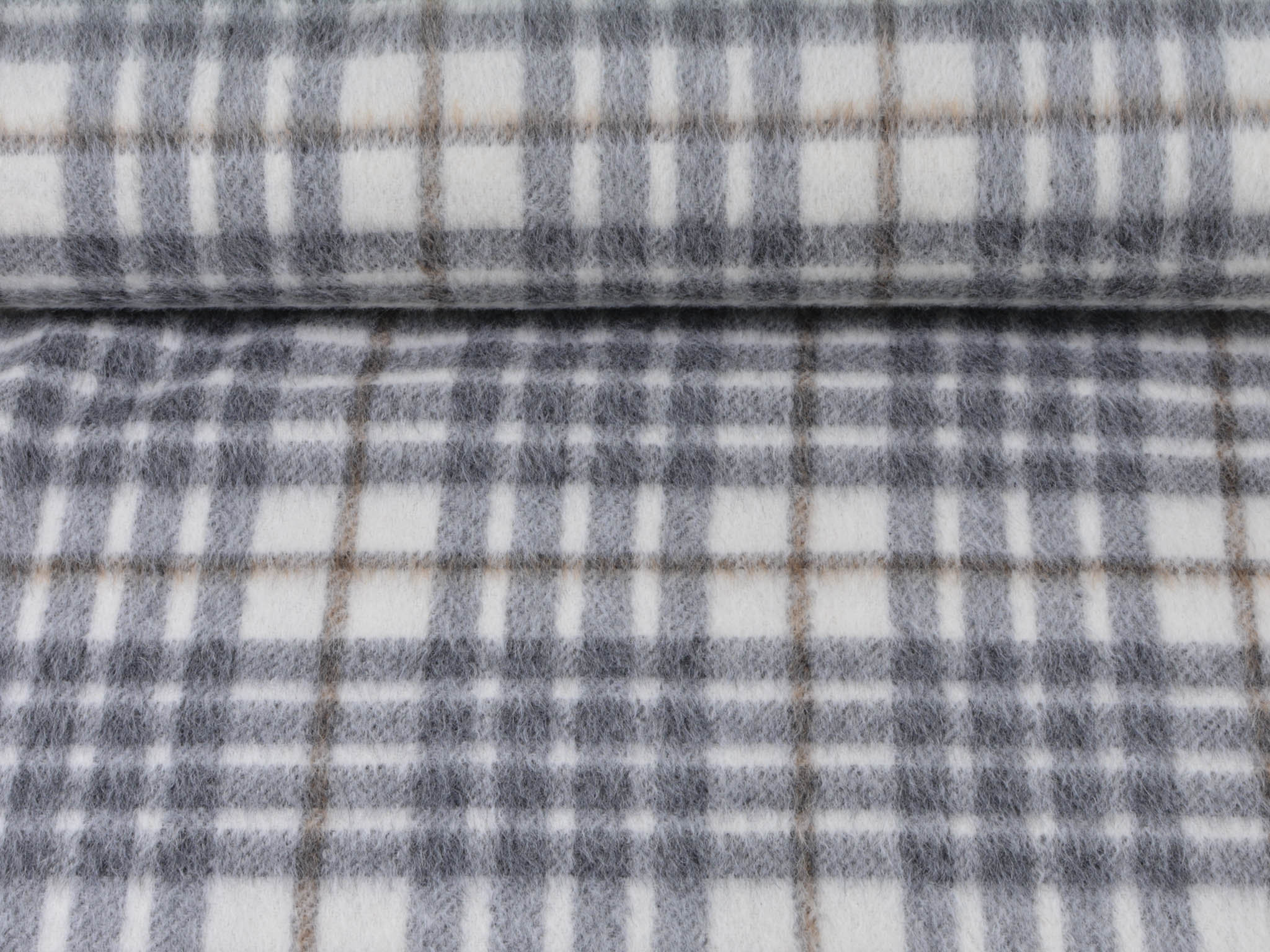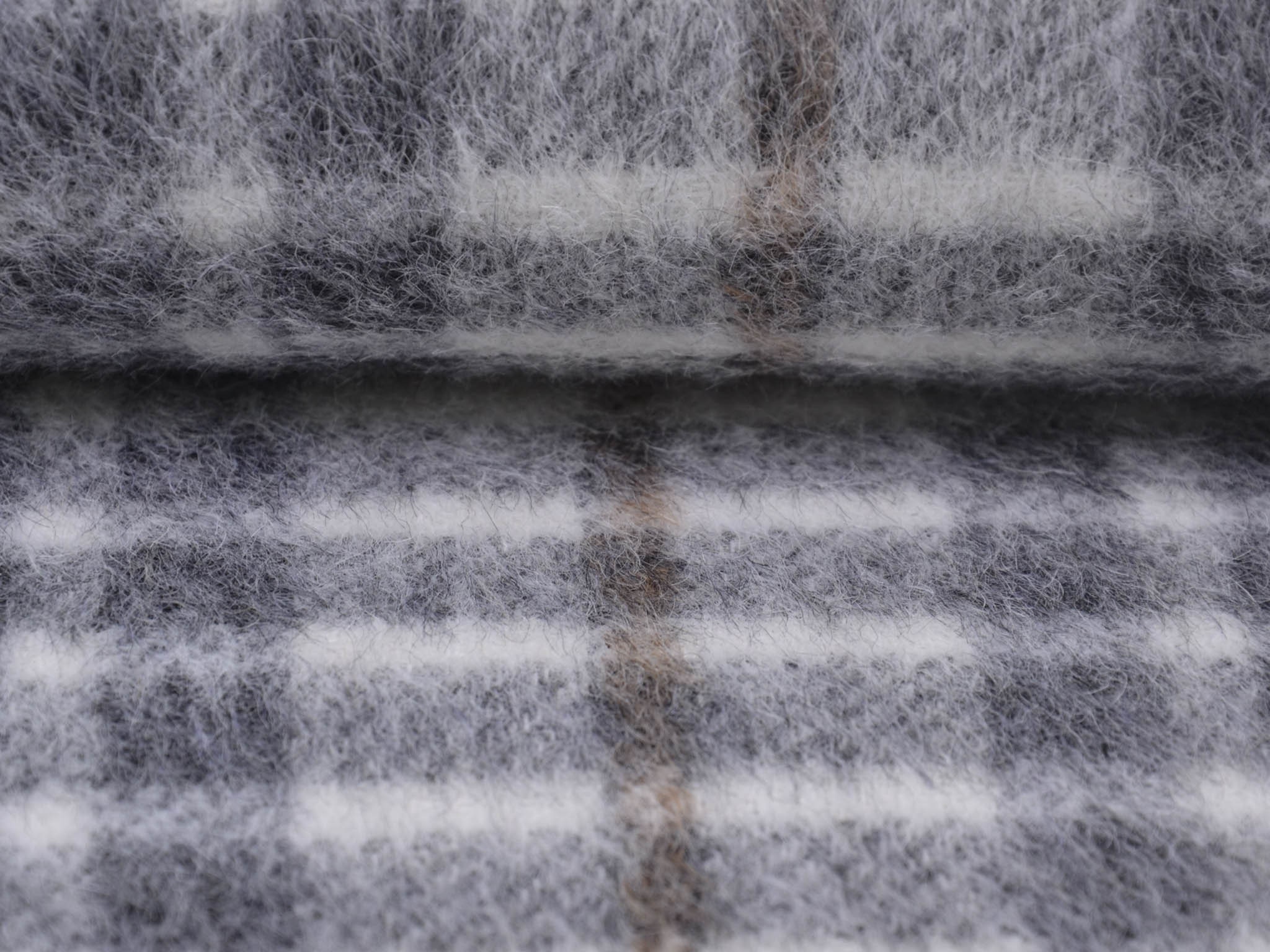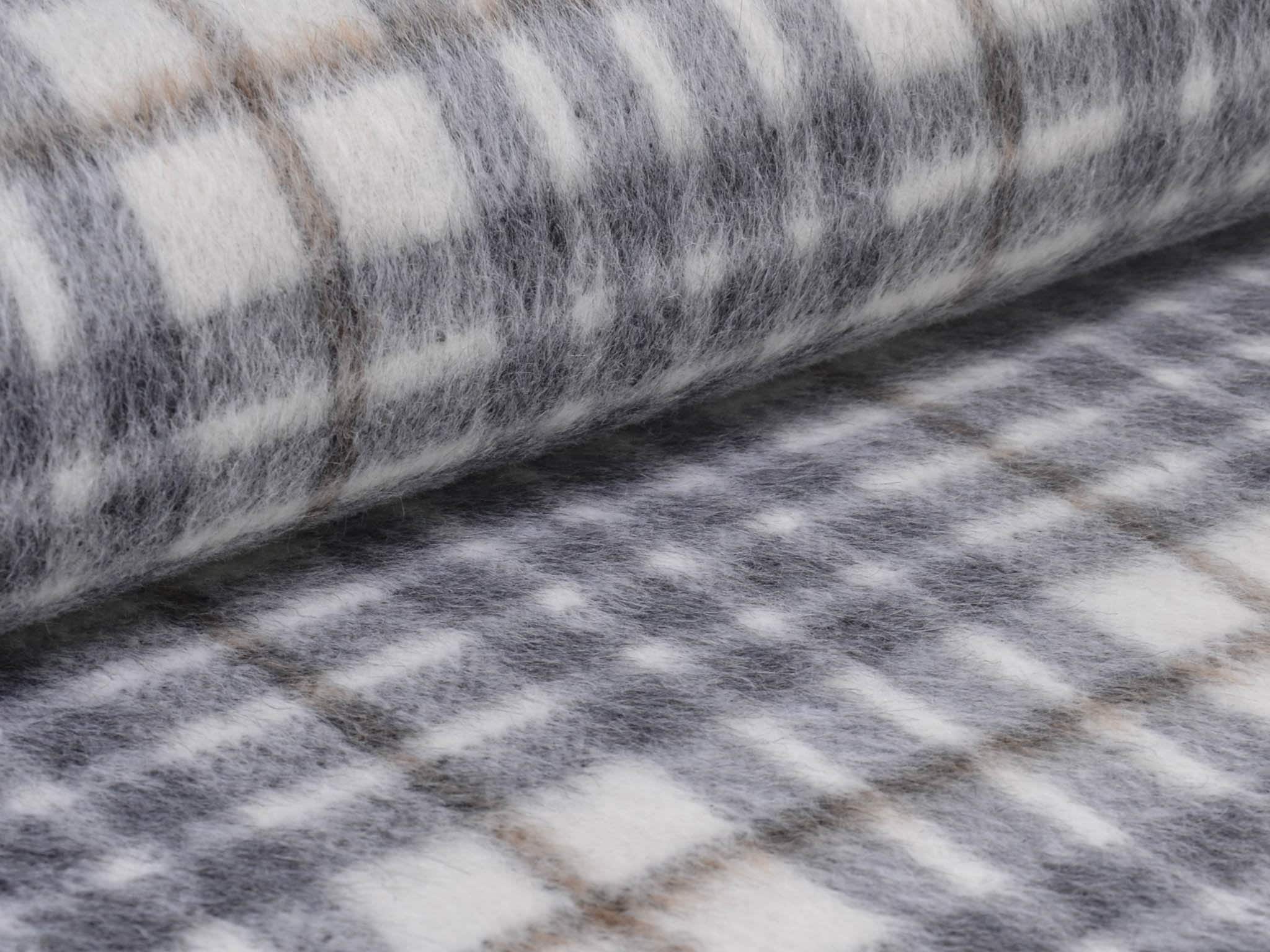 Super hochwertiger Mantelstoff mit Alpaka und Schurwolle. Der Stoff hat ein Karomuster in grau, creme-weiß und beige. Die linke Stoffseite zeigt die Webstrukur, auf der rechten Seite hat er Fell. Das beige, feine Karo ist ca. 16 x 16 cm groß.