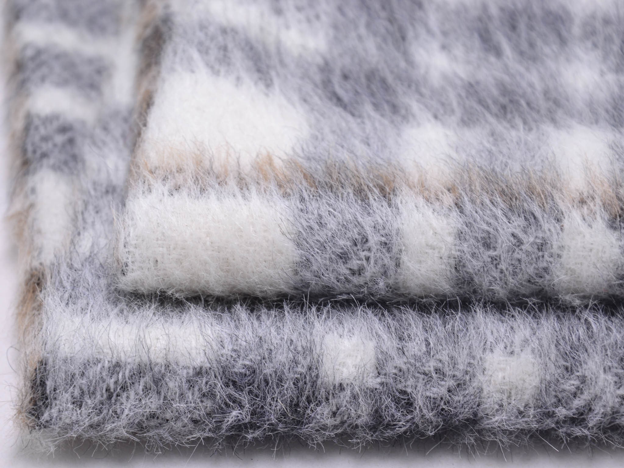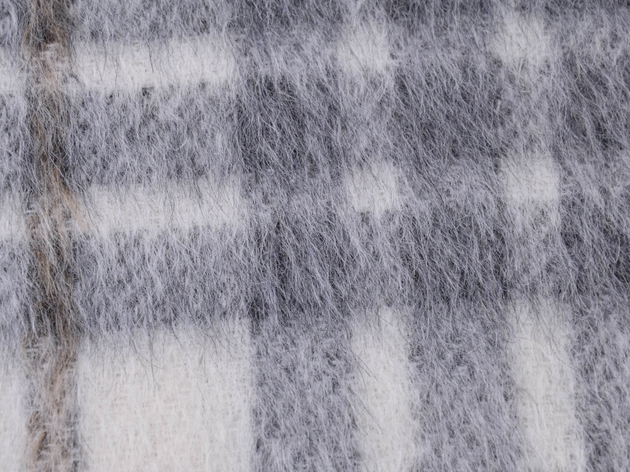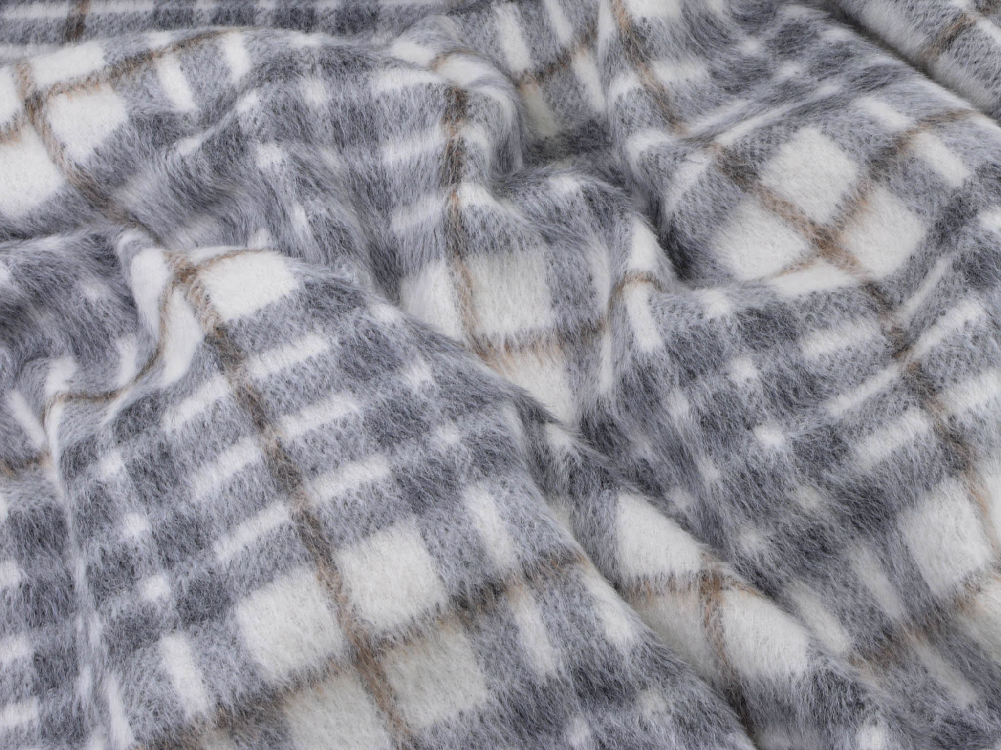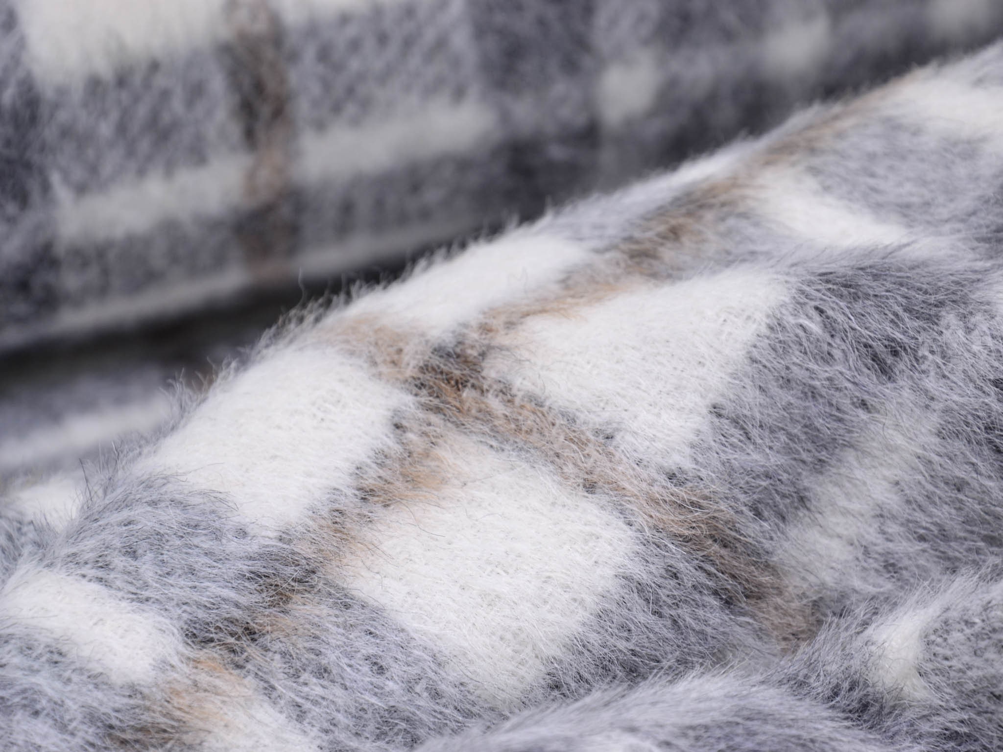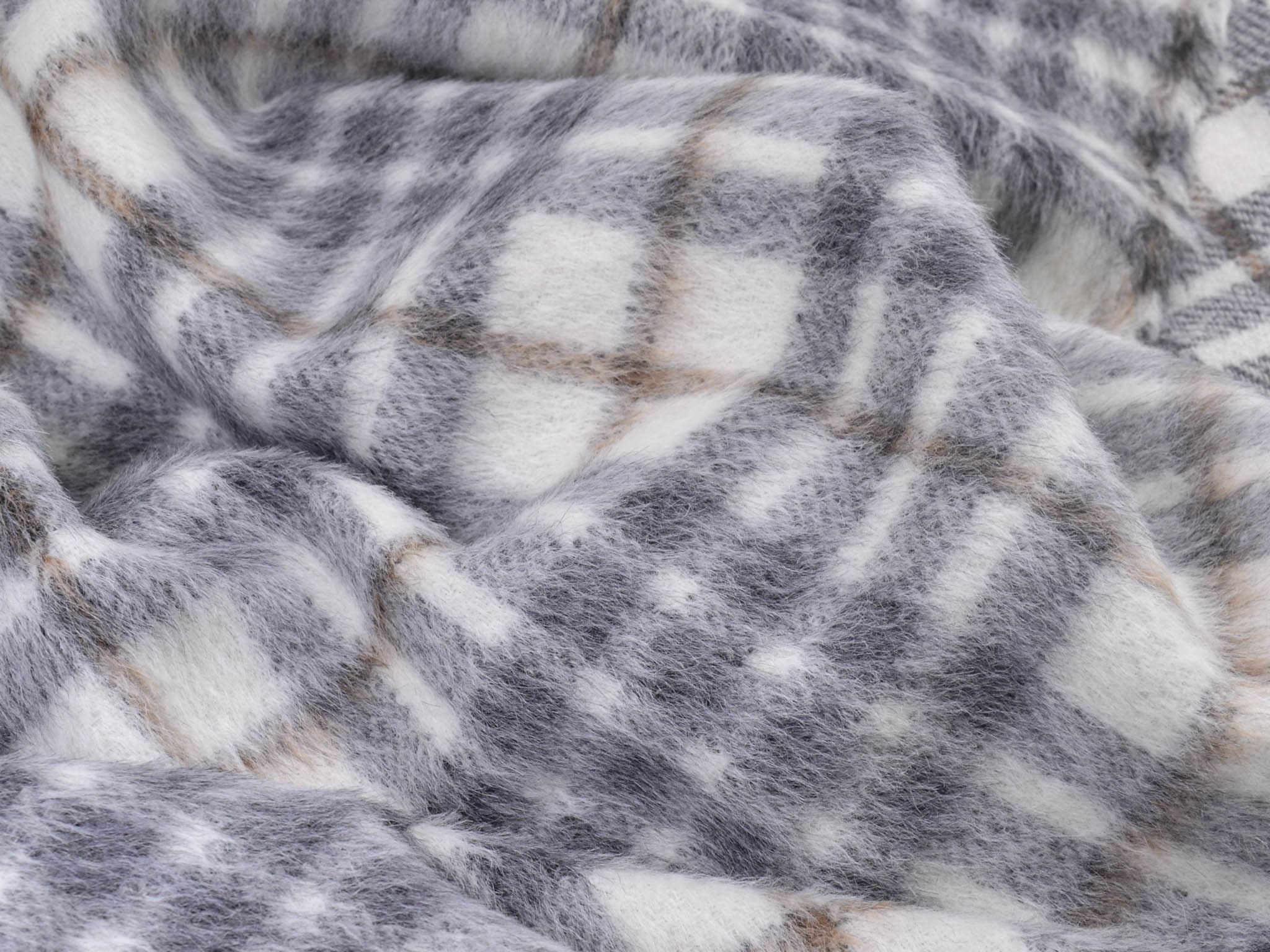 Super hochwertiger Mantelstoff mit Alpaka und Schurwolle. Der Stoff hat ein Karomuster in grau, creme-weiß und beige. Die linke Stoffseite zeigt die Webstrukur, auf der rechten Seite hat er Fell. Das beige, feine Karo ist ca. 16 x 16 cm groß.