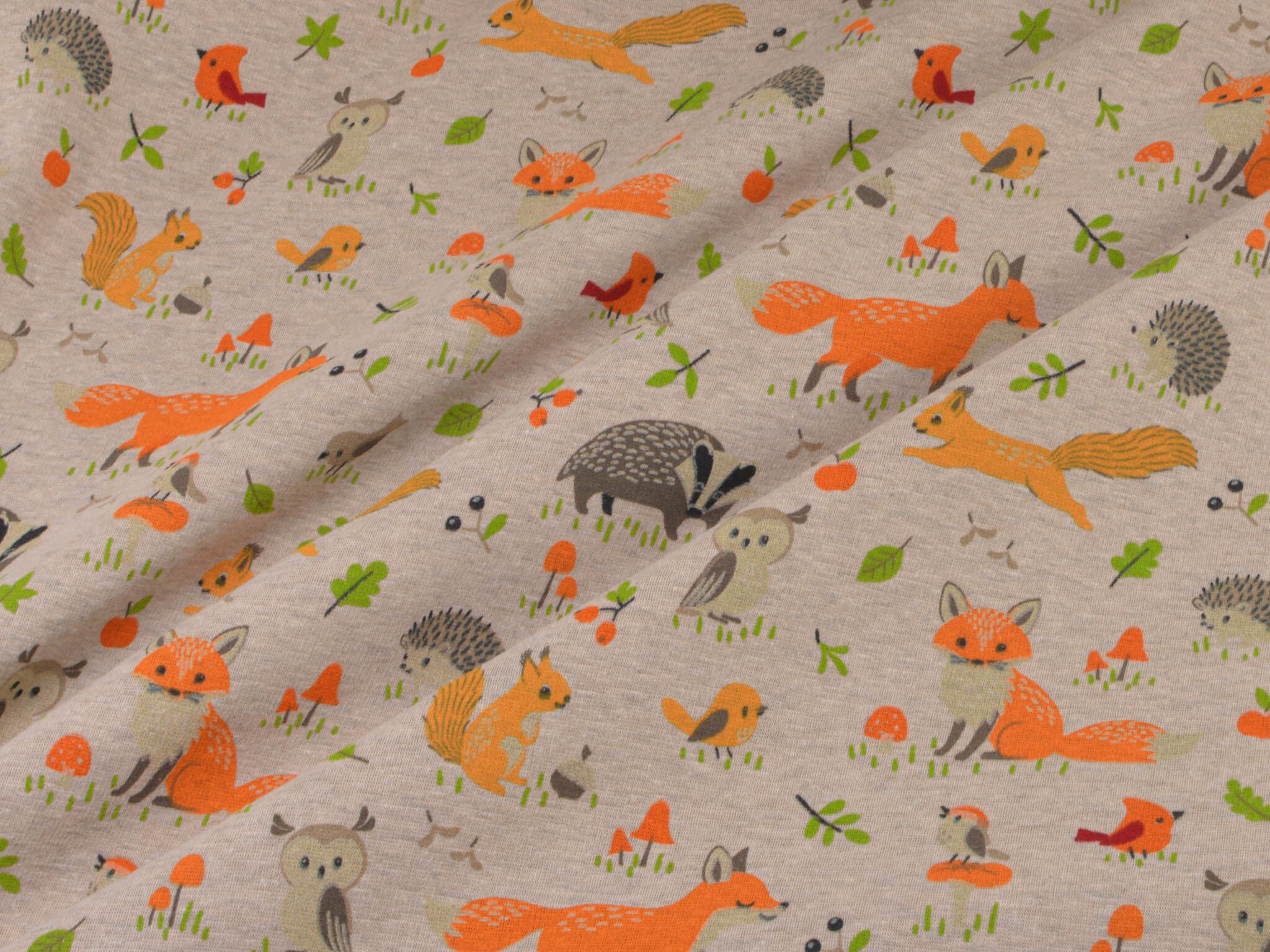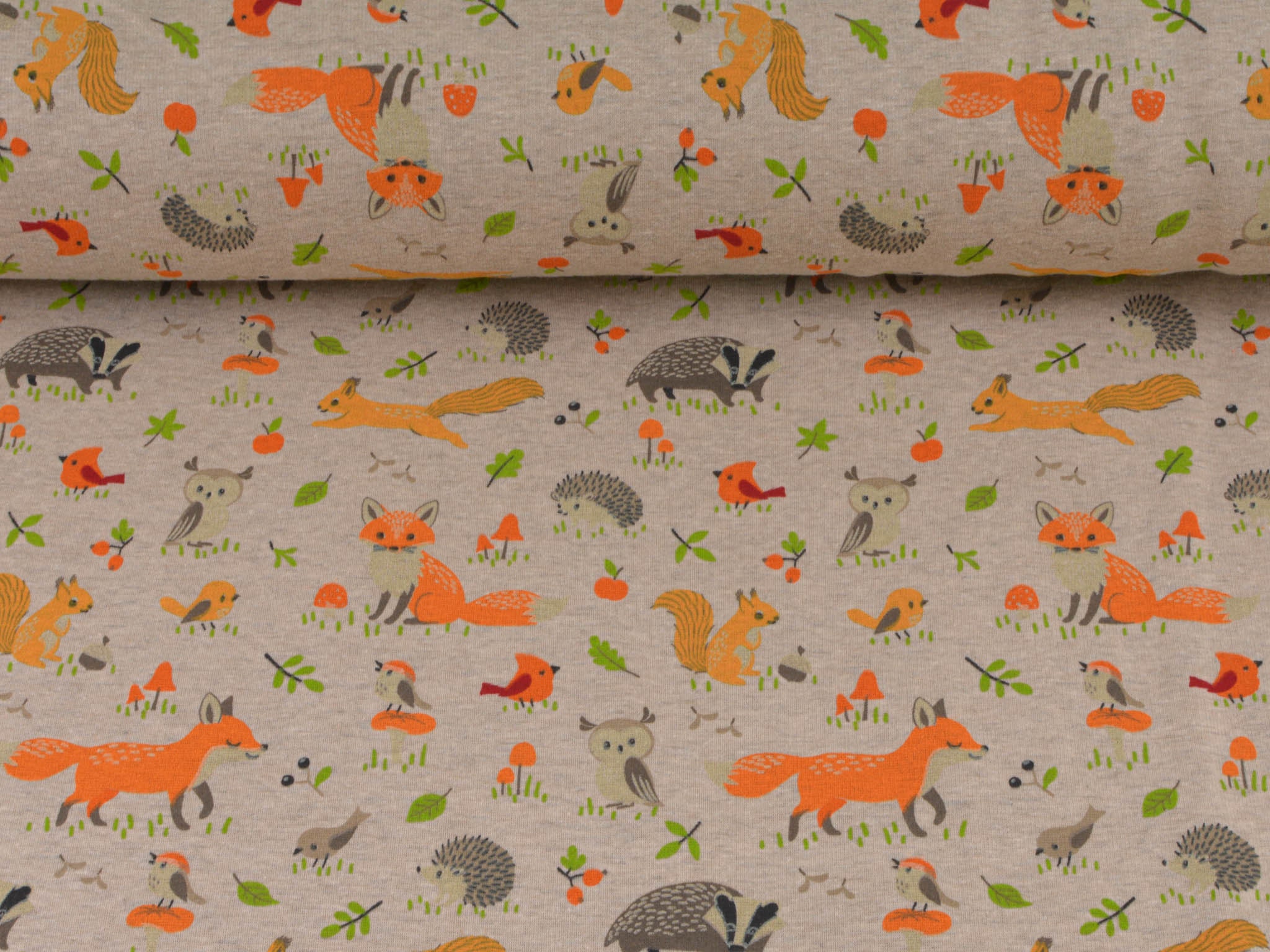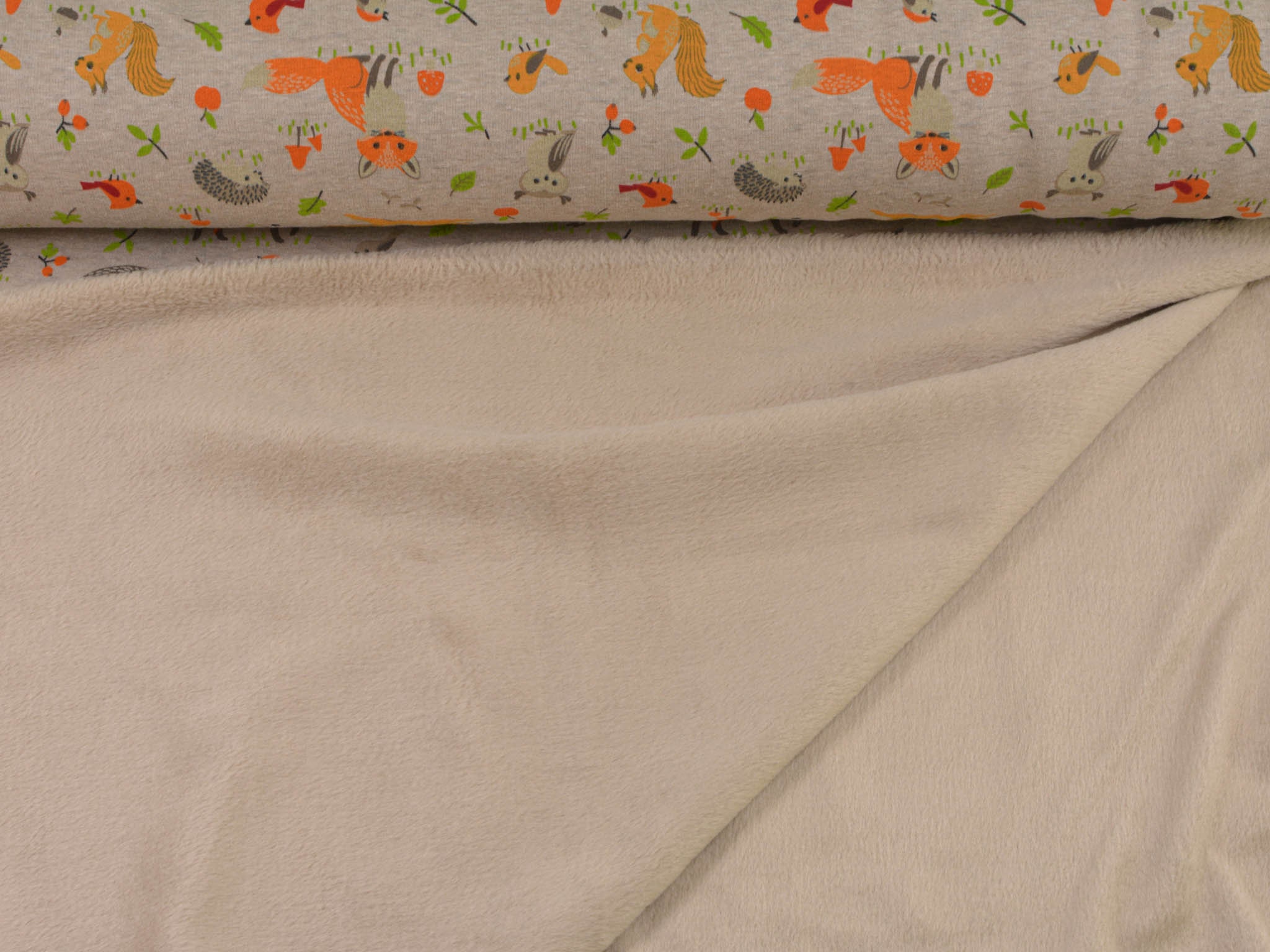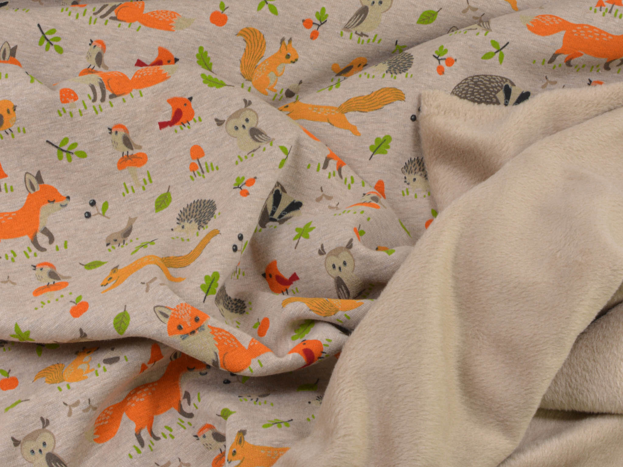 Hochwertiges Alpenfleece mit Waldtieren. Der beige Sweatstoff zeigt Füchse, Igel, Eulen, Vögel und Eichhörnchen. Die Innenseite ist flauschig weich. Du kannst daraus Sweatjacken, Pullover, Pumphosen und so vieles mehr nähen.