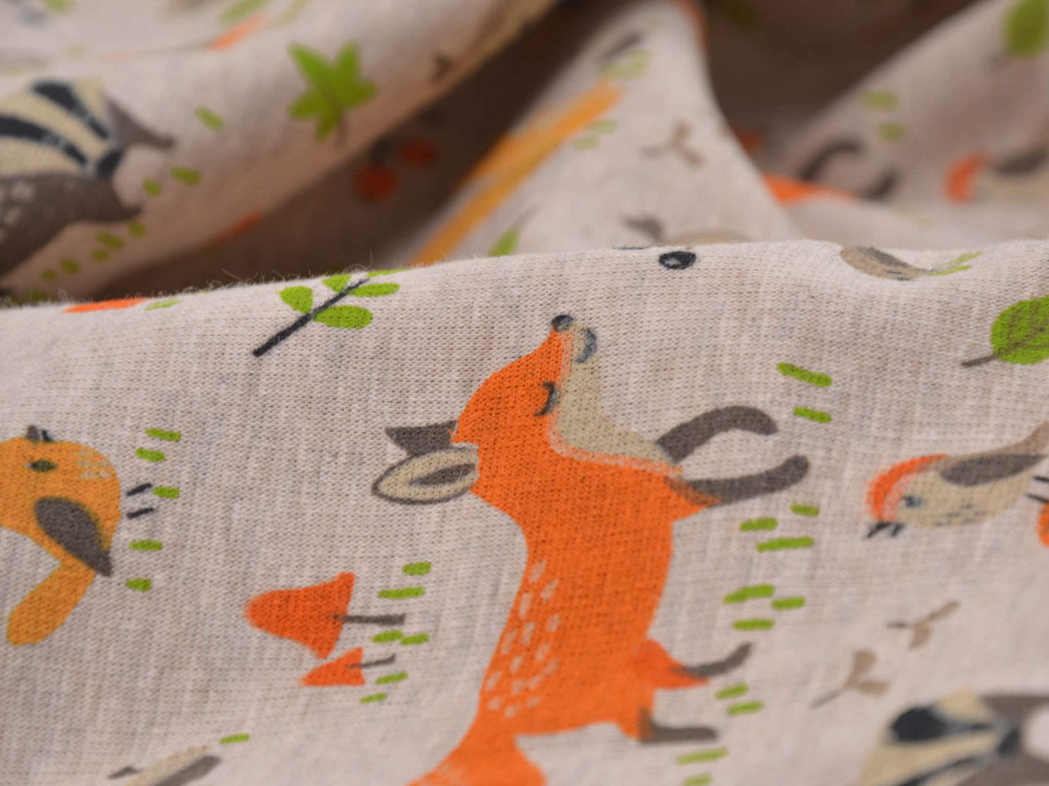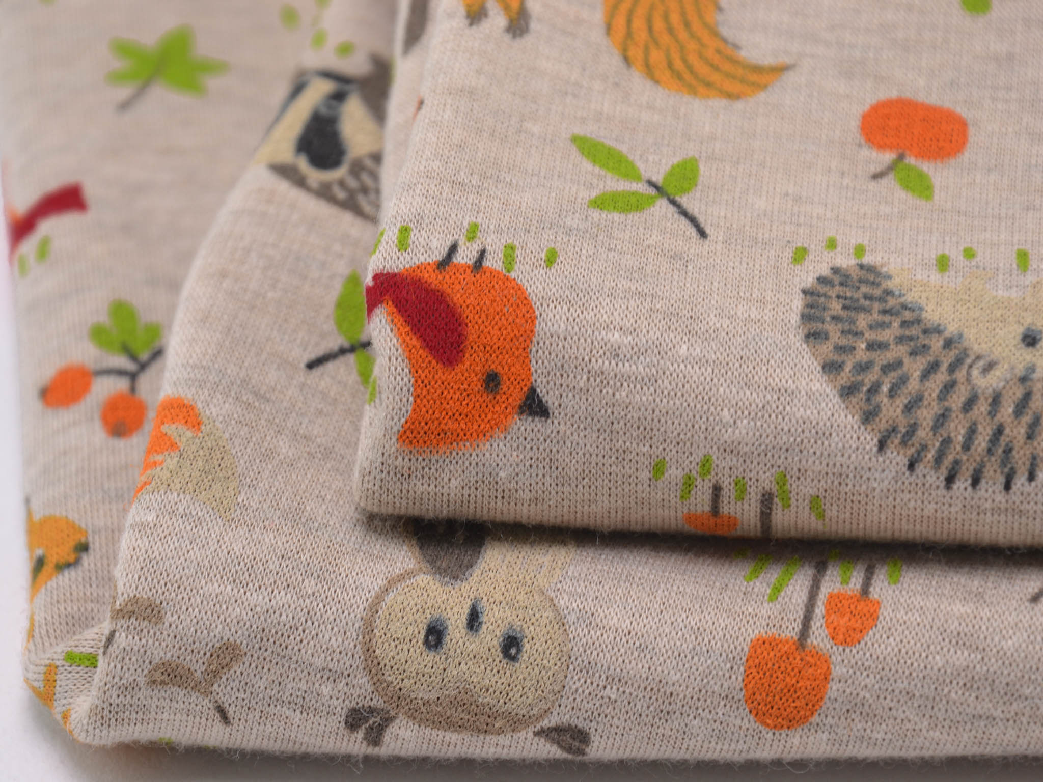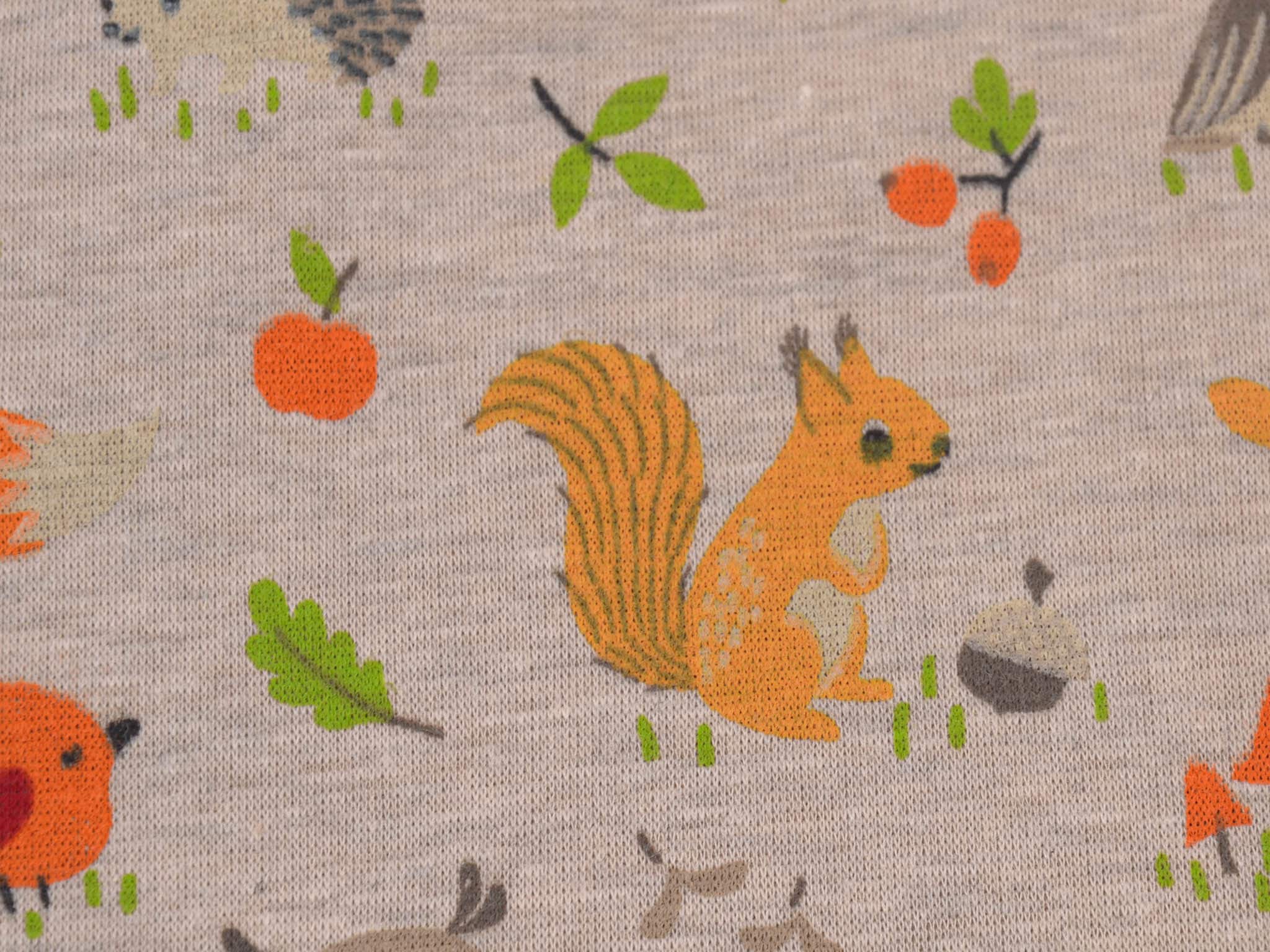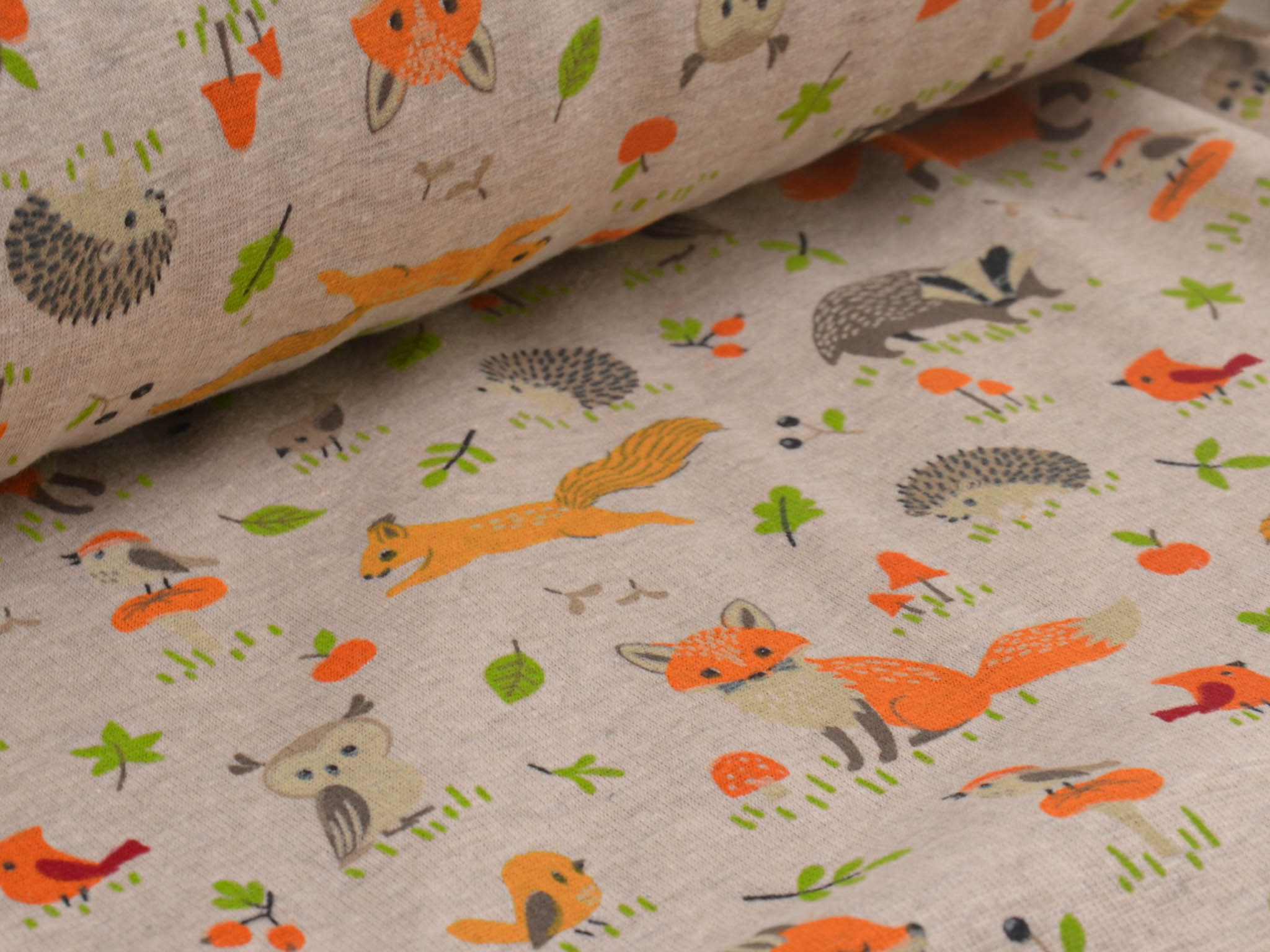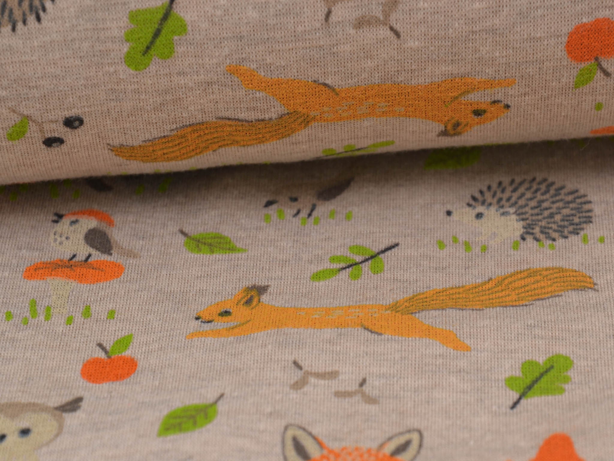 Hochwertiges Alpenfleece mit Waldtieren. Der beige Sweatstoff zeigt Füchse, Igel, Eulen, Vögel und Eichhörnchen. Die Innenseite ist flauschig weich. Du kannst daraus Sweatjacken, Pullover, Pumphosen und so vieles mehr nähen.