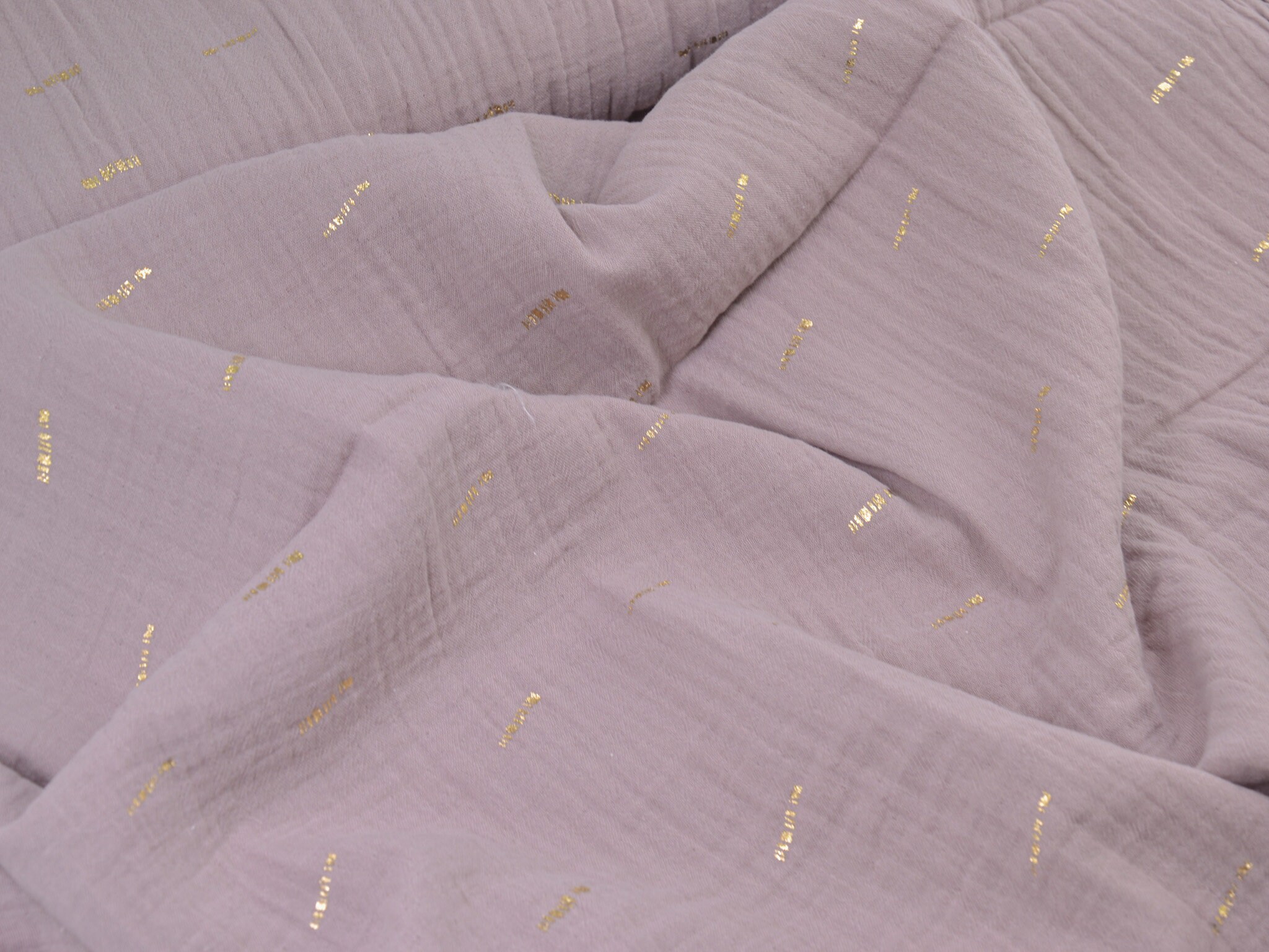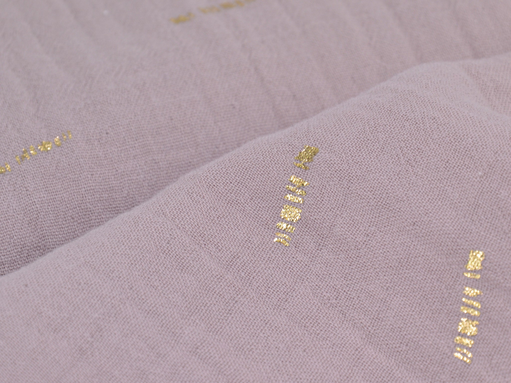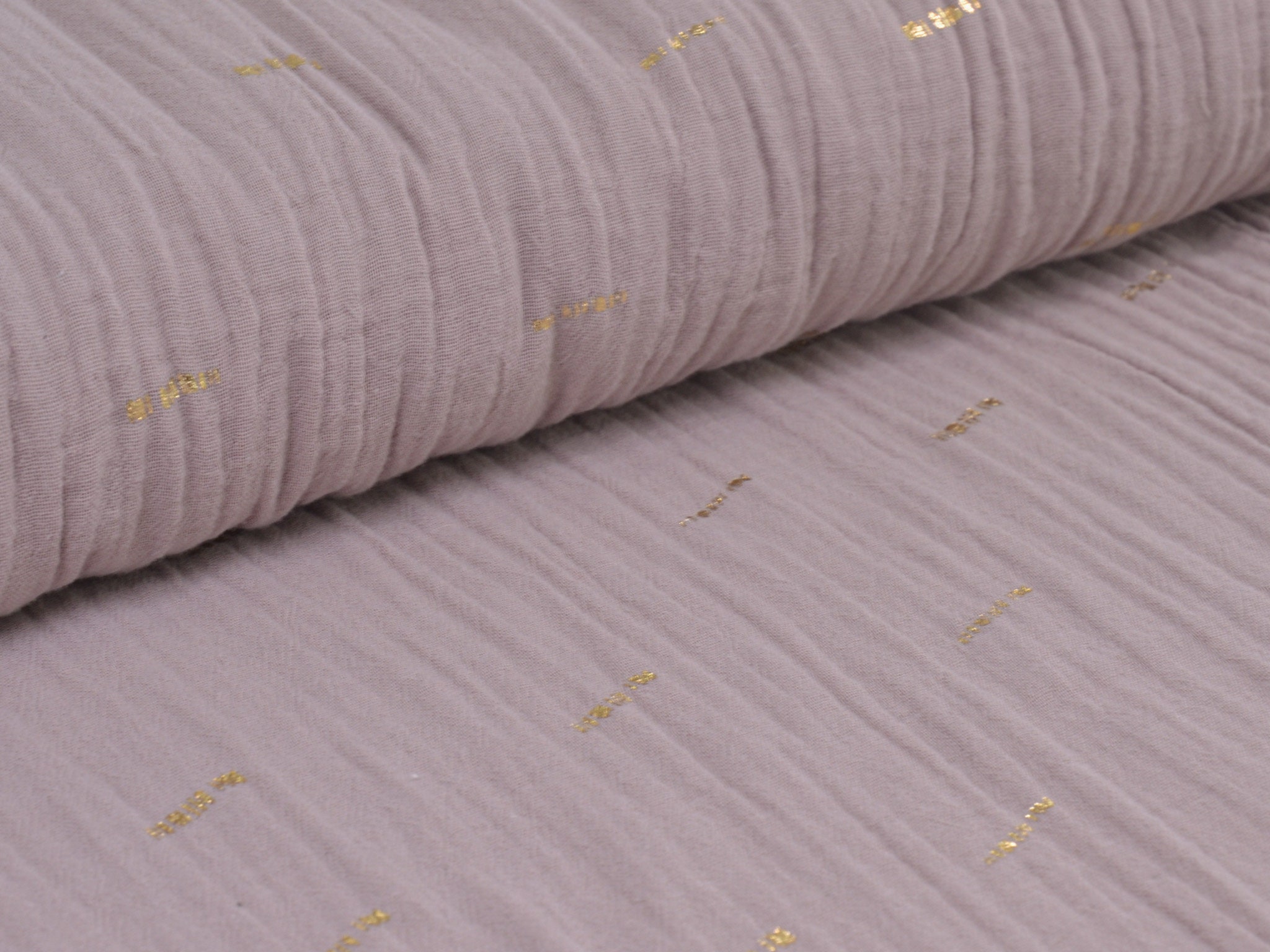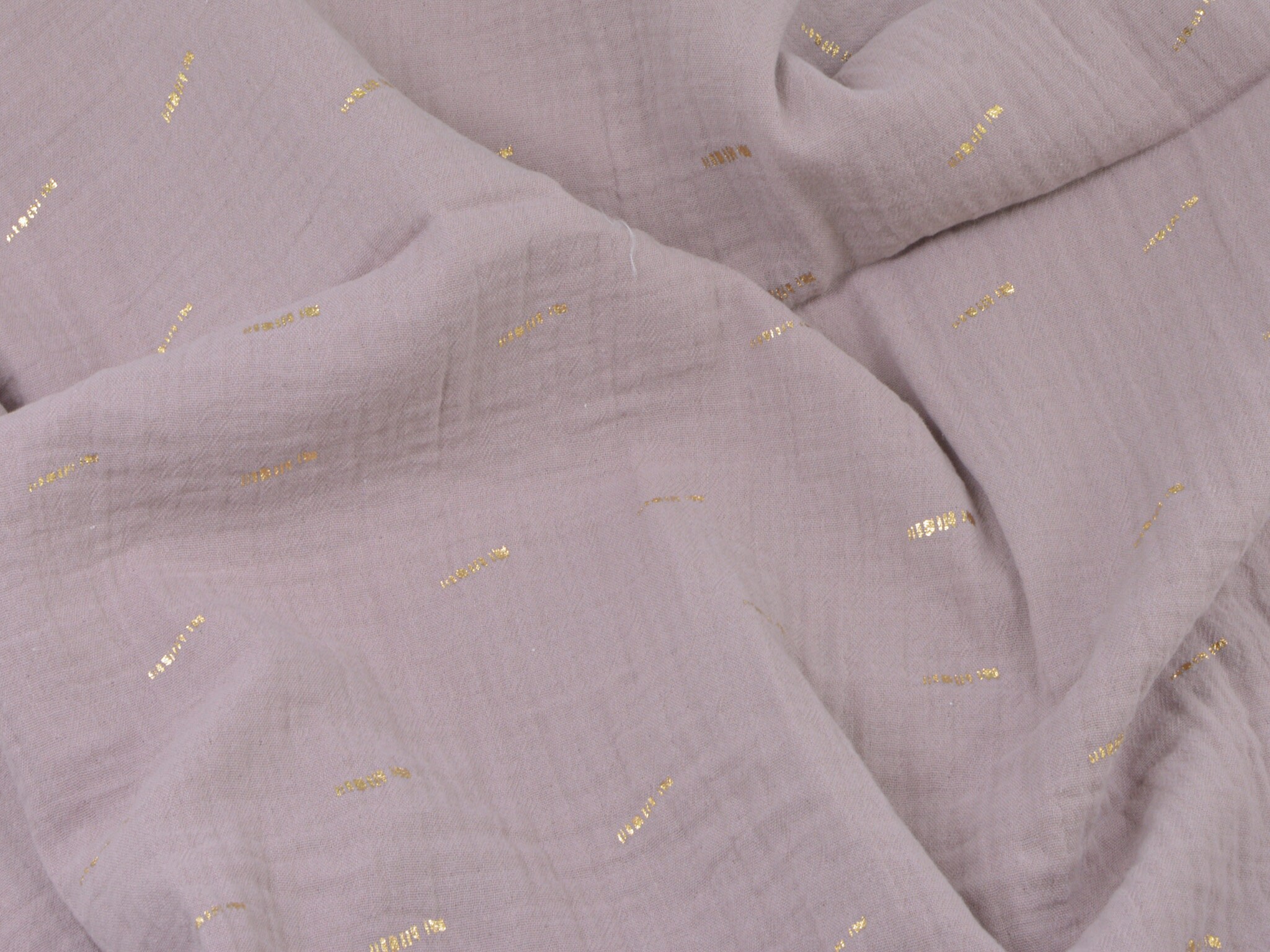 Hochwertiger Musselin aus Baumwolle in mauve. Der Musselin hat goldene Striche darauf. Ein Strich ist ca. 2 cm lang. Musselin ist weich und fließend. Du kannst daraus Blusen, Kleider, Röcke, Schals und vieles mehr nähen.