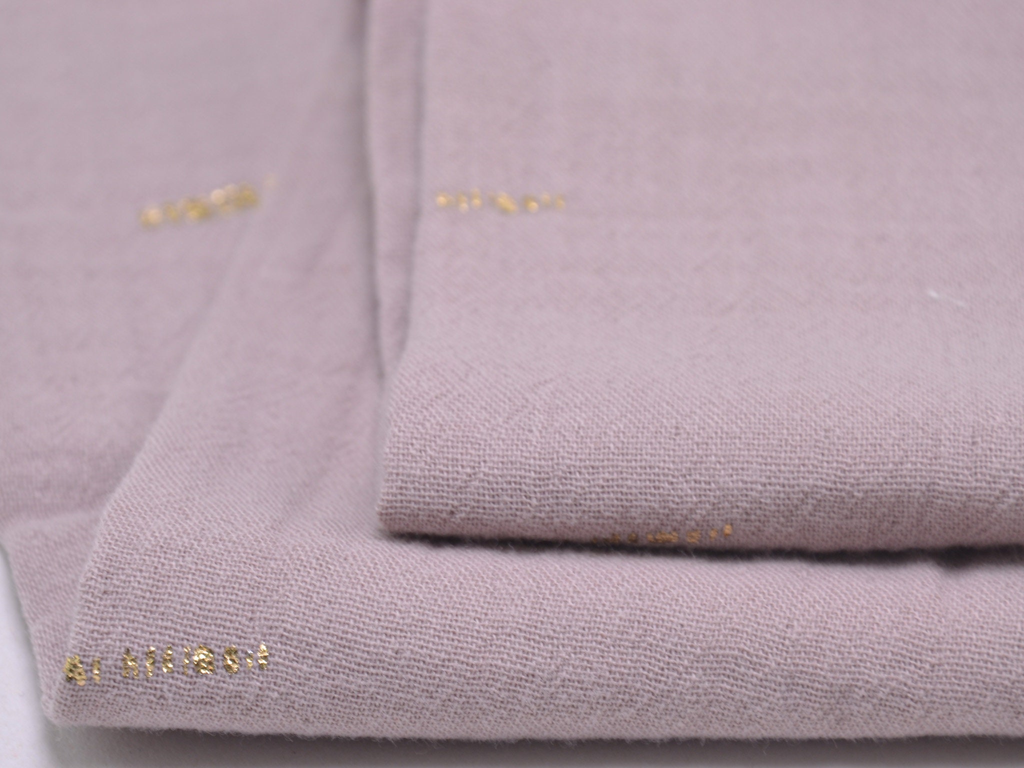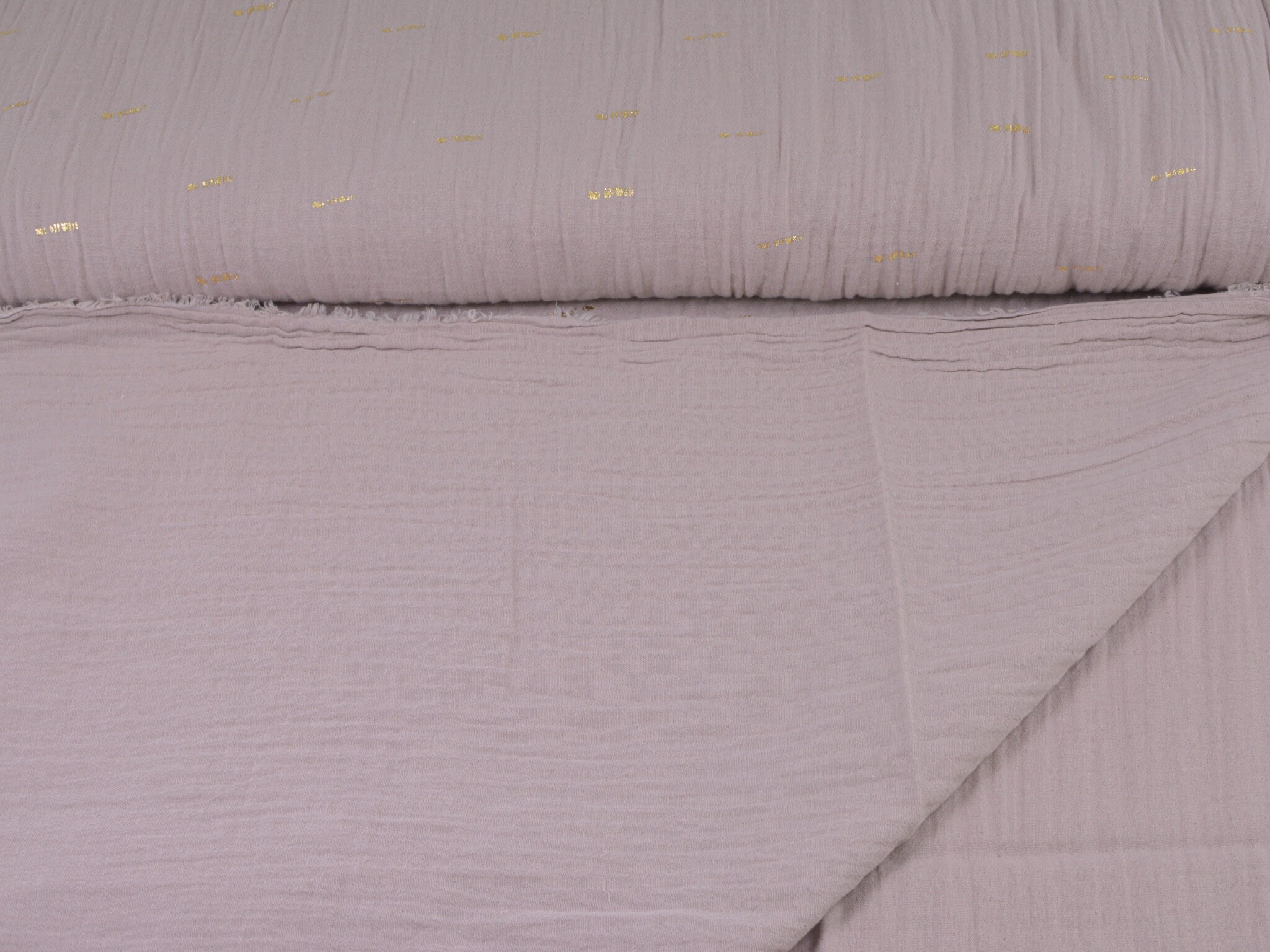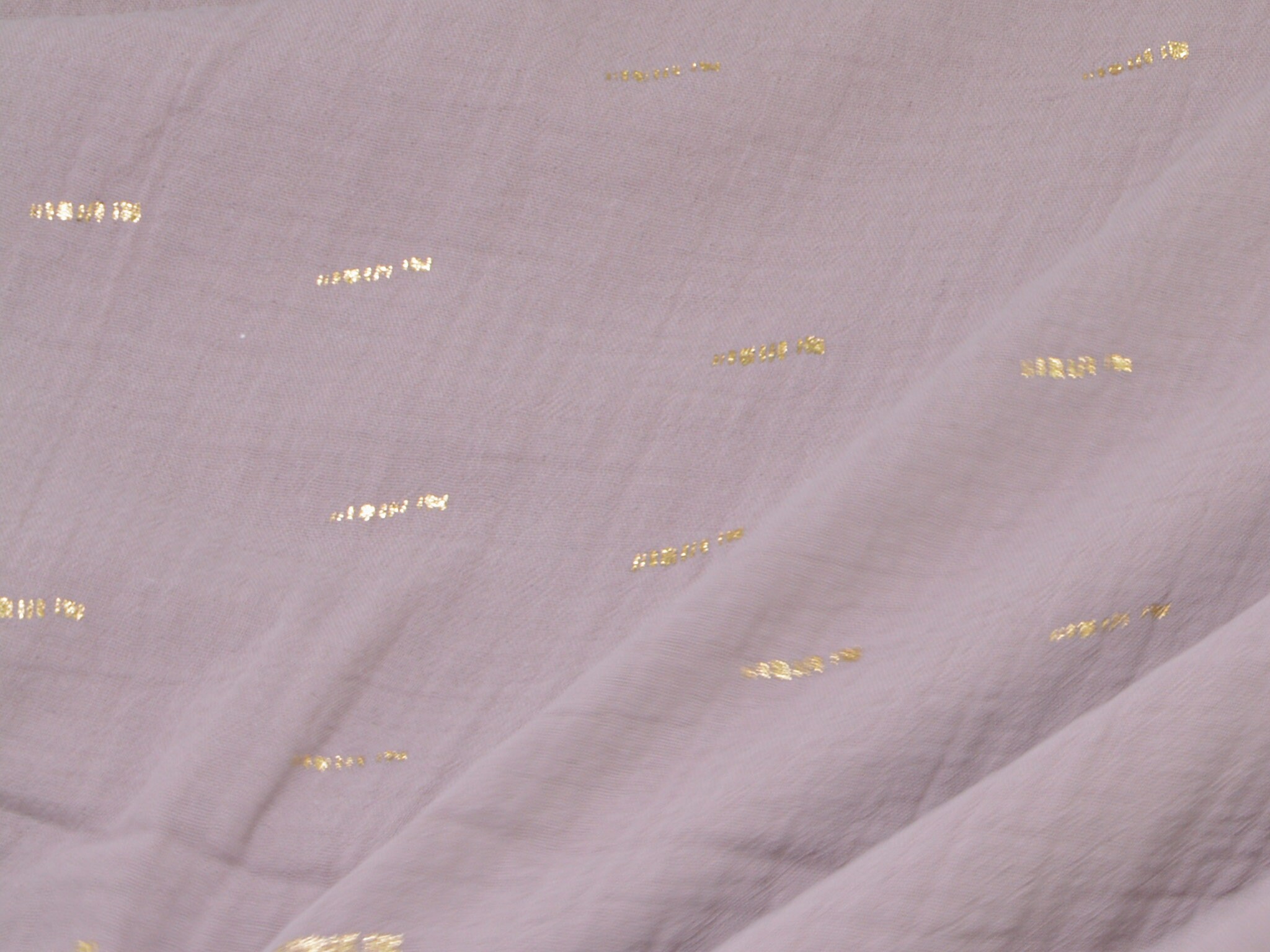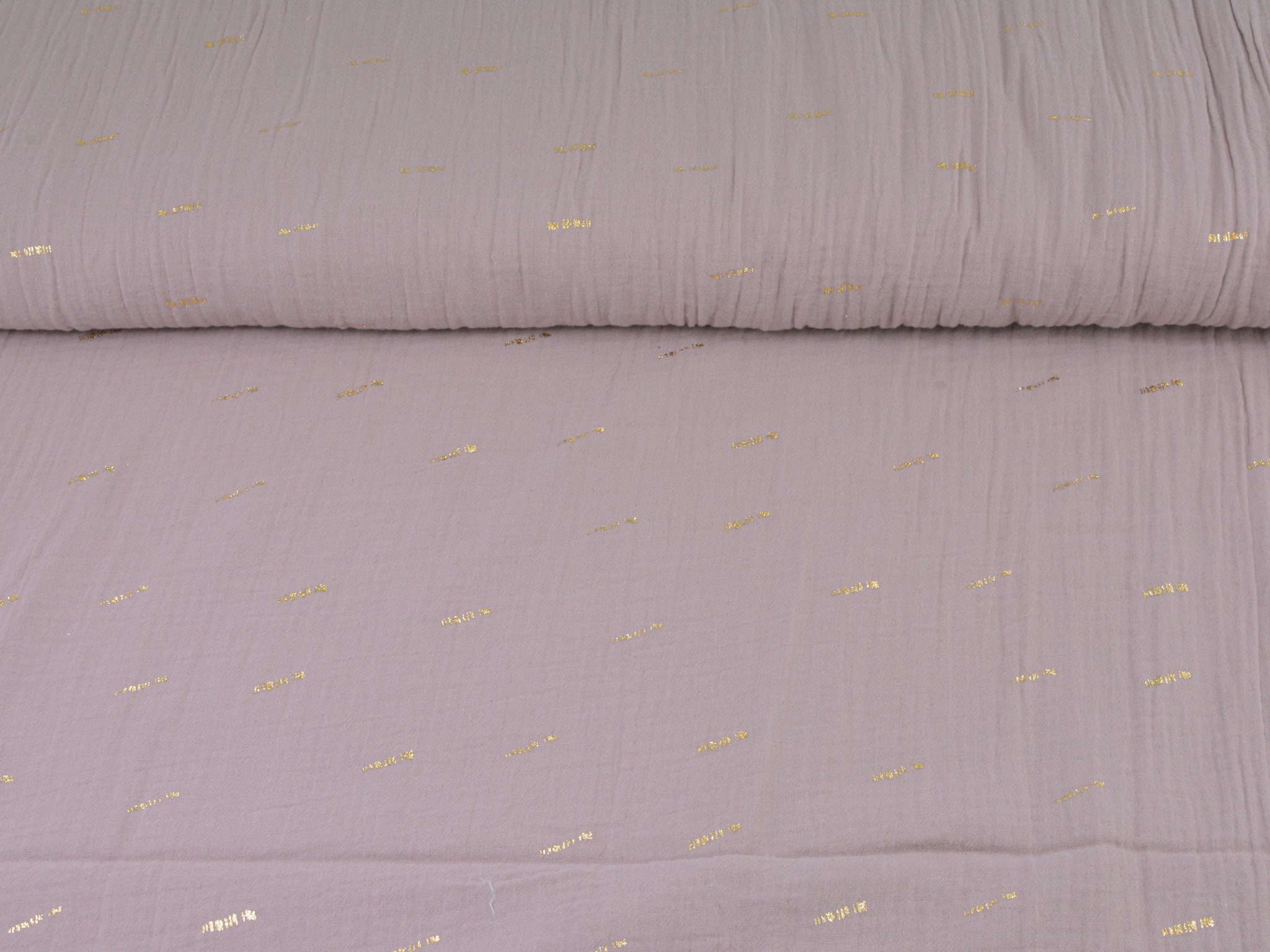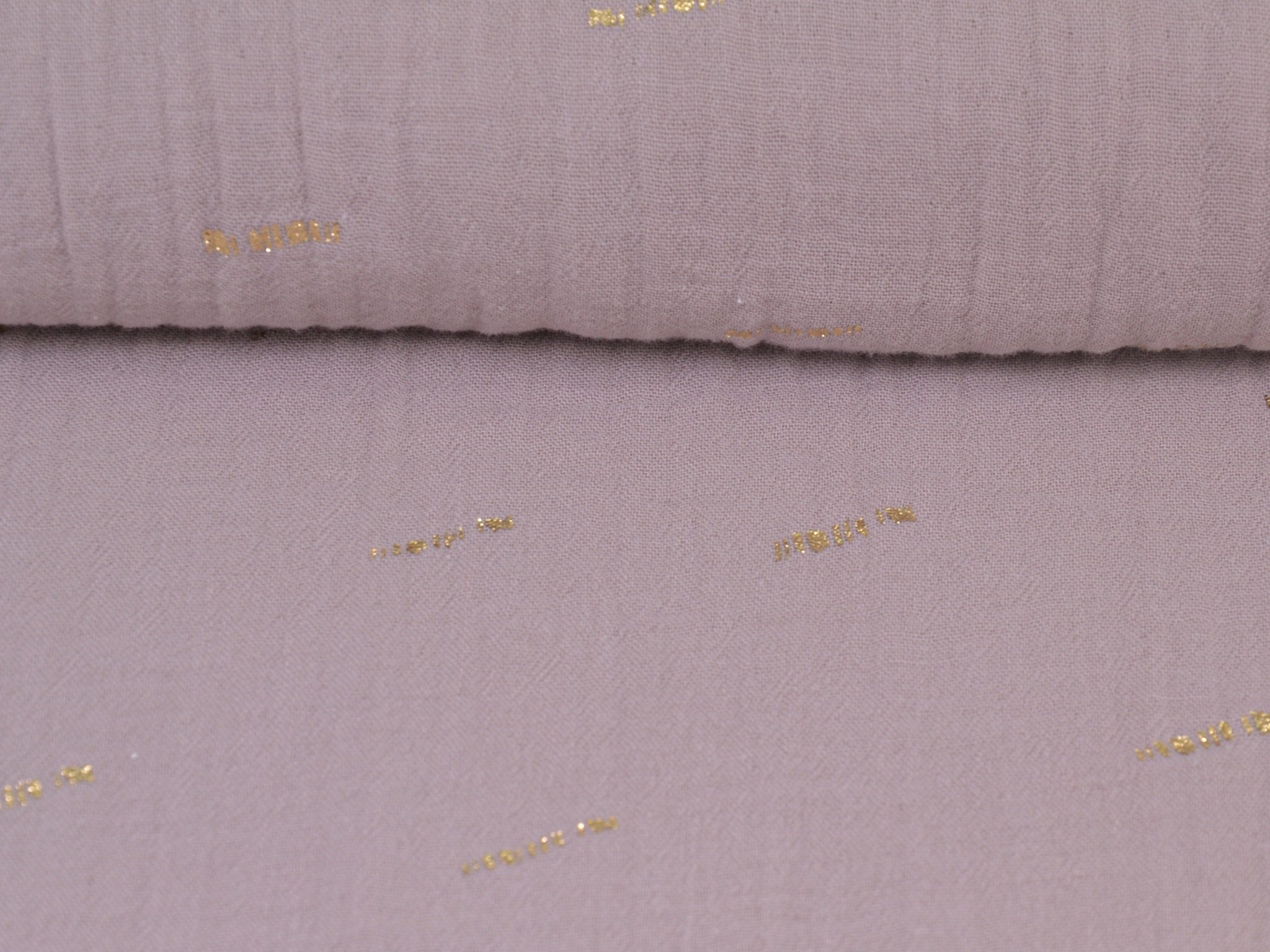 Hochwertiger Musselin aus Baumwolle in mauve. Der Musselin hat goldene Striche darauf. Ein Strich ist ca. 2 cm lang. Musselin ist weich und fließend. Du kannst daraus Blusen, Kleider, Röcke, Schals und vieles mehr nähen.