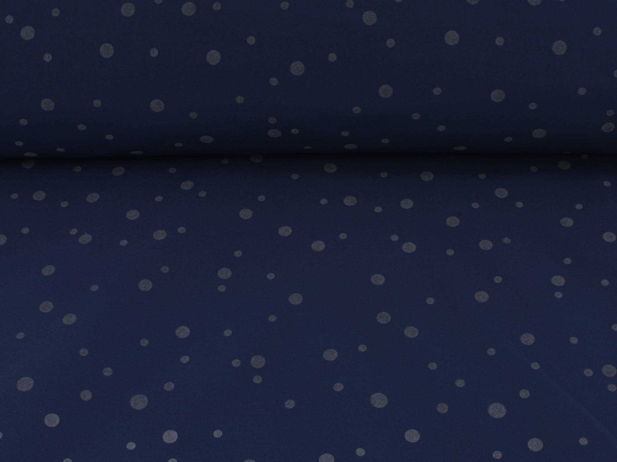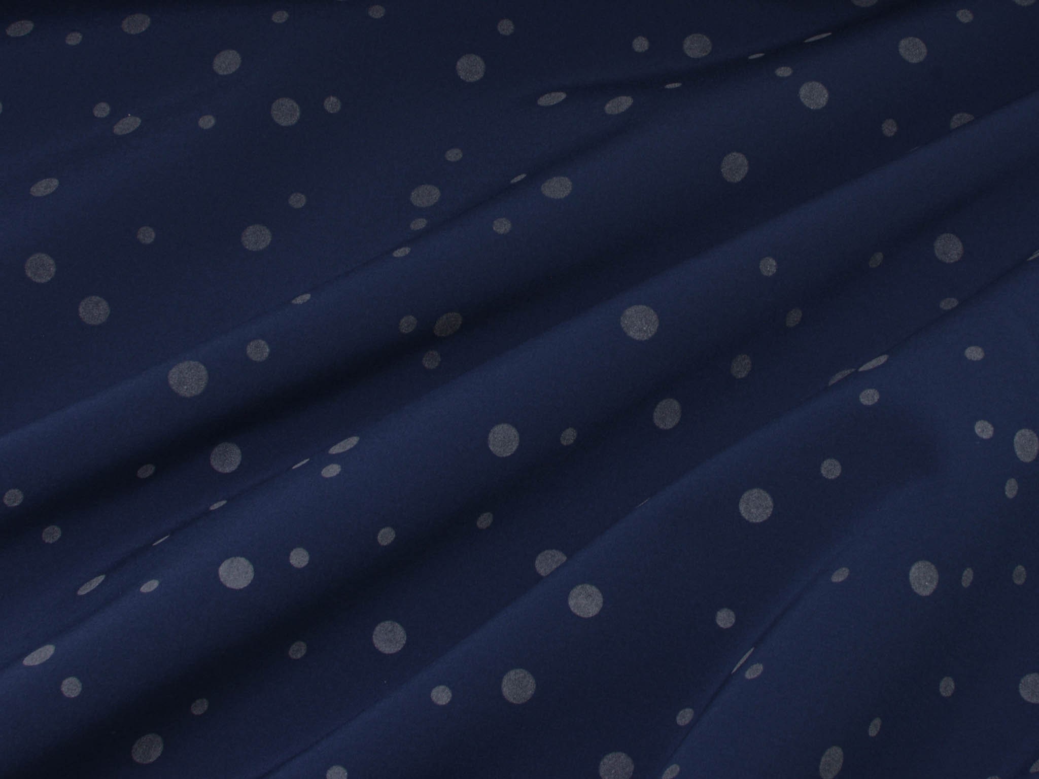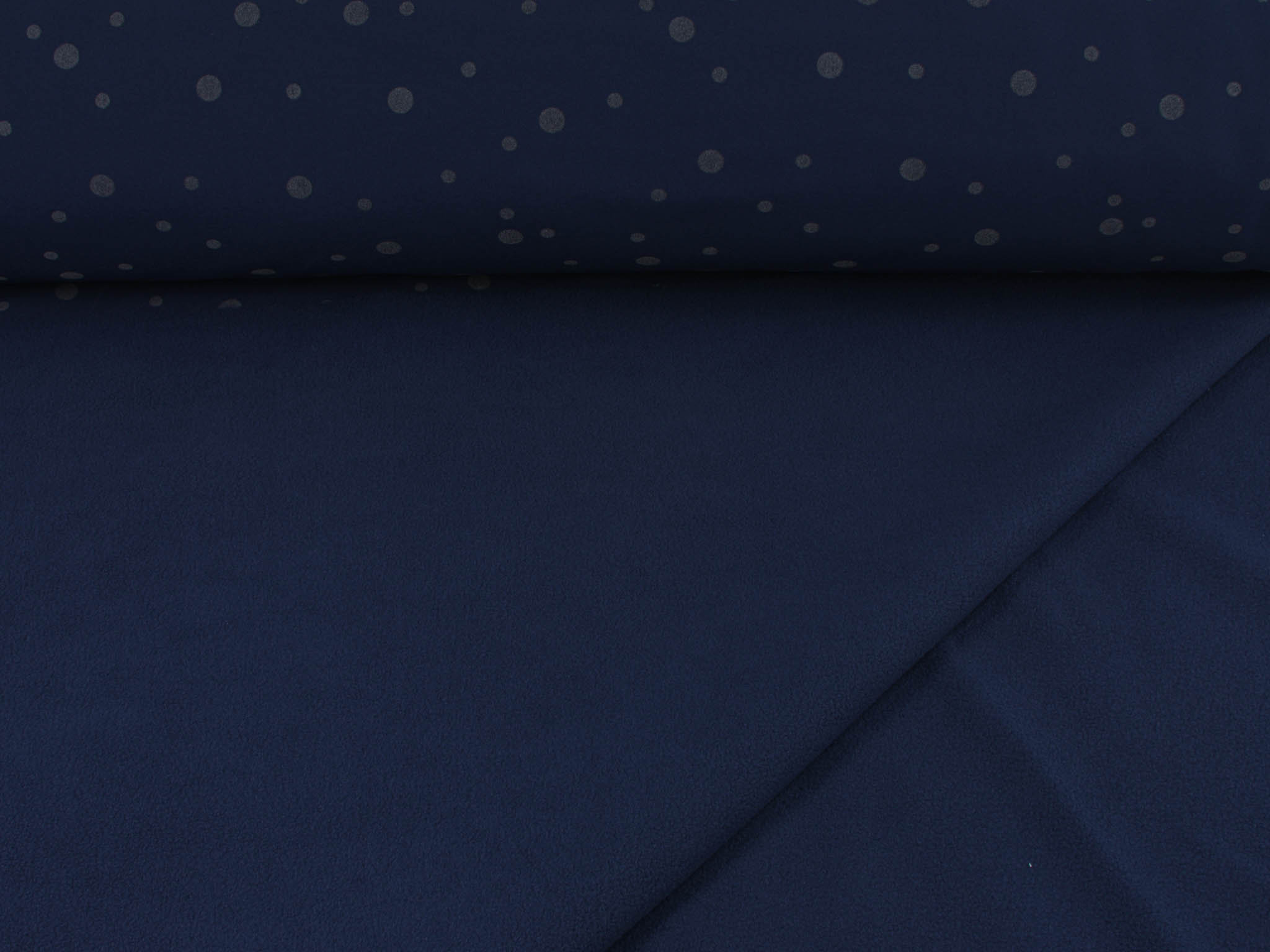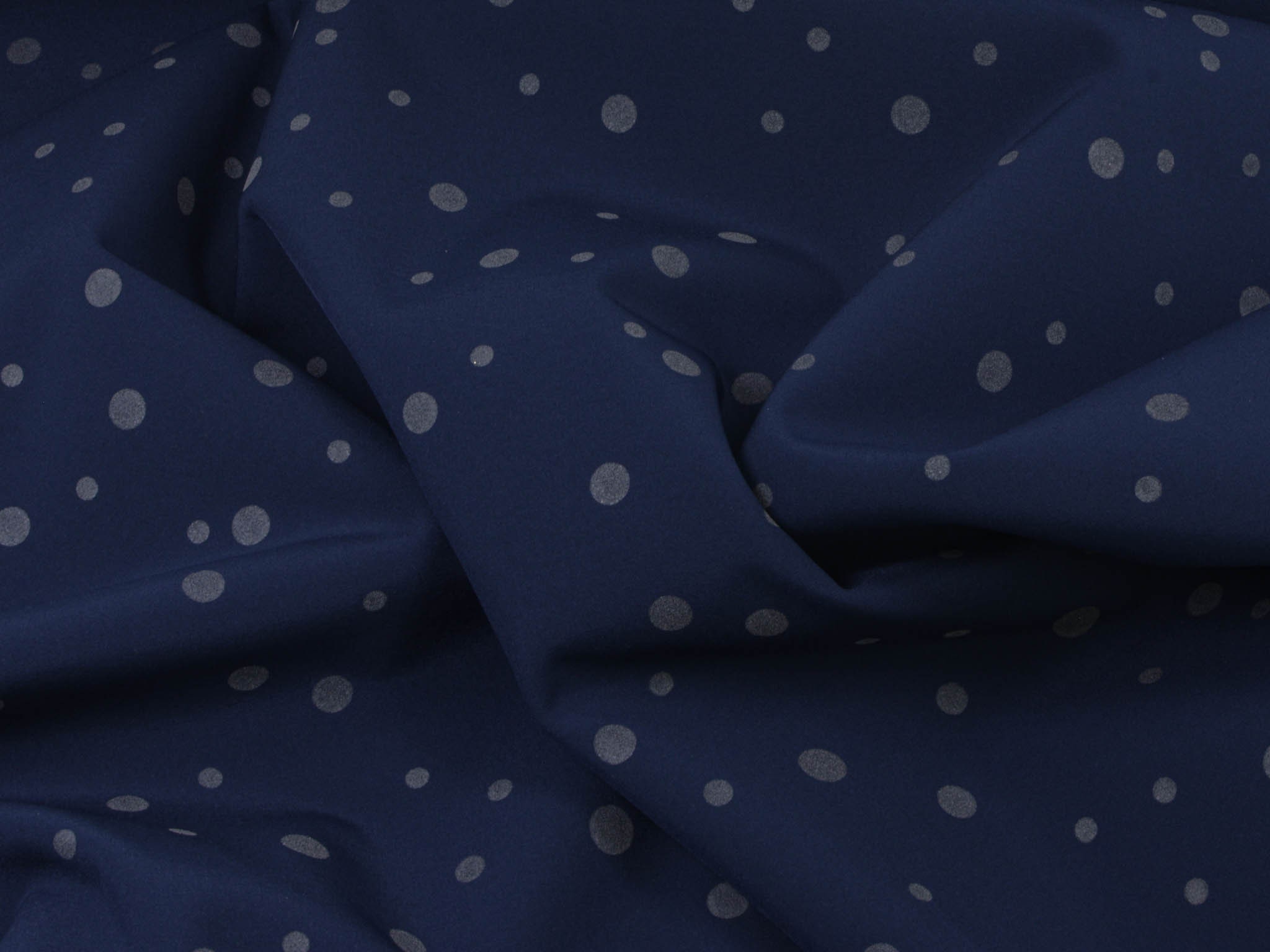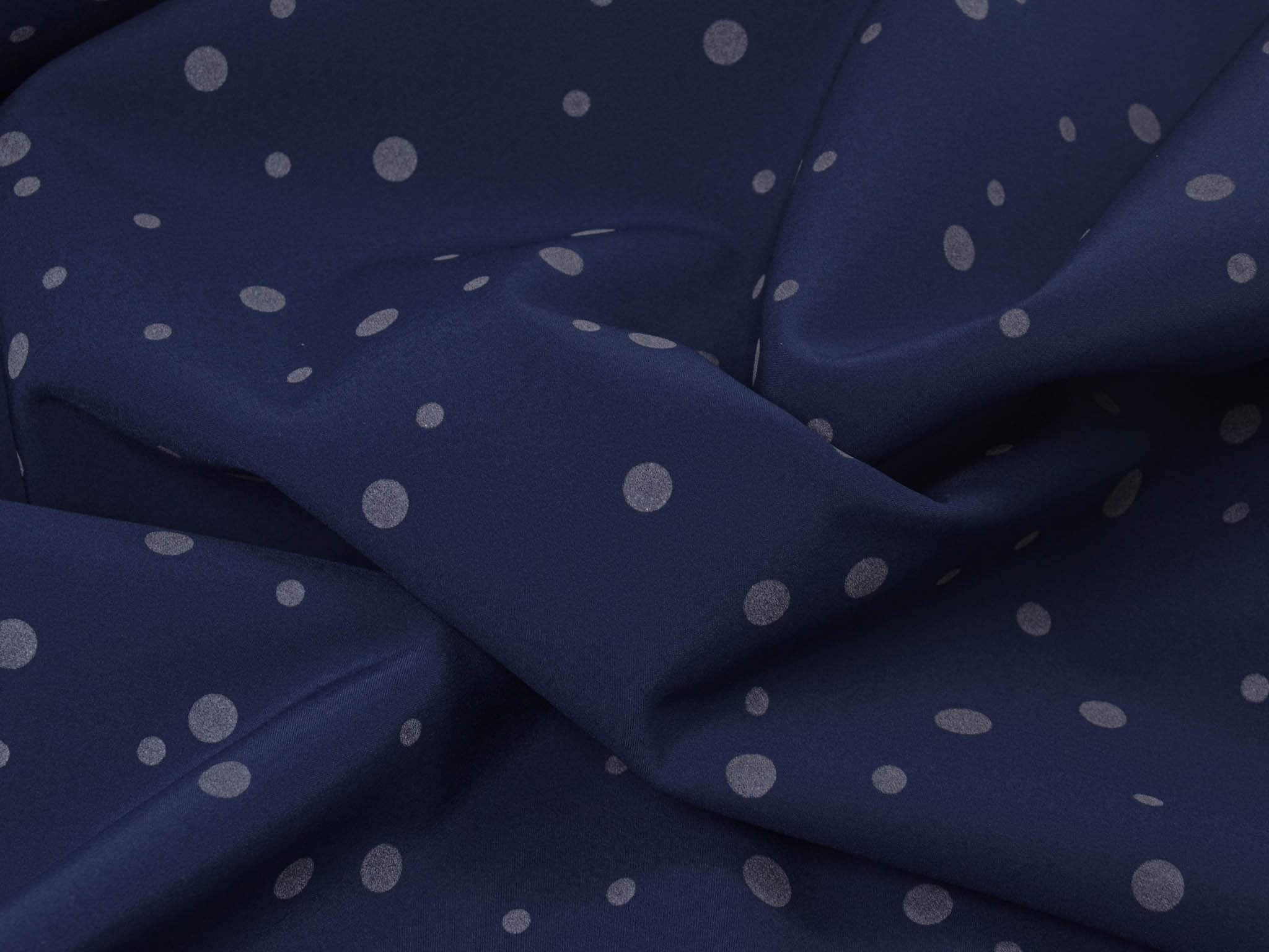 Reflective softshell fabric in dark blue with dots. The softshell fabric is dark blue with silver reflective dots. The reverse side is a dark blue fleece fabric. This softshell fabric is perfect for making mud pants, overalls, jackets, vests, and coats. The reflective dots make you highly visible in the dark. The fabric is water-repellent, making it ideal for outdoor clothing.