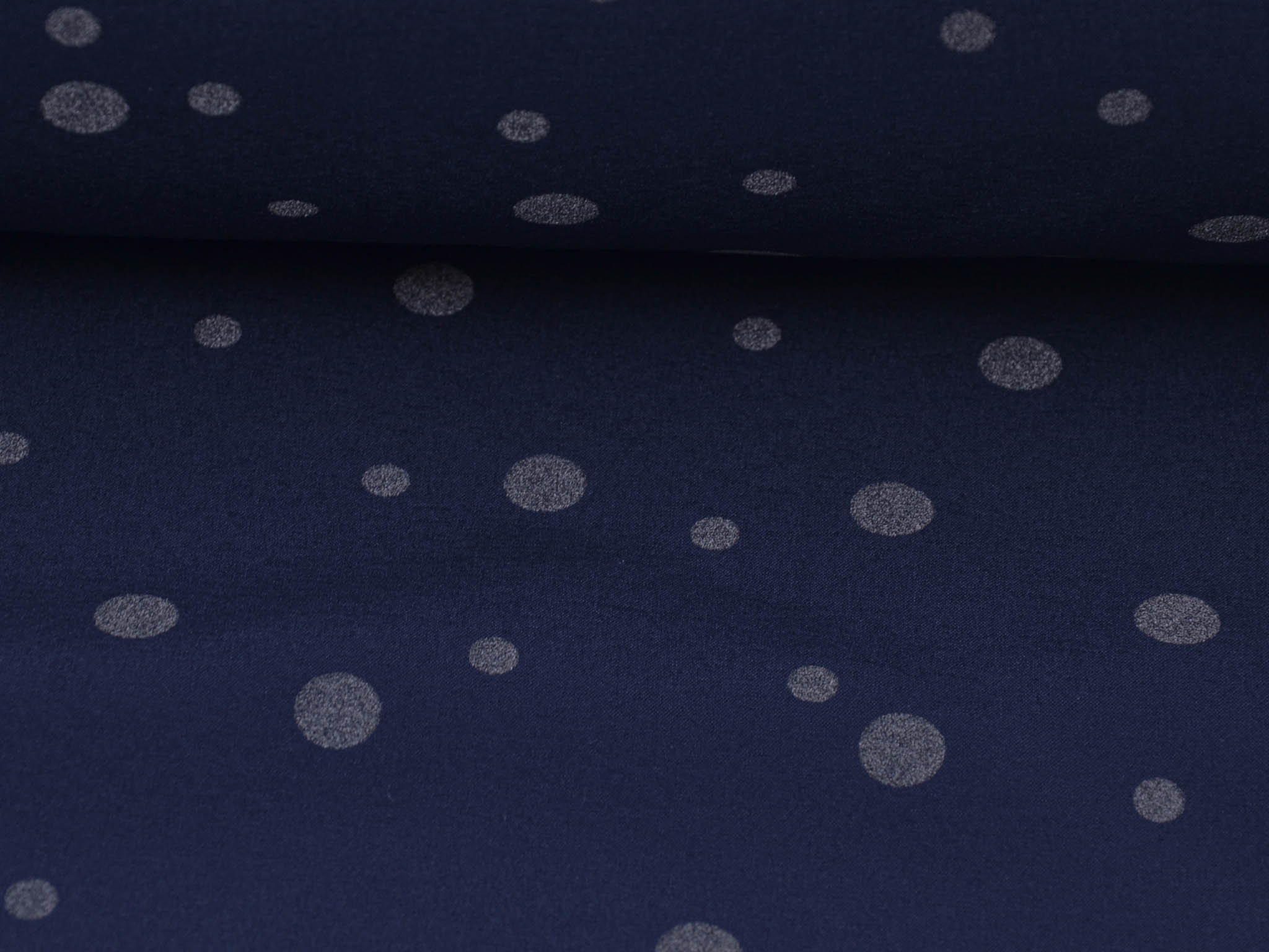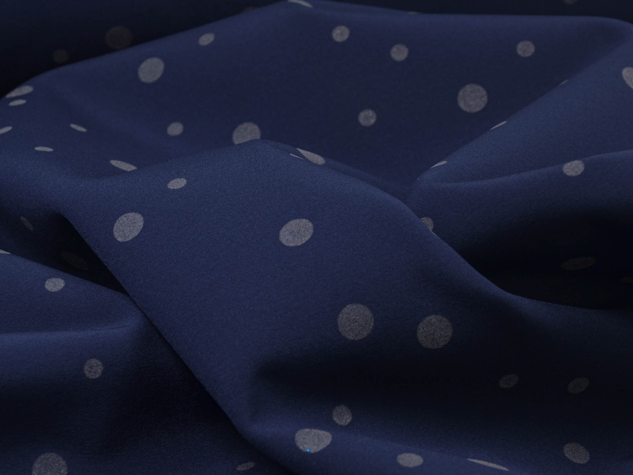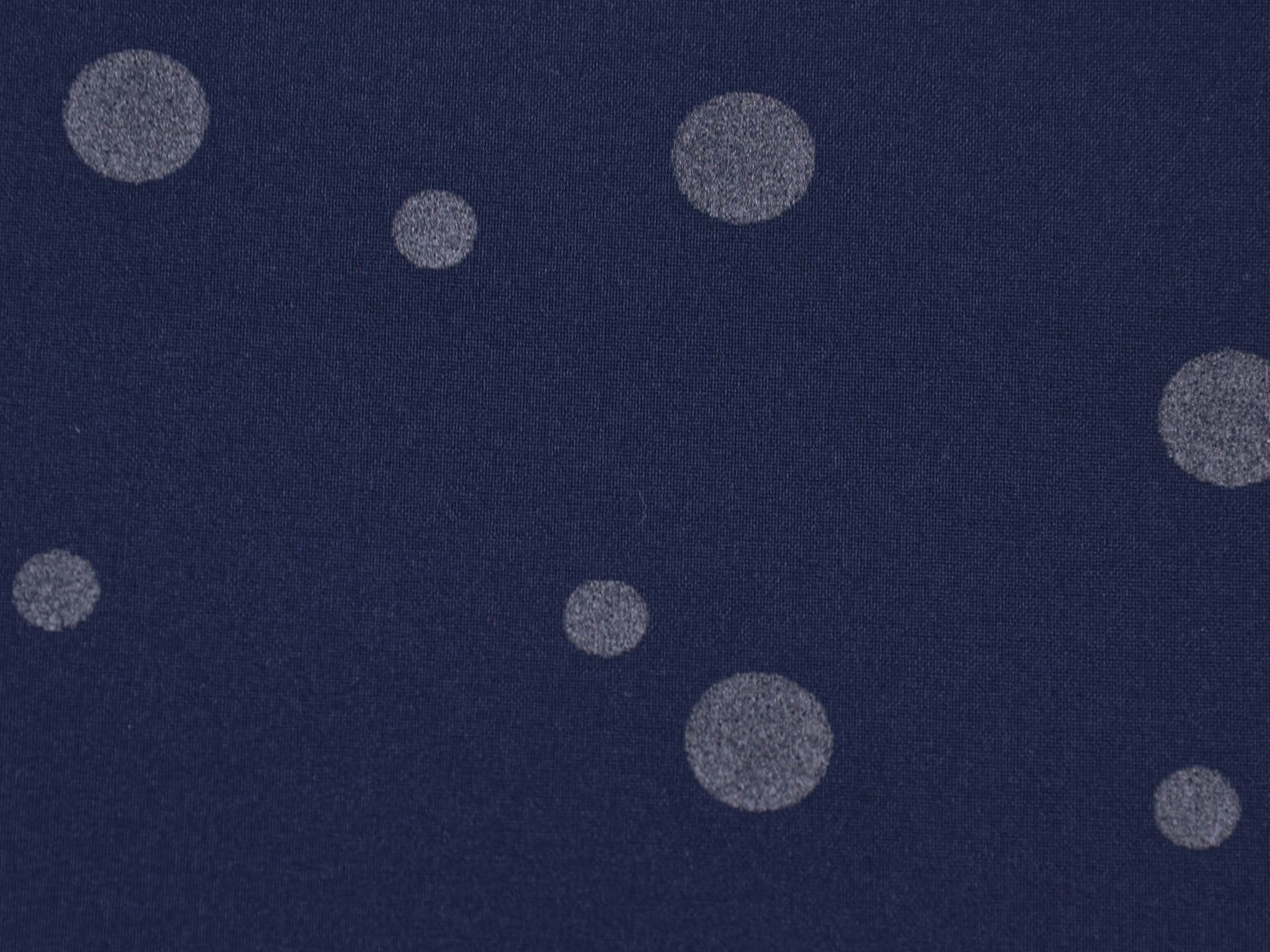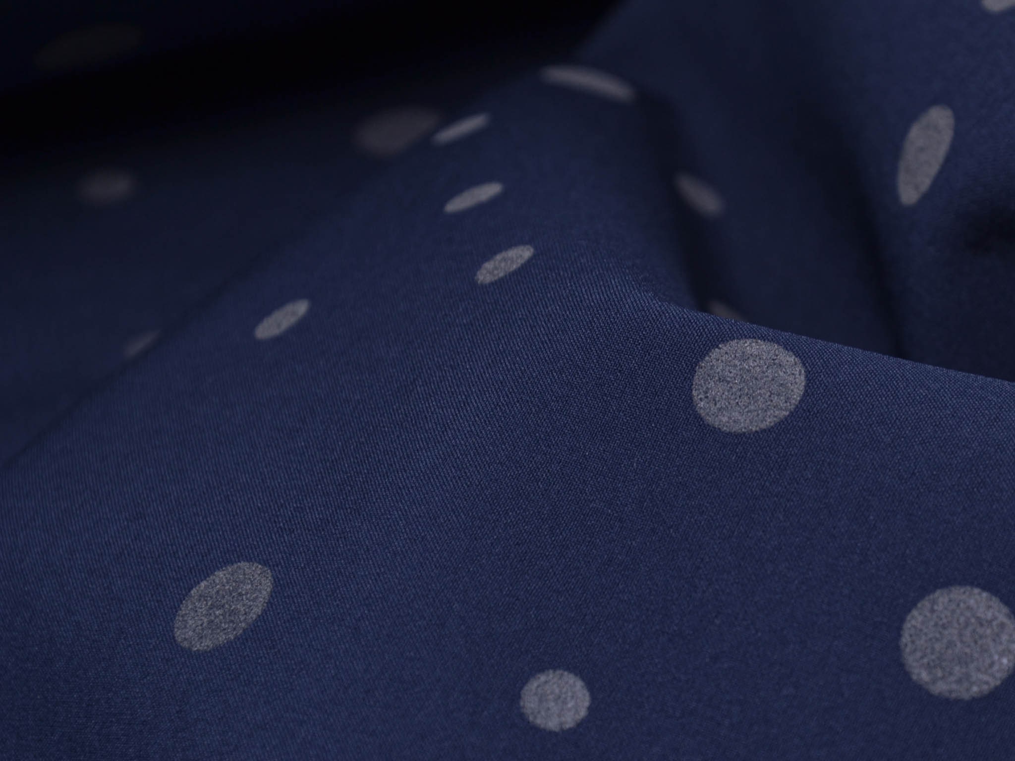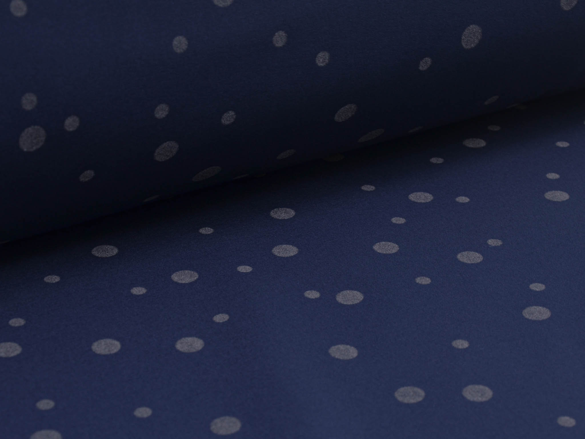 Reflective softshell fabric in dark blue with dots. The softshell fabric is dark blue with silver reflective dots. The reverse side is a dark blue fleece fabric. This softshell fabric is perfect for making mud pants, overalls, jackets, vests, and coats. The reflective dots make you highly visible in the dark. The fabric is water-repellent, making it ideal for outdoor clothing.