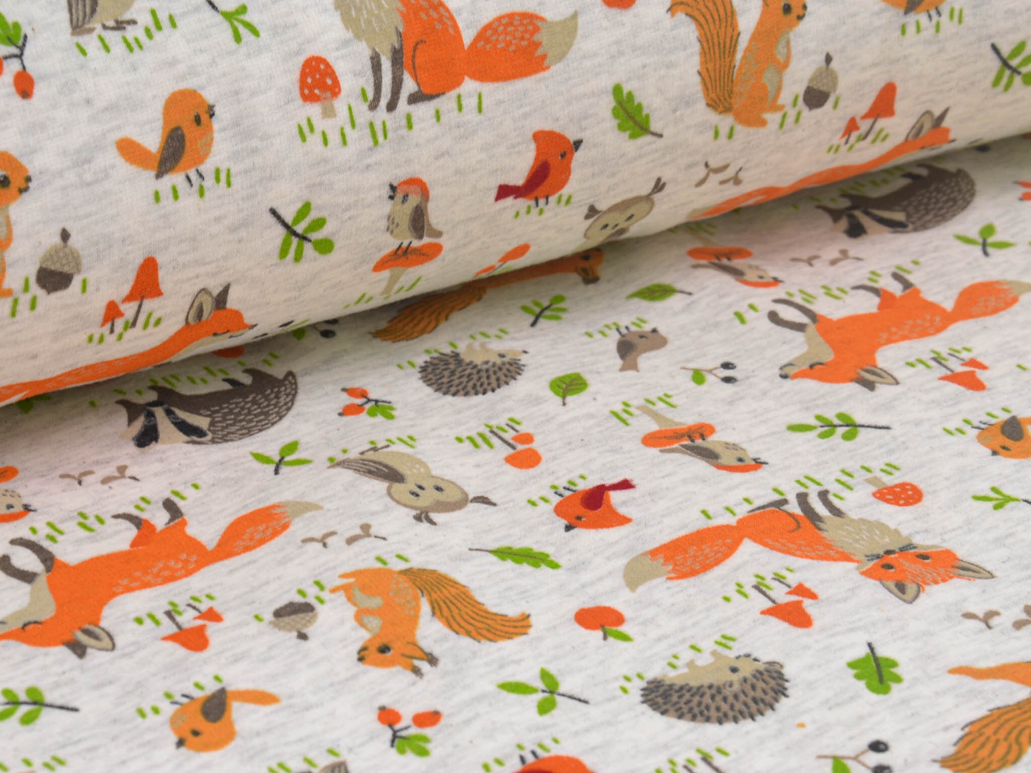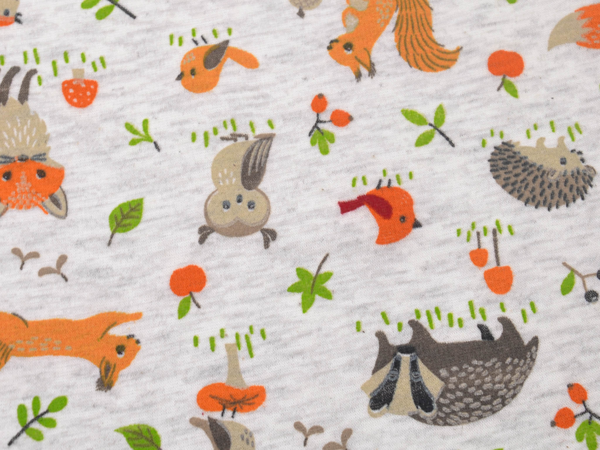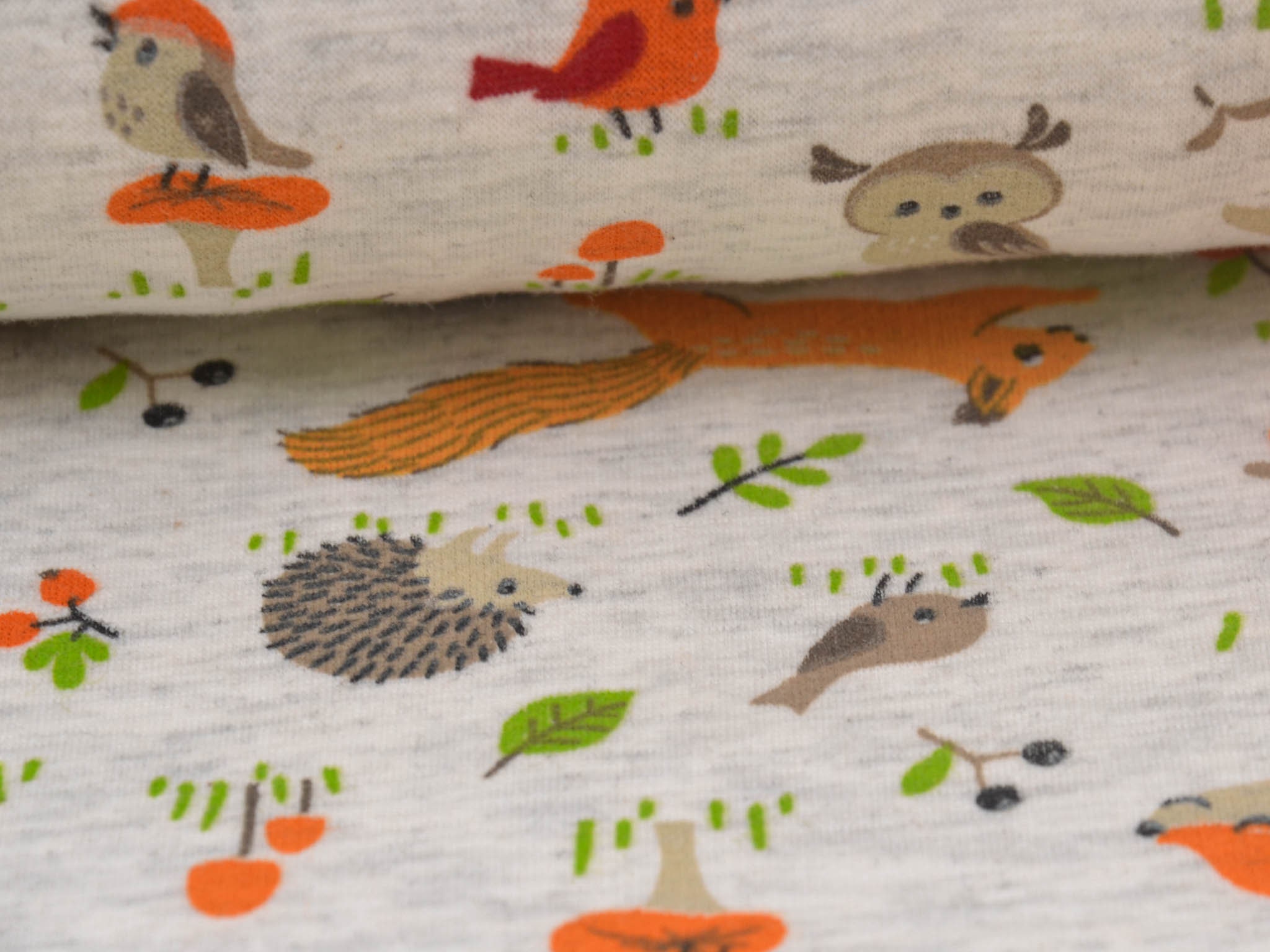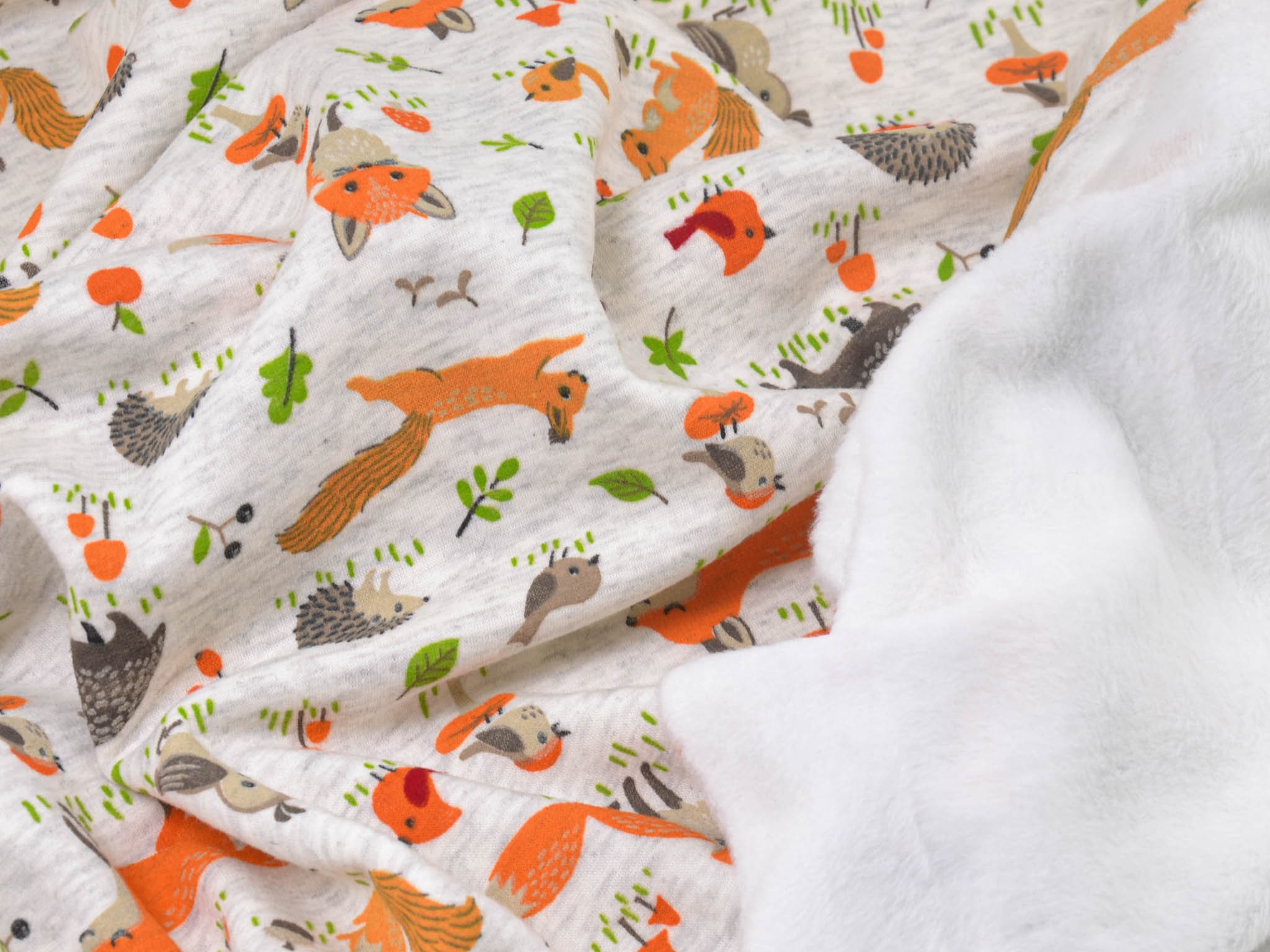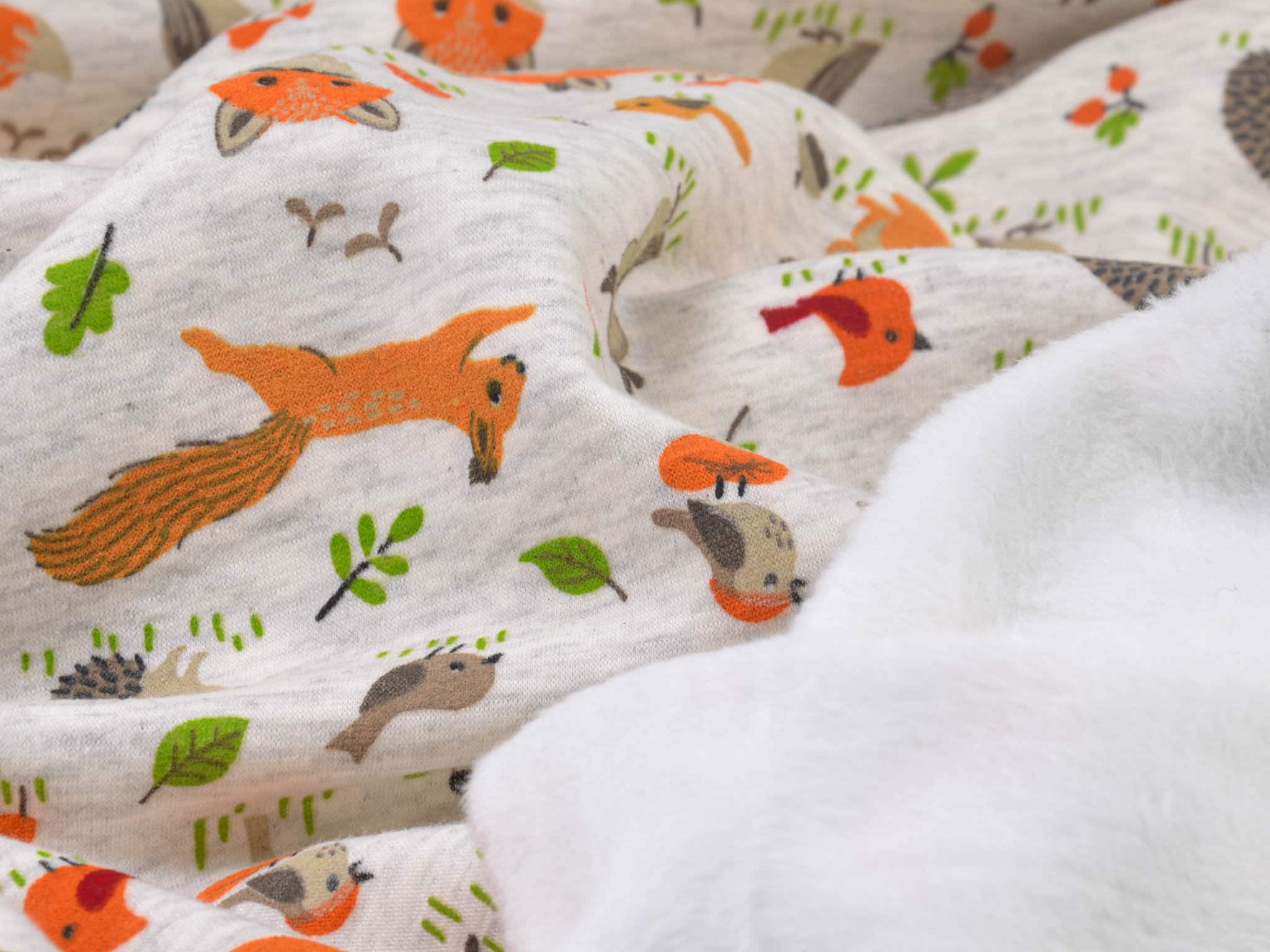 High-quality alpine fleece with woodland animals. The beige sweatshirt fabric features foxes, hedgehogs, owls, birds, and squirrels. The inside is fluffy and soft. You can sew sweatshirts, sweaters, harem pants, and so much more from it.
