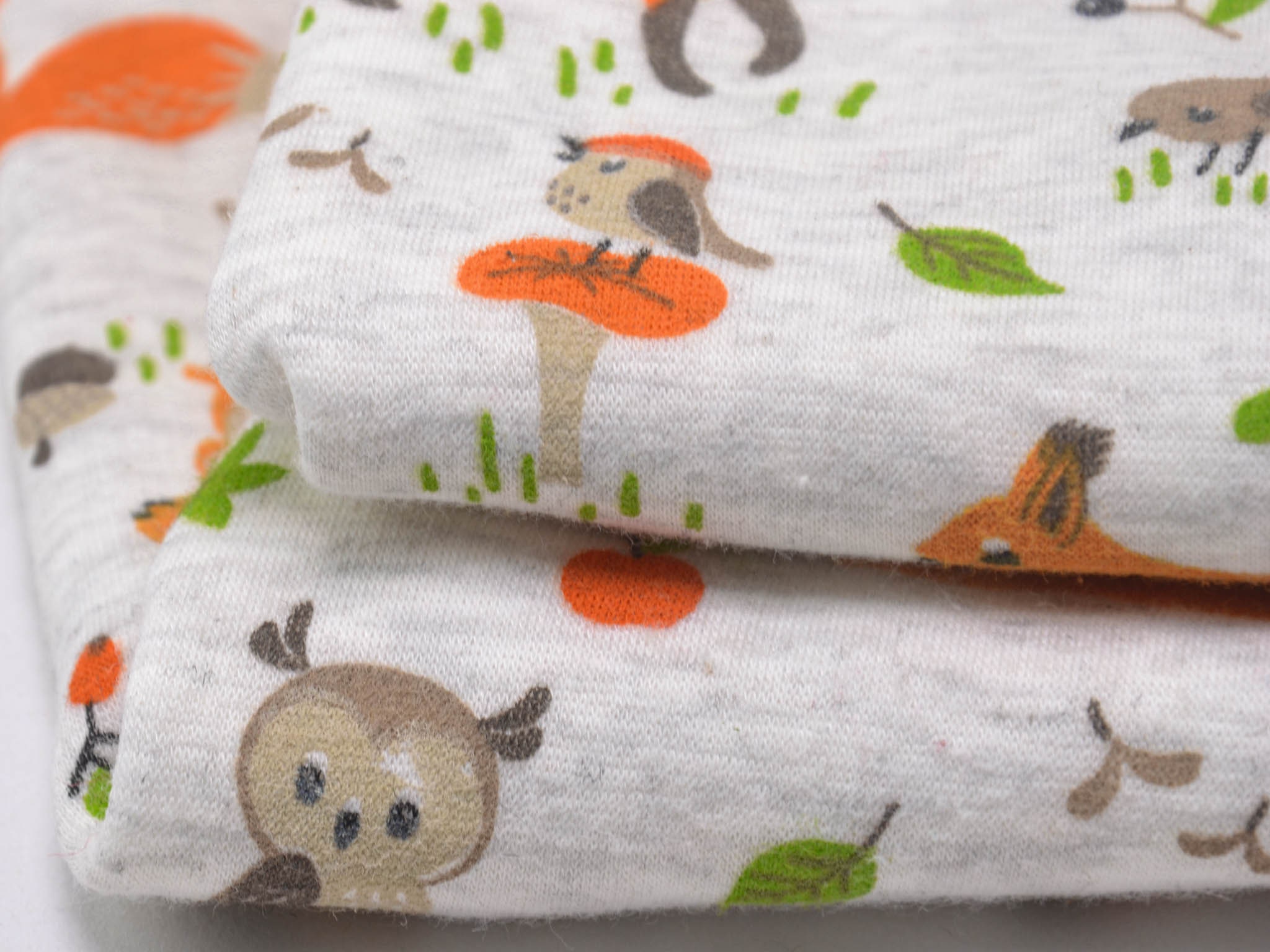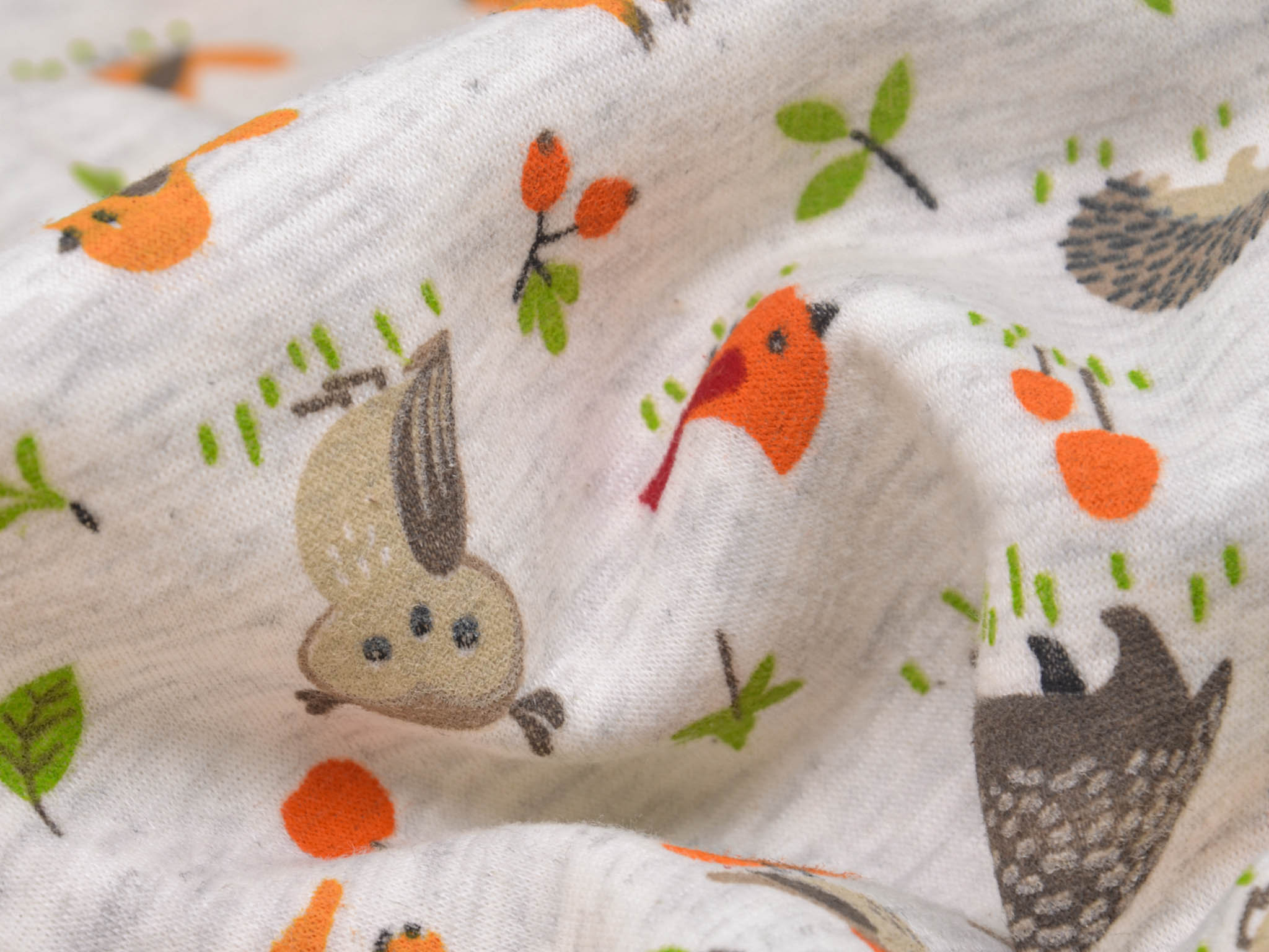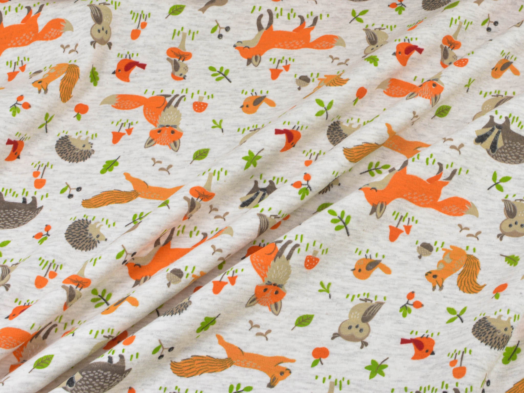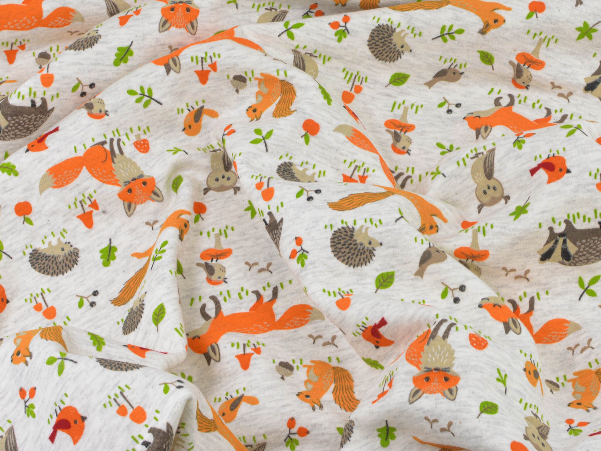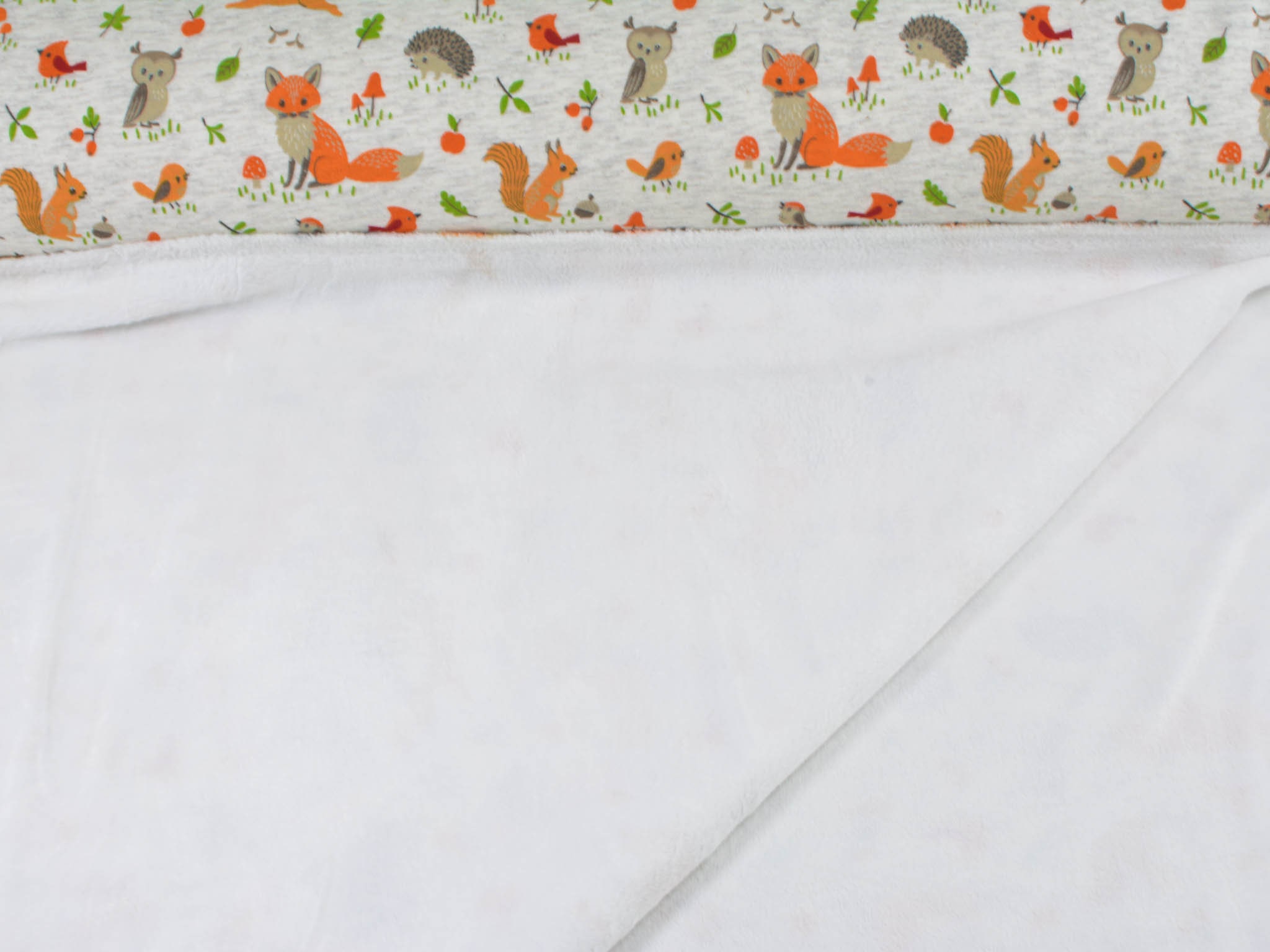 High-quality alpine fleece with woodland animals. The beige sweatshirt fabric features foxes, hedgehogs, owls, birds, and squirrels. The inside is fluffy and soft. You can sew sweatshirts, sweaters, harem pants, and so much more from it.