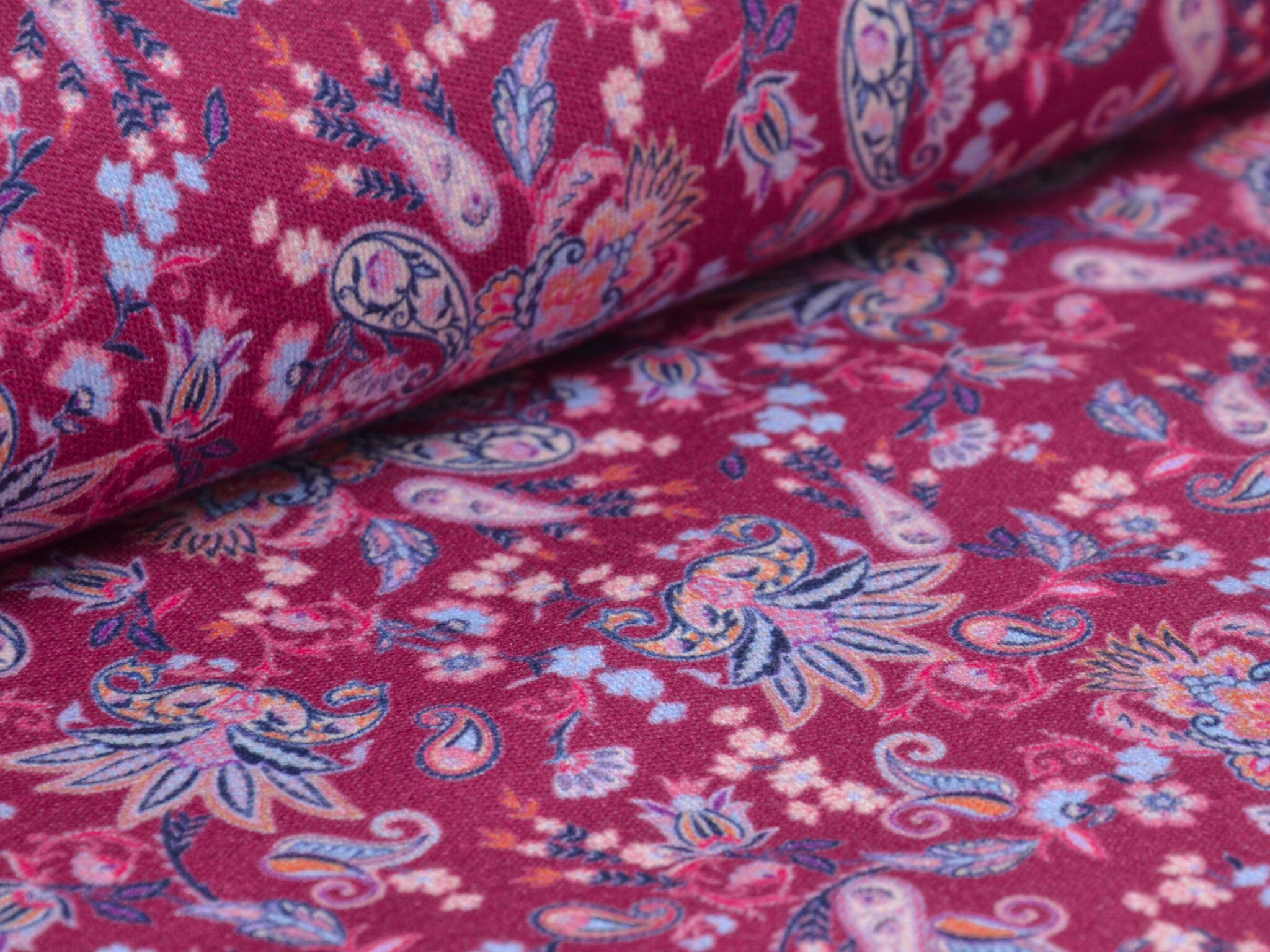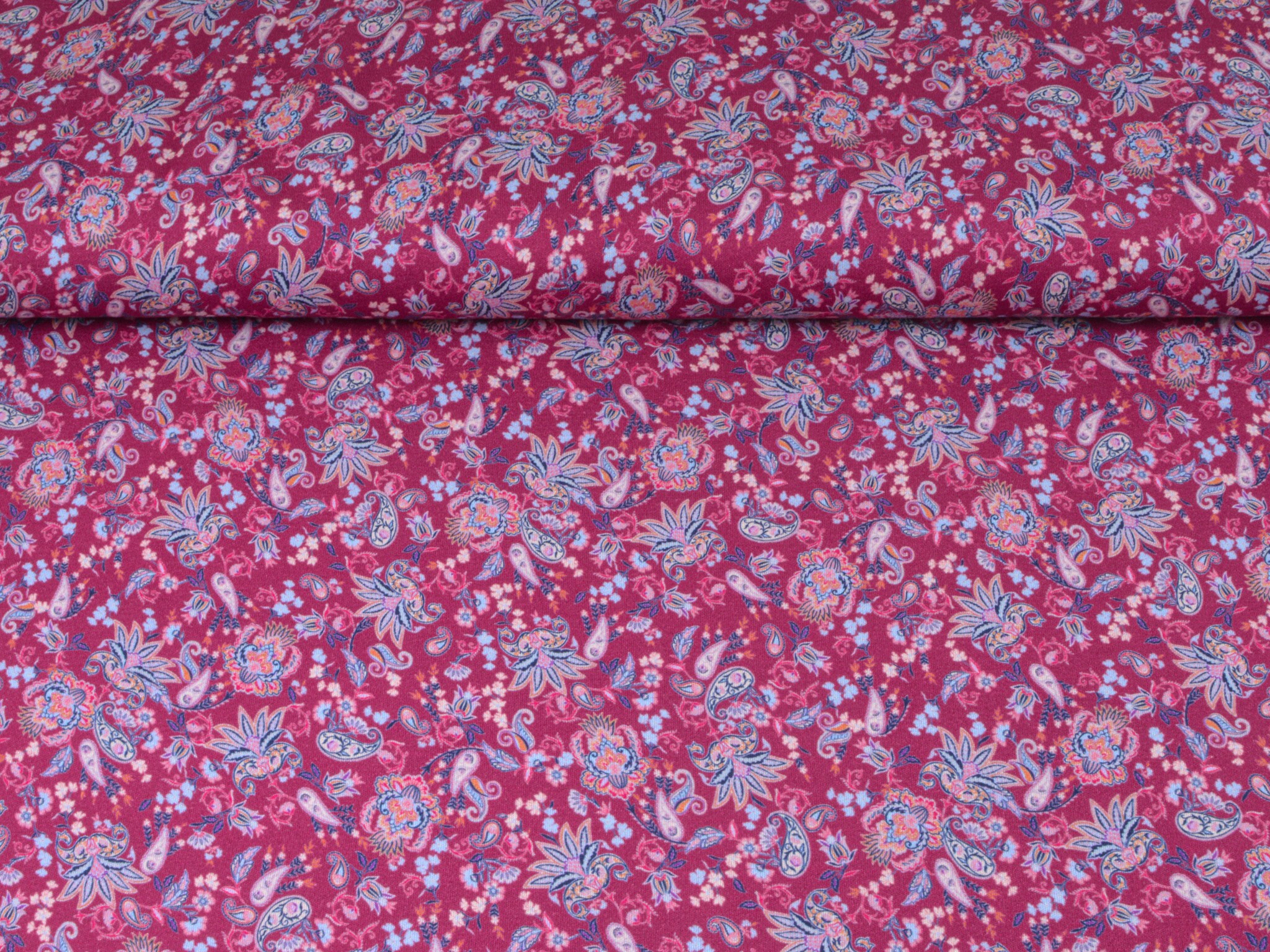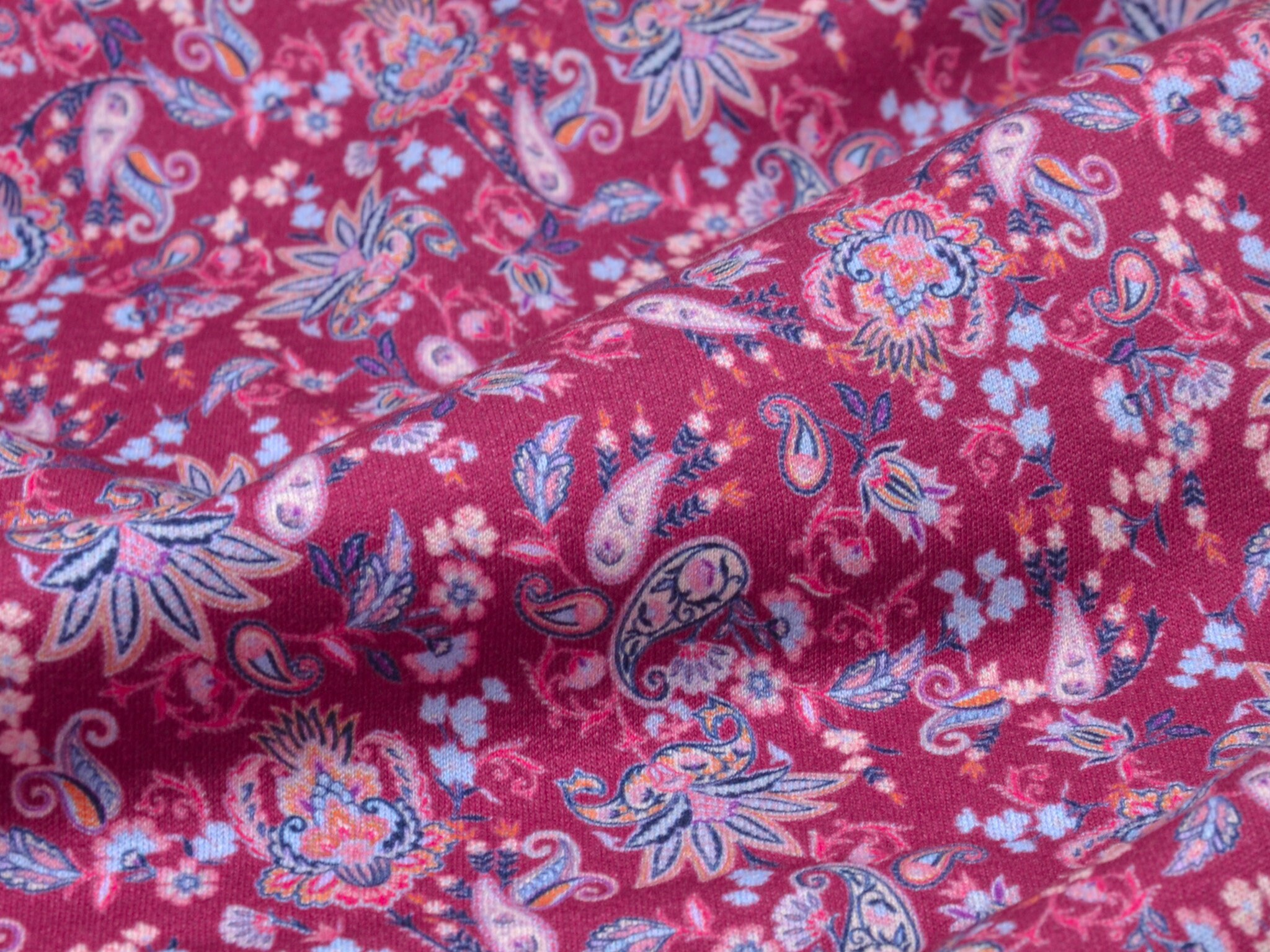 Hochwertiger Interlock-Jersey aus dem Hause Westfalenstoffe. Der Jersey zeigt Blumen und ein Paisley-Muster. Du kannst aus dem Stoff wunderschöne T-Shirts, Pumphosen, Kleider und so vieles mehr nähen.