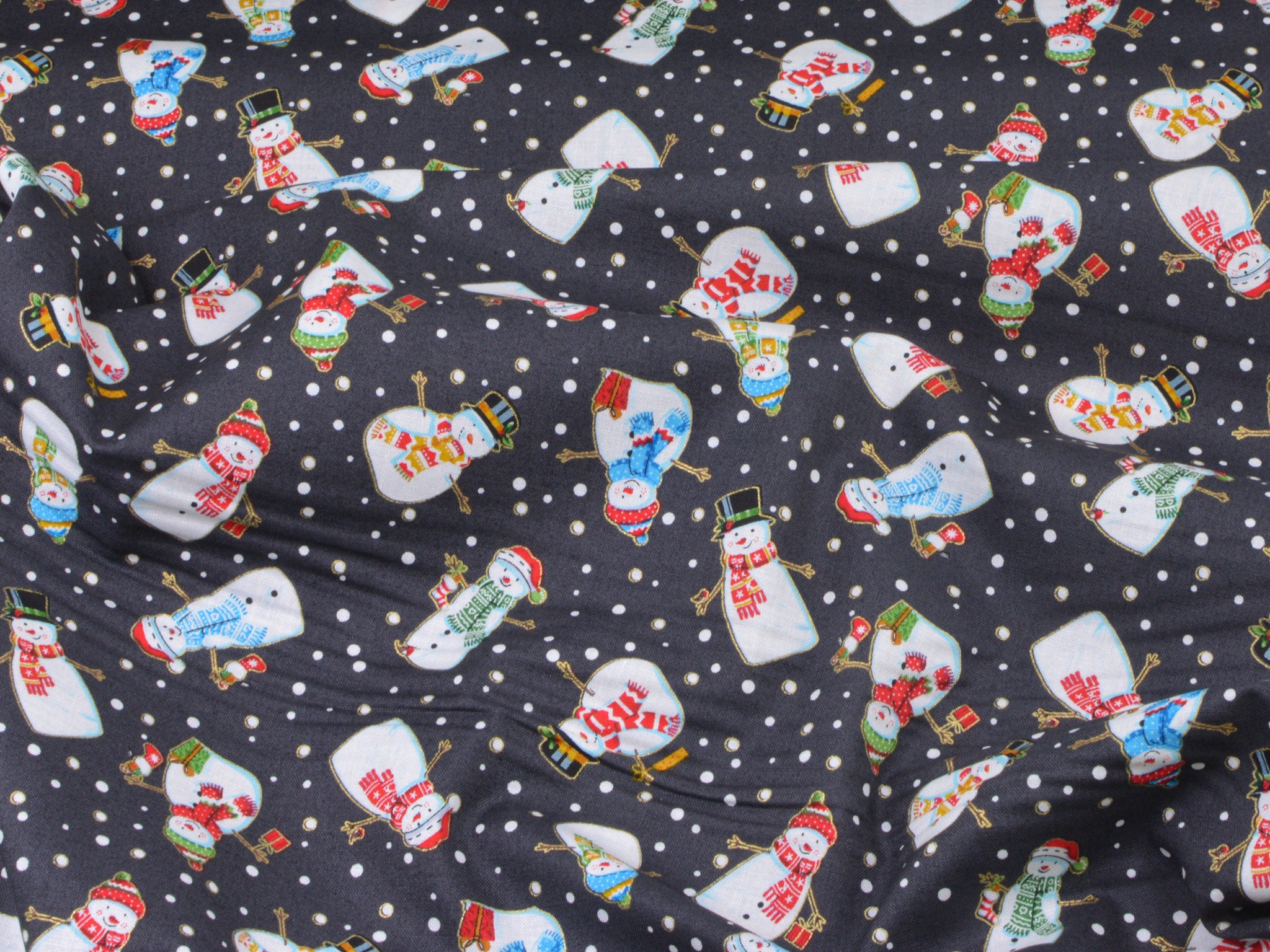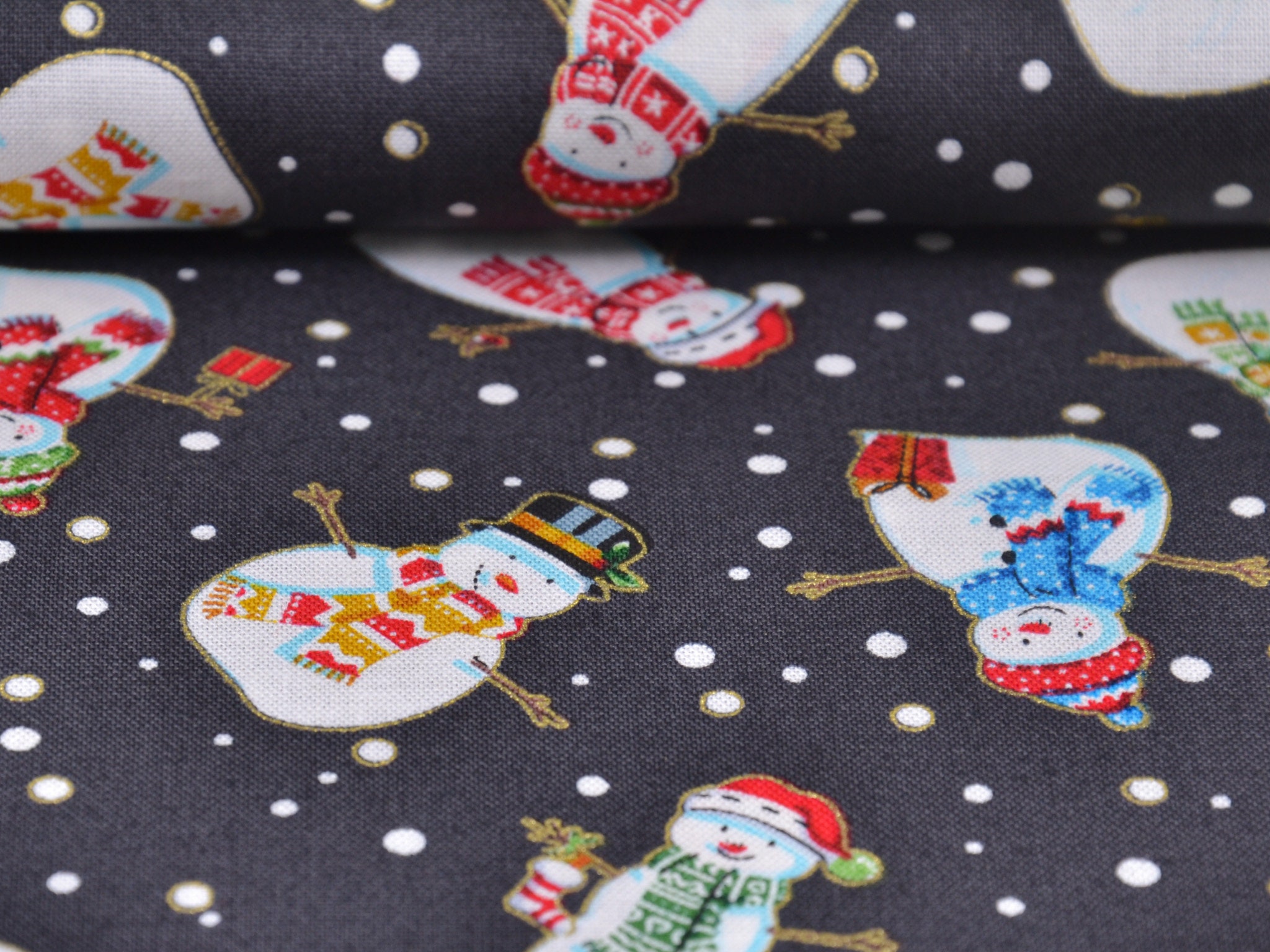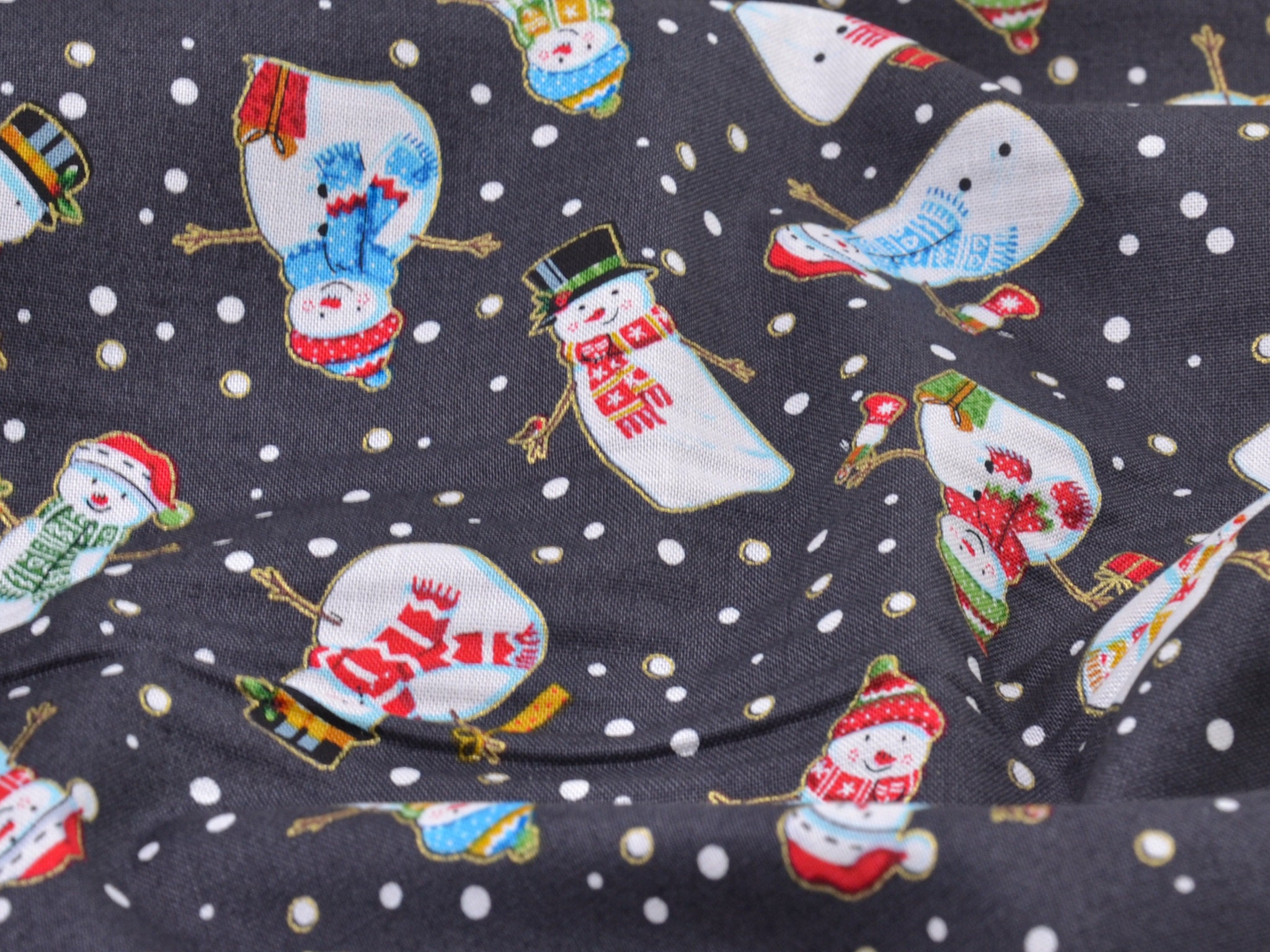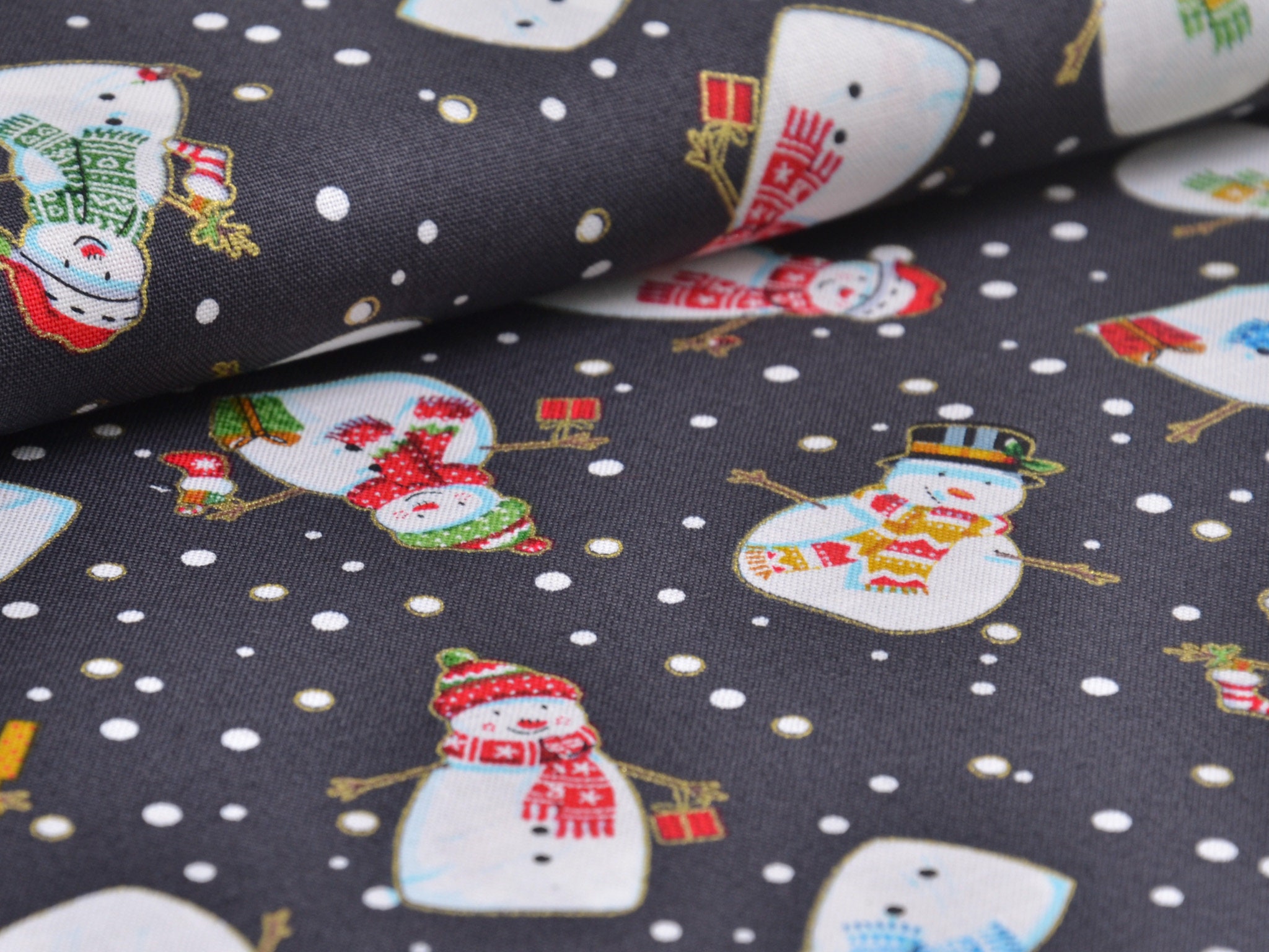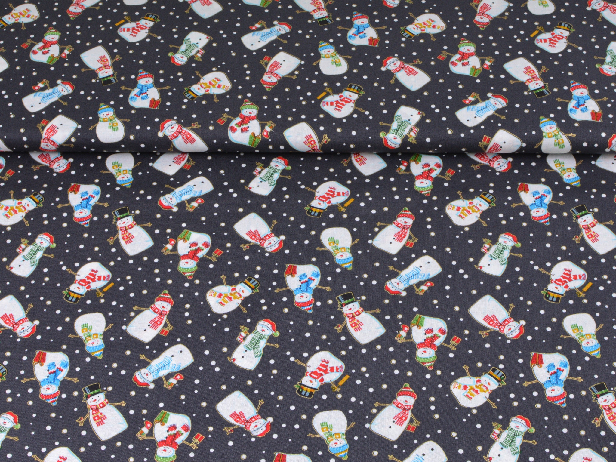 Cotton fabric dark grey with snowmen, snowflakes - 110 cm wide - smooth fabric, Christmas