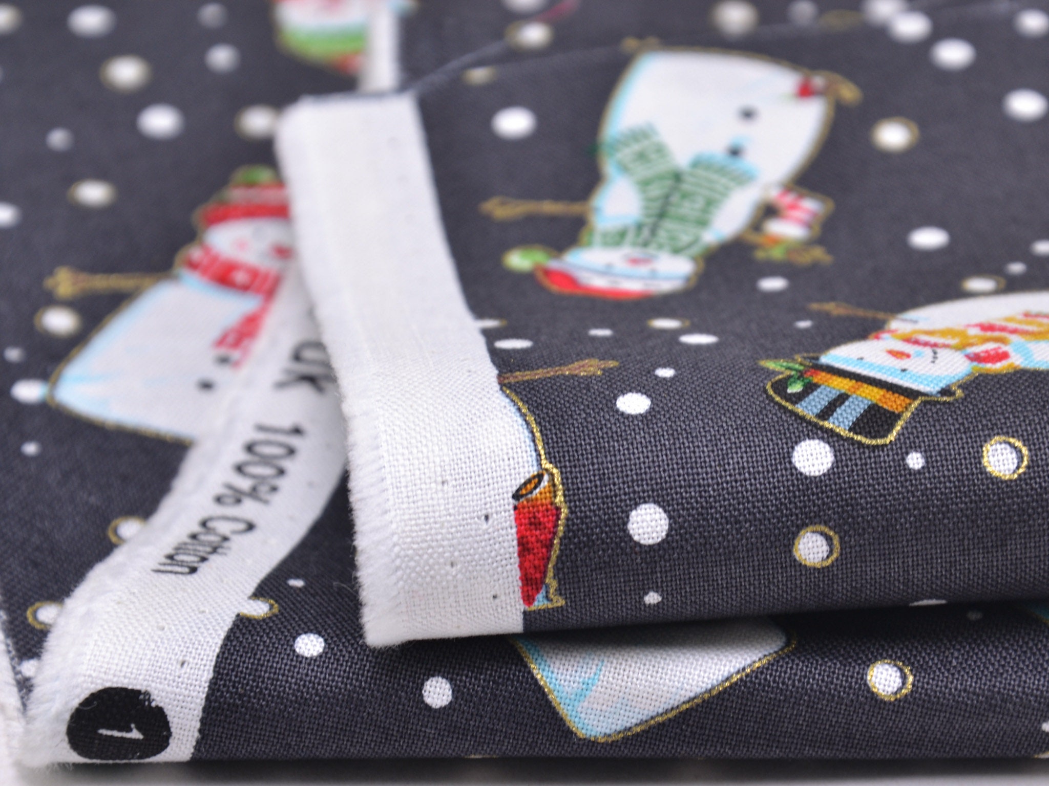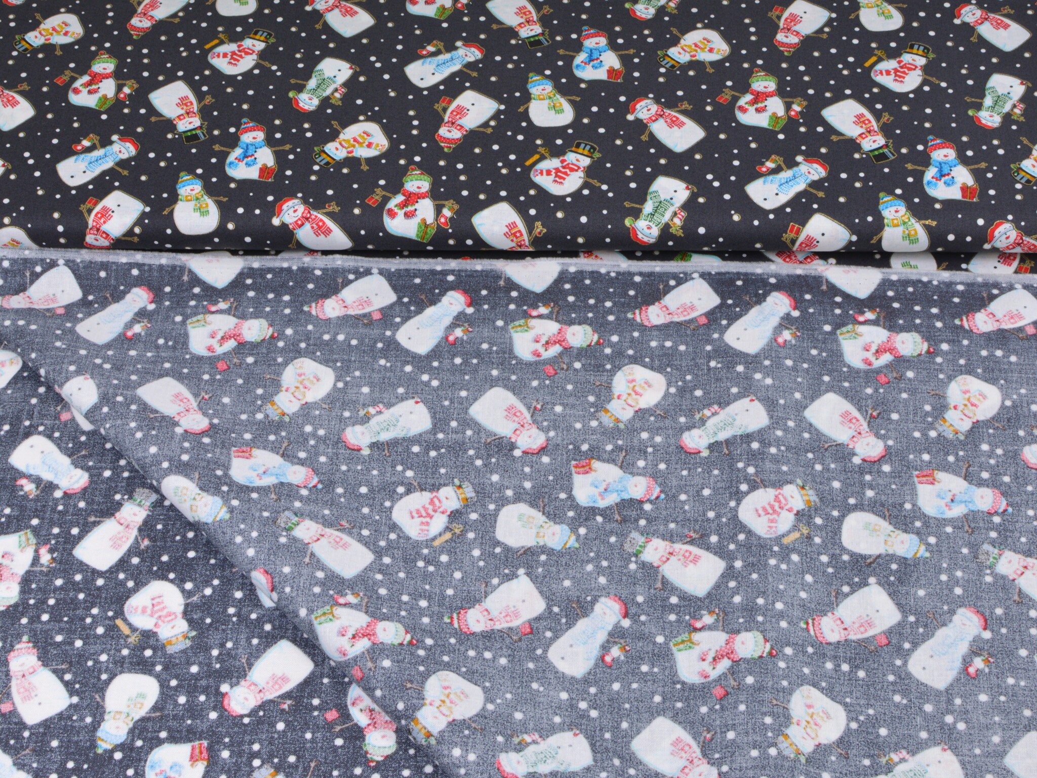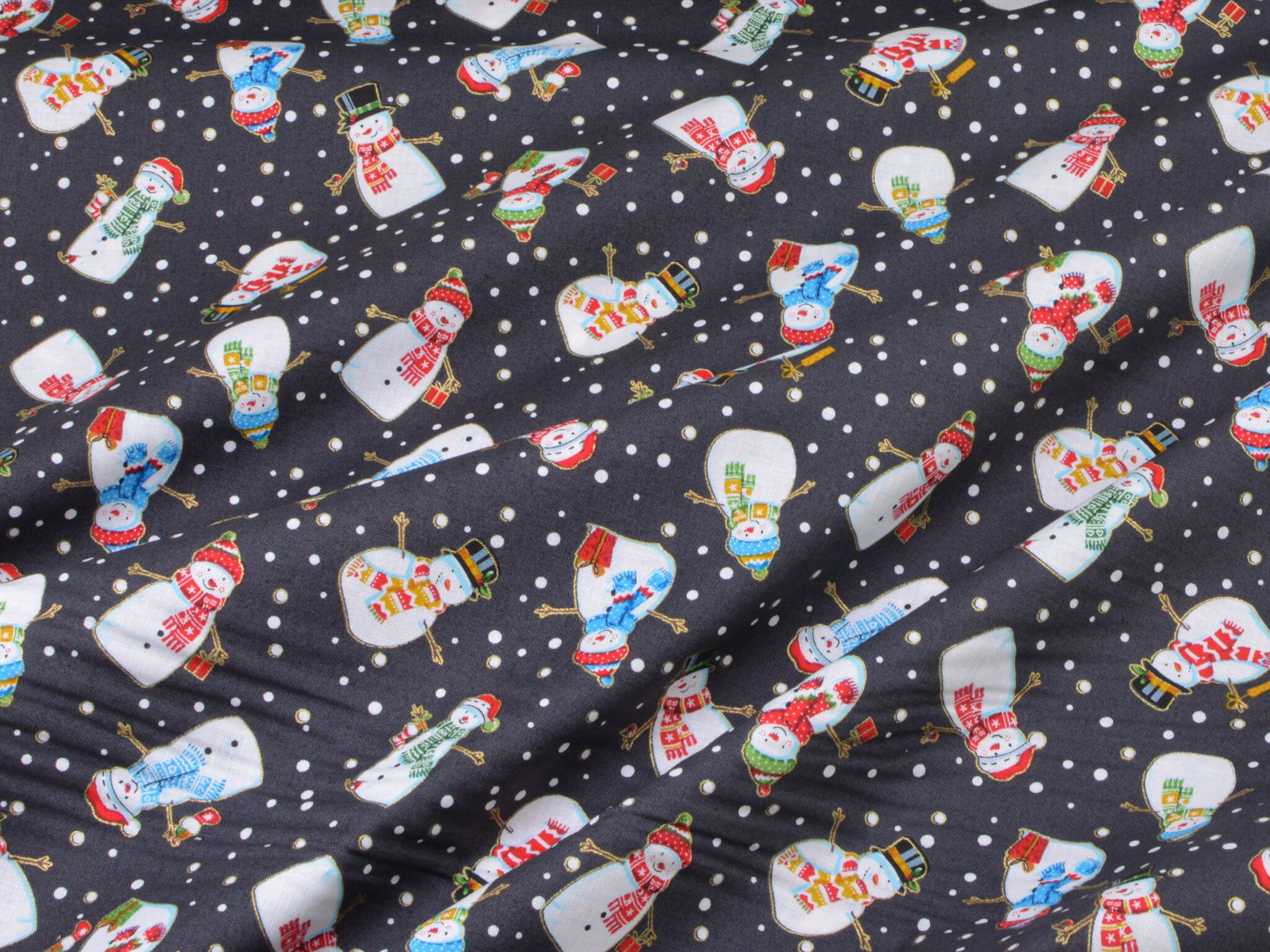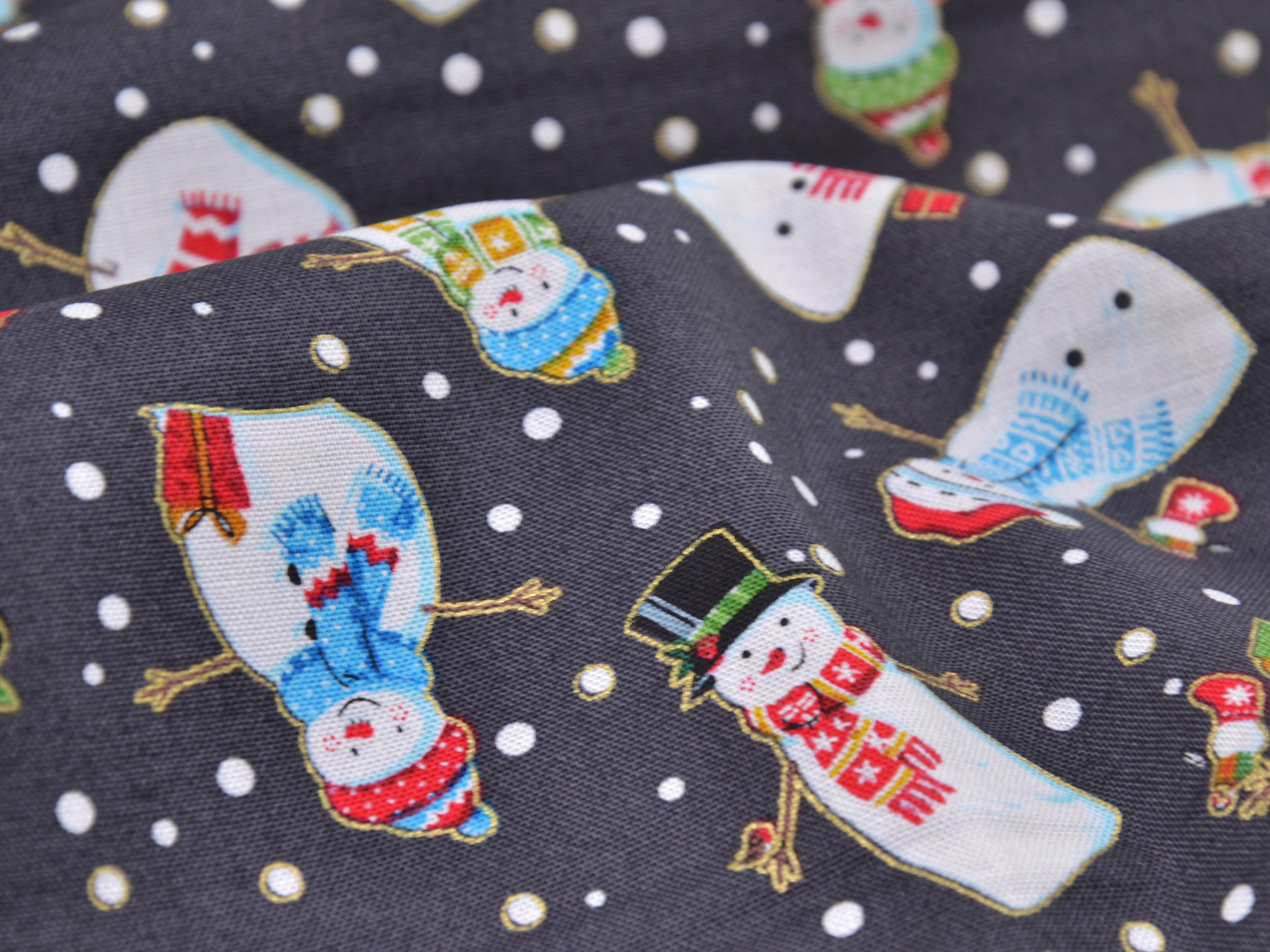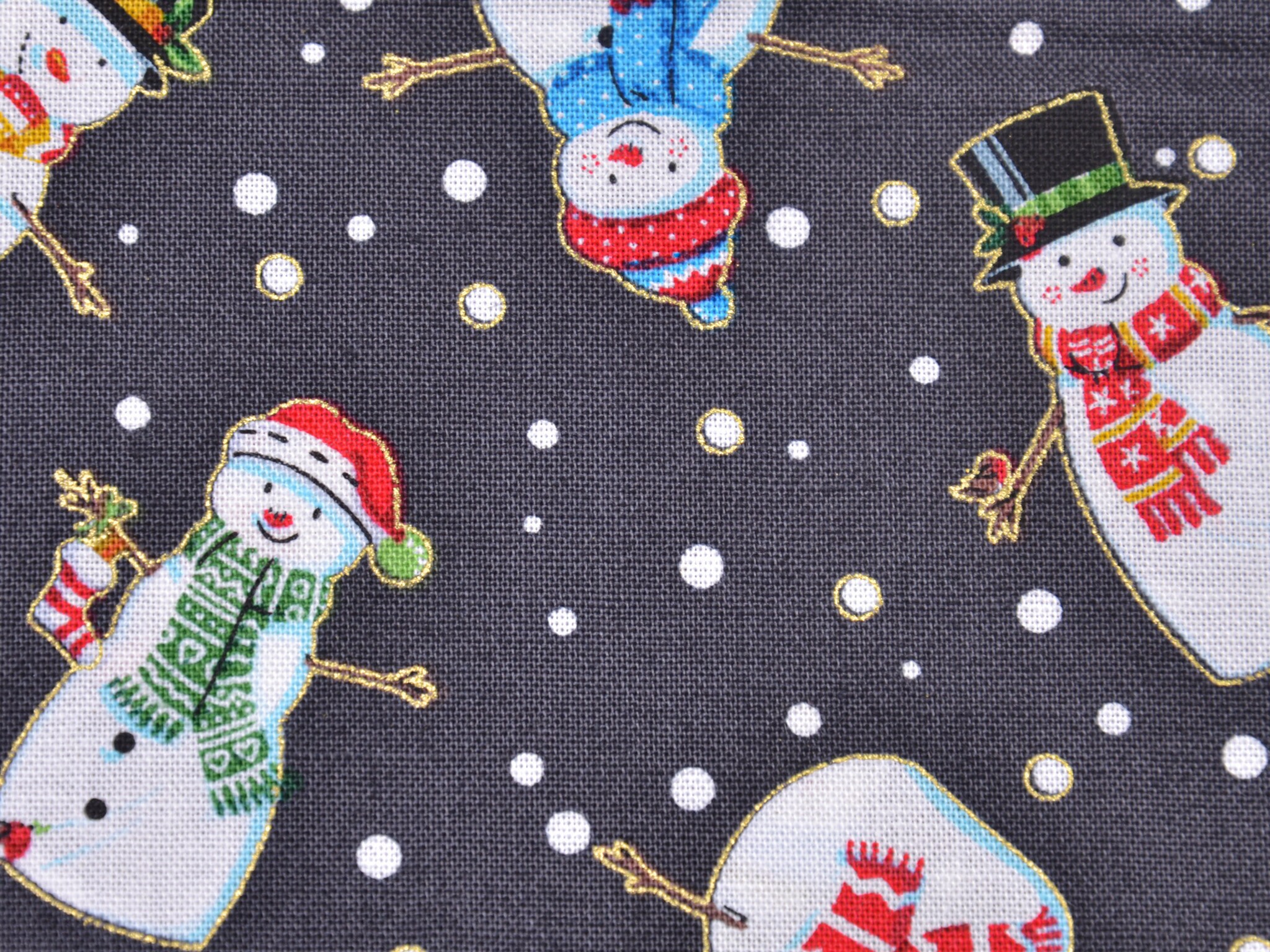 High-quality cotton fabric from Makower UK. This dark gray cotton patchwork fabric features white snowmen. It's perfect for sewing pillows, utensil holders, bag lining, and much more.