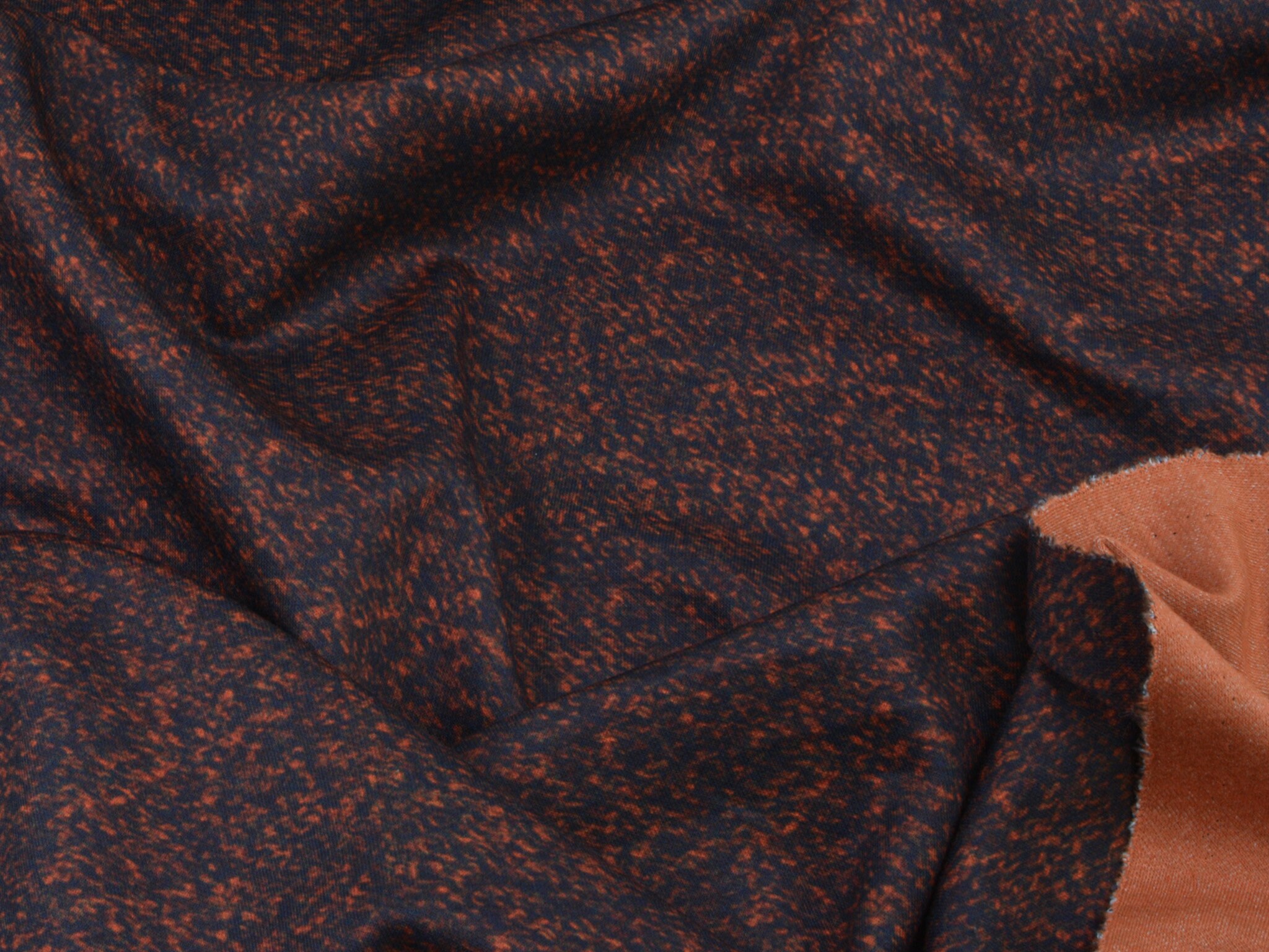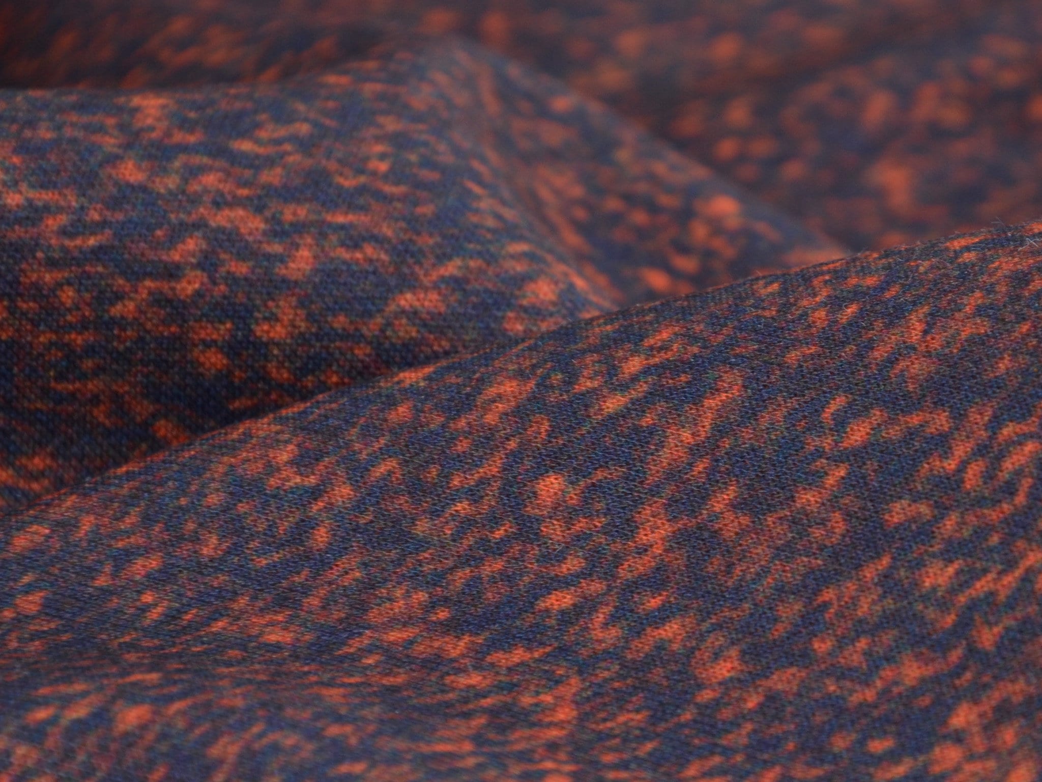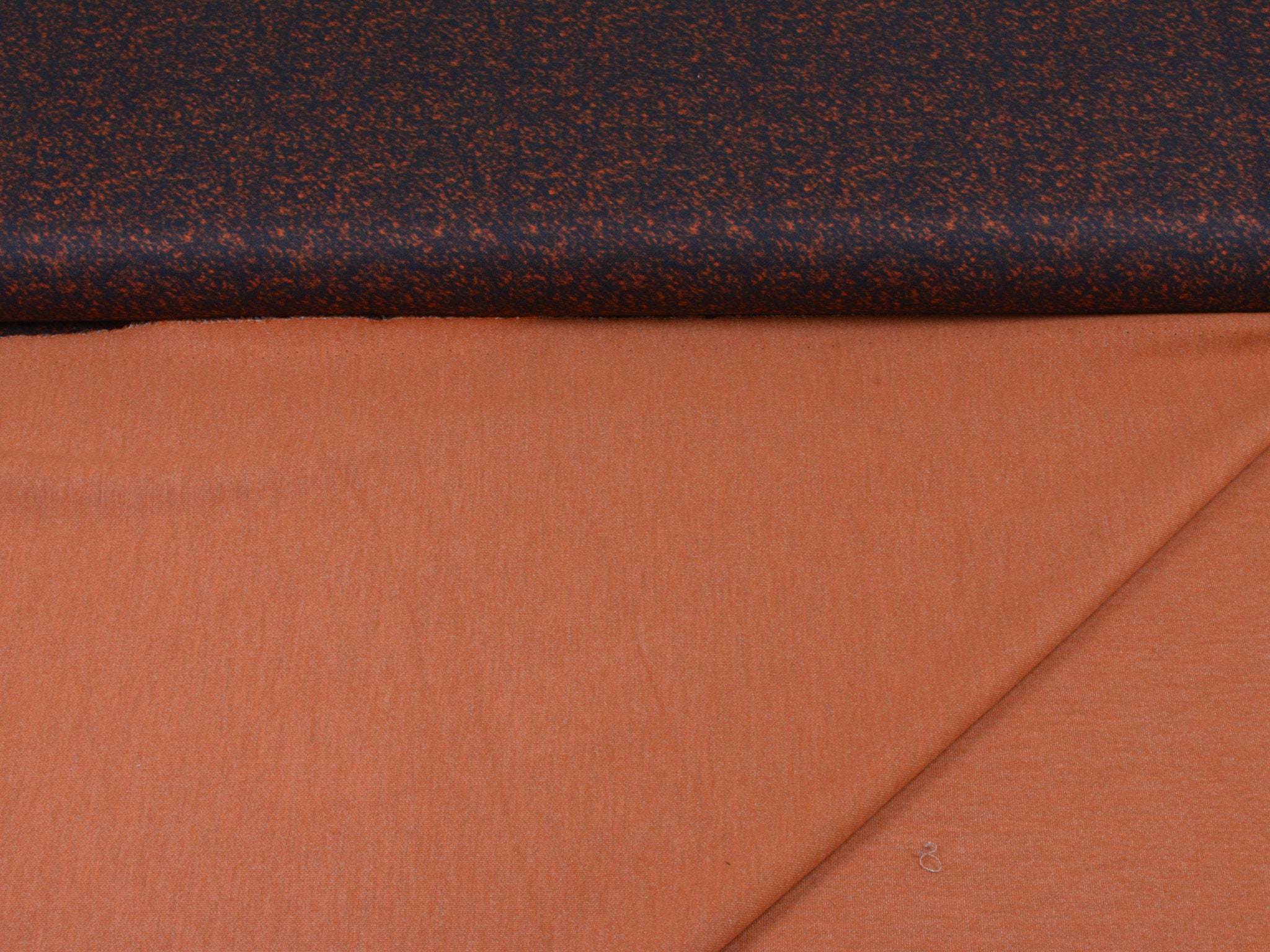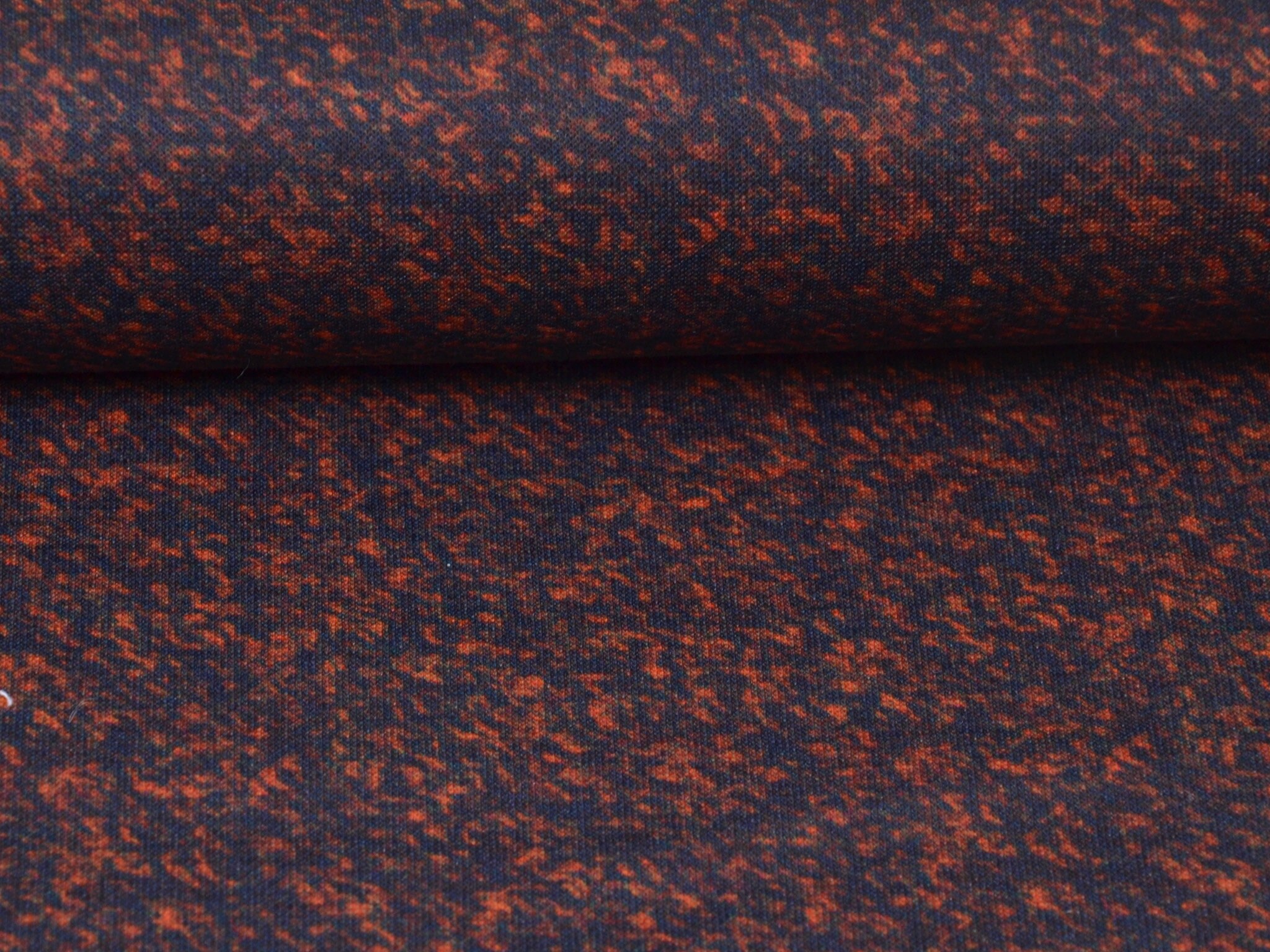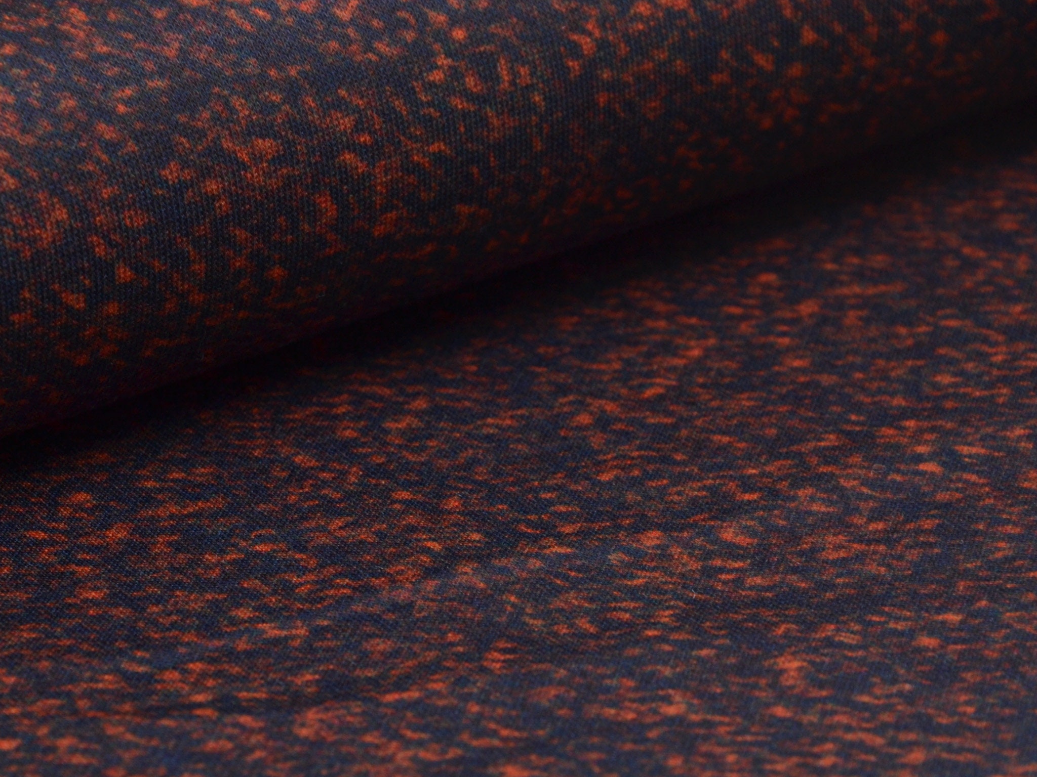 Jersey aus Viskose in orange und dunkelblau. Der Stoff kann von beiden Seiten verwendet werden. Die eine Seite ist orange meliert, die andere Stoffseite ist blau und orange gefleckt. Du kannst den Stoff zum Nähen von Kleidern, T-Shirts, Röcken, Langarmshirts und so vielem mehr verwenden