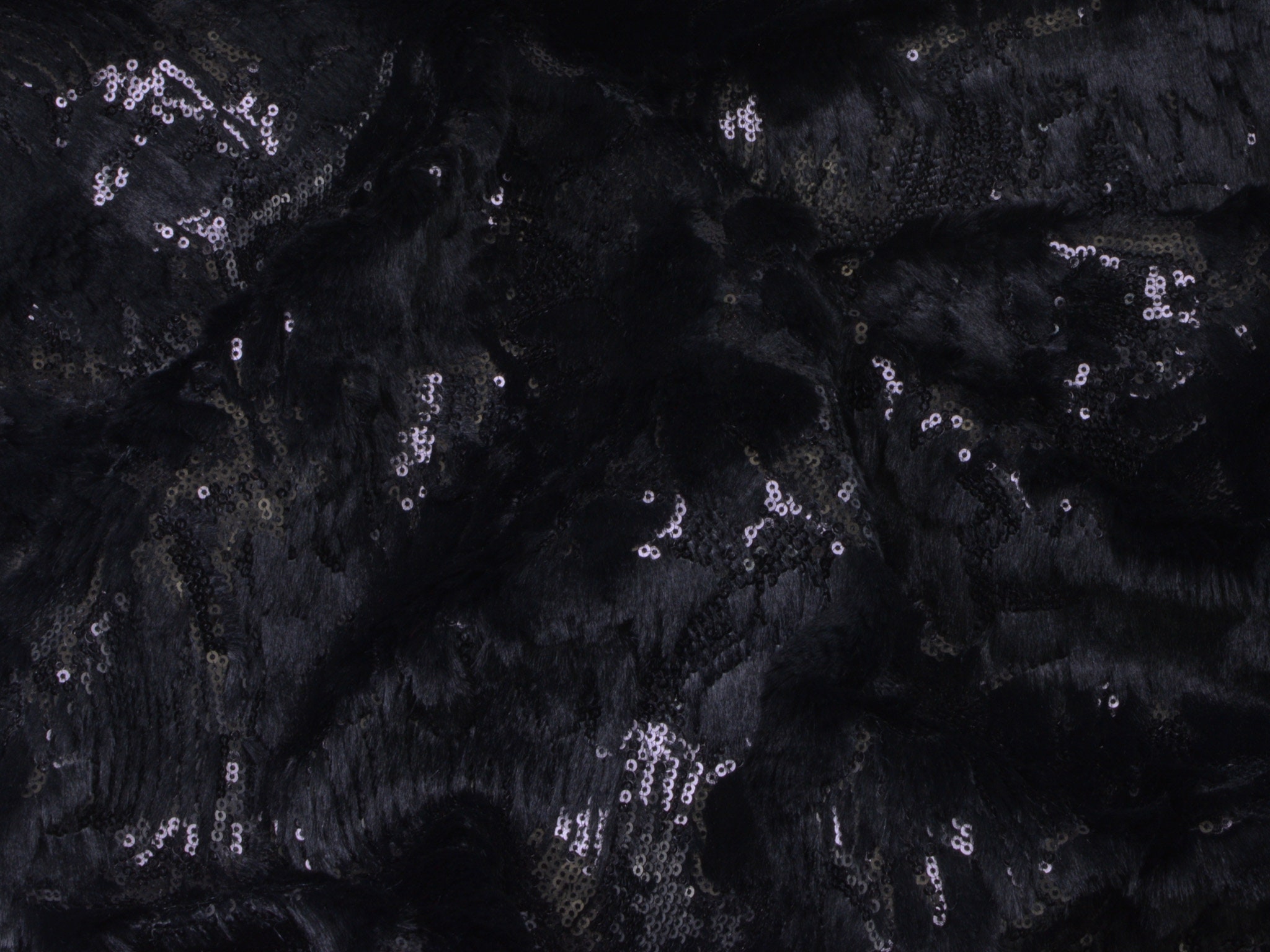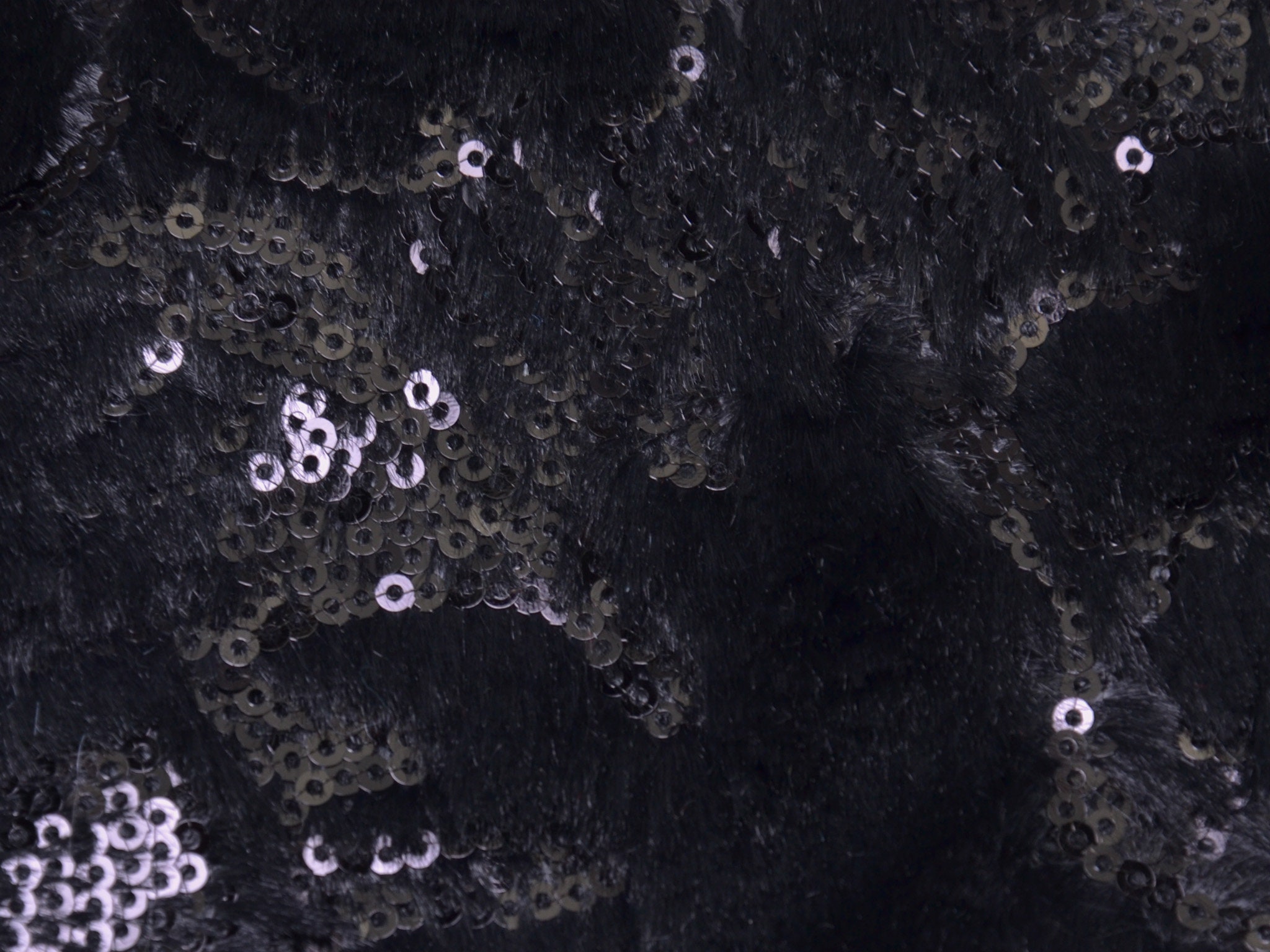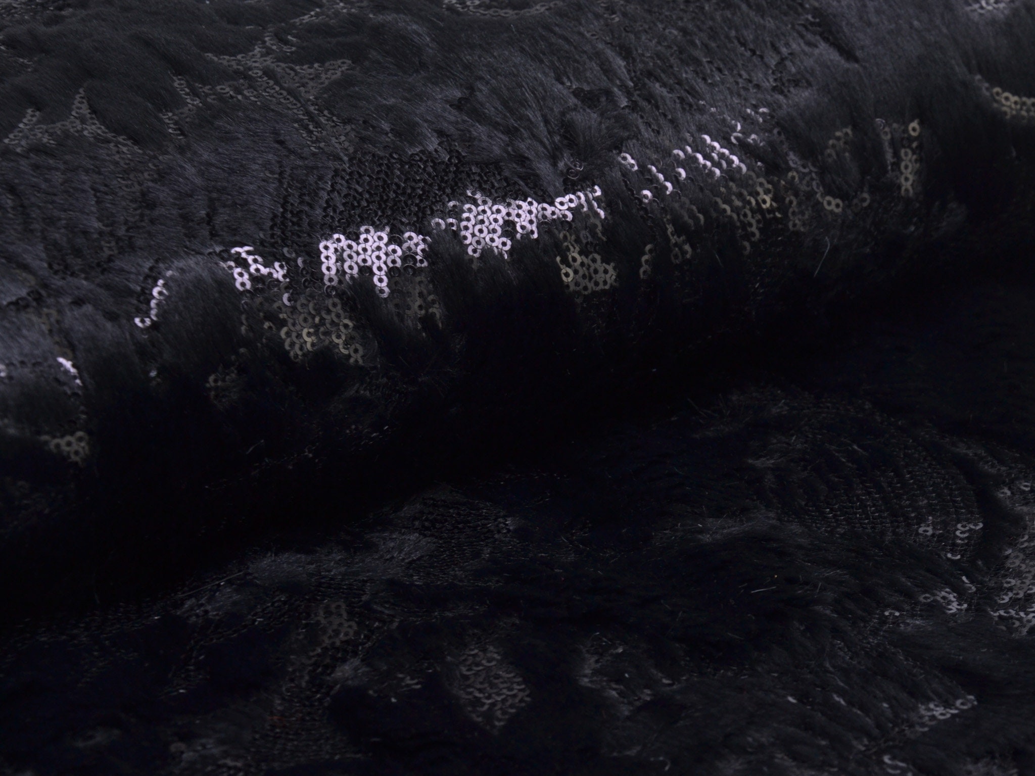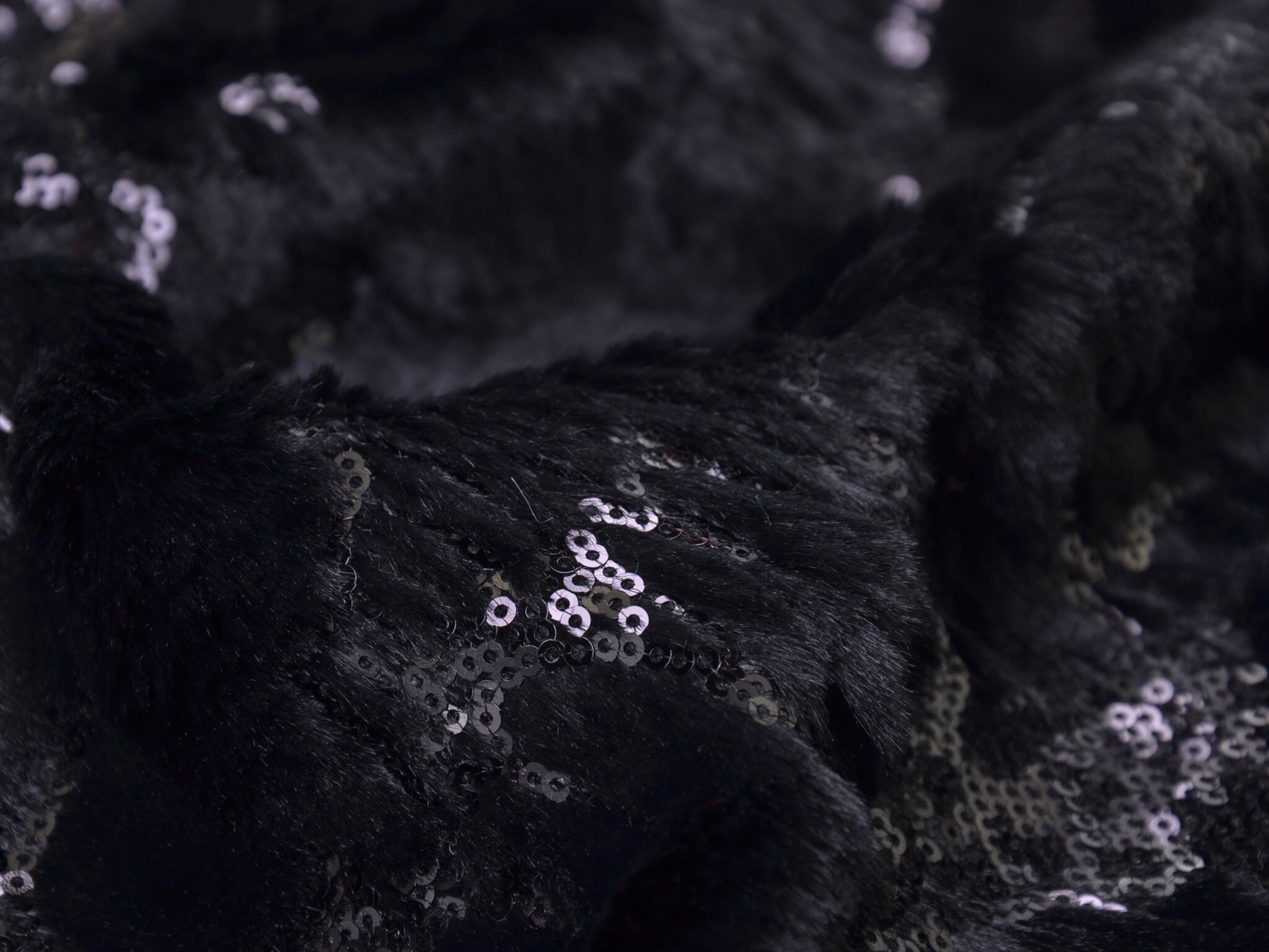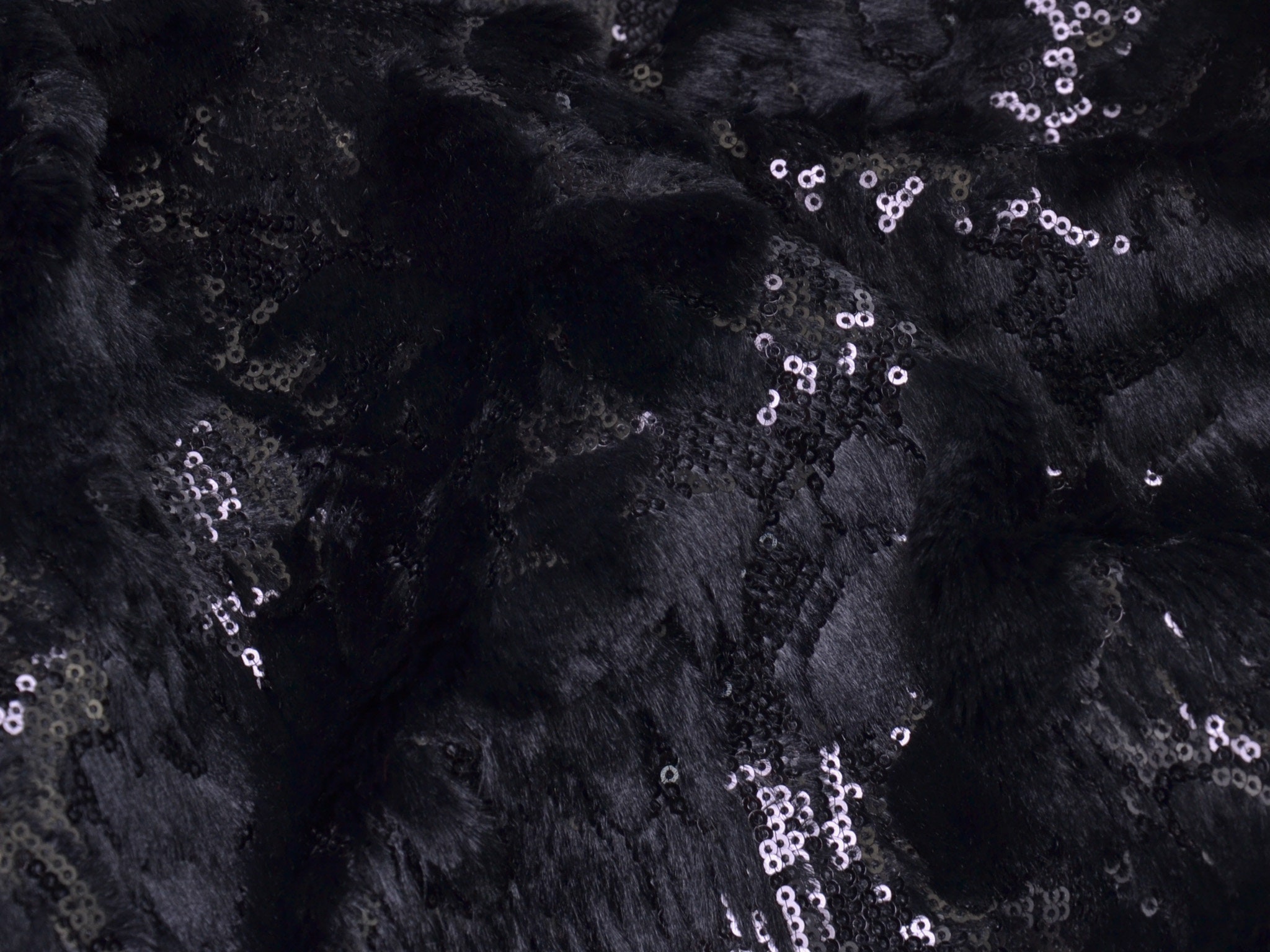 Sehr exklusiver Designerstoff in schwarz. Das super weiche Fellimitat ist mit schwarzen Pailletten bestickt. Die Pailletten funkeln wunderschön im Licht. Nähe dir aus dem Designerstoff einzigartige Jacken, Mäntel und Westen. Wir empfehlen dir den Stoff zu Füttern.