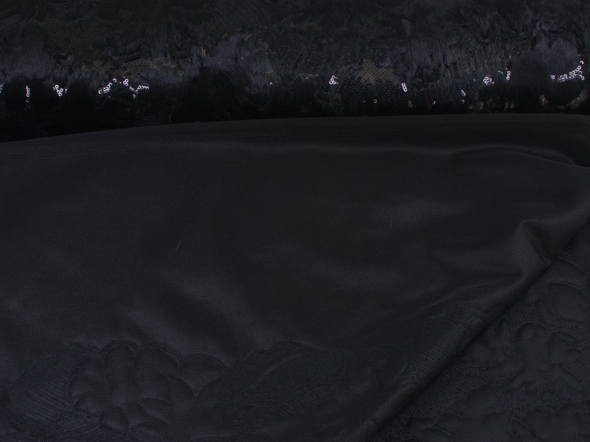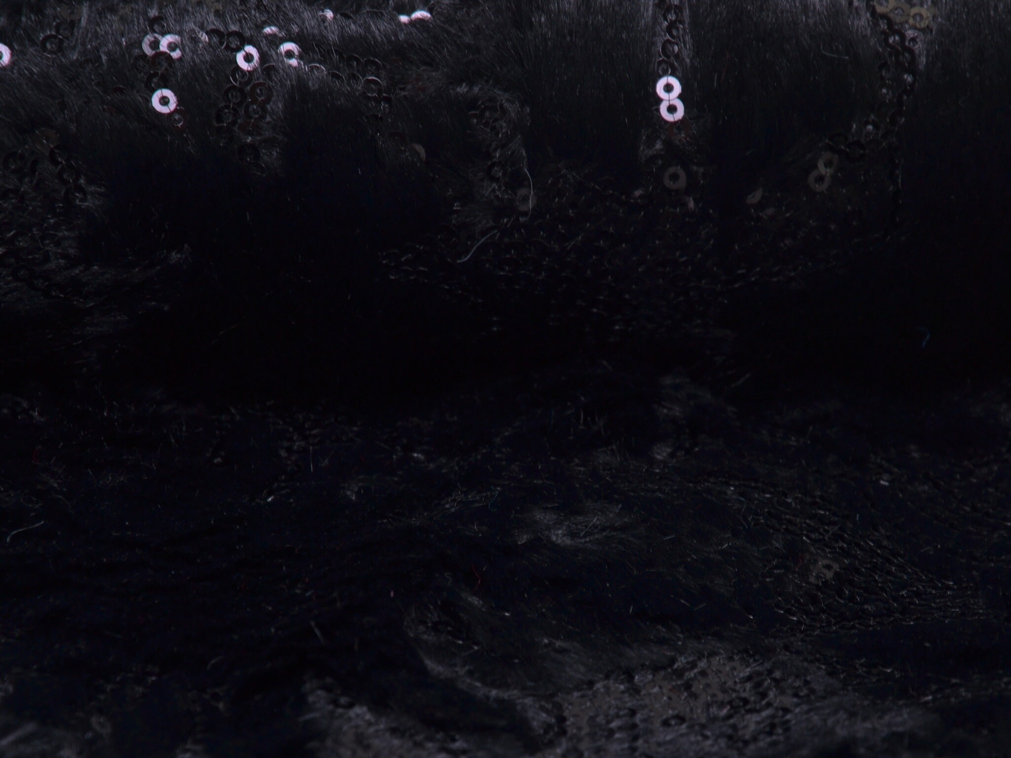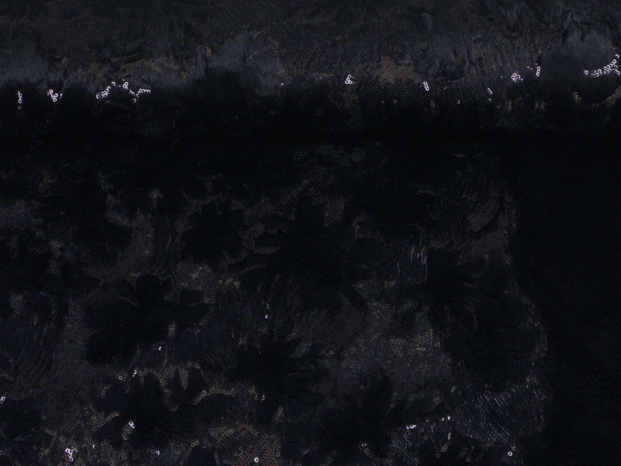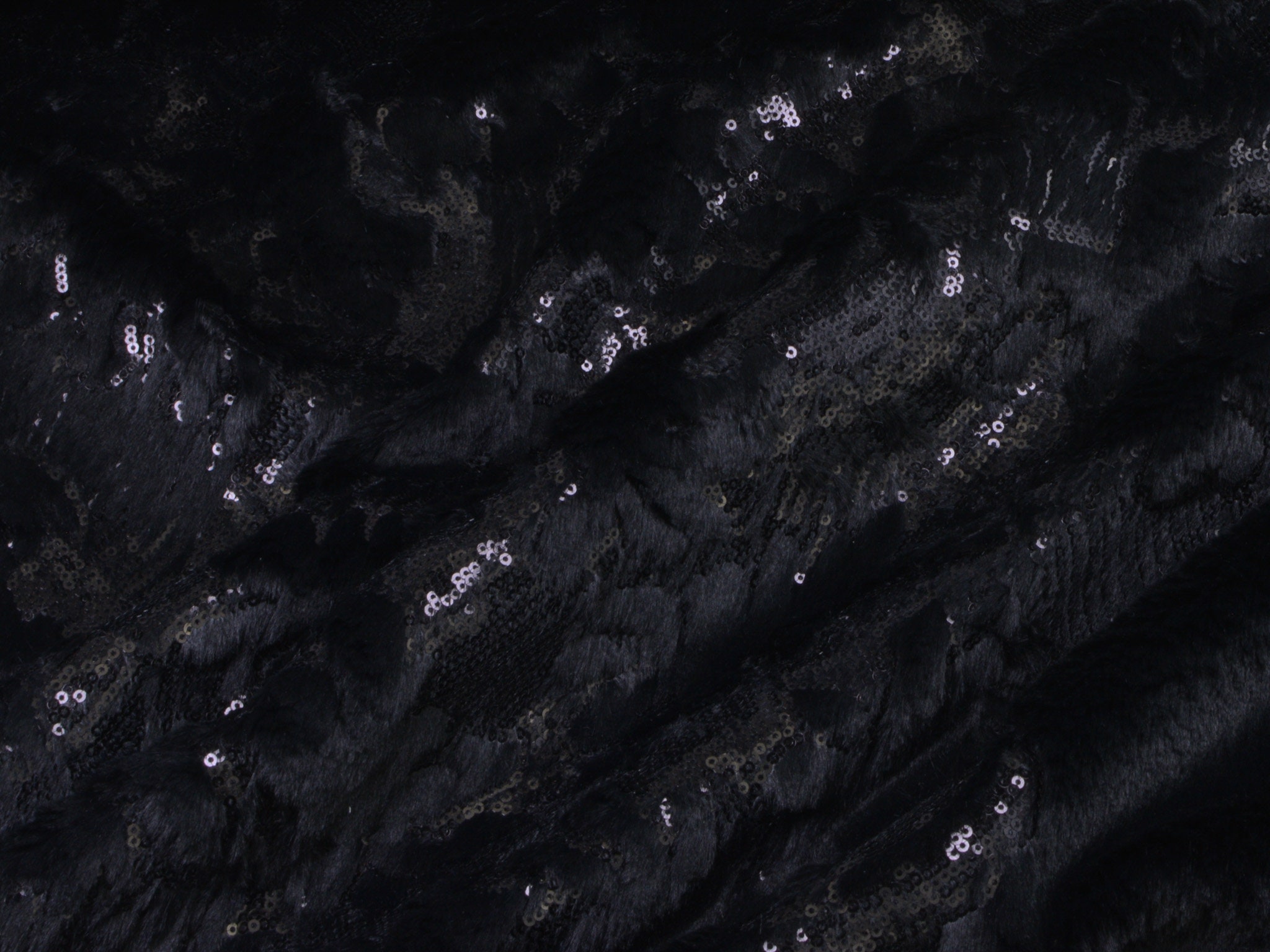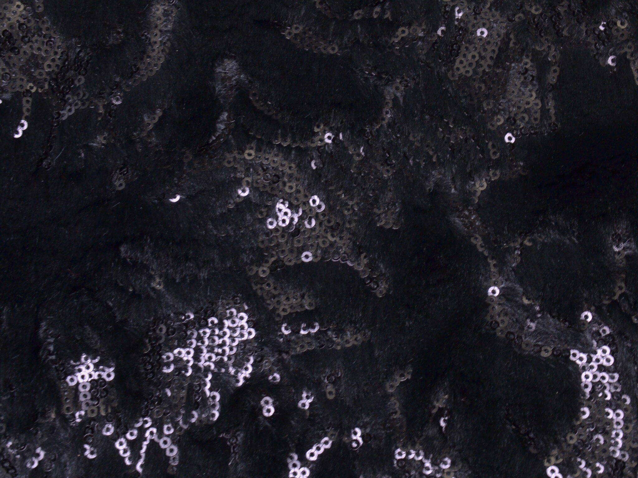 Sehr exklusiver Designerstoff in schwarz. Das super weiche Fellimitat ist mit schwarzen Pailletten bestickt. Die Pailletten funkeln wunderschön im Licht. Nähe dir aus dem Designerstoff einzigartige Jacken, Mäntel und Westen. Wir empfehlen dir den Stoff zu Füttern.