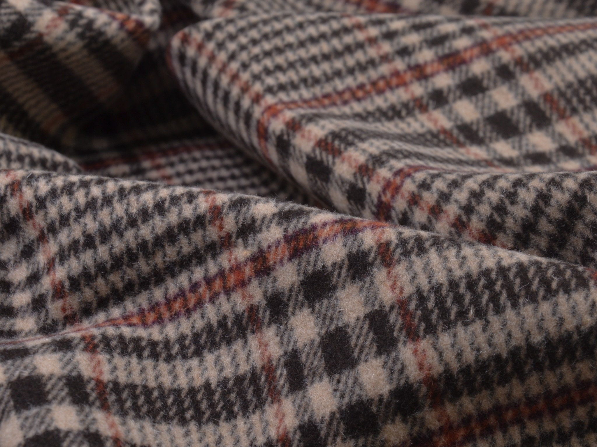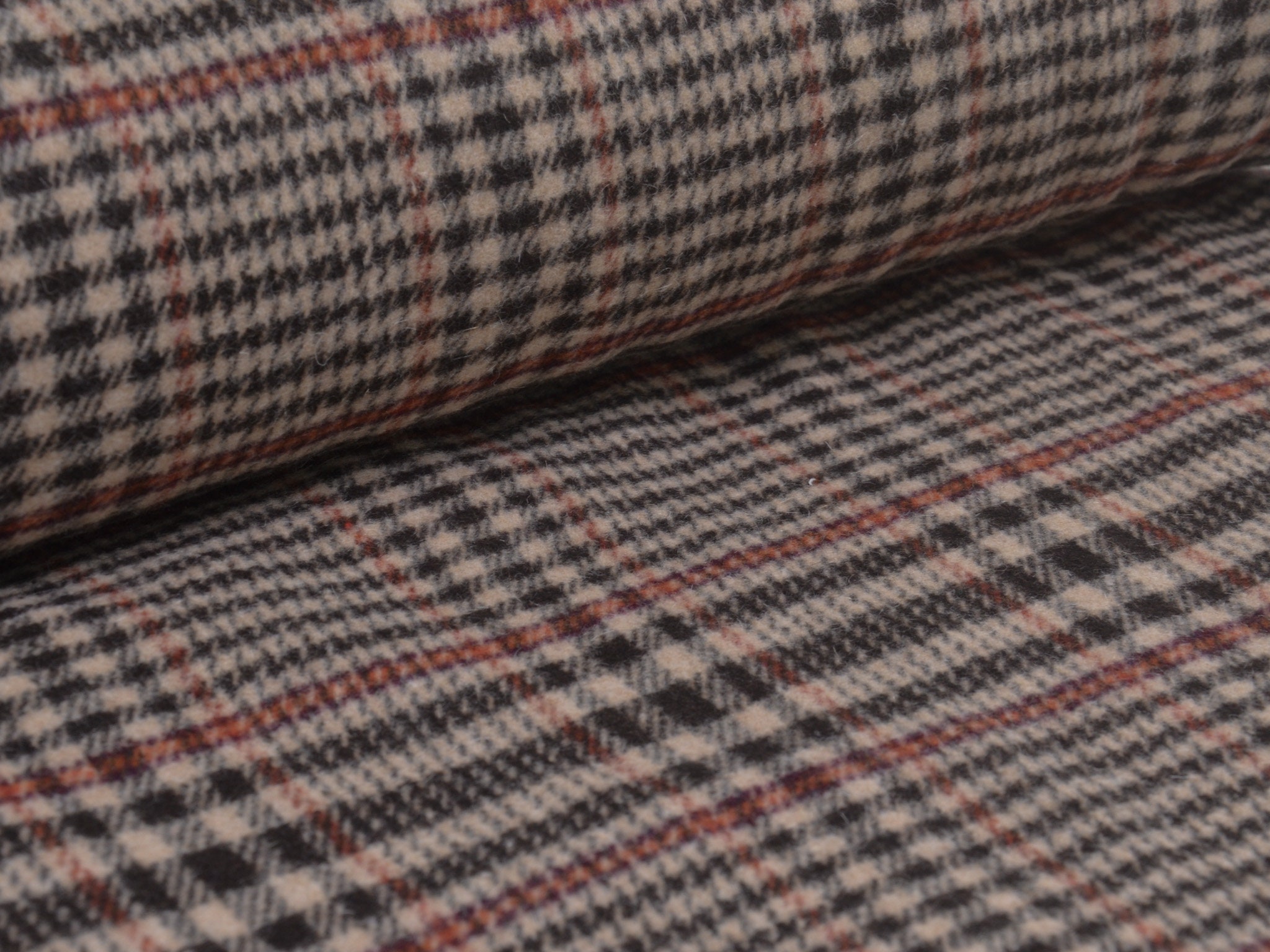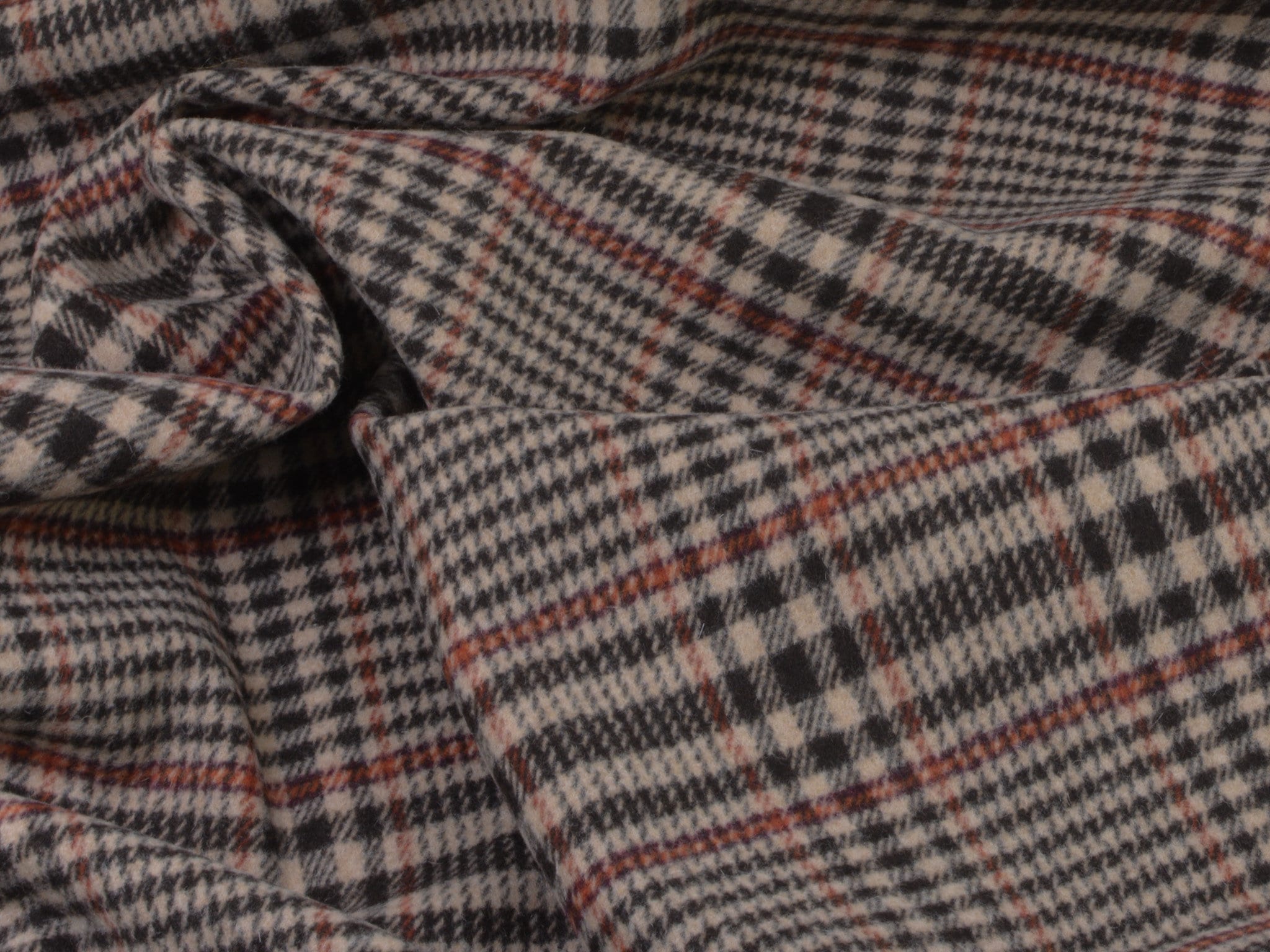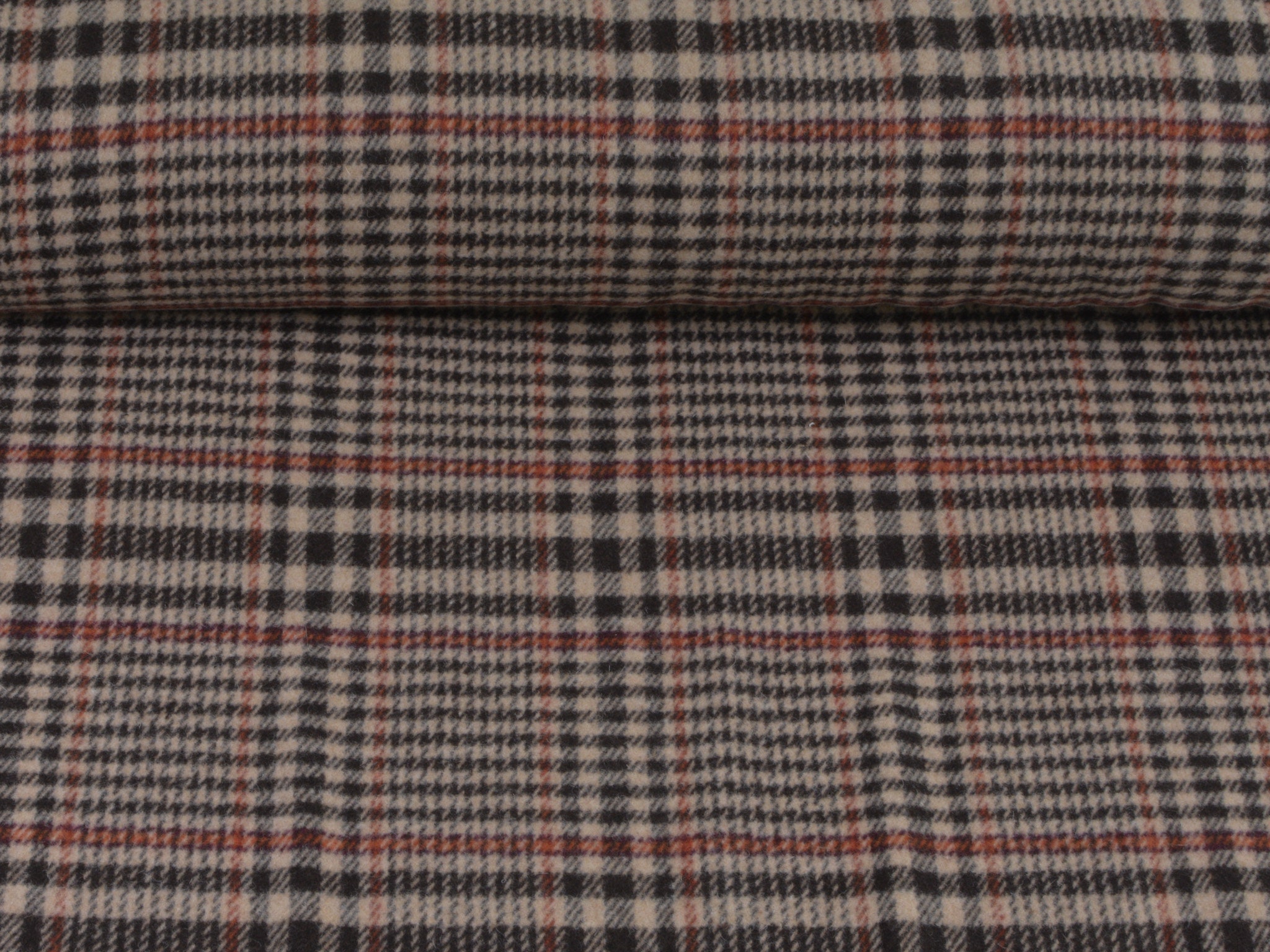 Hochwertiger Wollstoff für Mäntel und Jacken. Der Mischstoff besteht aus Schurwolle, Polyamid und Viskose. Er ist kariert, Karo-Rapport ist ca. 15 cm hoch. Der Stoff ist mittel schwer.