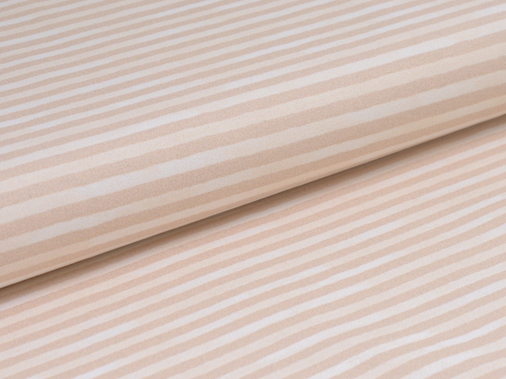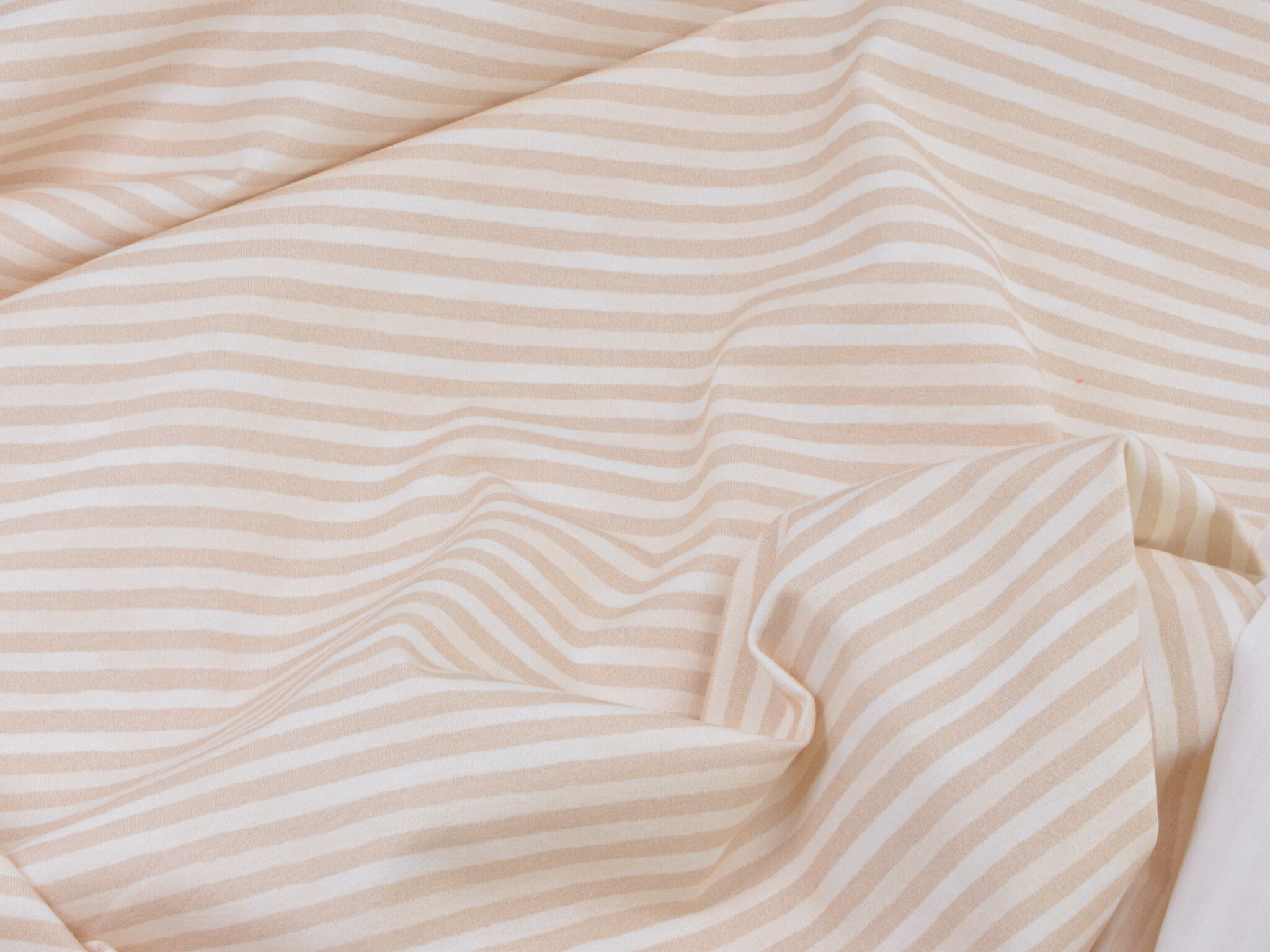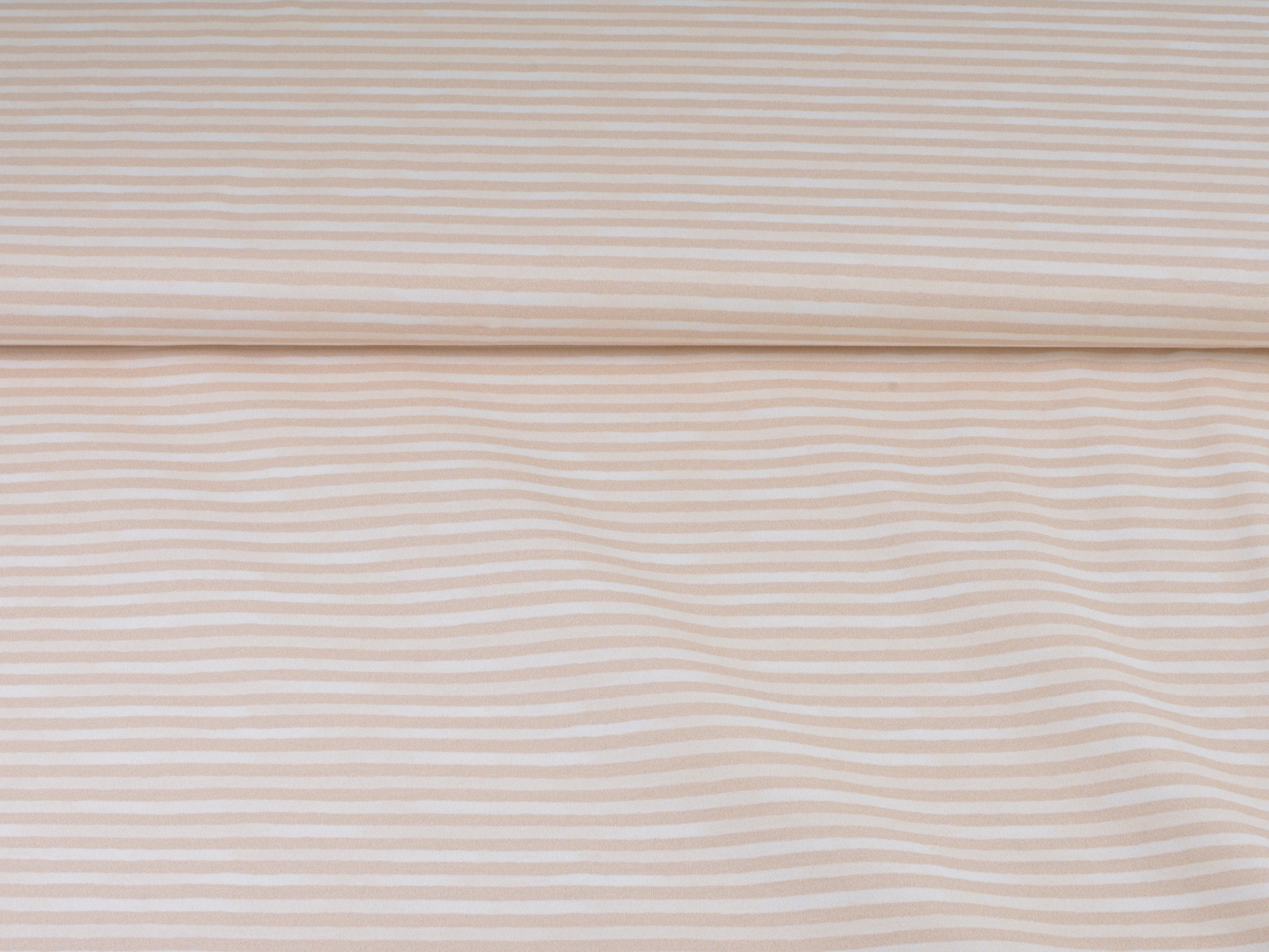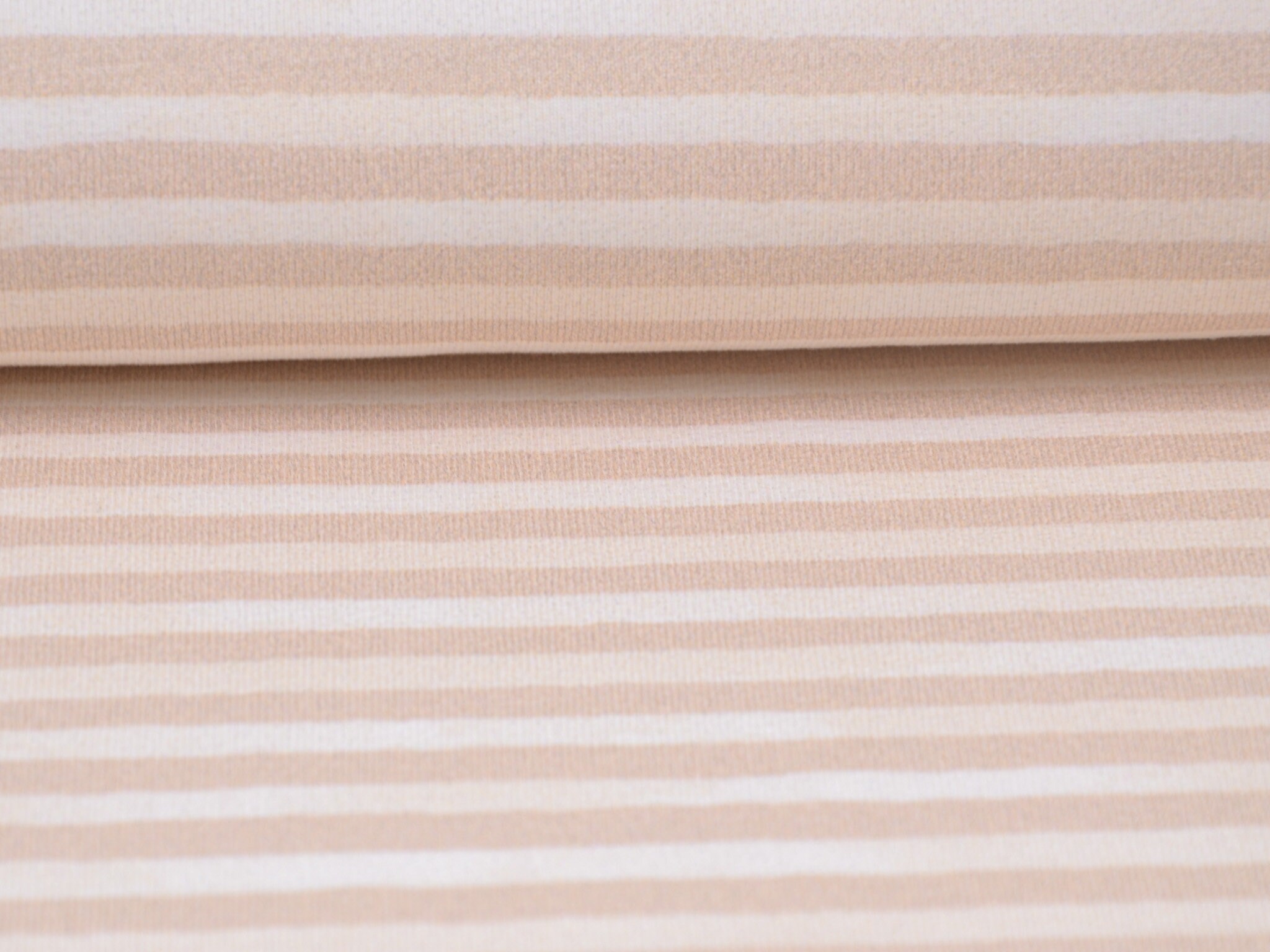 Hochwertiger Baumwolljersey von Hilco. Der Jersey ist beige und weiß gestreift. Er ist glatt und dünn. Nähe daraus T-Shirts, Langarmshirts, Body, Pumphosen und vieles mehr.