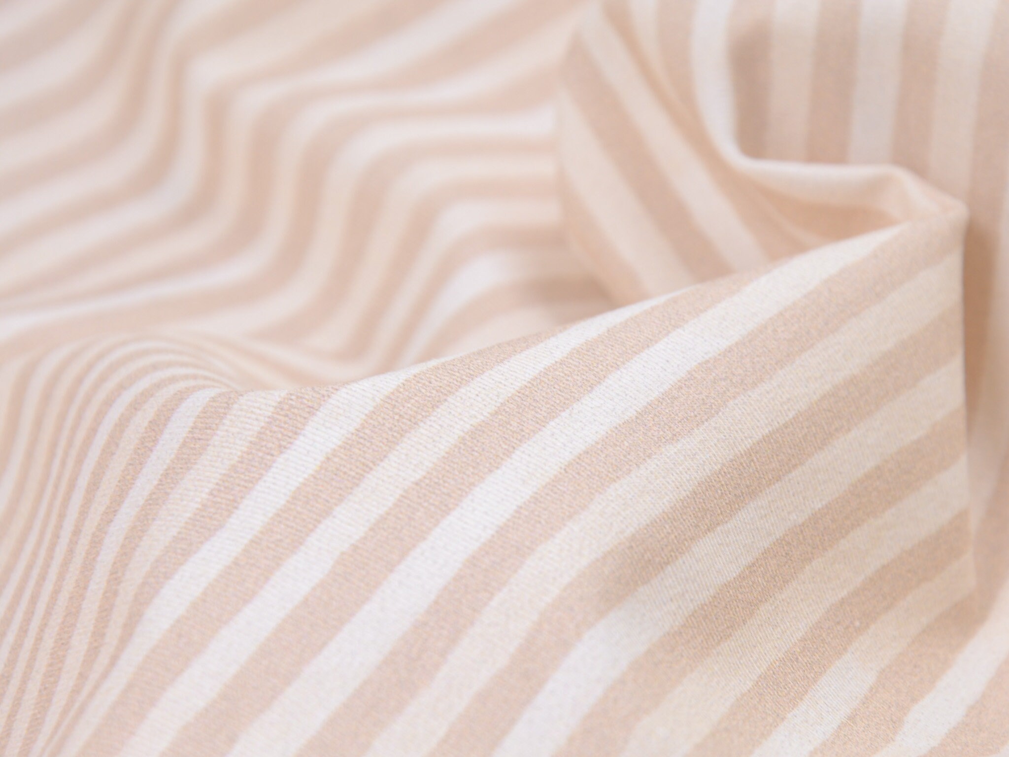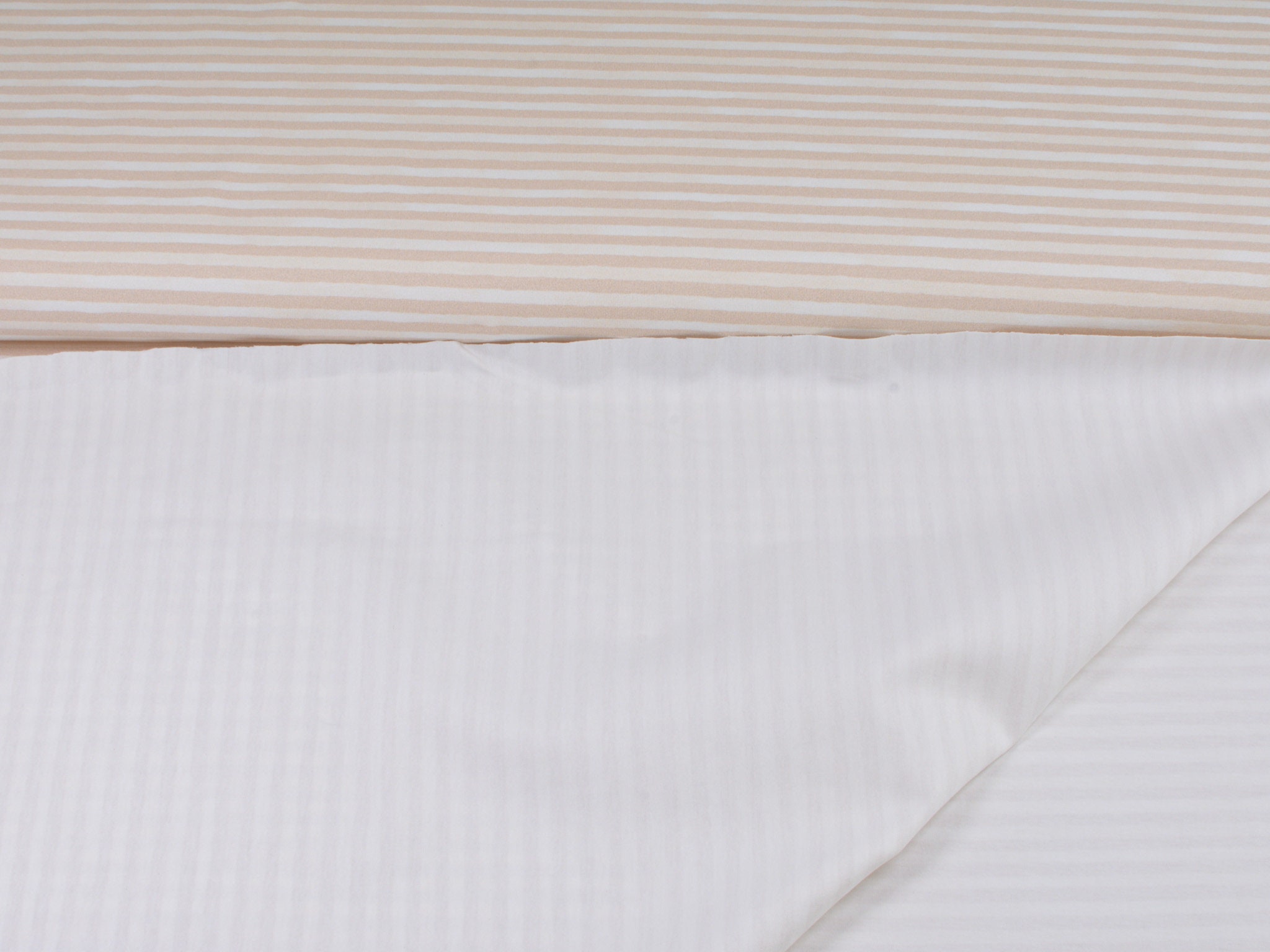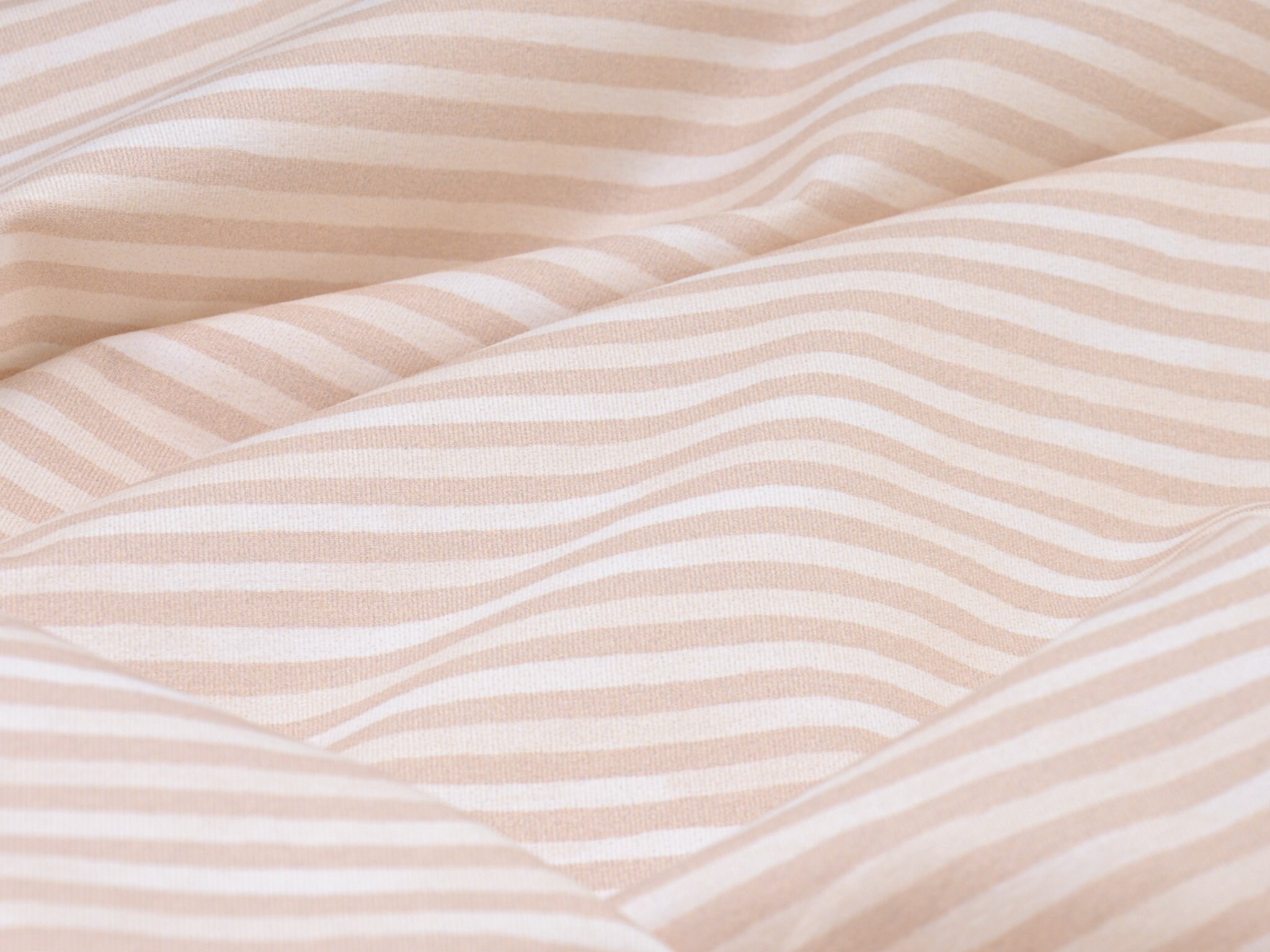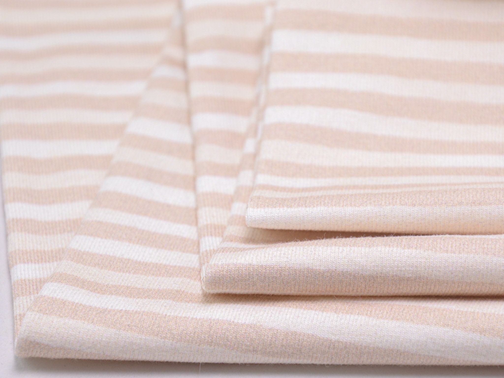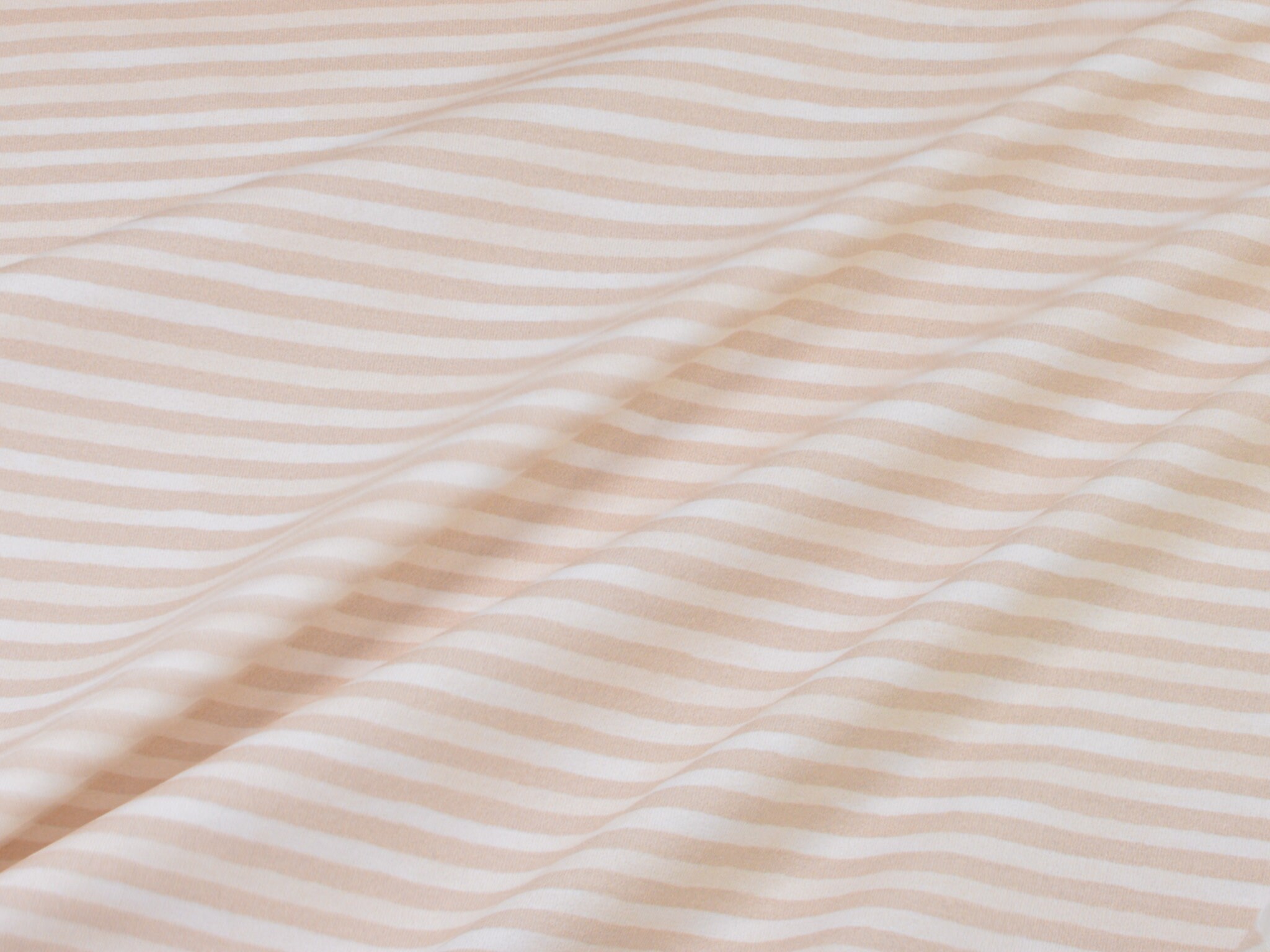 Hochwertiger Baumwolljersey von Hilco. Der Jersey ist beige und weiß gestreift. Er ist glatt und dünn. Nähe daraus T-Shirts, Langarmshirts, Body, Pumphosen und vieles mehr.