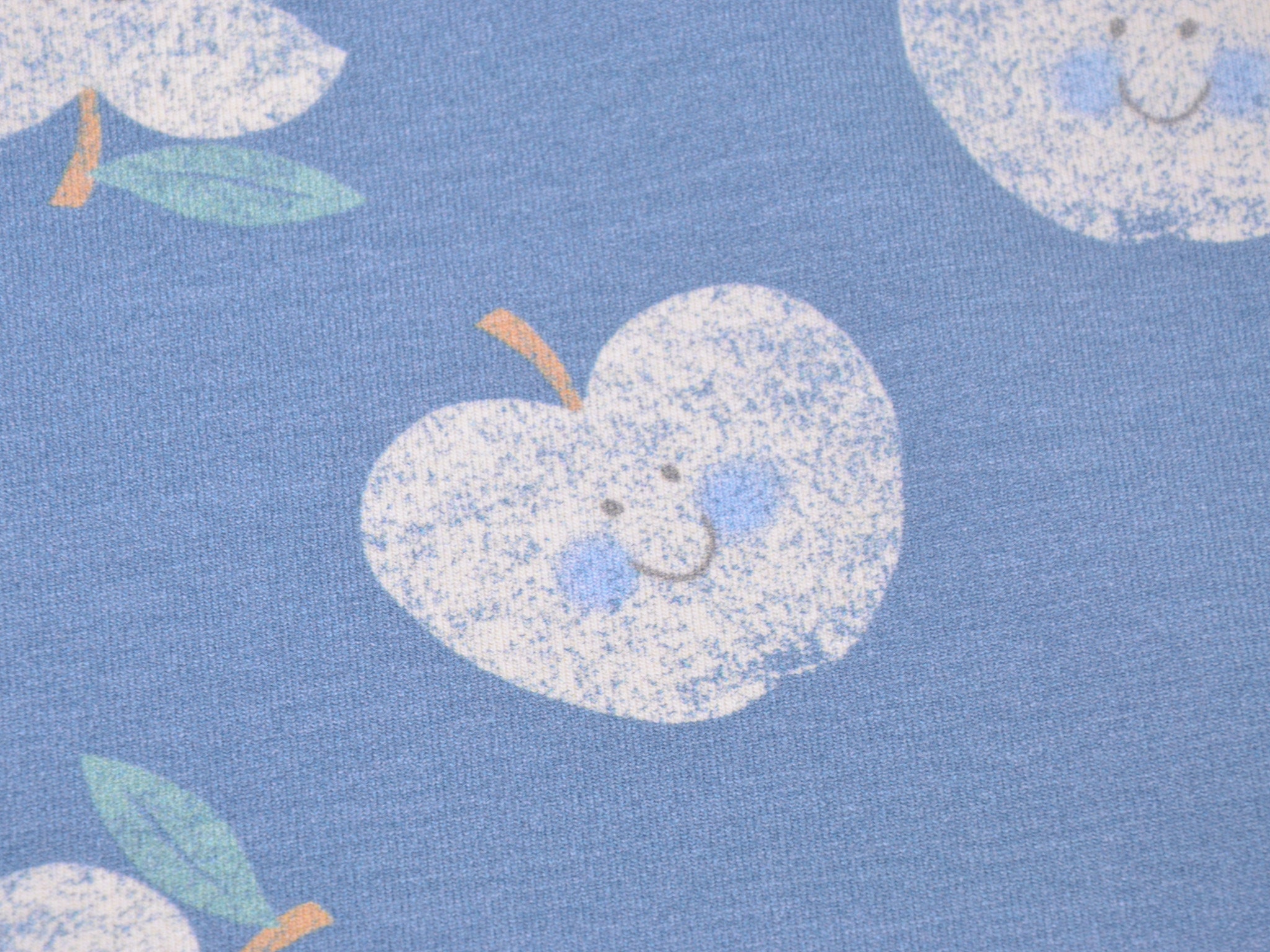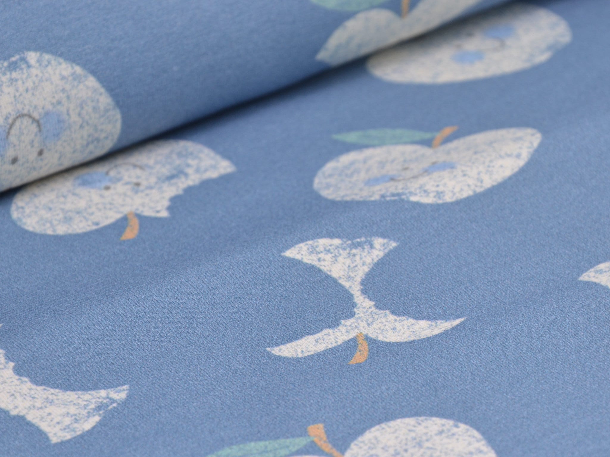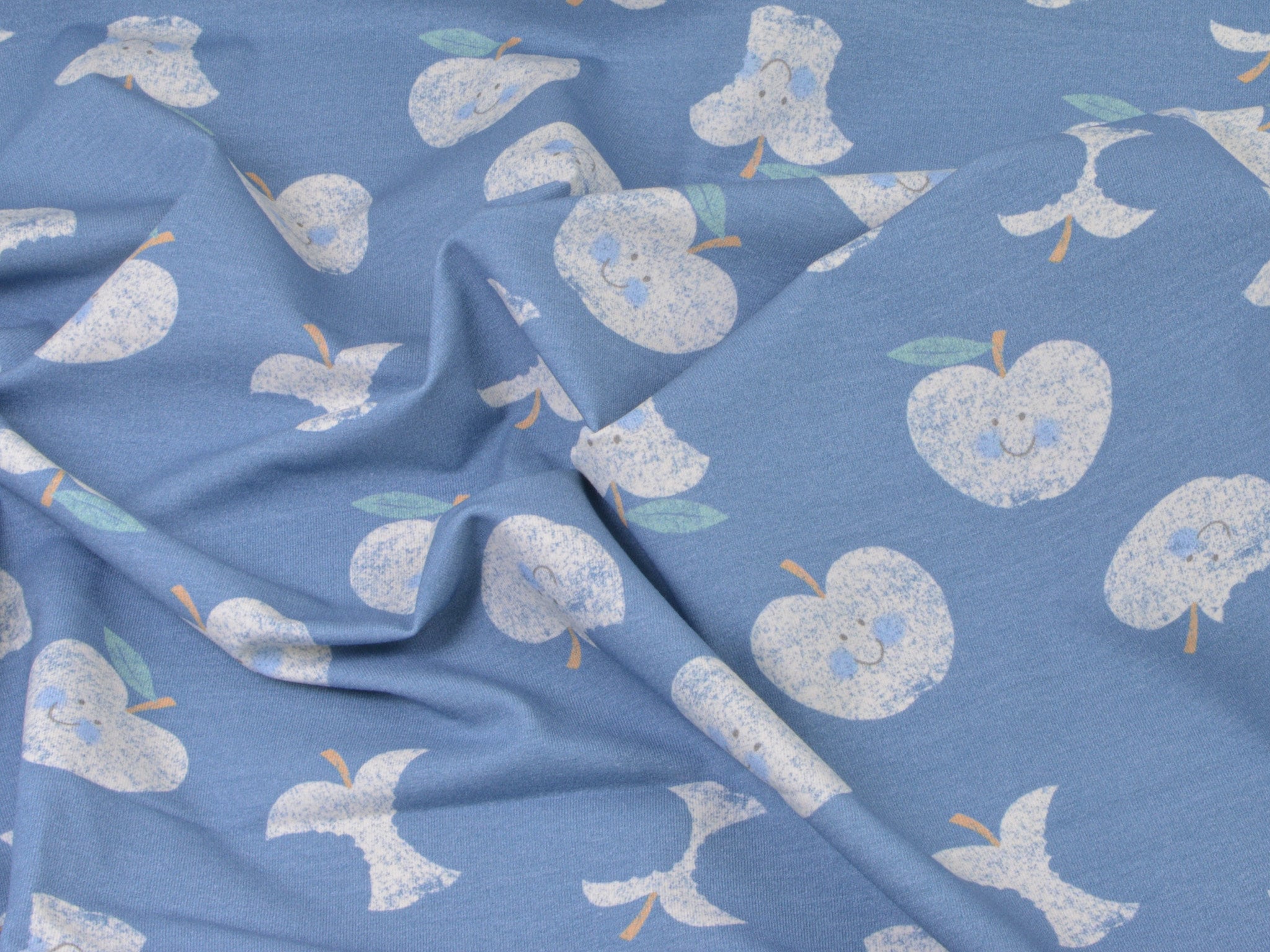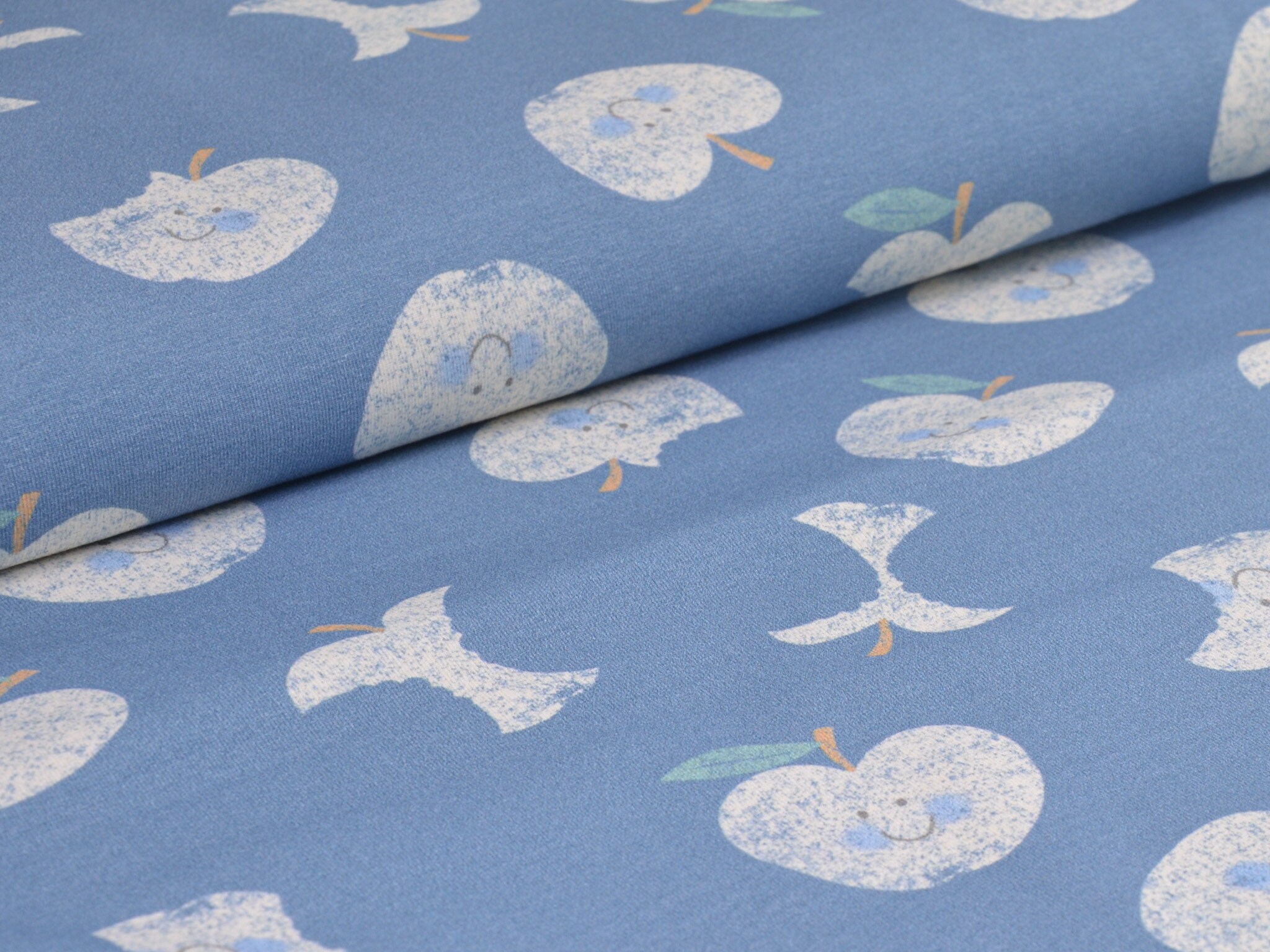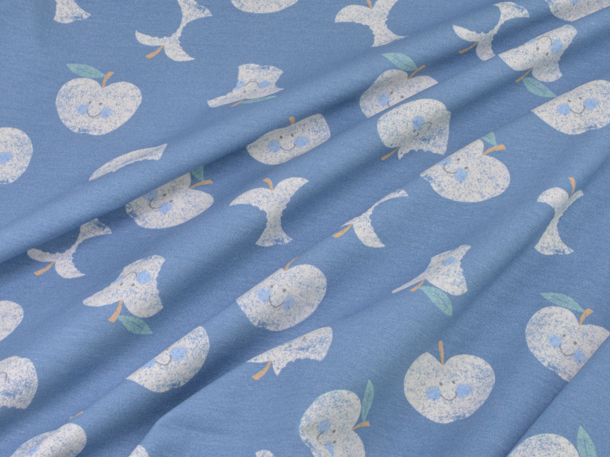 Hochwertiger Baumwolljersey von Hilco. Der Jersey ist blau mit Äpfeln. Er ist glatt und dünn. Nähe daraus T-Shirts, Langarmshirts, Body, Pumphosen und vieles mehr.