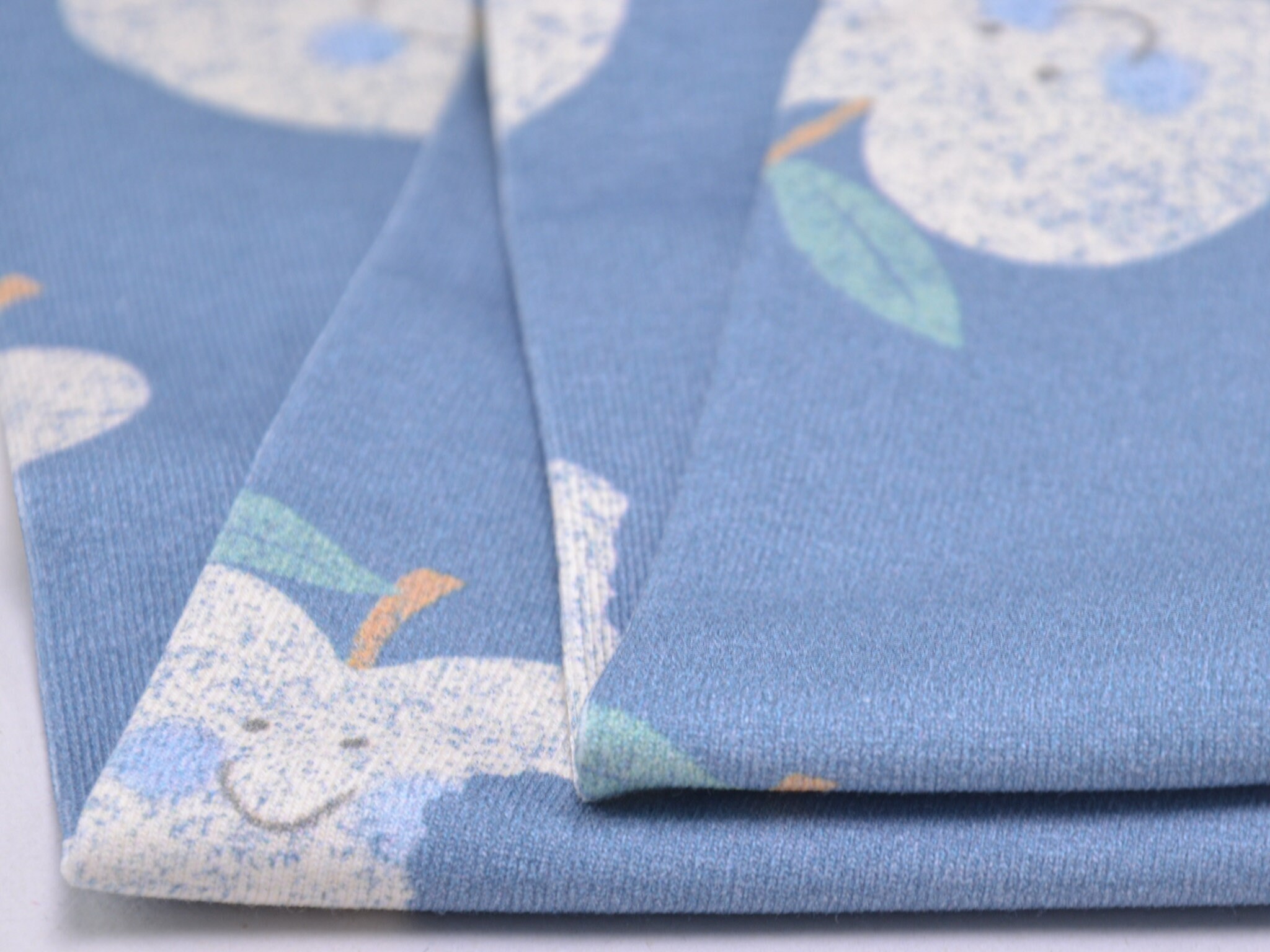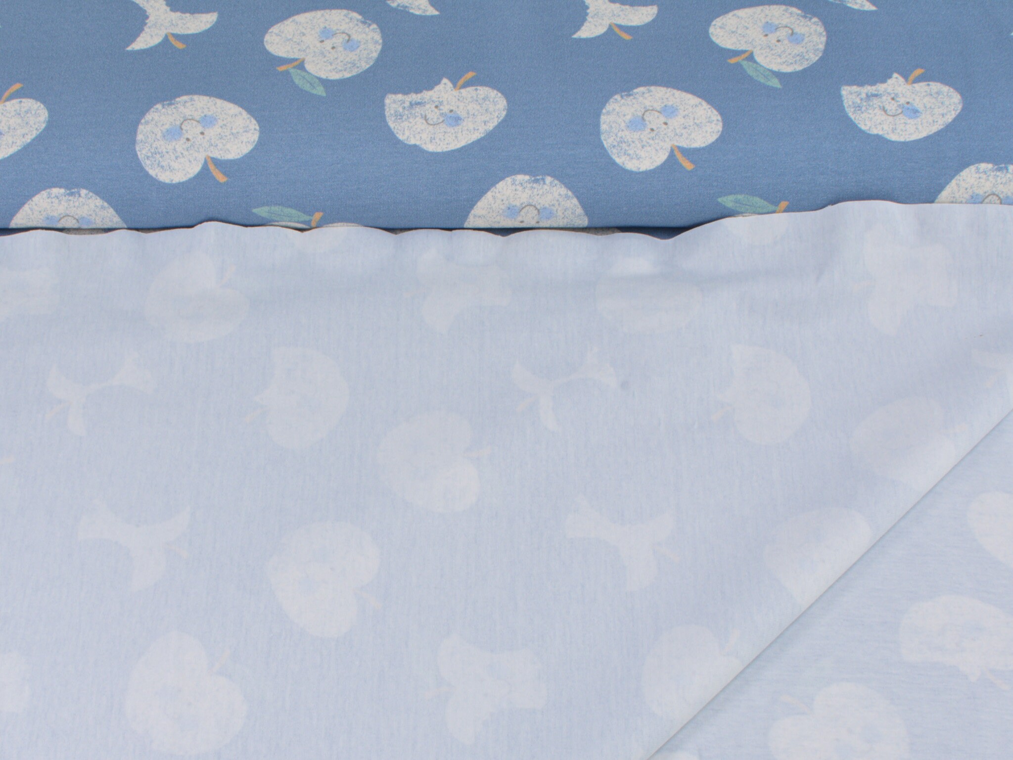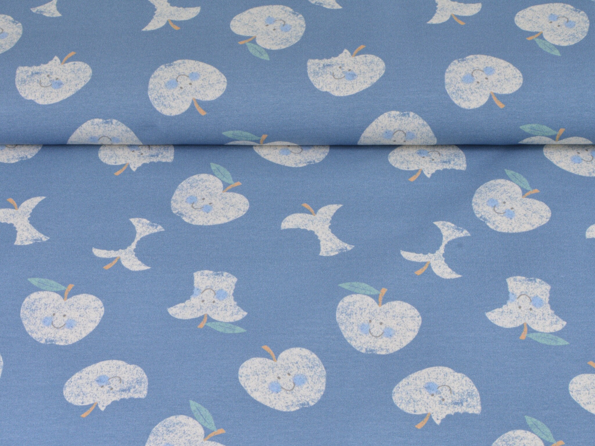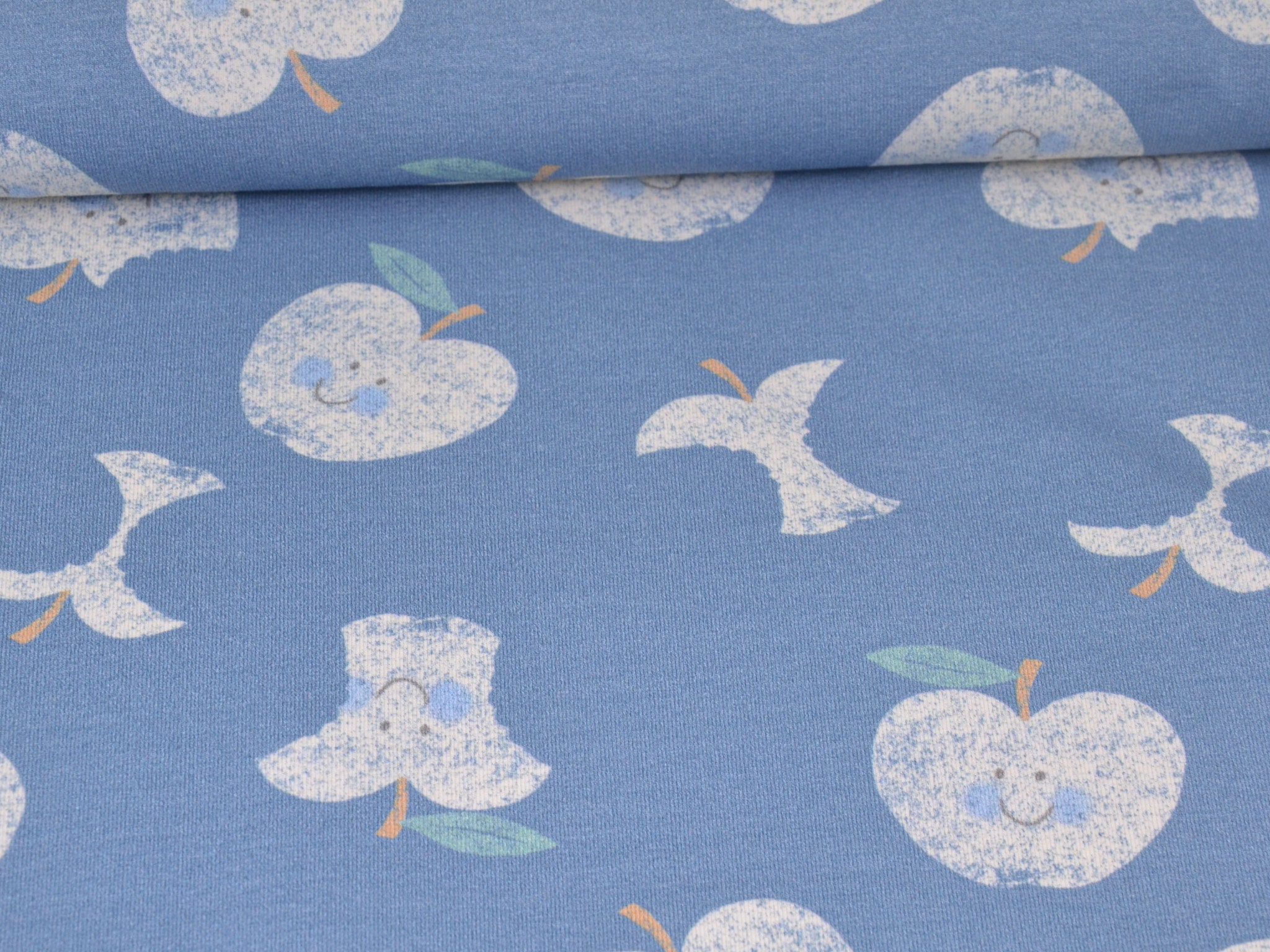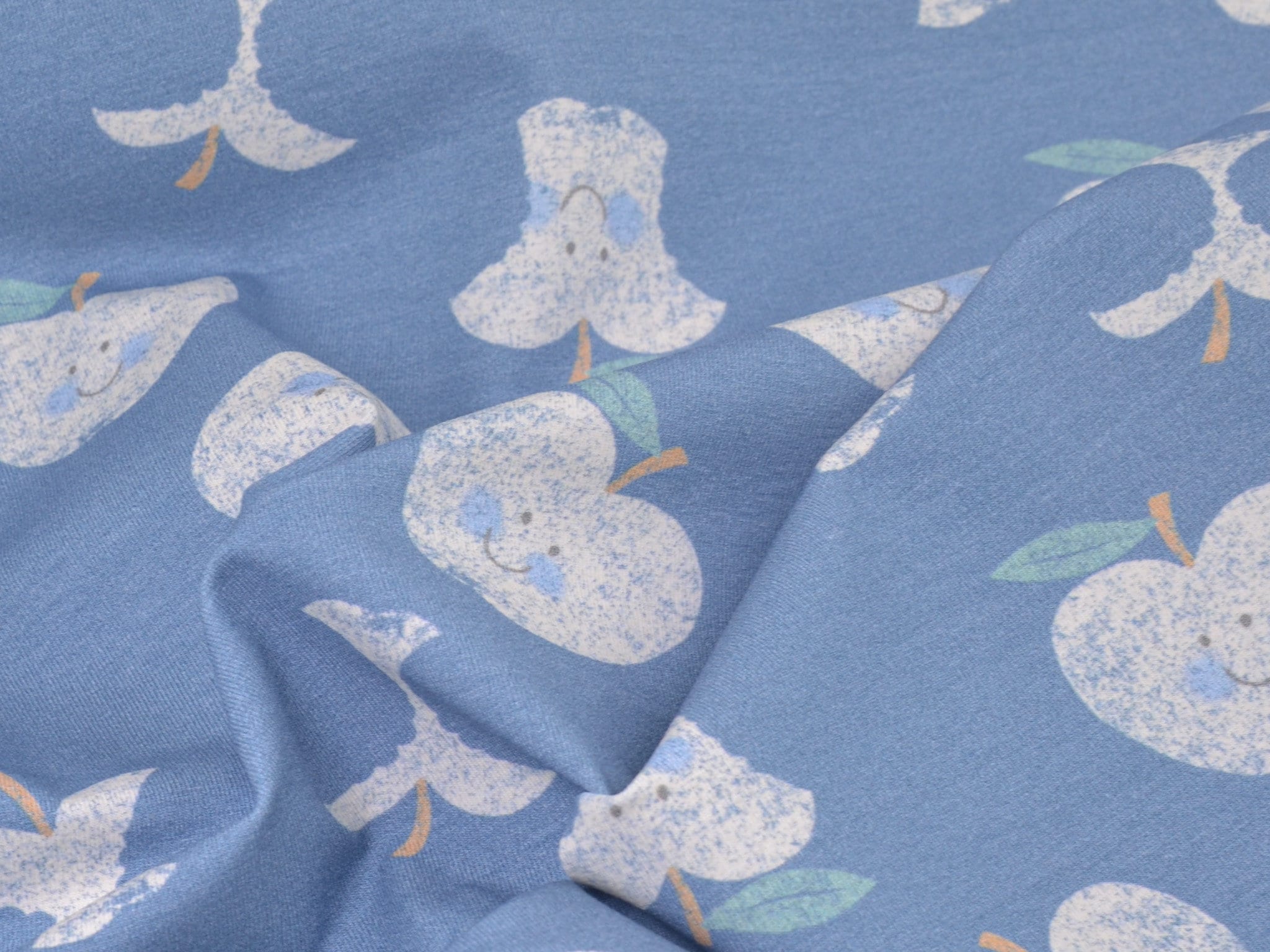Hochwertiger Baumwolljersey von Hilco. Der Jersey ist blau mit Äpfeln. Er ist glatt und dünn. Nähe daraus T-Shirts, Langarmshirts, Body, Pumphosen und vieles mehr.
