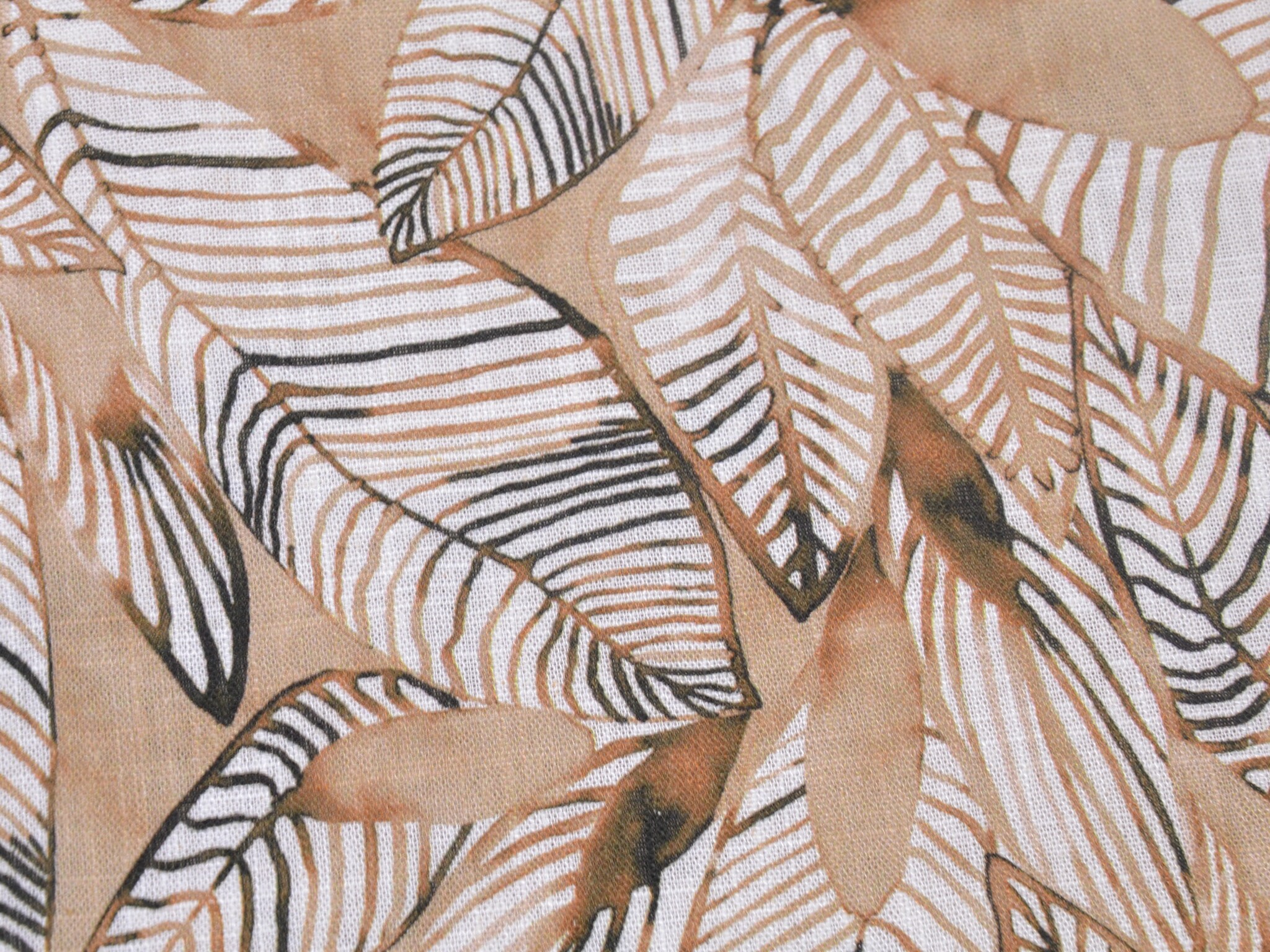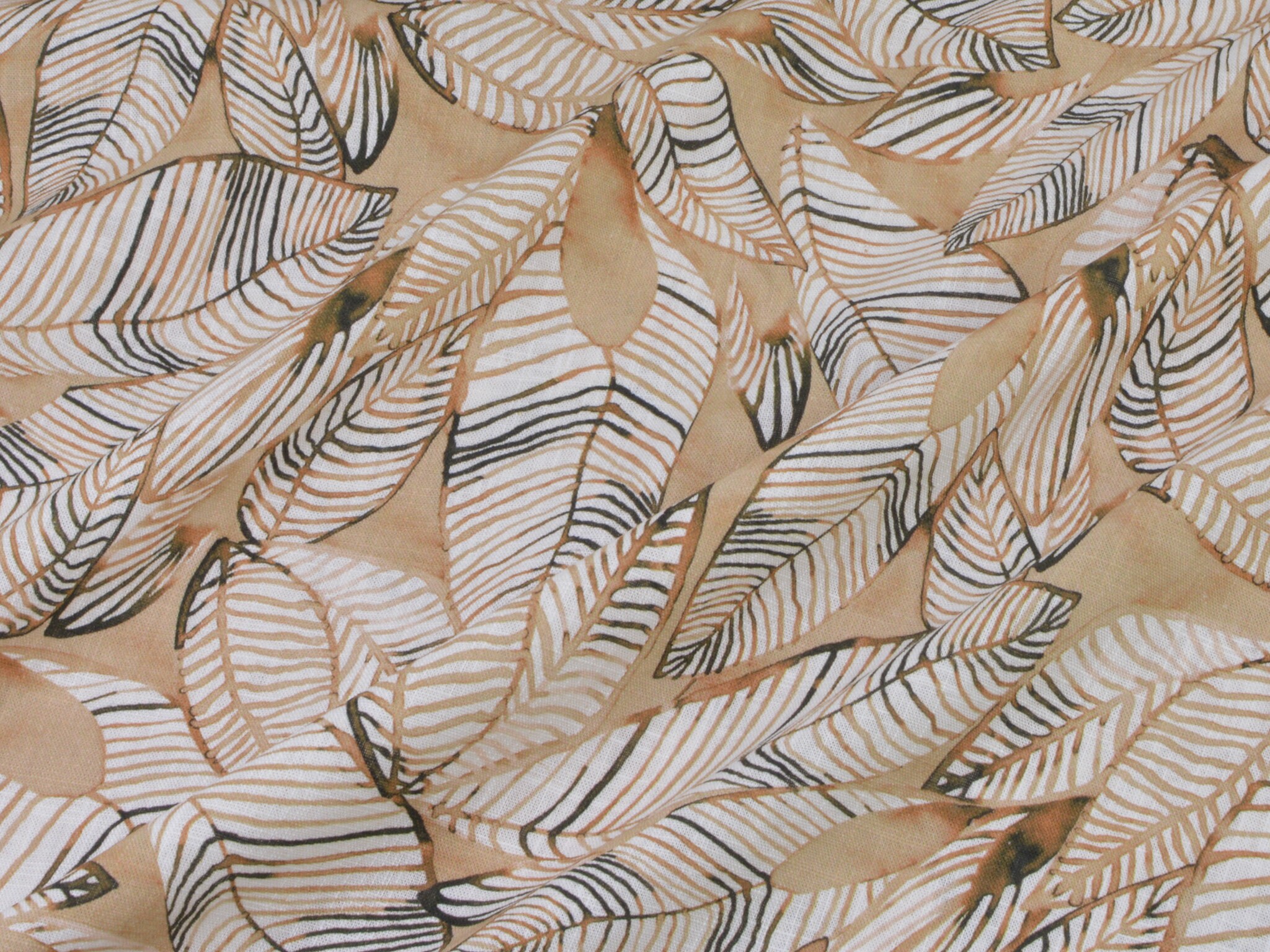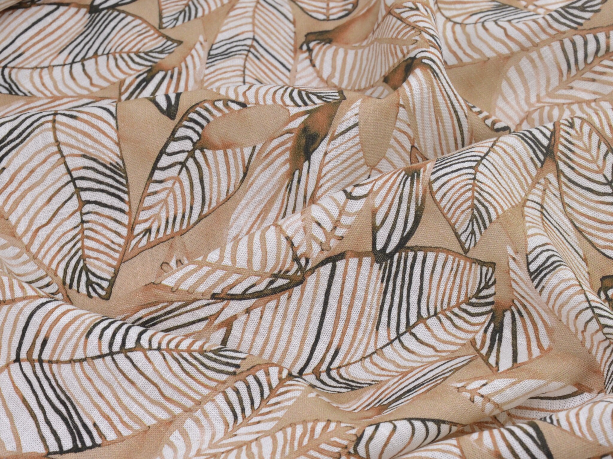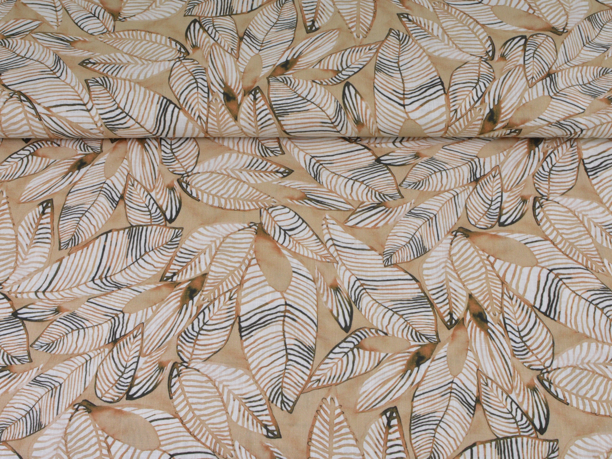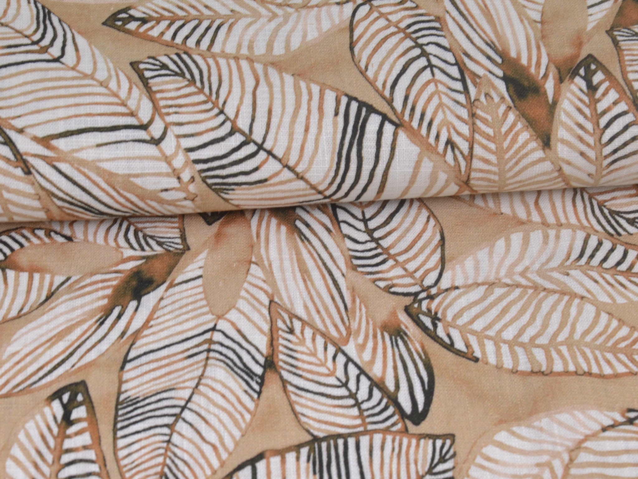 Hochwertiger Druckstoff aus Leinen und Viskose von Hilco. Der Stoff ist naturfarben mit einem beige, braunen Druck. Der Druck zeigt große Blätter. Er ist leicht und zeigt die typische Leinenstruktur. Nähe dir daraus Blusen, Kleider, Röcke, Sommerhosen und vieles mehr.
