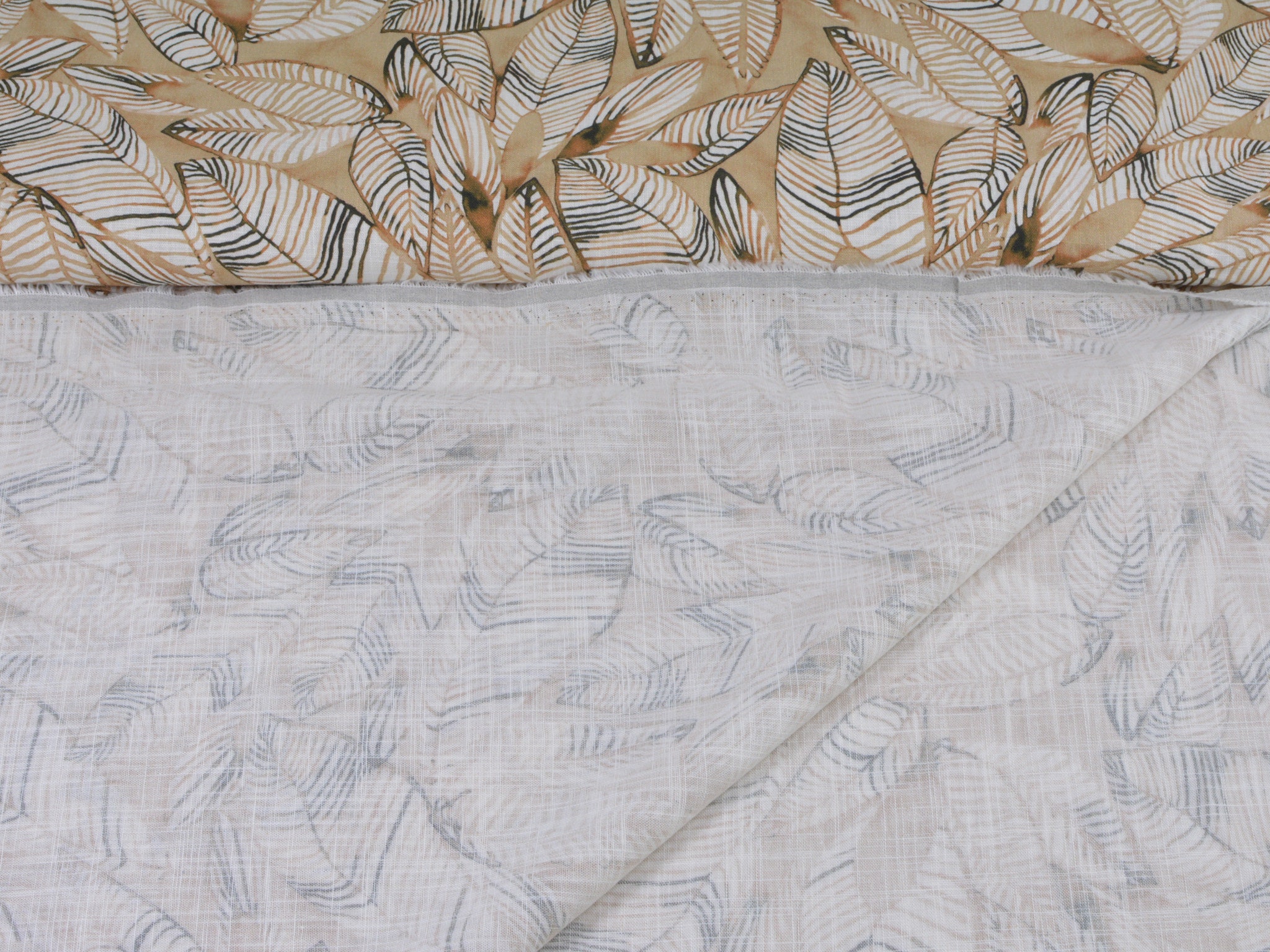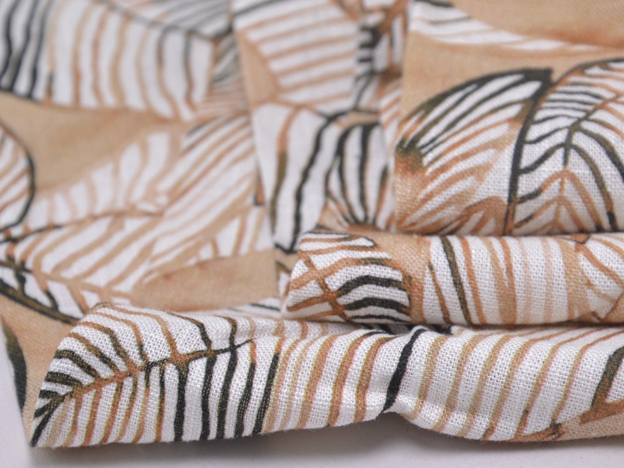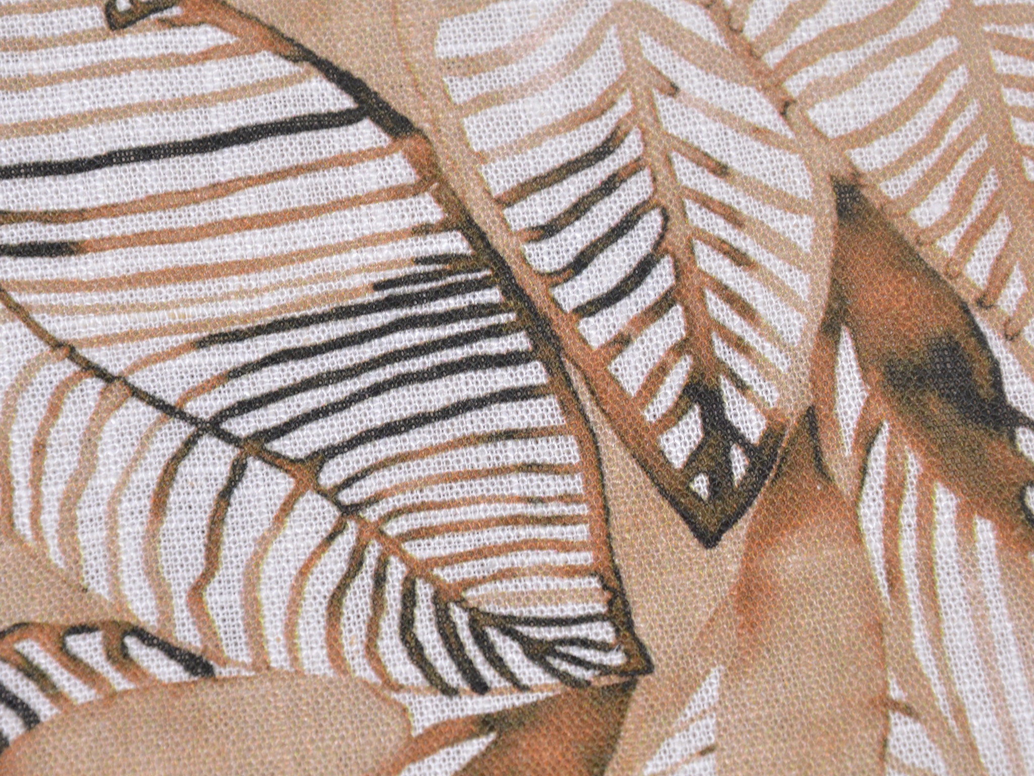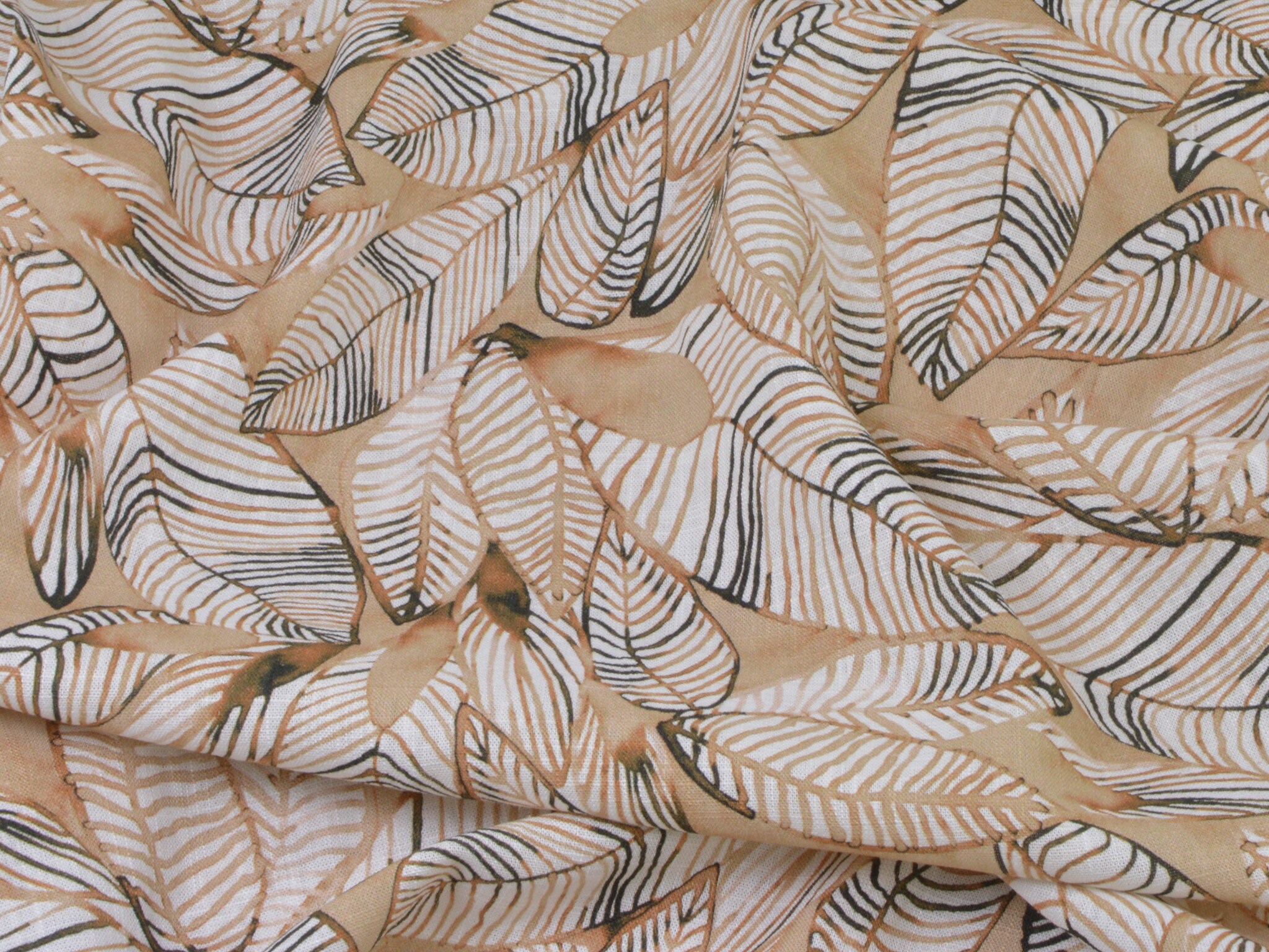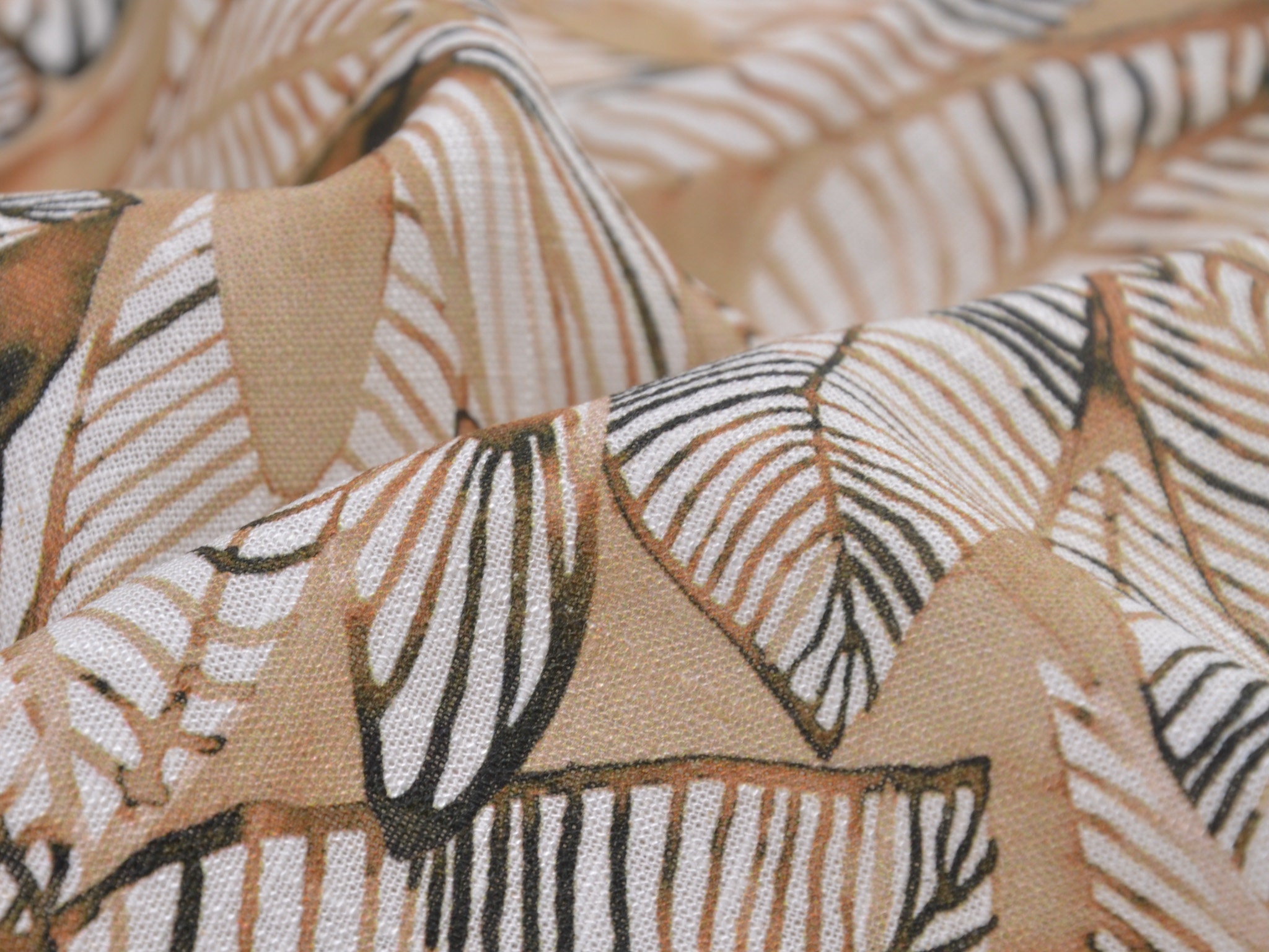 Hochwertiger Druckstoff aus Leinen und Viskose von Hilco. Der Stoff ist naturfarben mit einem beige, braunen Druck. Der Druck zeigt große Blätter. Er ist leicht und zeigt die typische Leinenstruktur. Nähe dir daraus Blusen, Kleider, Röcke, Sommerhosen und vieles mehr.