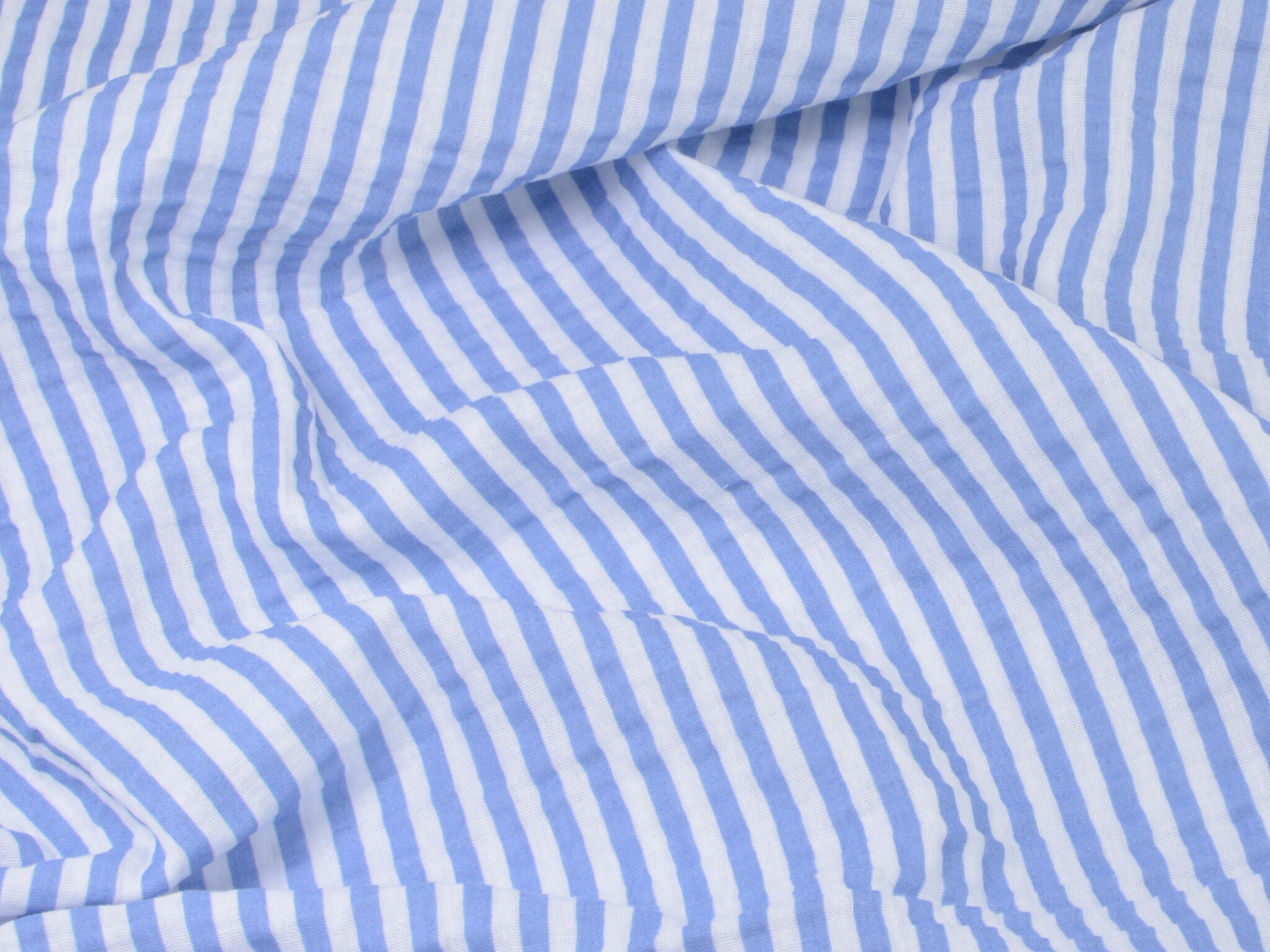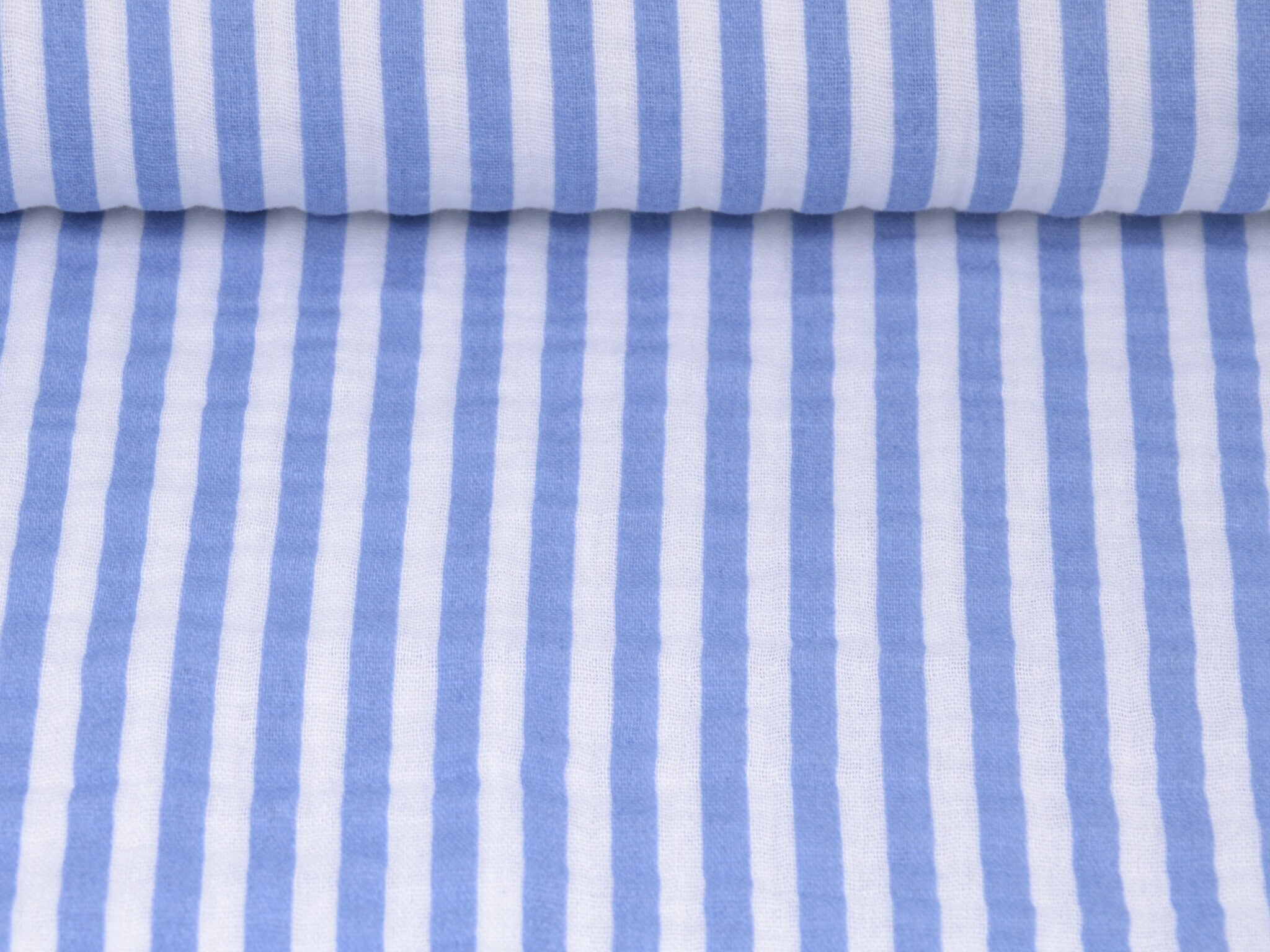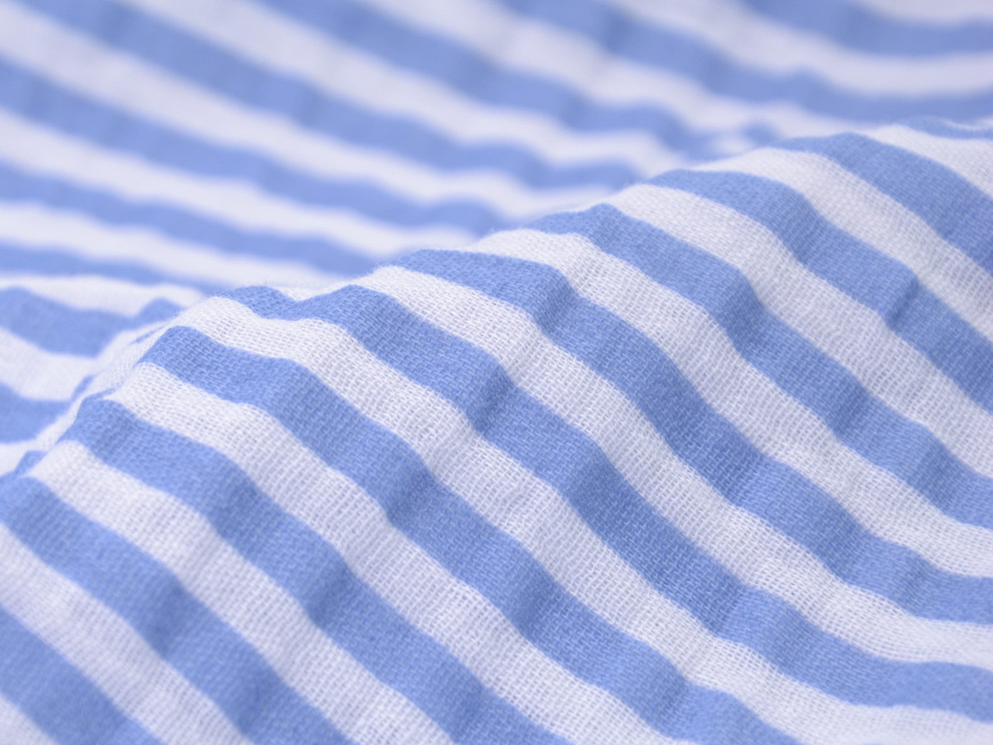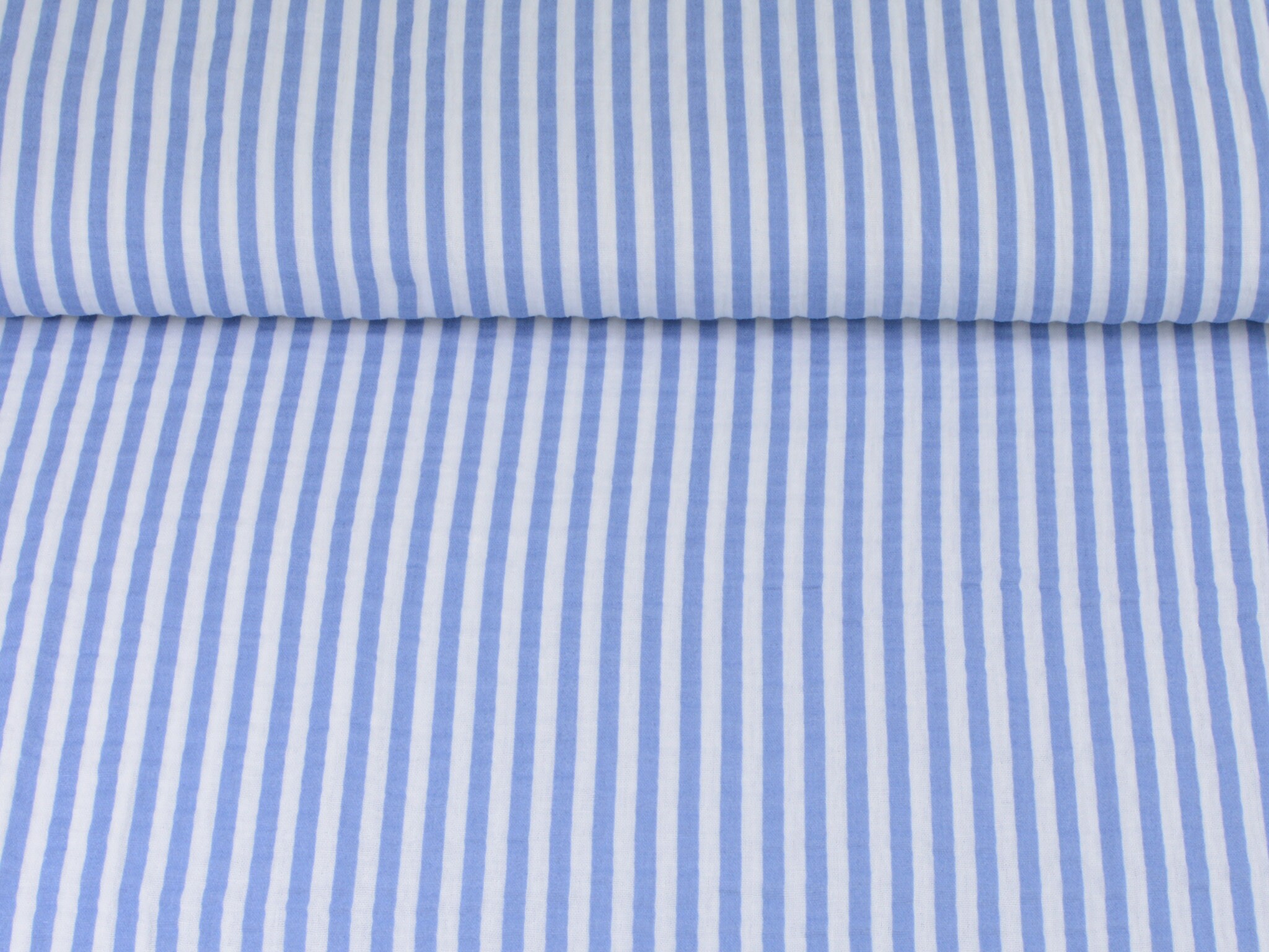 Hochwertiger Musselin aus Baumwolle von Hilco. Der Stoff ist blau und weiß gestreift. Er ist leicht und fühlt sich weich an. Nähe dir daraus Blusen, Kleider, Röcke, Sommerhosen und vieles mehr.