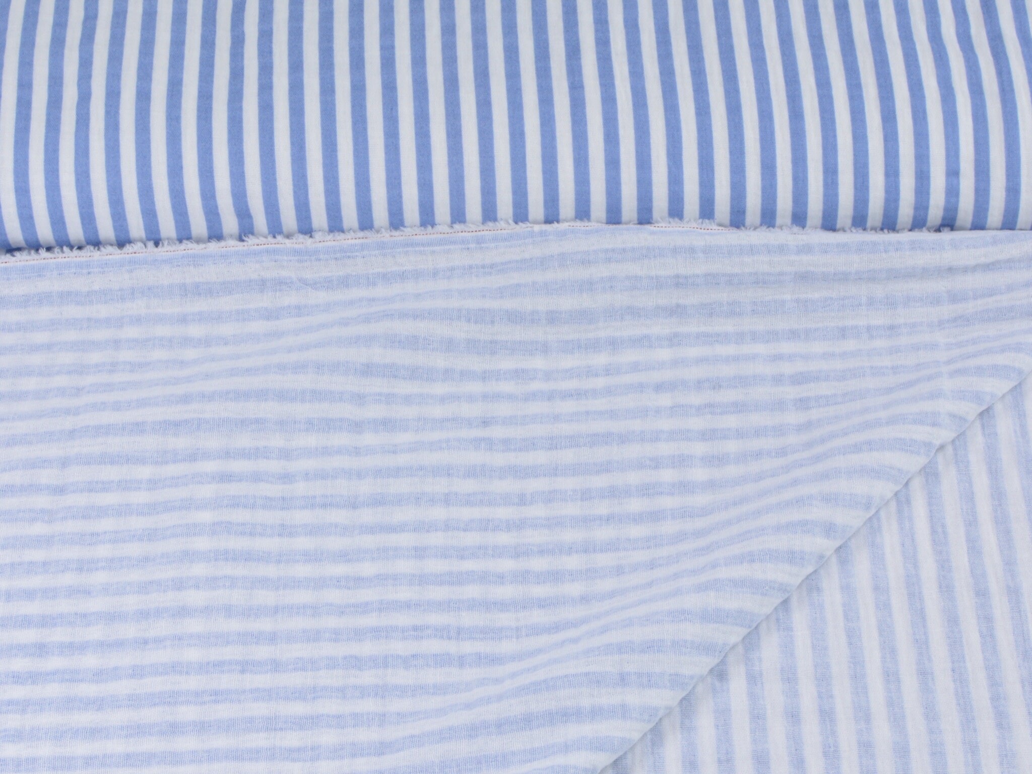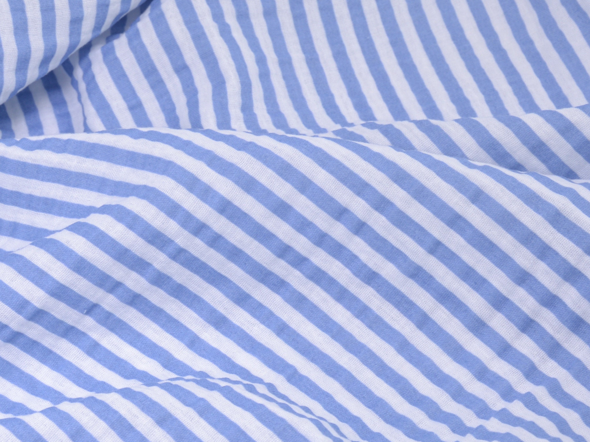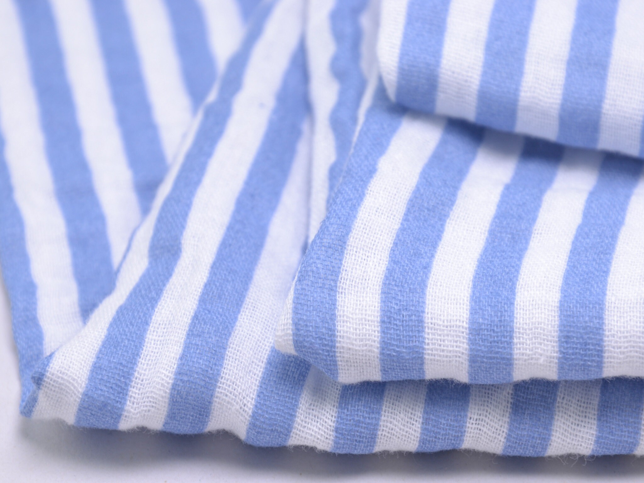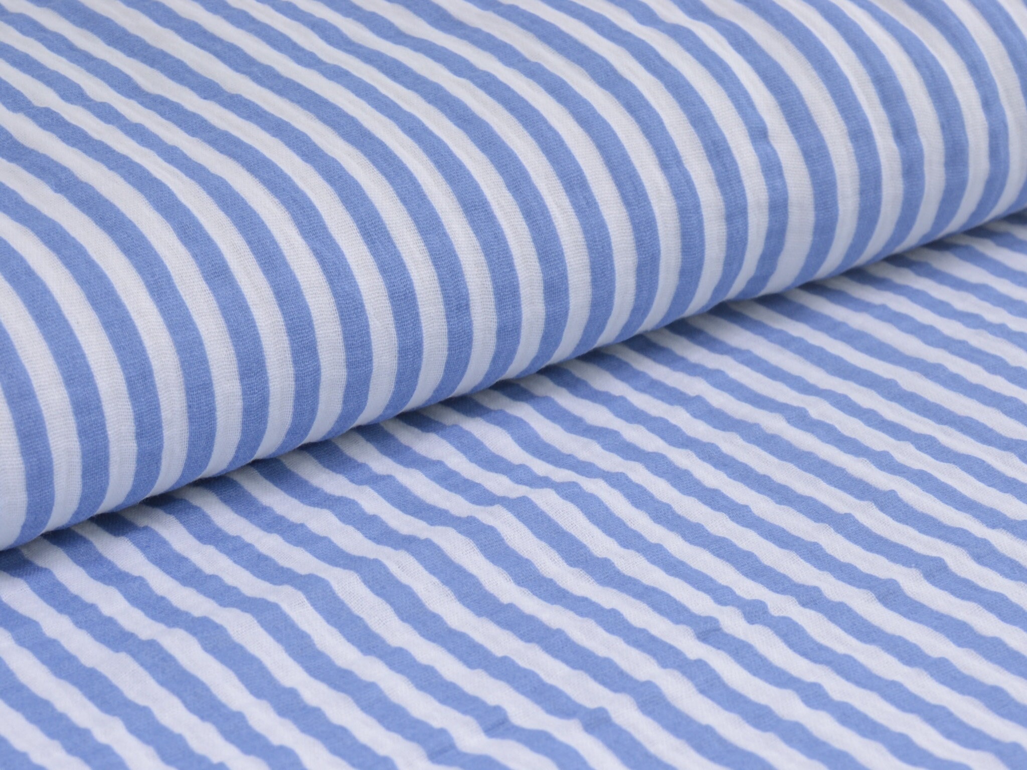Hochwertiger Musselin aus Baumwolle von Hilco. Der Stoff ist blau und weiß gestreift. Er ist leicht und fühlt sich weich an. Nähe dir daraus Blusen, Kleider, Röcke, Sommerhosen und vieles mehr.