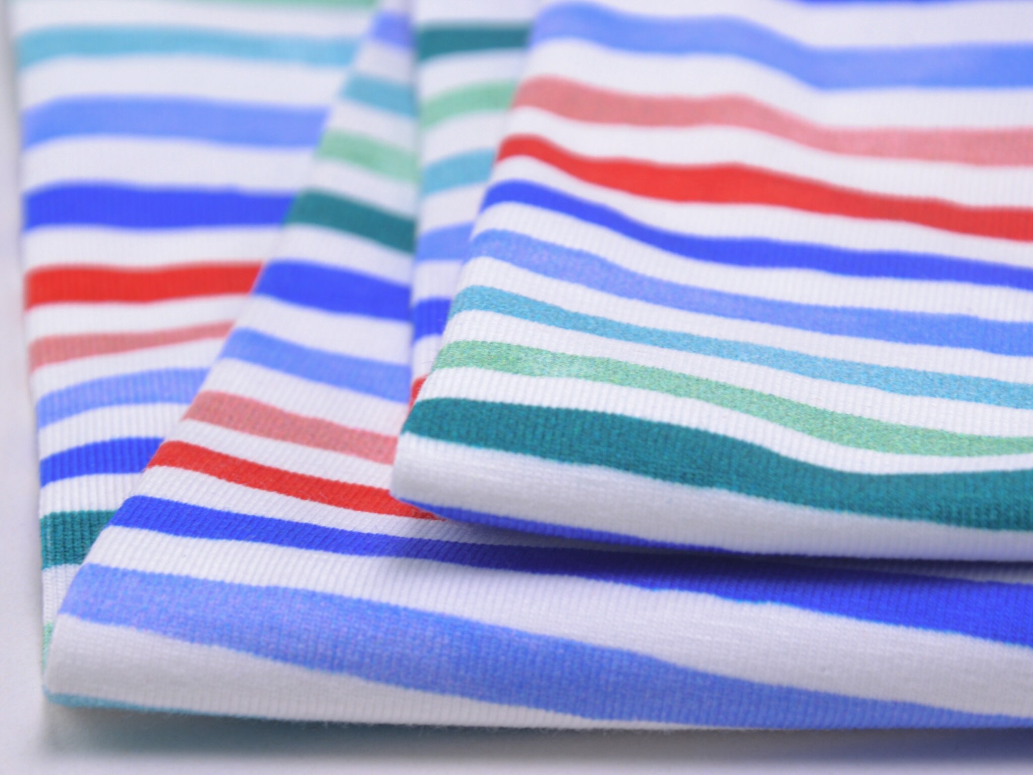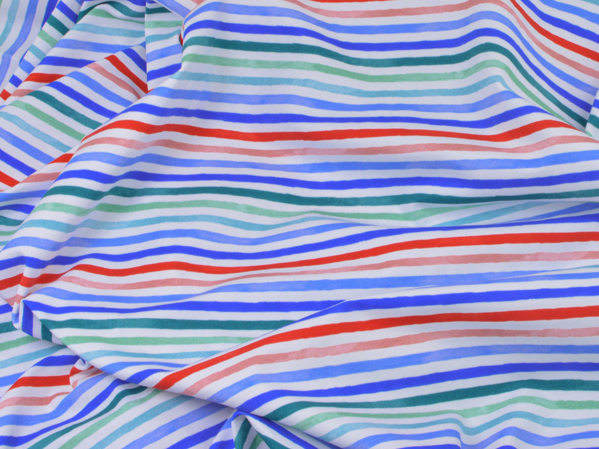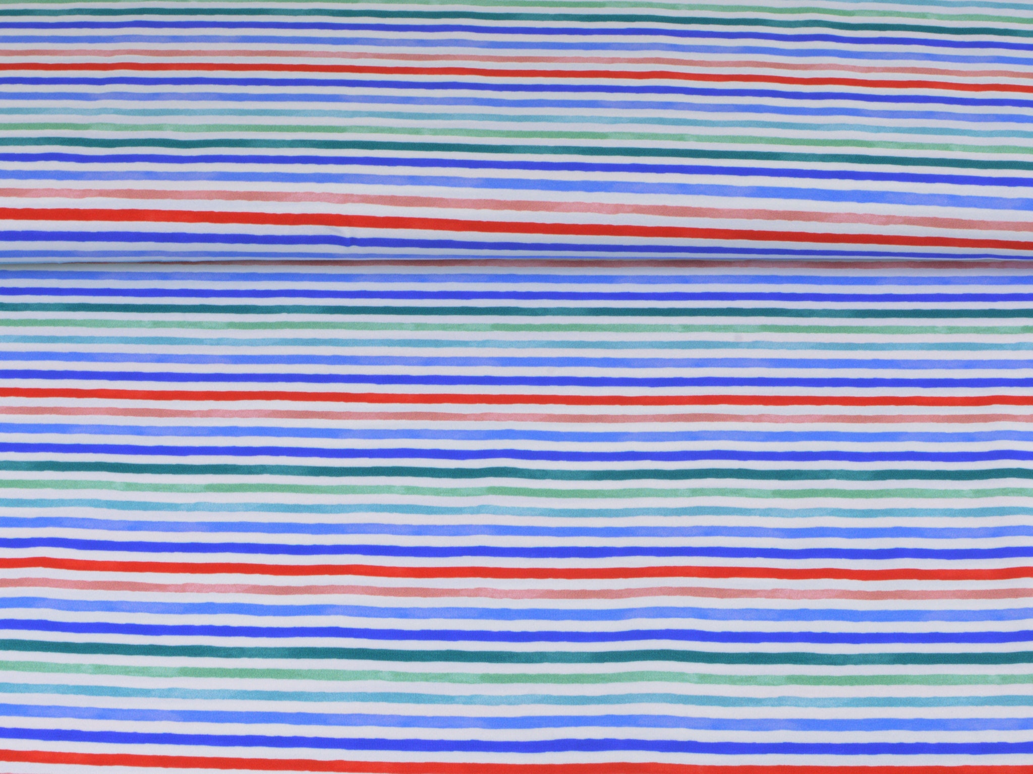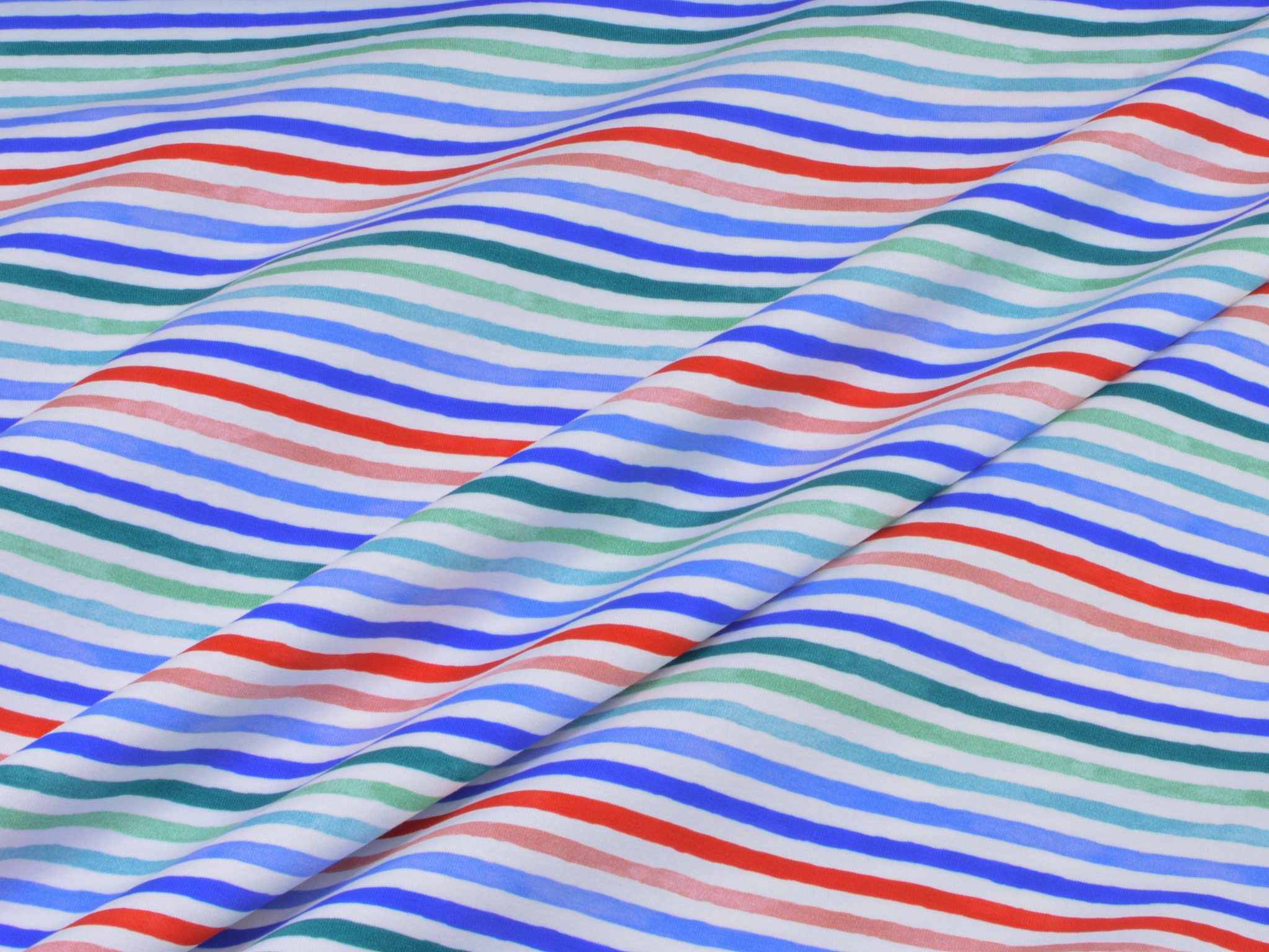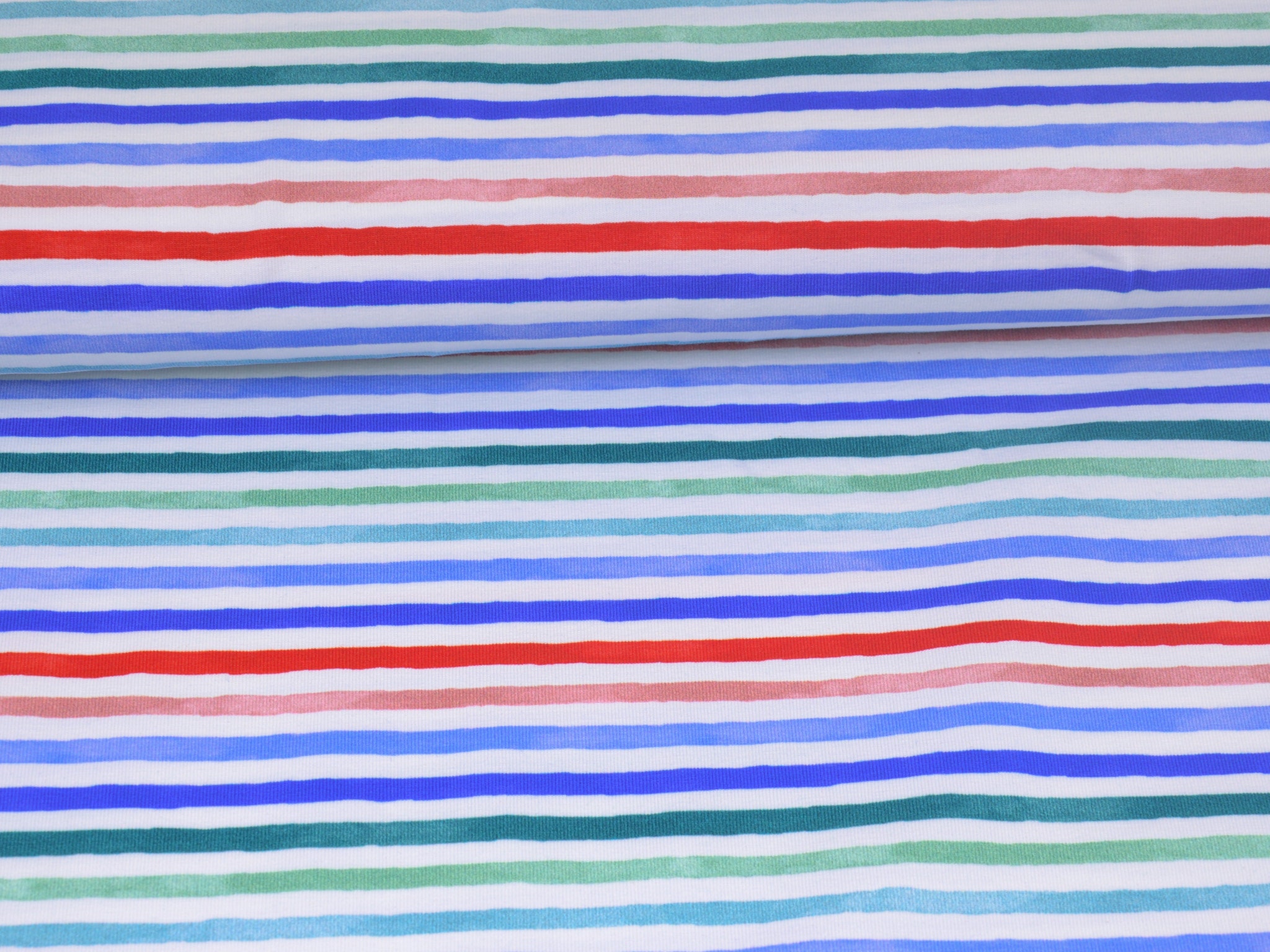 Hochwertiger Jersey aus Baumwolle von Hilco. Der Stoff ist weiß mit roten, blauen und grünen Streifen. Er ist glatt und fühlt sich gut an. Nähe dir daraus T-Shirts, Kleider, Röcke und vieles mehr.