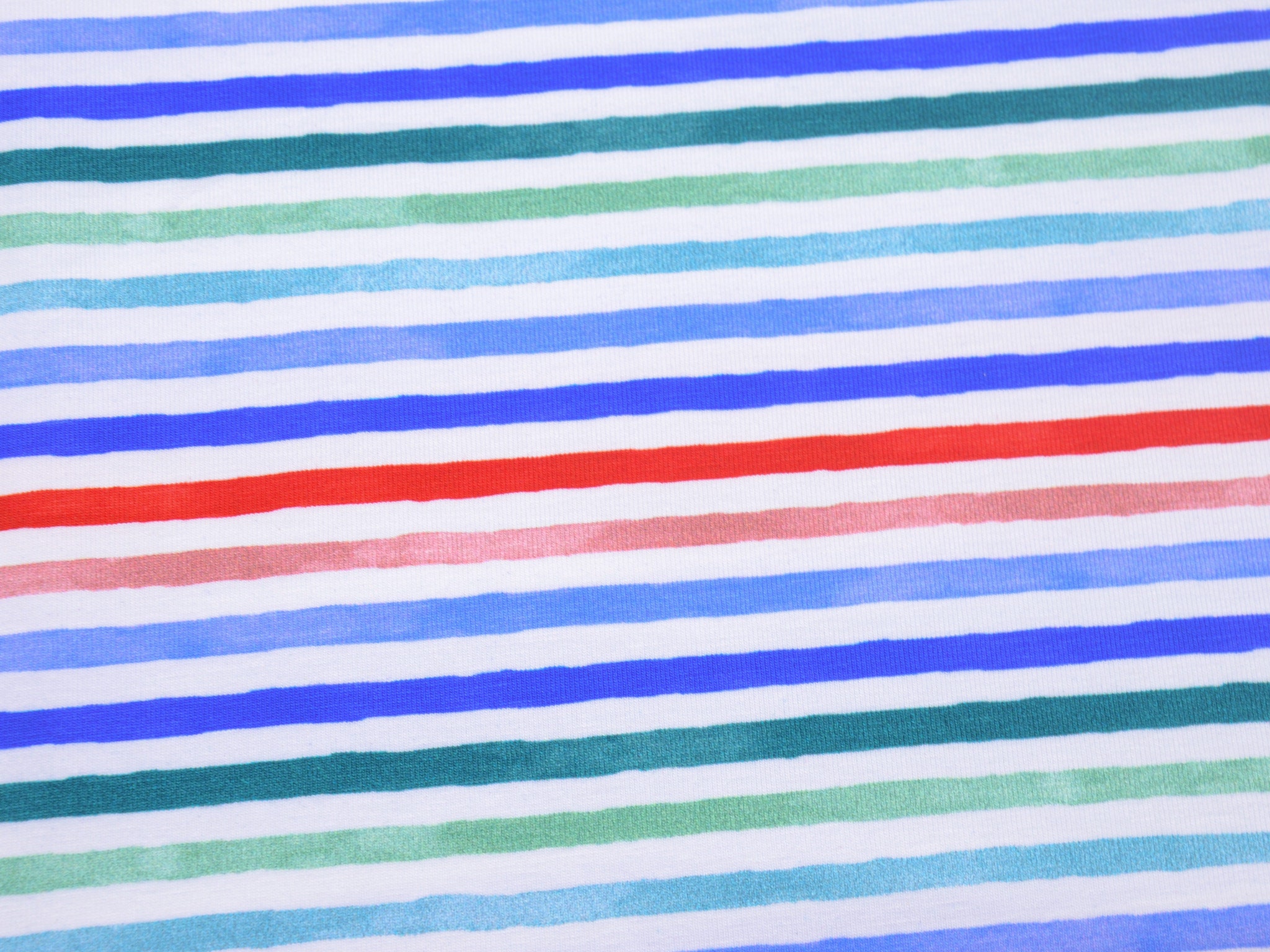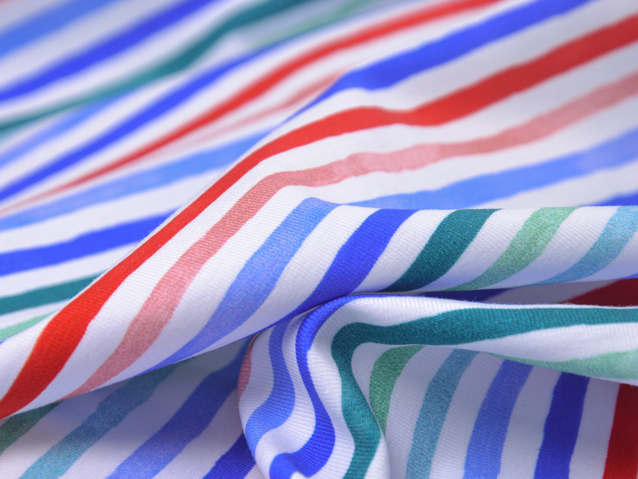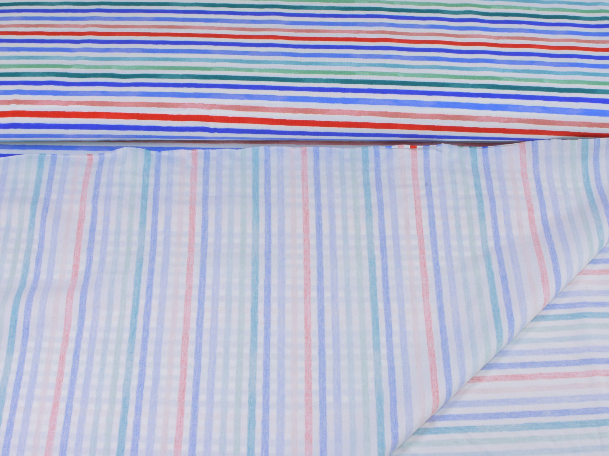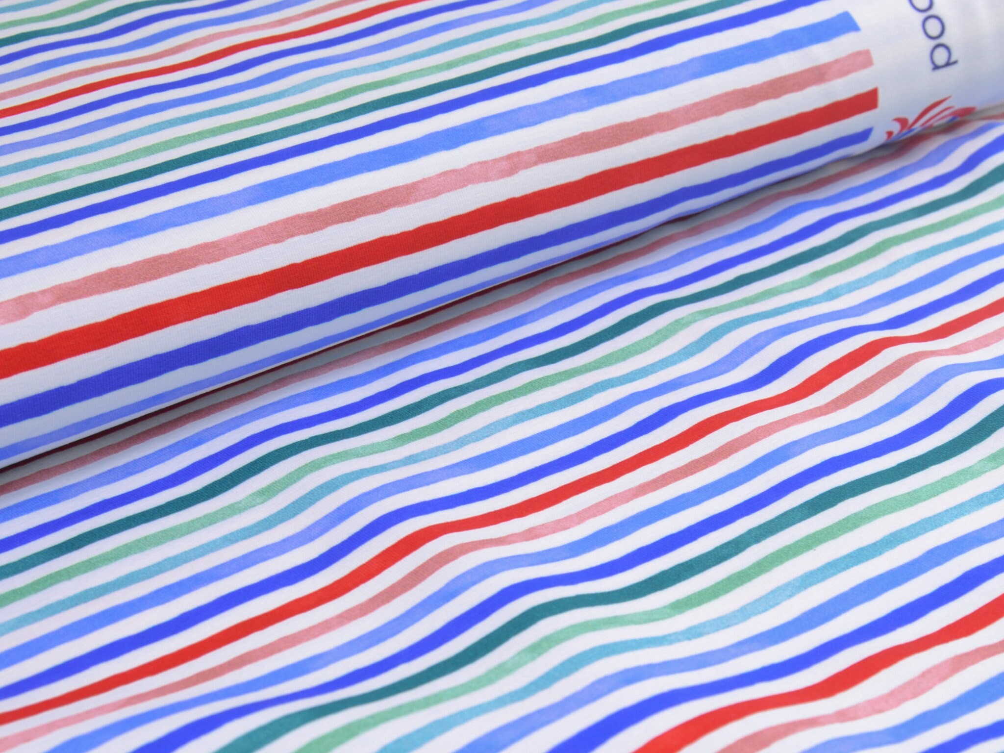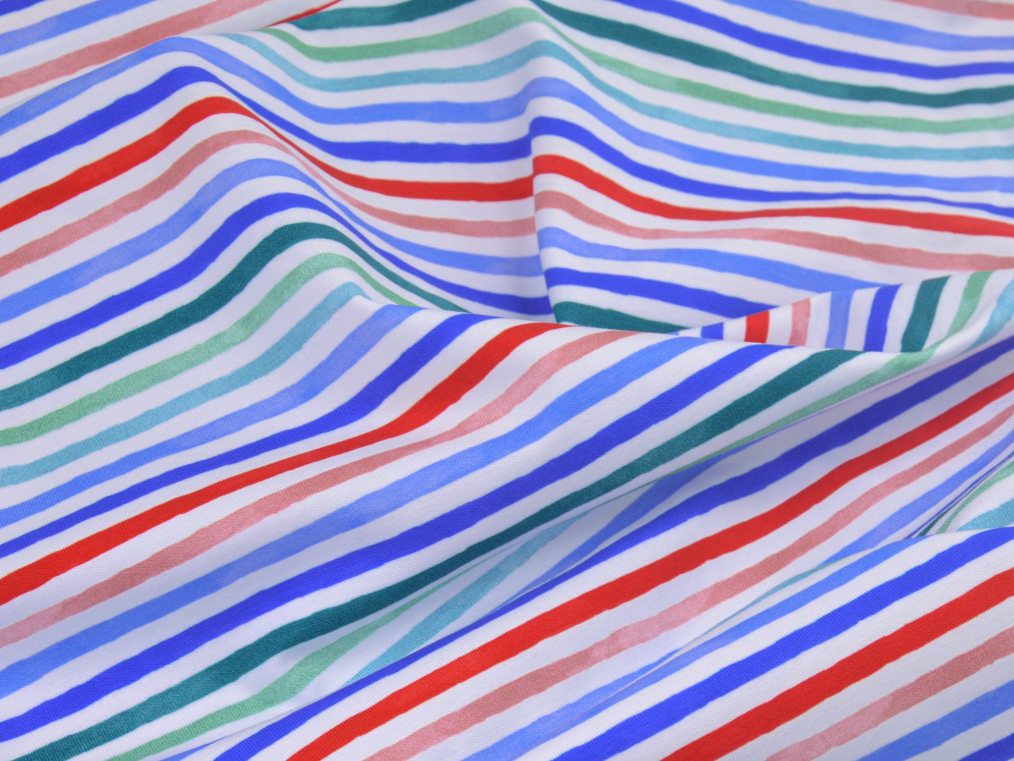 Hochwertiger Jersey aus Baumwolle von Hilco. Der Stoff ist weiß mit roten, blauen und grünen Streifen. Er ist glatt und fühlt sich gut an. Nähe dir daraus T-Shirts, Kleider, Röcke und vieles mehr.