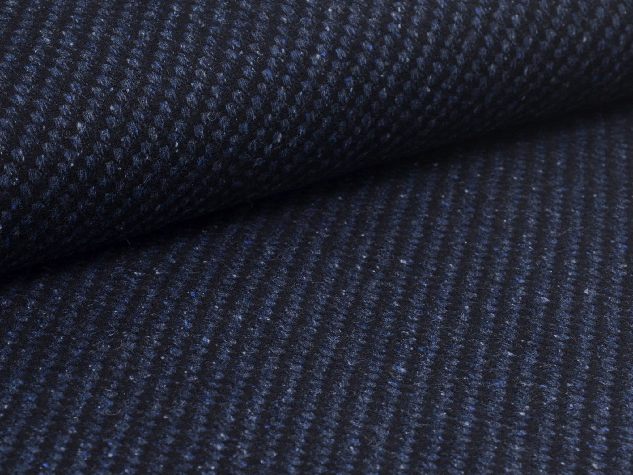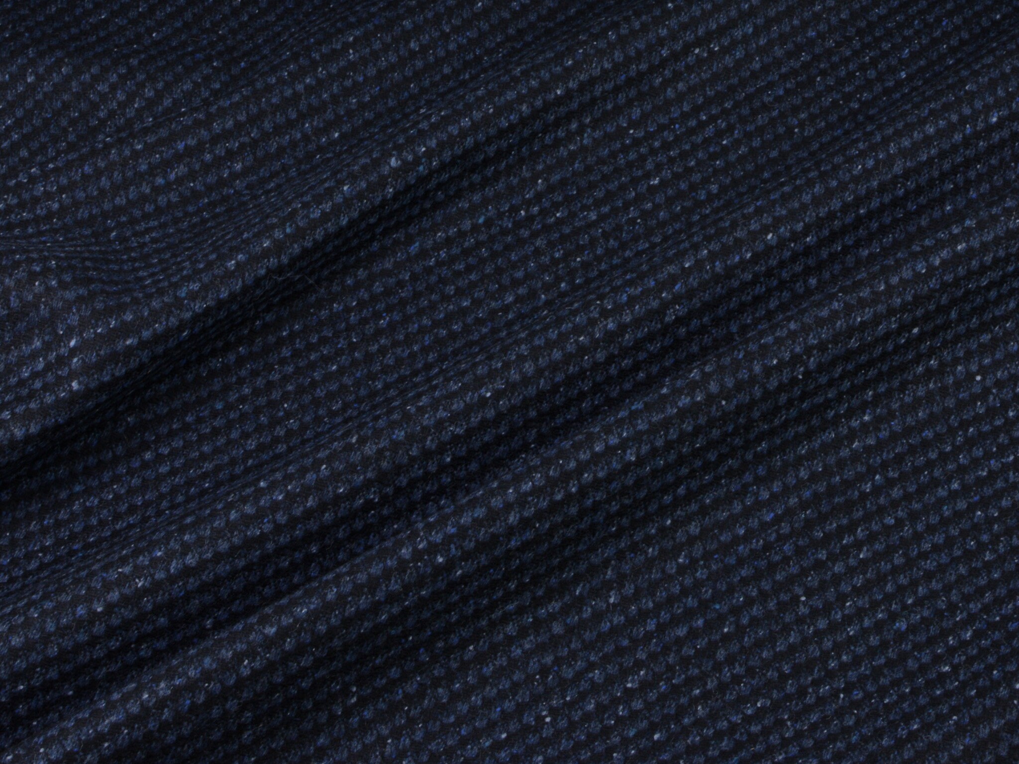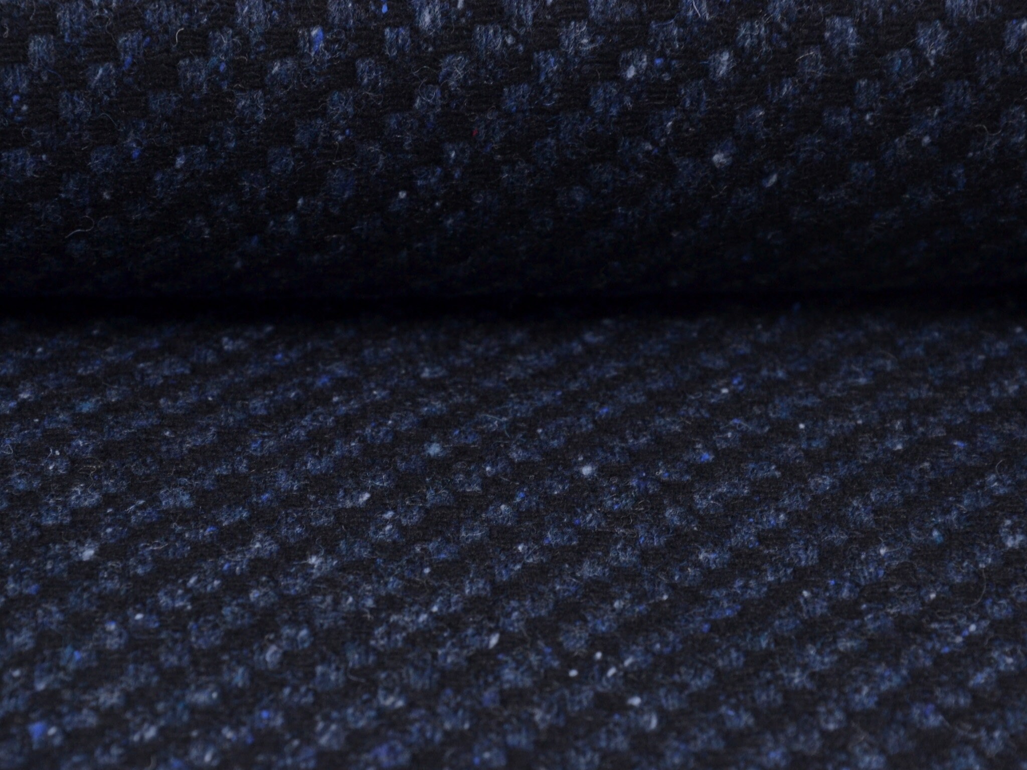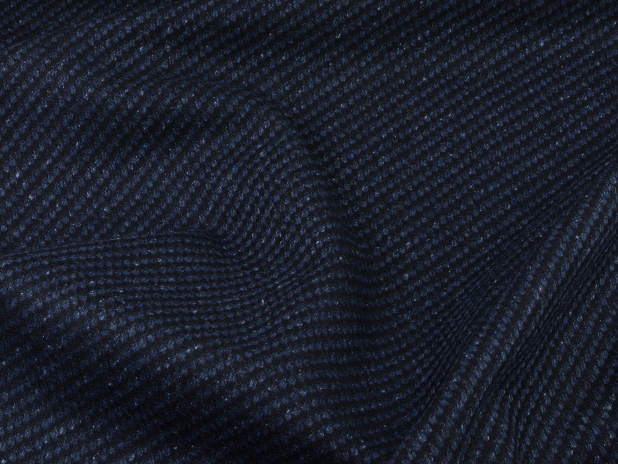 Thin fabric made of wool, cotton, viscose, and polyester. The fabric features a black and blue pattern. It's non-stretchy and feels soft. You can sew great dresses, skirts, trousers, business looks, and much more with it.