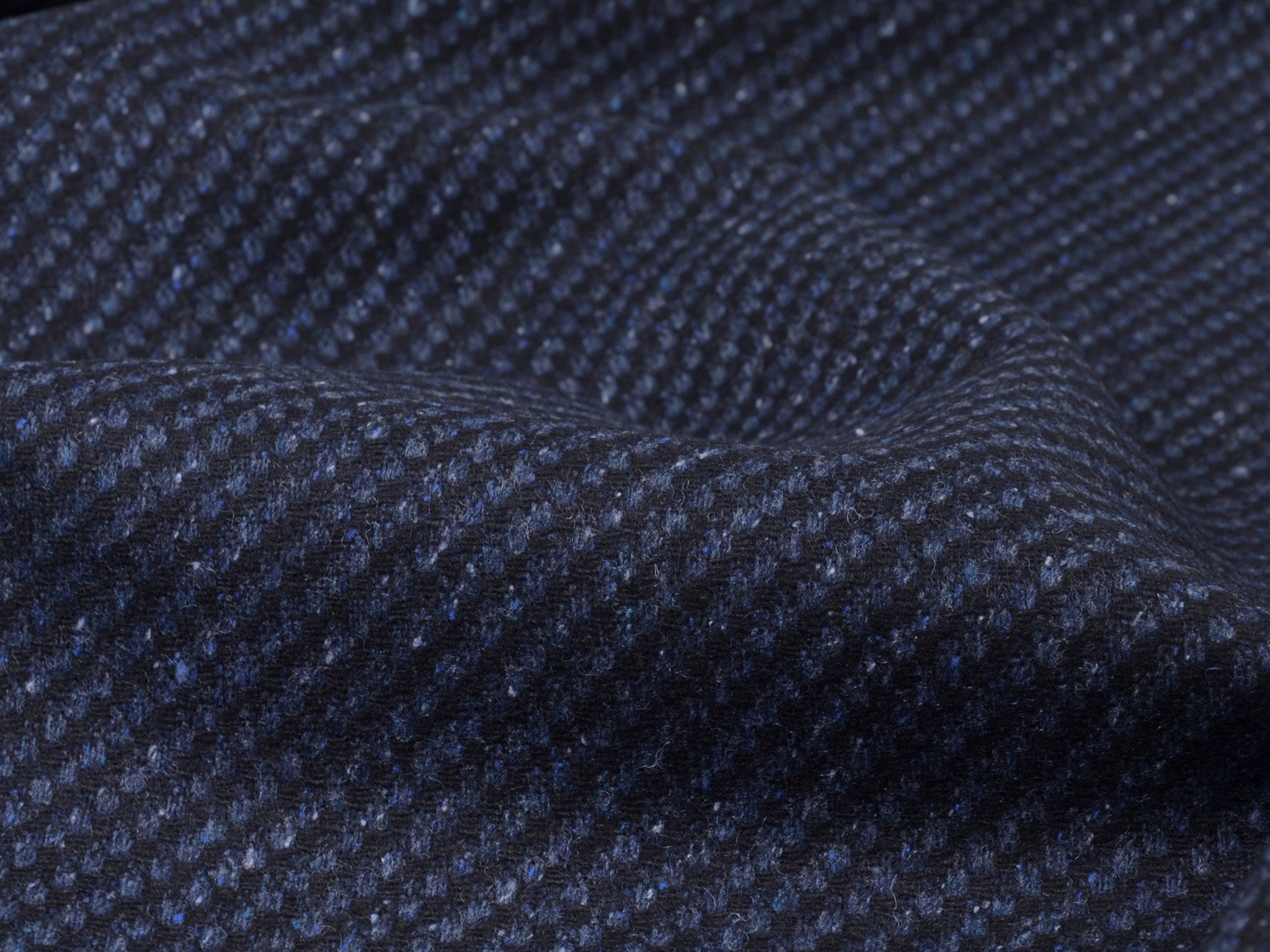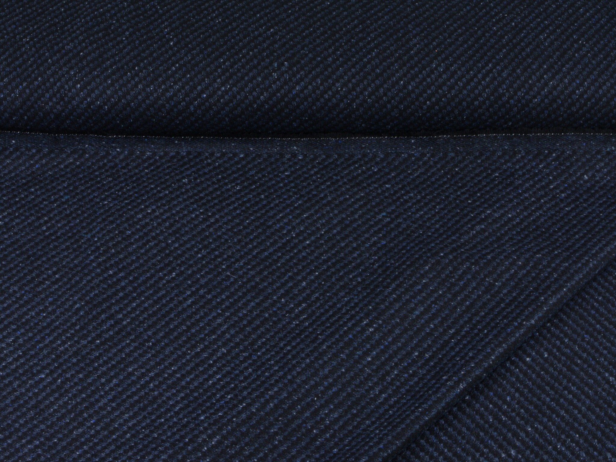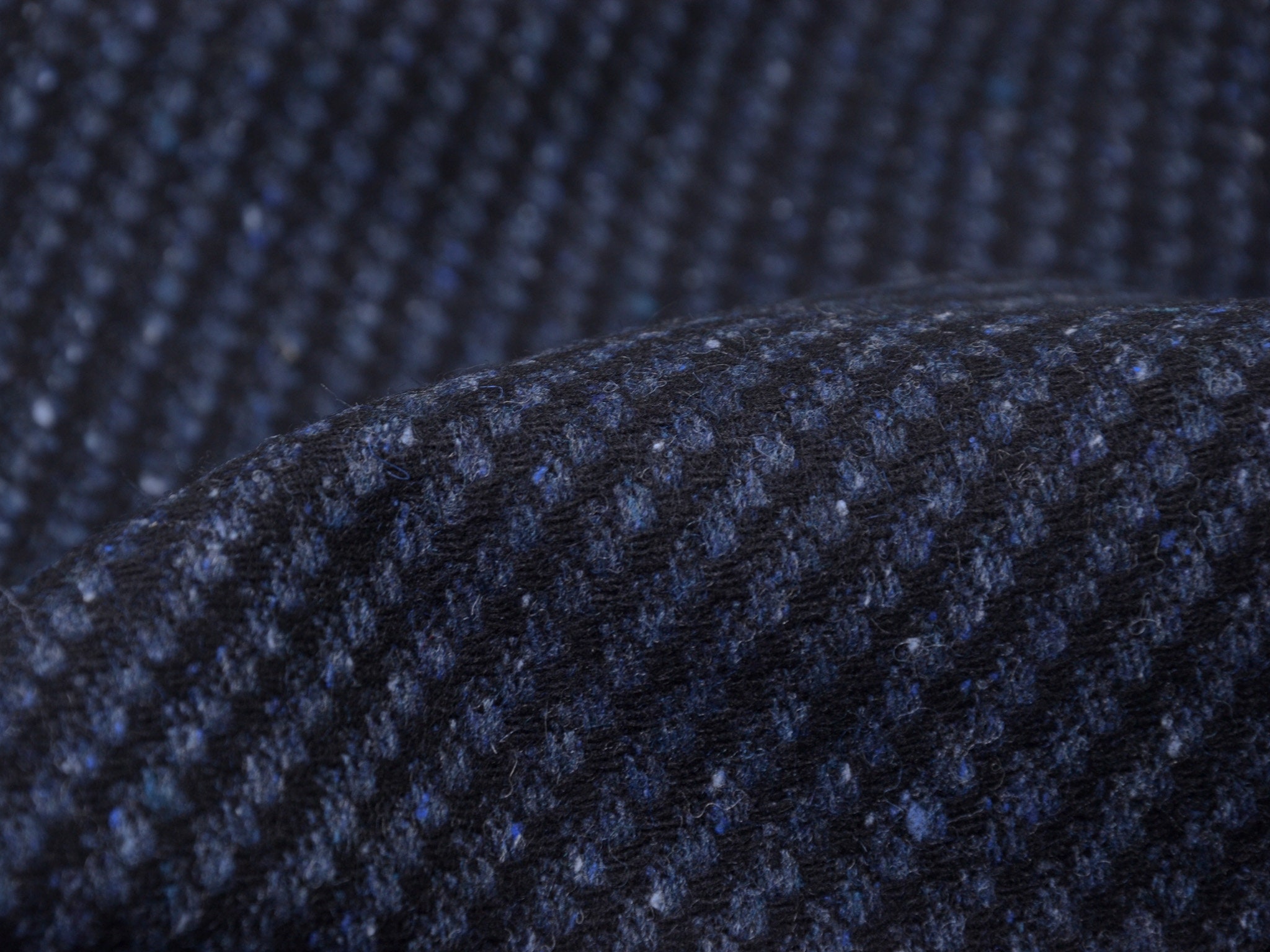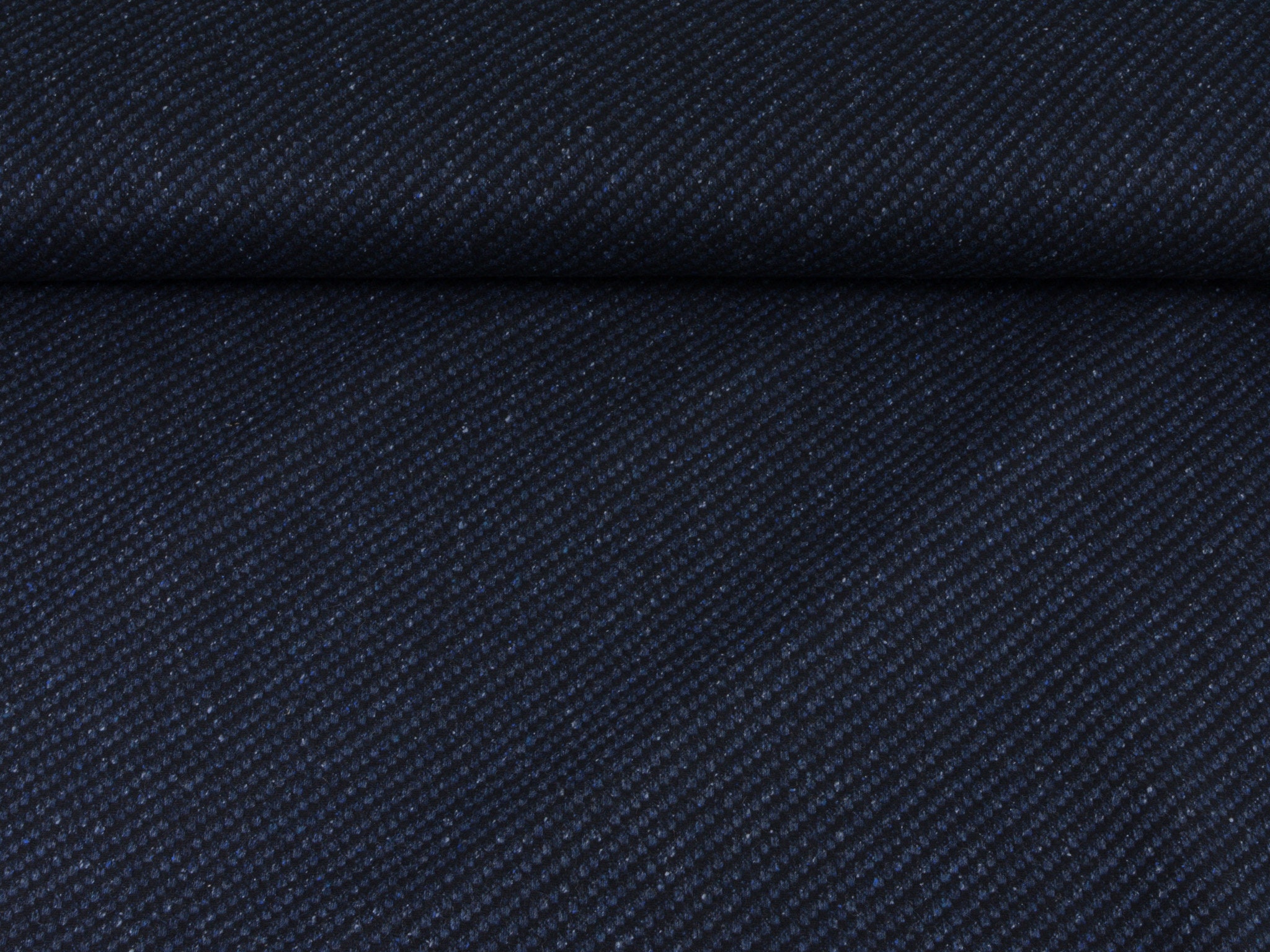 Thin fabric made of wool, cotton, viscose, and polyester. The fabric features a black and blue pattern. It's non-stretchy and feels soft. You can sew great dresses, skirts, trousers, business looks, and much more with it.