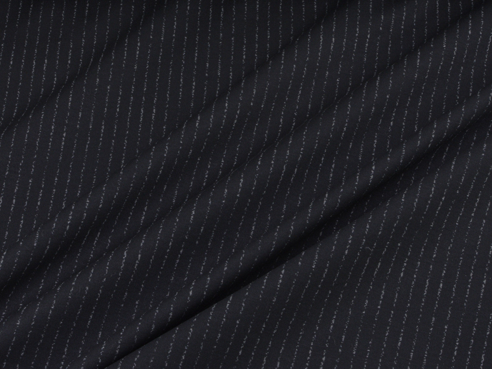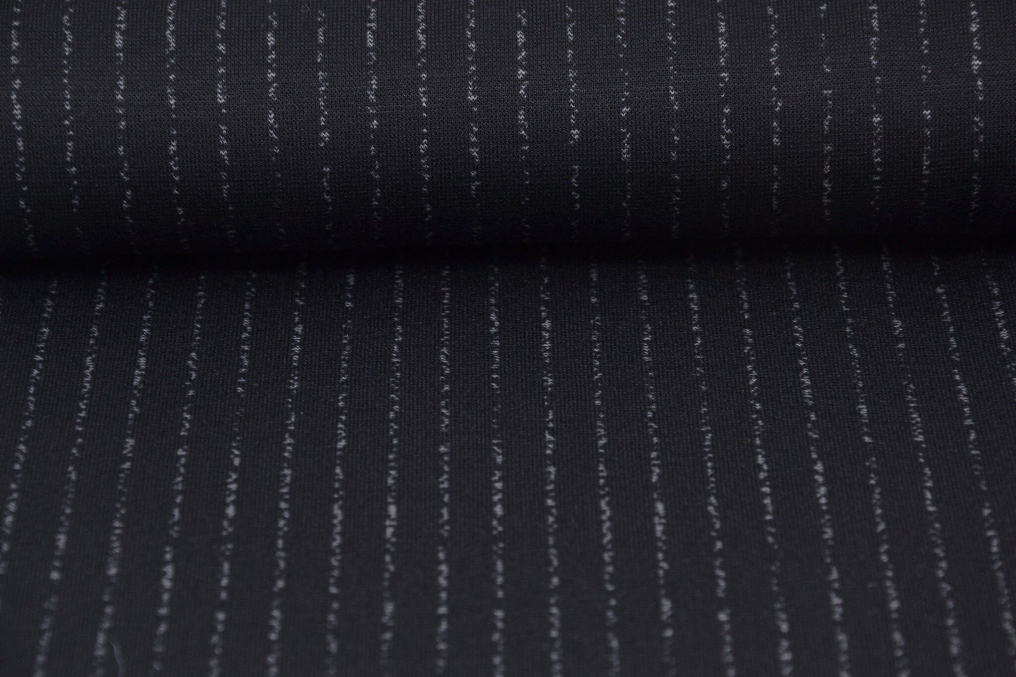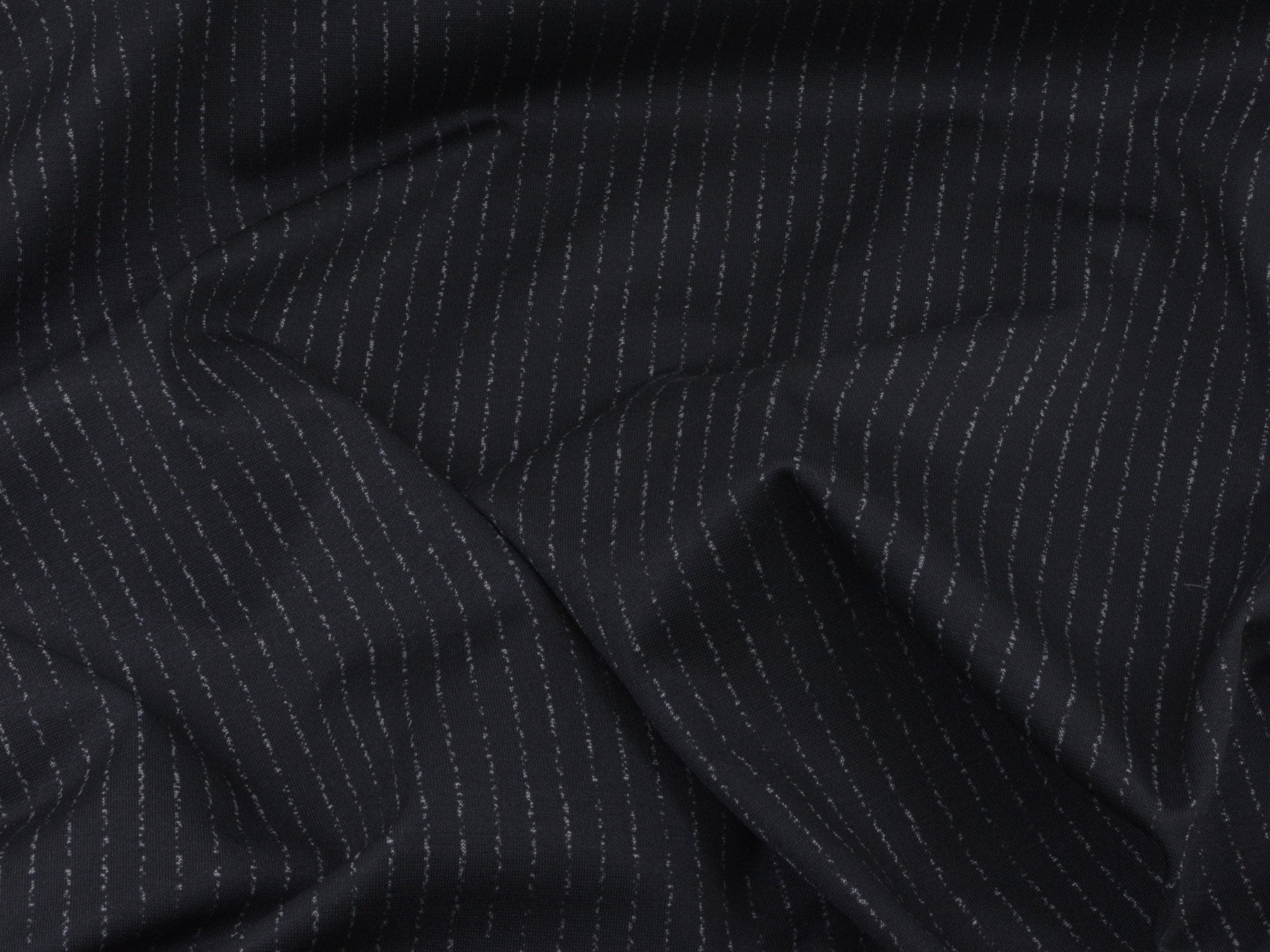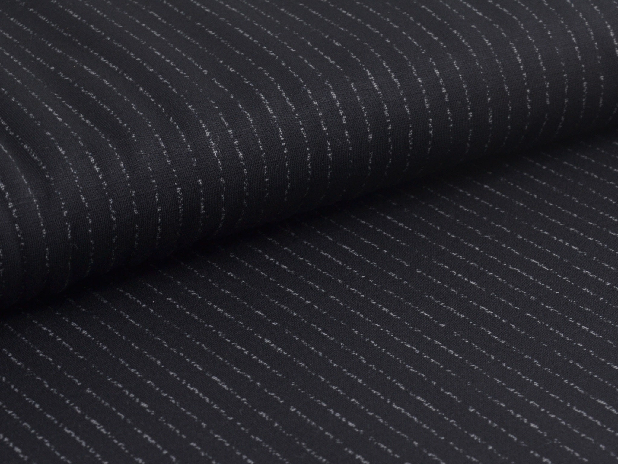 Fester Jersey in schwarz mit hellgrauen Streifen, Nadelstreifen. Der Stoff ist in beide Richtungen elastisch. Du kannst daraus tolle Hosen, Röcke, Kleider und vieles mehr nähen.