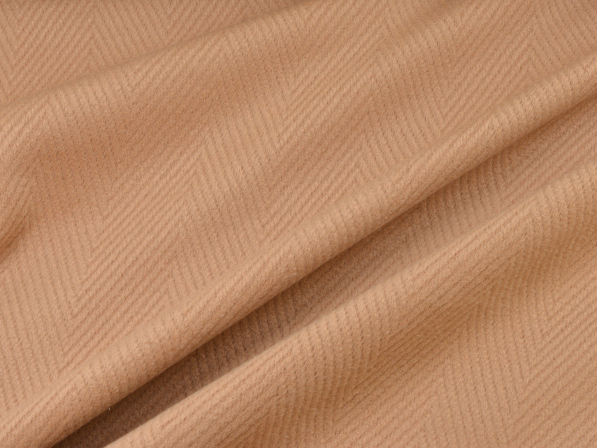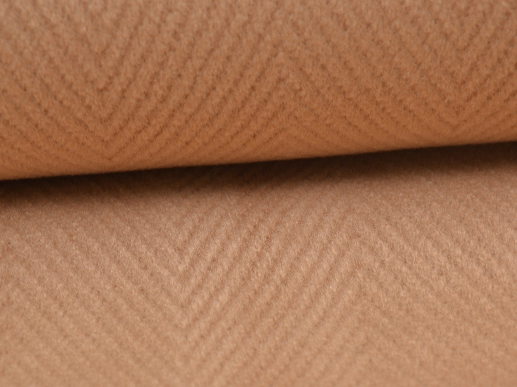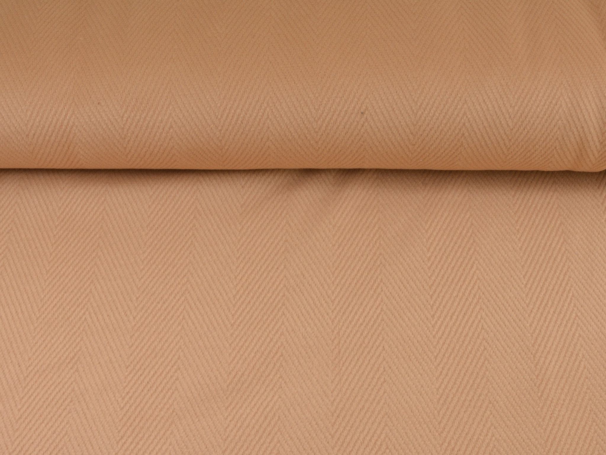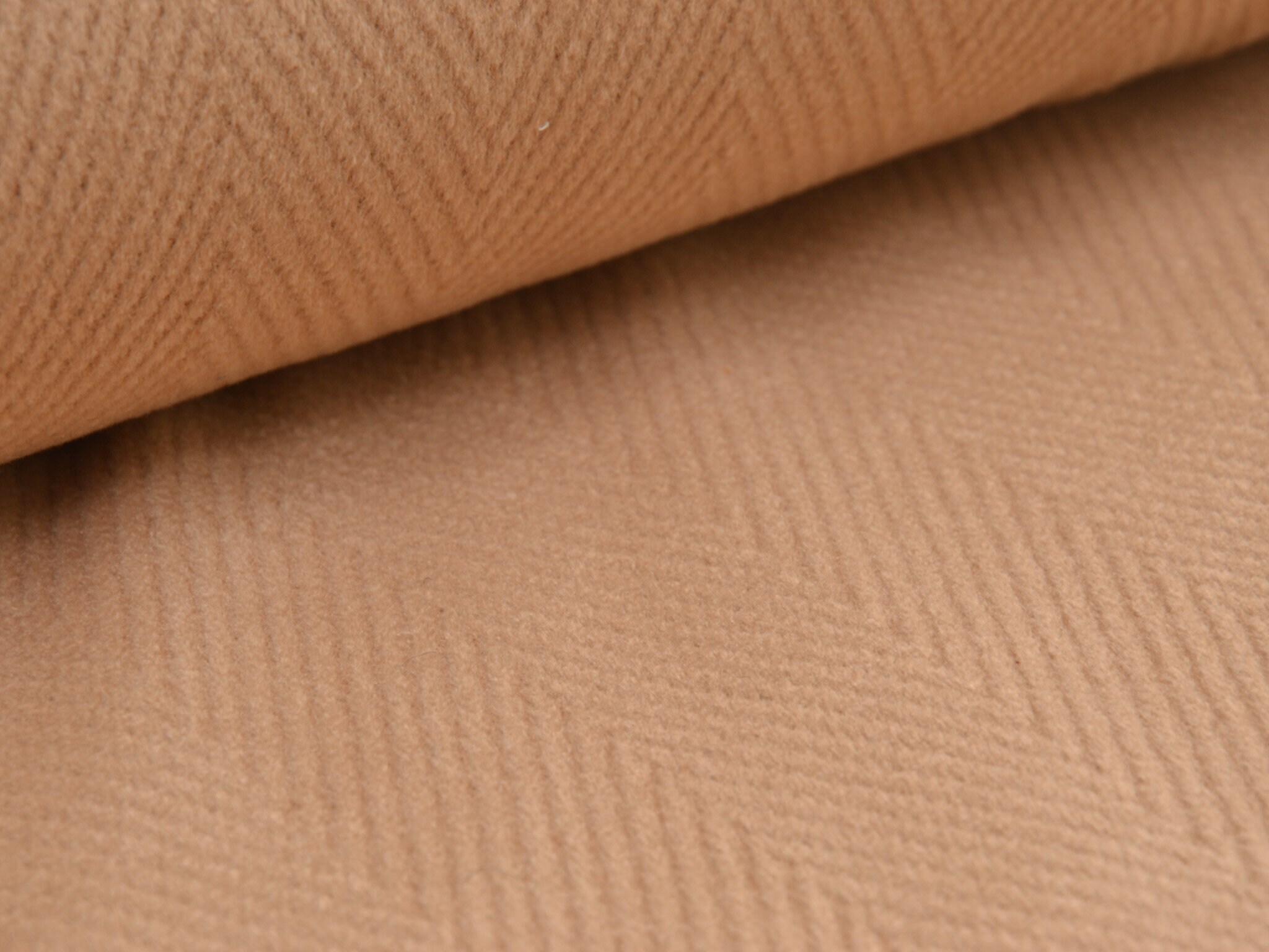 Hochwertiger Mantelstoff aus Wolle in beige. Der feste Strickstoff zeigt ein Fischgratmuster mit Flor. Du kannst daraus Jacken, Mäntel und vieles mehr nähen.