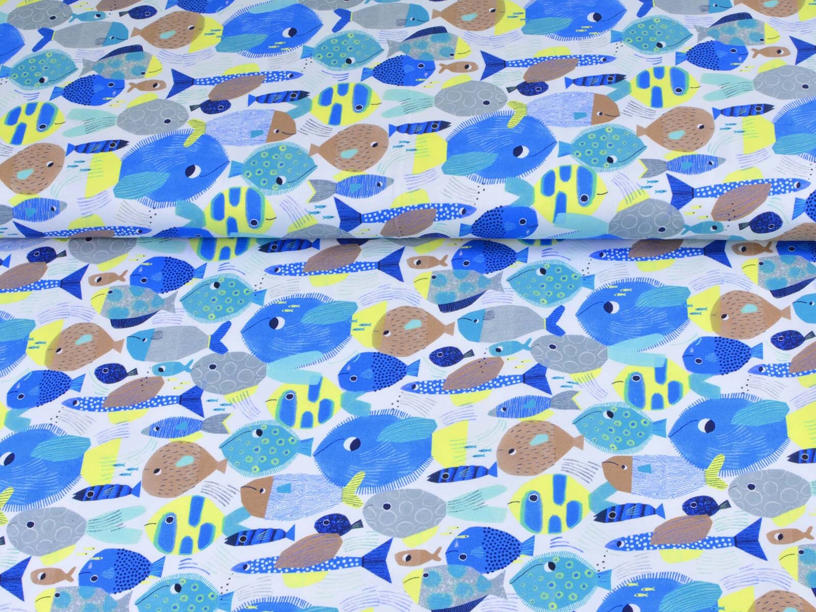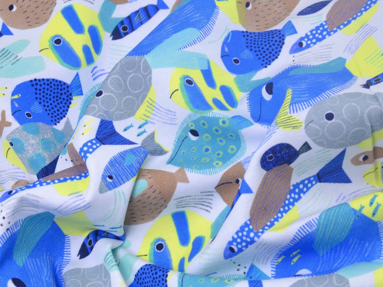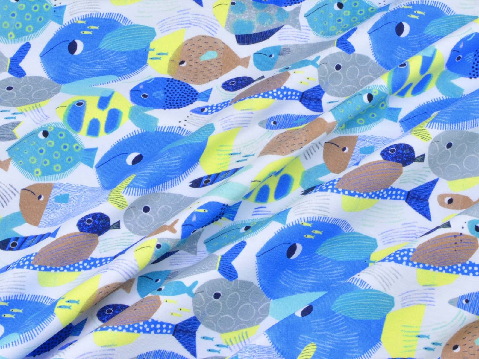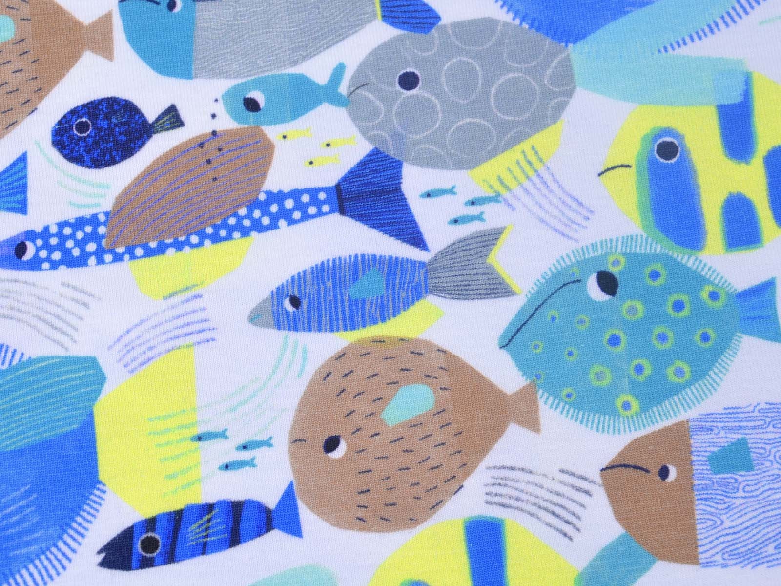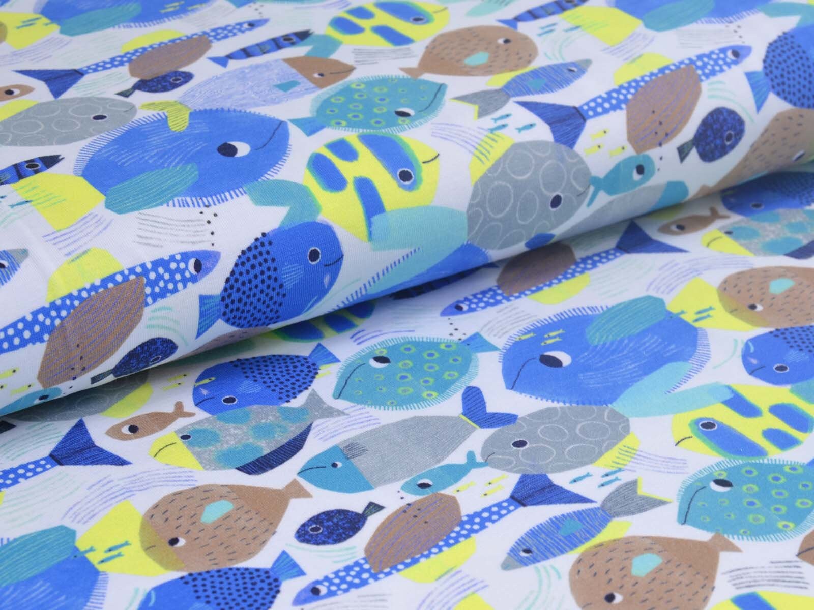 Toller Baumwoll-Jeresy von Katia. Der Stoff mit blauen Fischen ist perfekt geeignet um T-Shirts, Kleider, Hosen und Röcke zu Nähen.