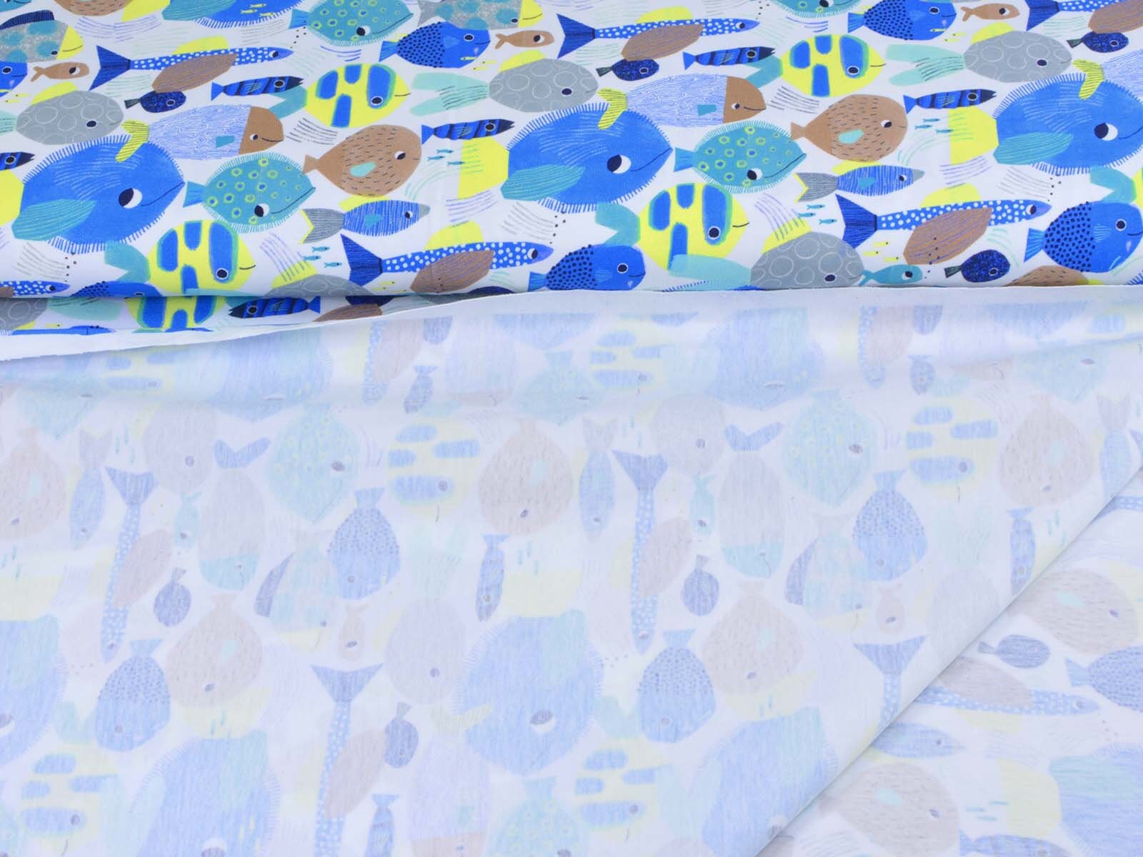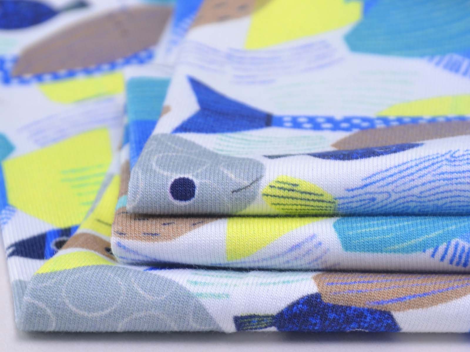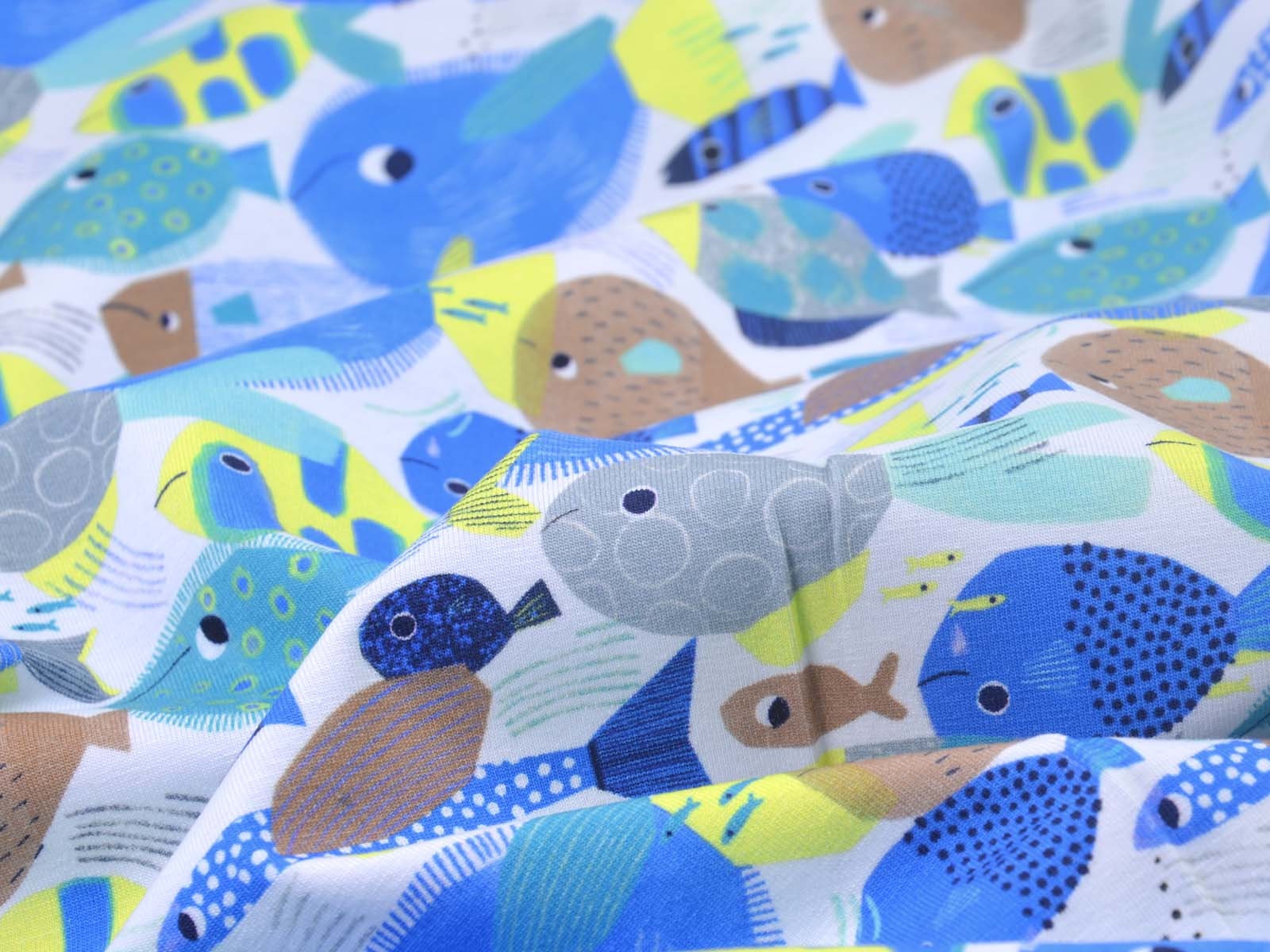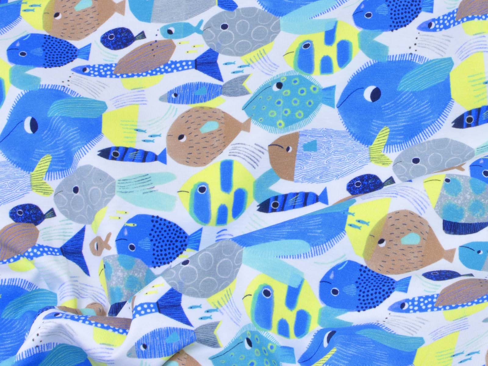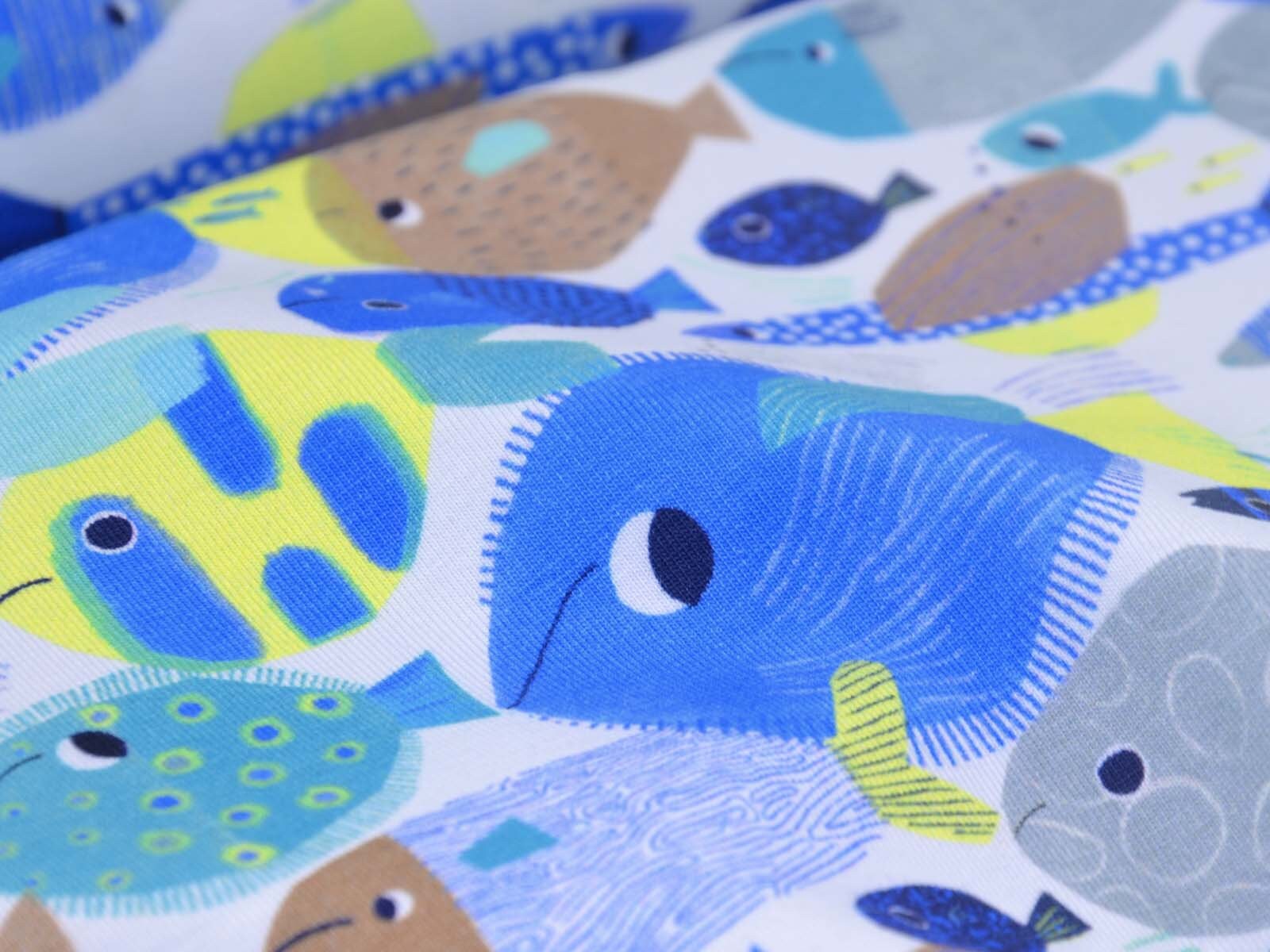 Toller Baumwoll-Jeresy von Katia. Der Stoff mit blauen Fischen ist perfekt geeignet um T-Shirts, Kleider, Hosen und Röcke zu Nähen.