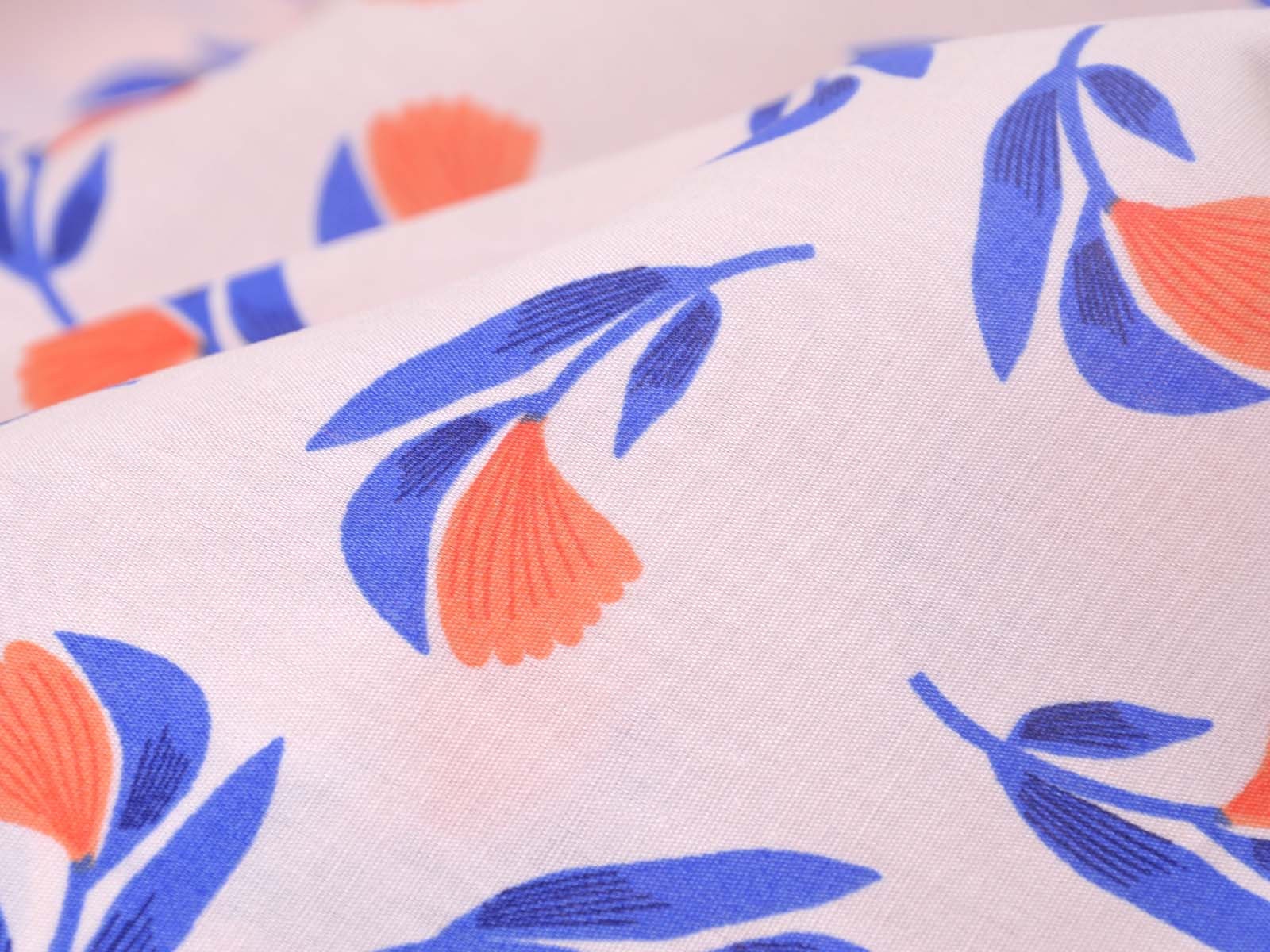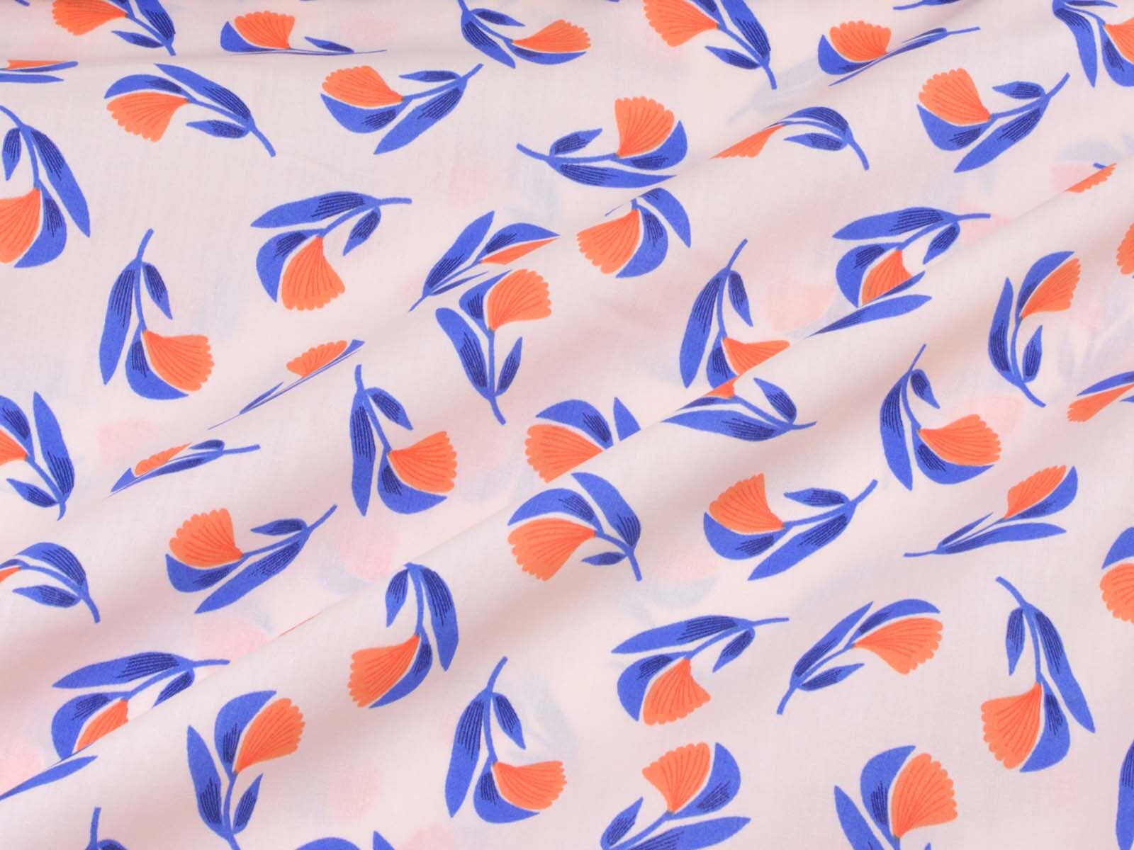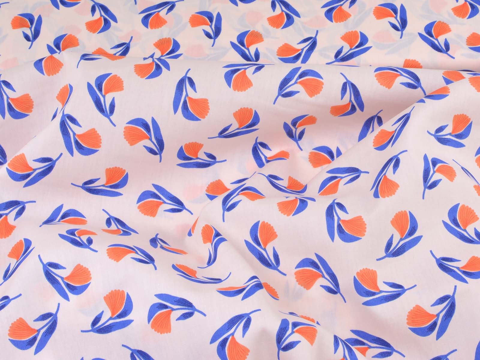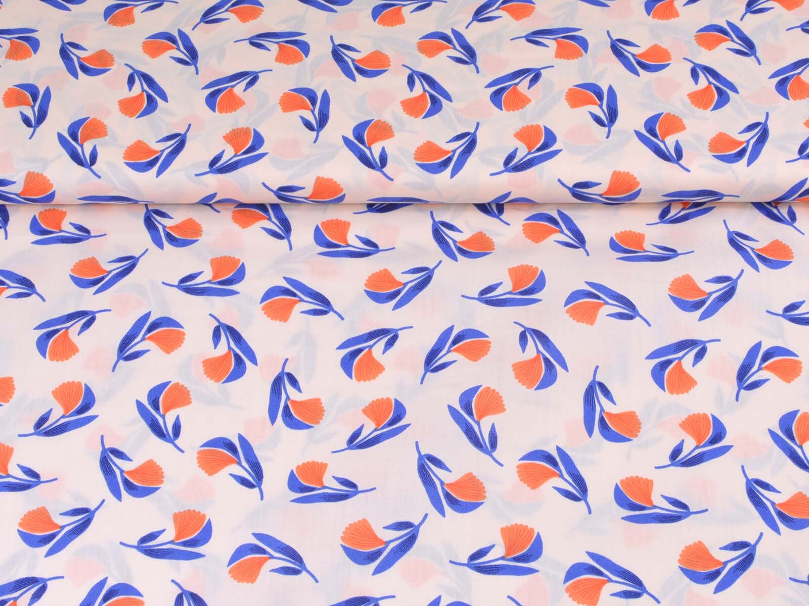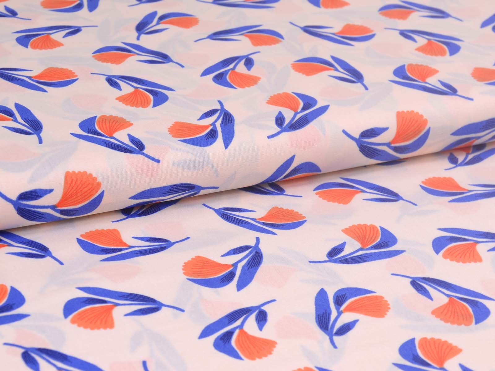 Hochwertiger Baumwoll-Popeline. Der Stoff zeigt Abstrakte Blumen in orange und blau. Er ist glatt und matt. Nähe dir aus dem Popeline Kleider, Röcke und Hemden. Der Stoff eignet sich auch zum Nähen von Kissen, Utensilos, Taschen und vielem mehr.
