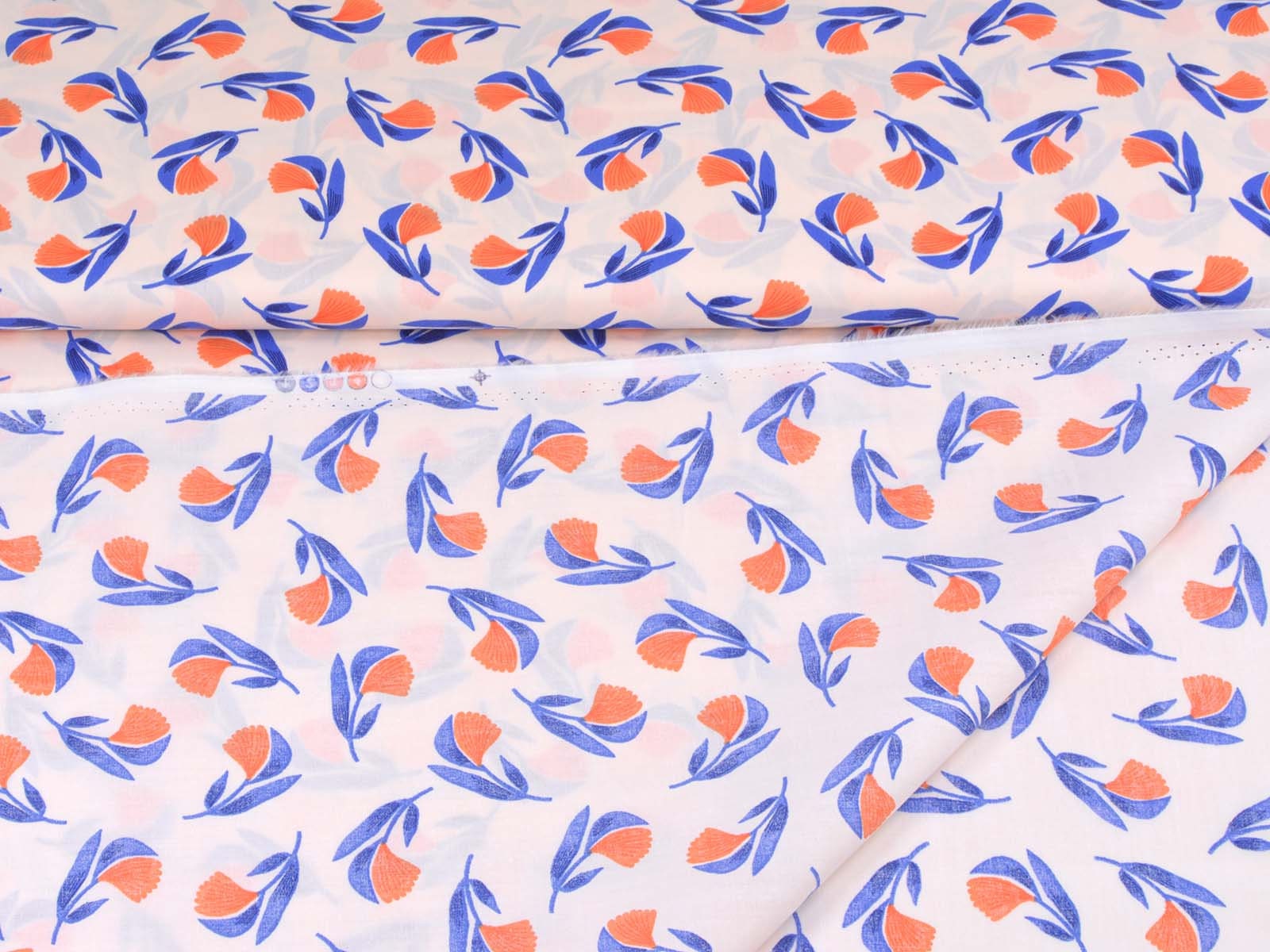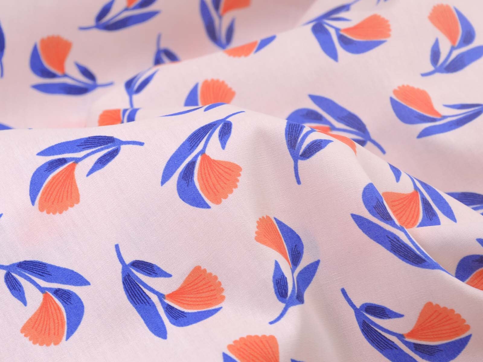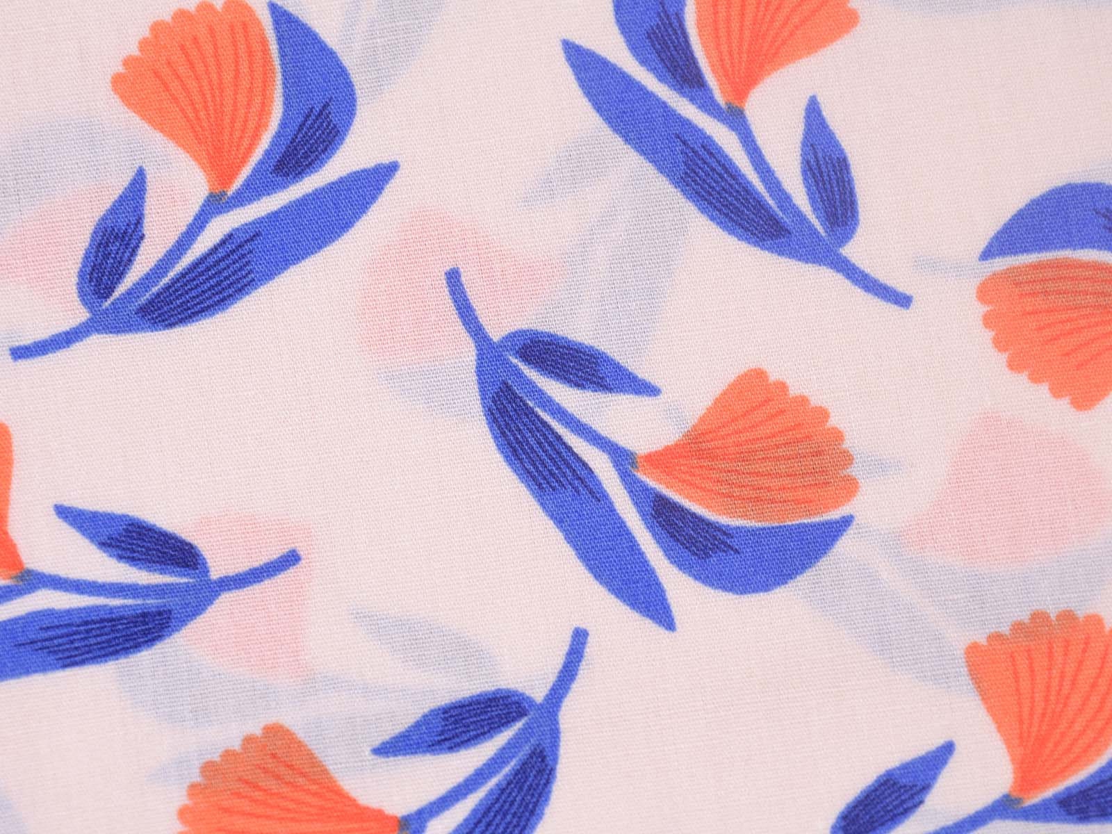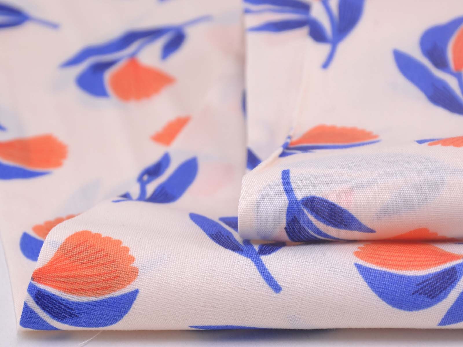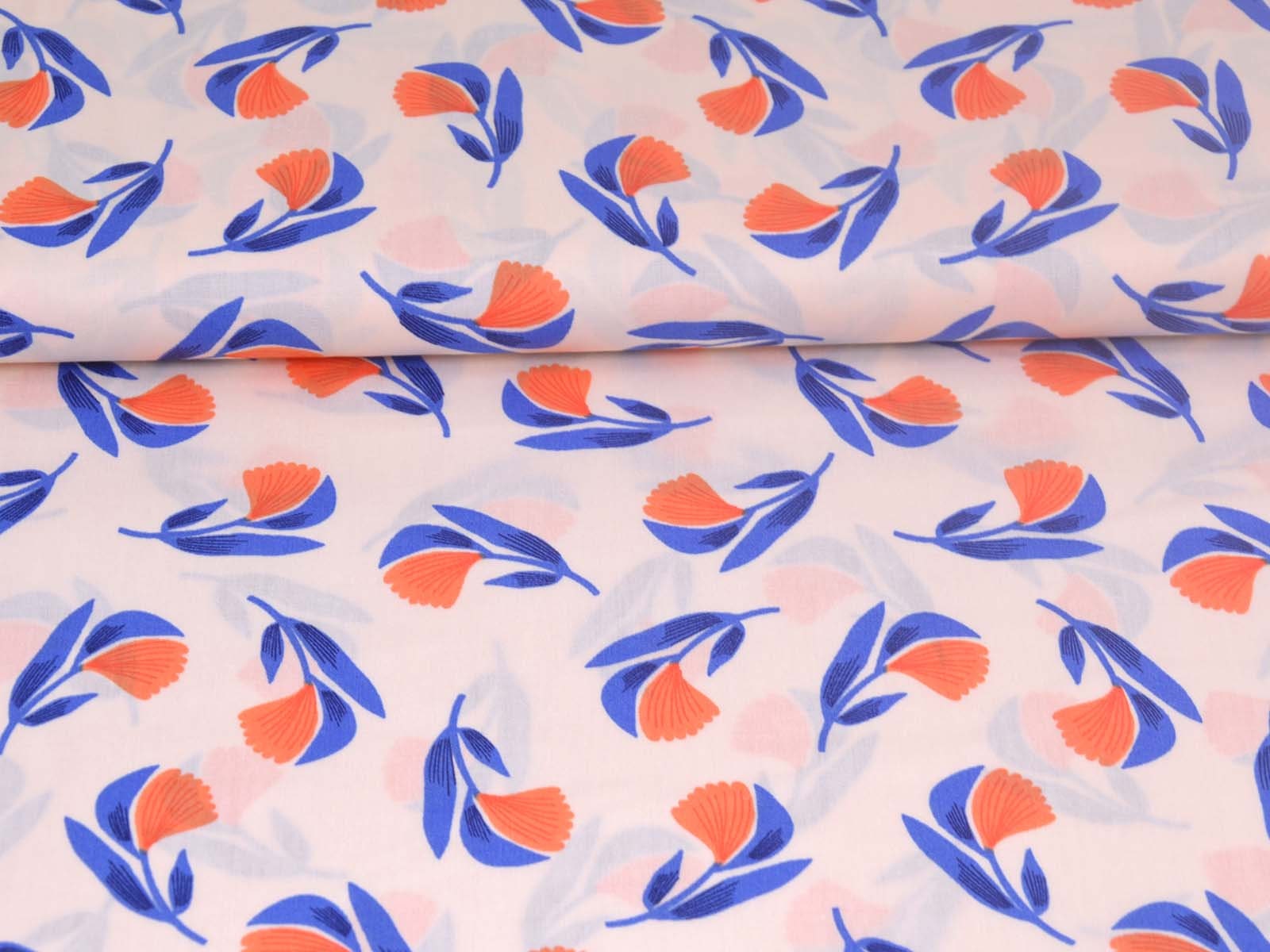 Hochwertiger Baumwoll-Popeline. Der Stoff zeigt Abstrakte Blumen in orange und blau. Er ist glatt und matt. Nähe dir aus dem Popeline Kleider, Röcke und Hemden. Der Stoff eignet sich auch zum Nähen von Kissen, Utensilos, Taschen und vielem mehr.