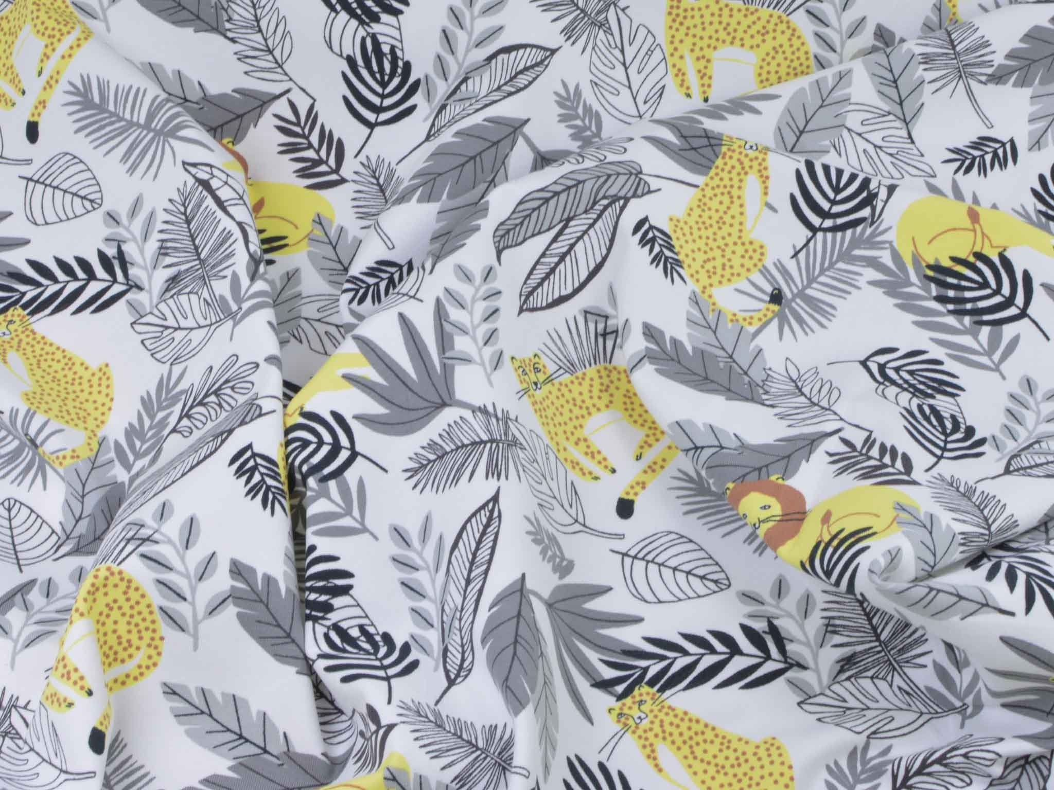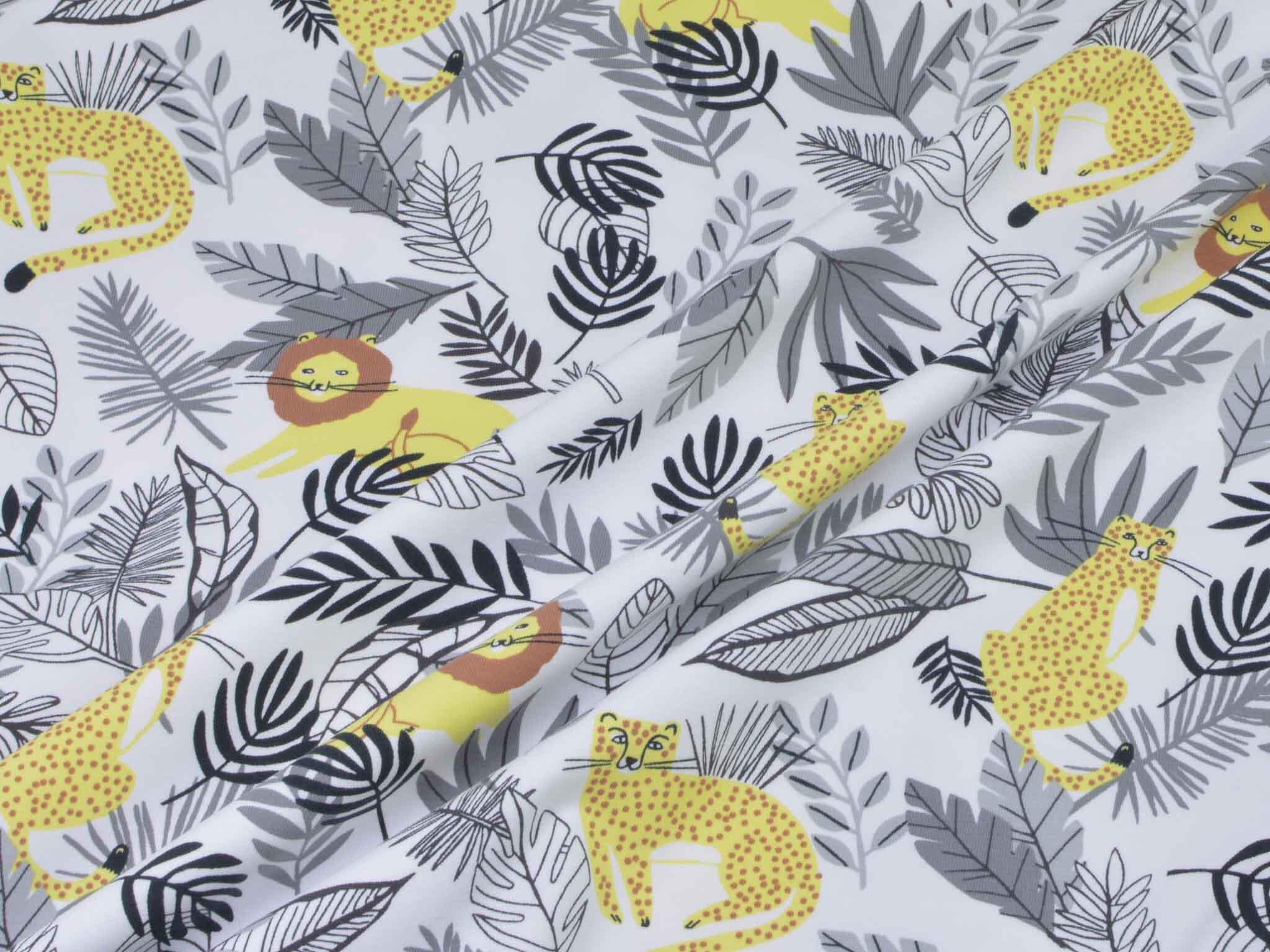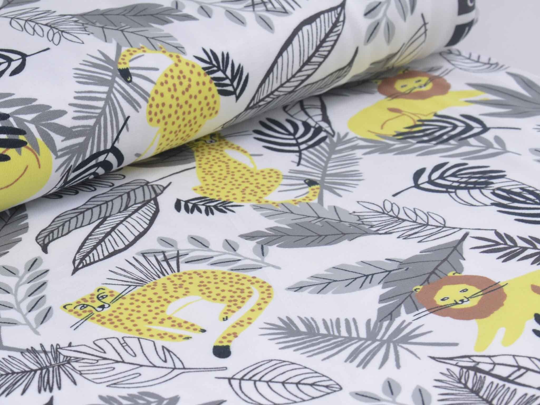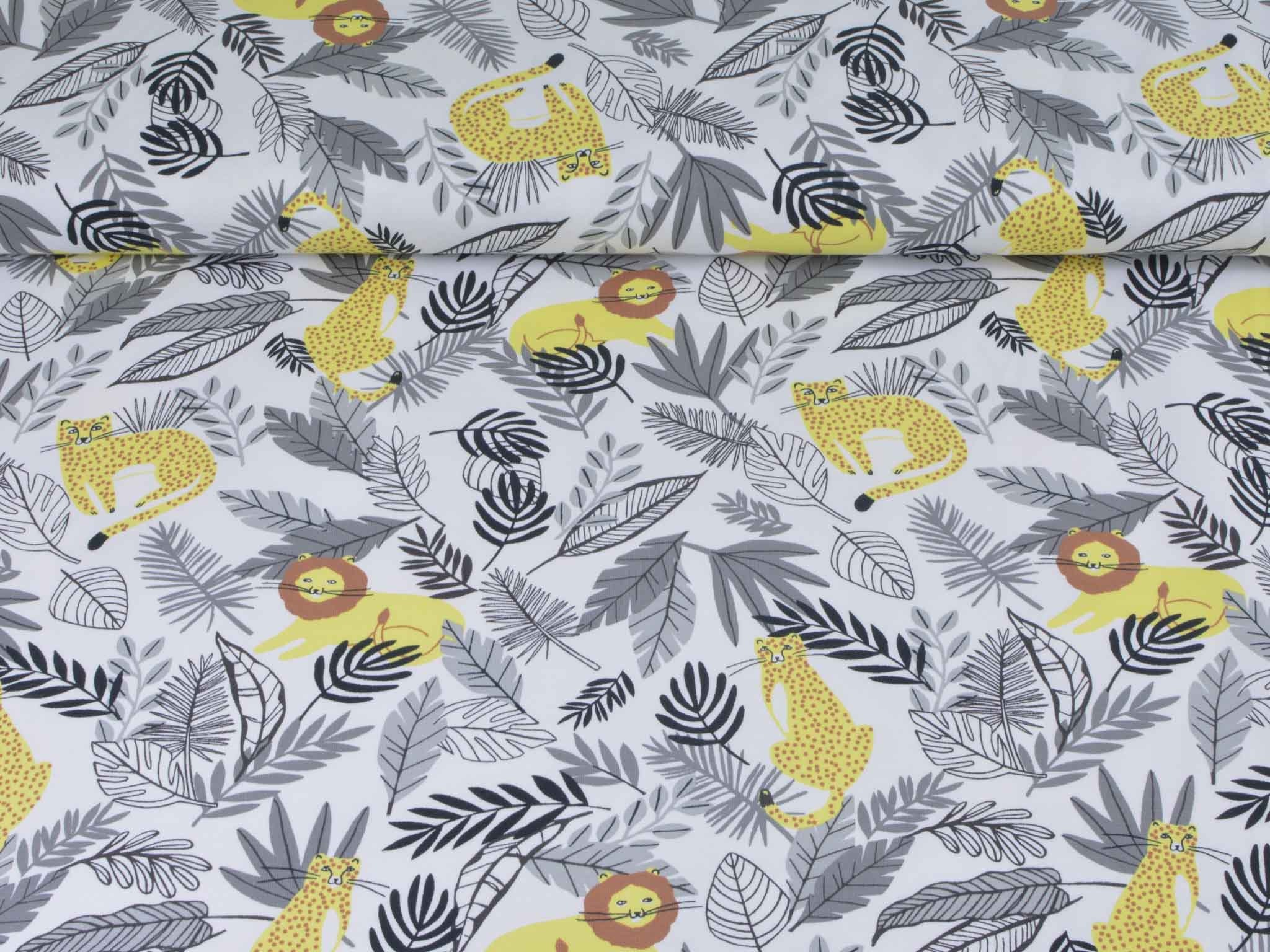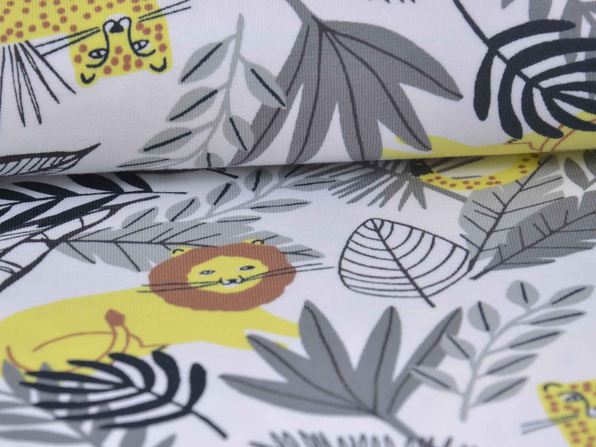 Toller Baumwoll-Jeresy von Katia. Der Stoff mit Löwen und Leoparden ist perfekt geeignet um T-Shirts, Kleider, Hosen und Röcke zu Nähen.