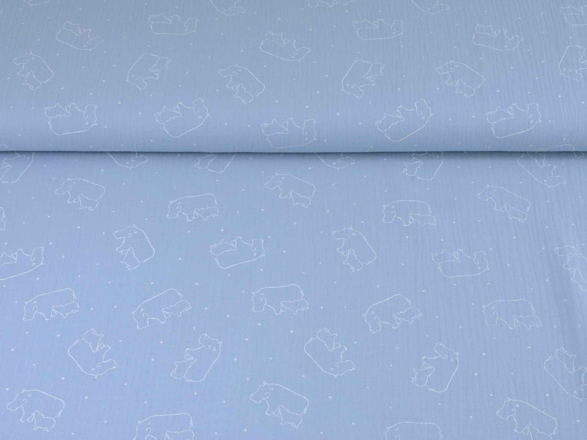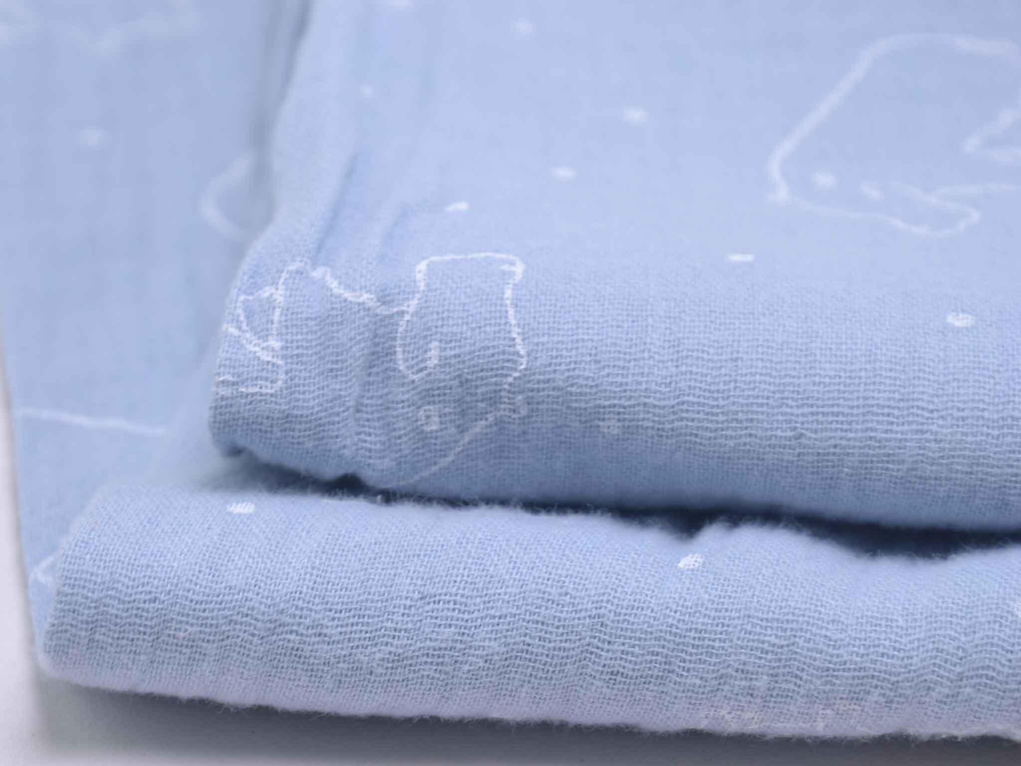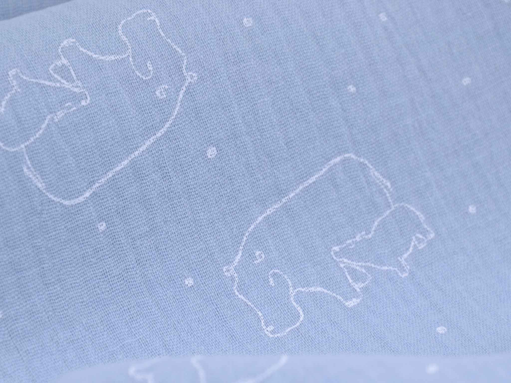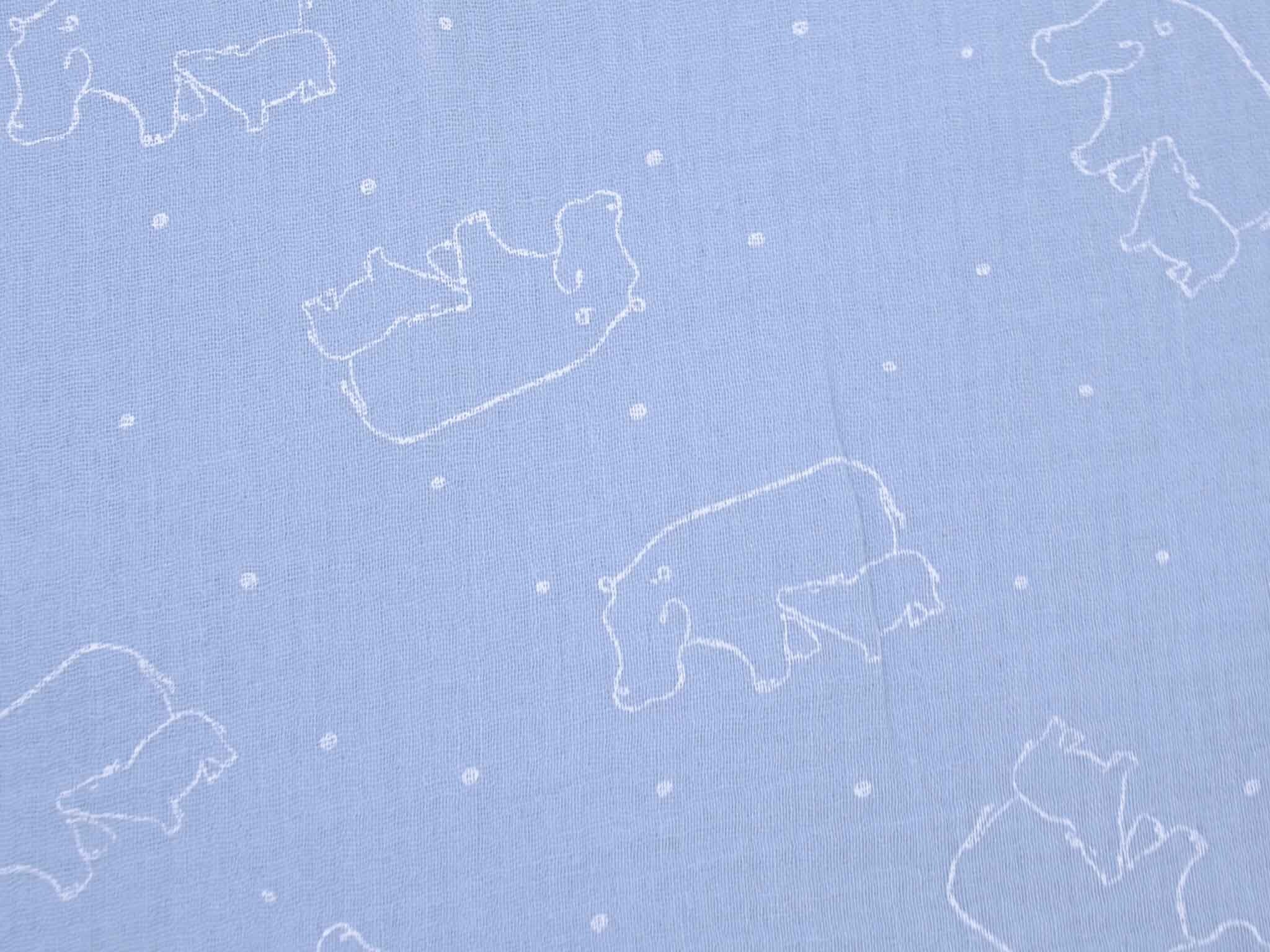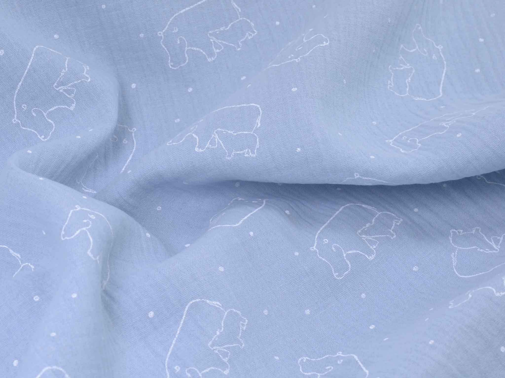 Musselin aus Baumwolle von Katia. Der Musselin ist hellblau mit weißen Nilpferden. Der Stoff ist dünn, fühlt sich sehr weich an und hat einen weichen Fall. Nähe dir daraus Kleider, Röcke, Hosen, Blusen, Kissen, Decken und vieles mehr.