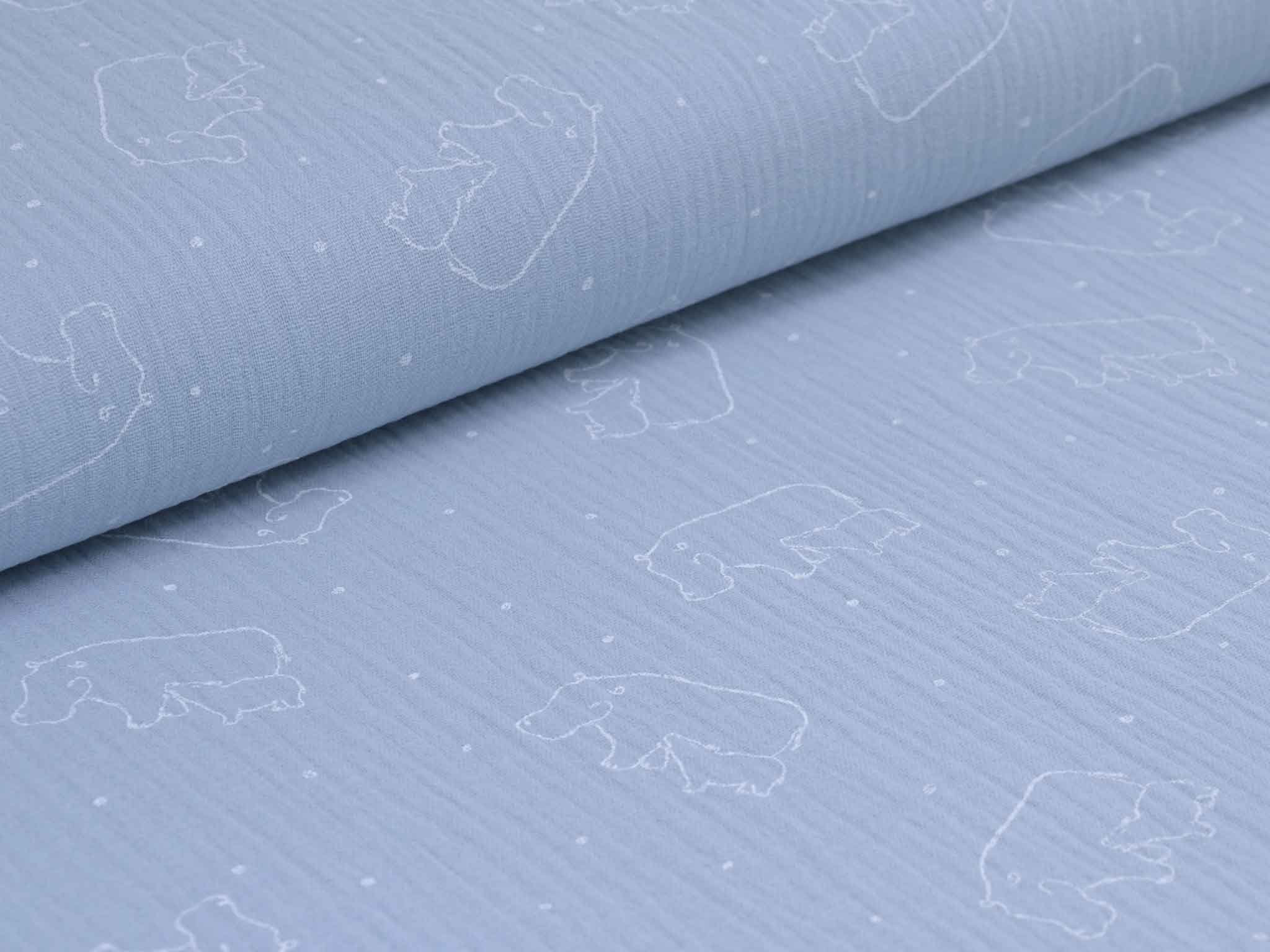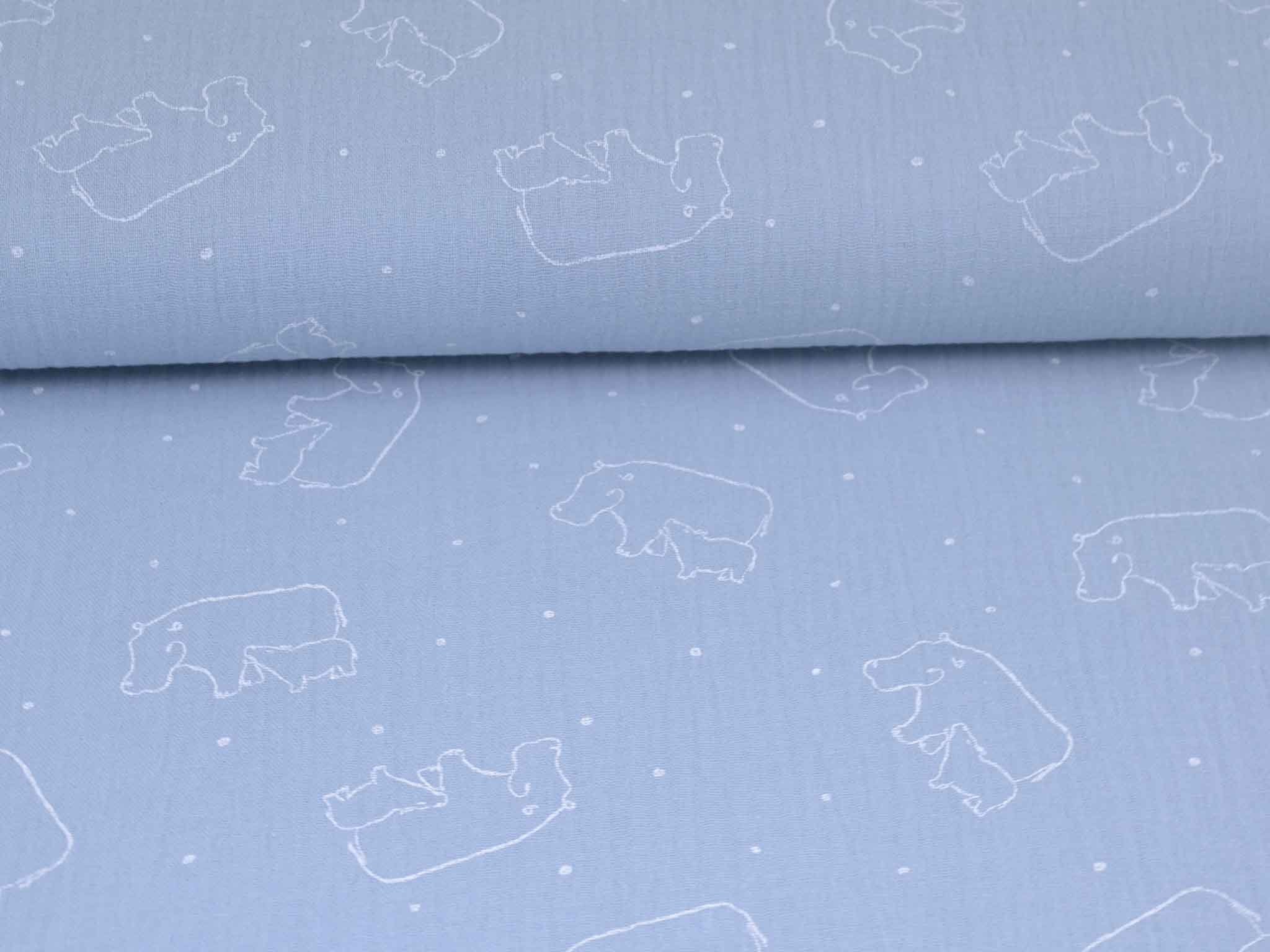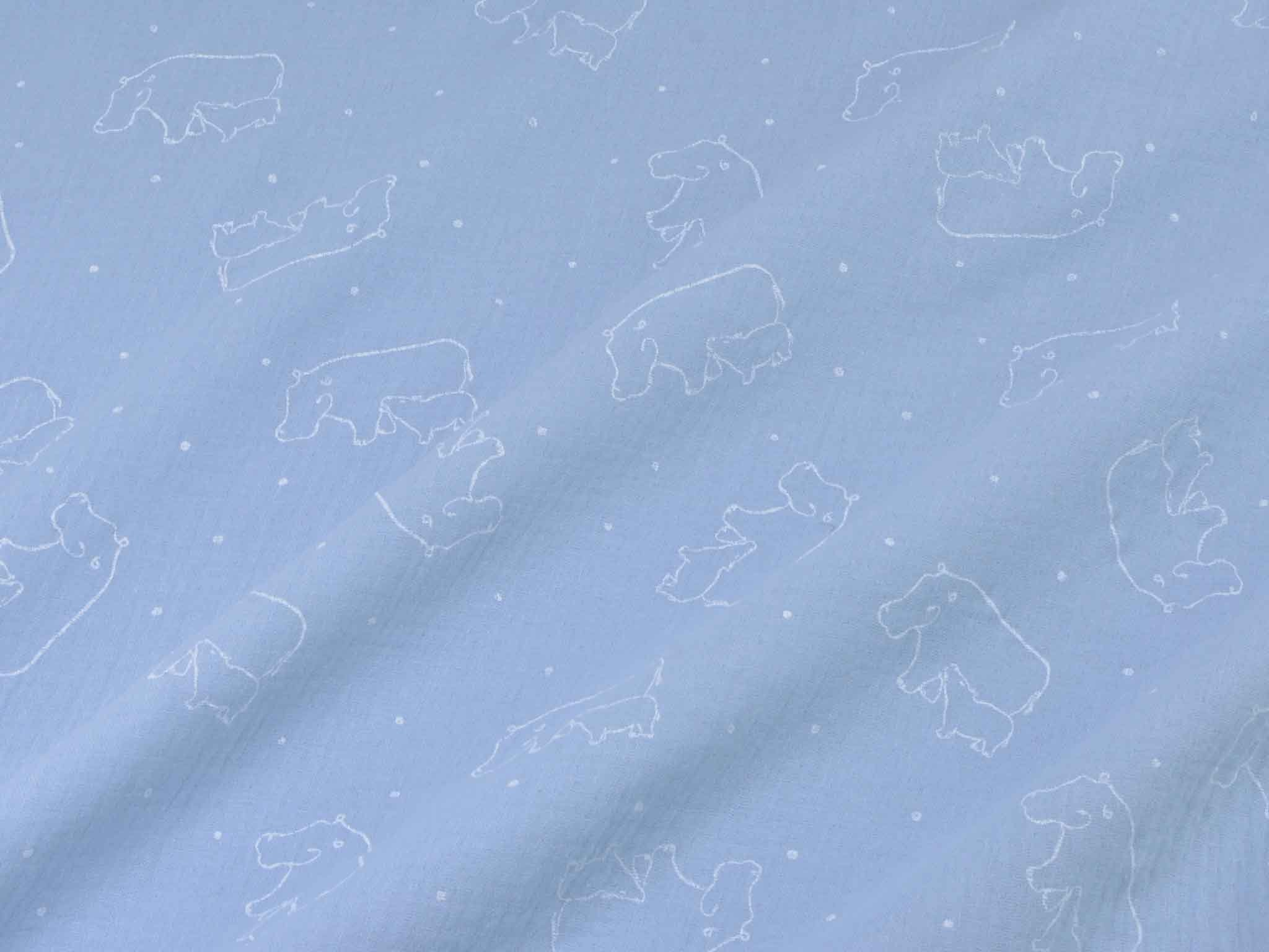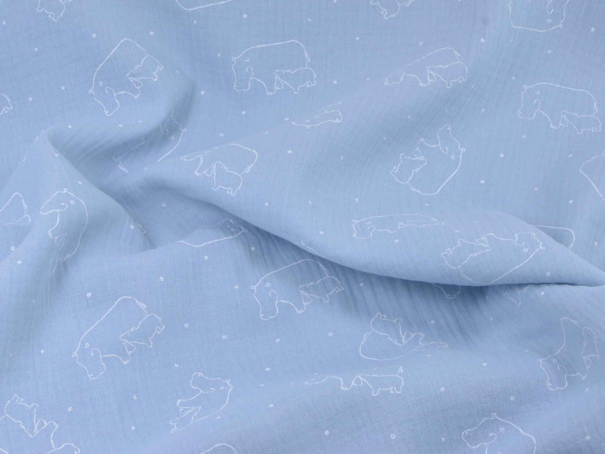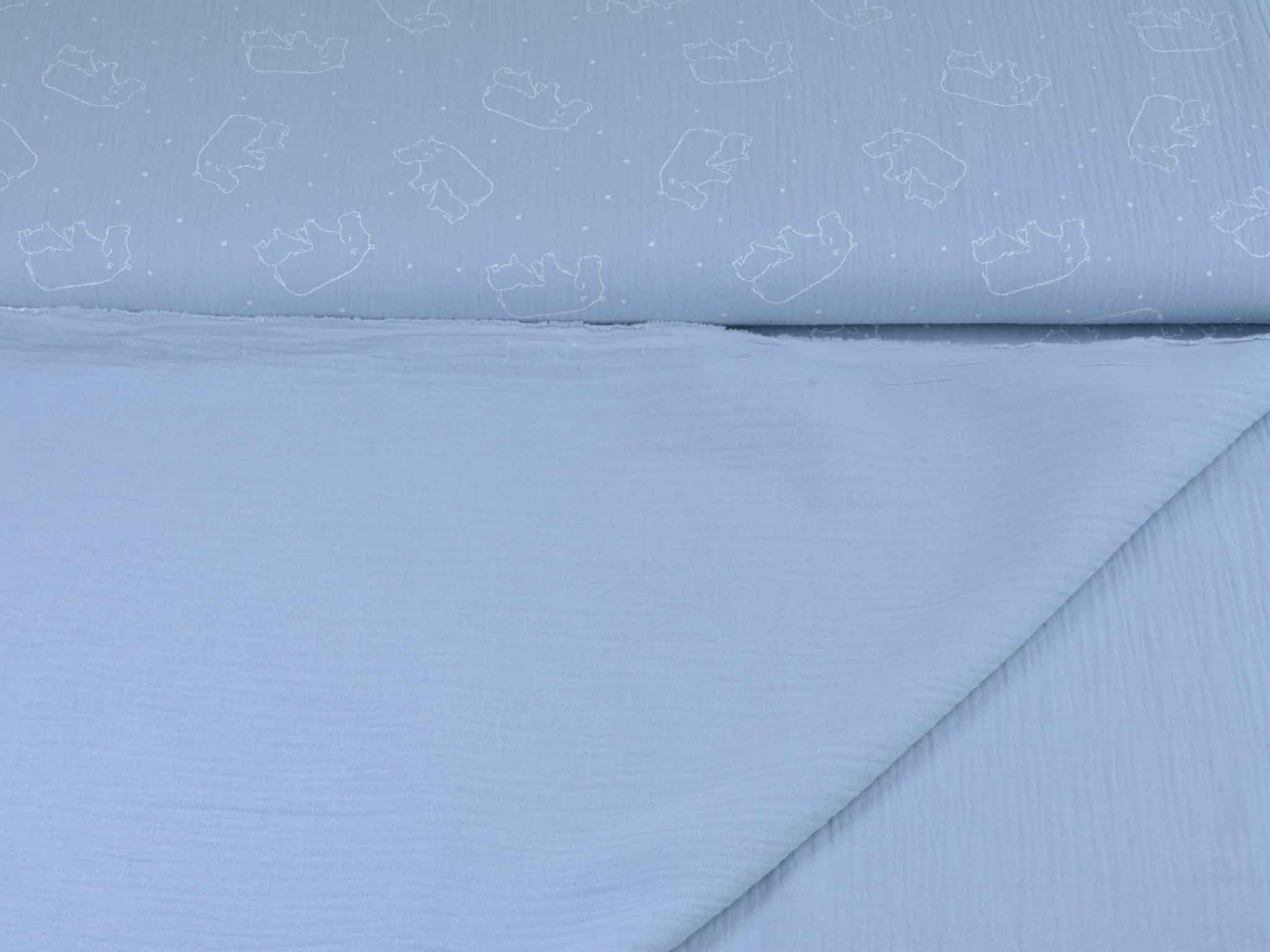 Musselin aus Baumwolle von Katia. Der Musselin ist hellblau mit weißen Nilpferden. Der Stoff ist dünn, fühlt sich sehr weich an und hat einen weichen Fall. Nähe dir daraus Kleider, Röcke, Hosen, Blusen, Kissen, Decken und vieles mehr.