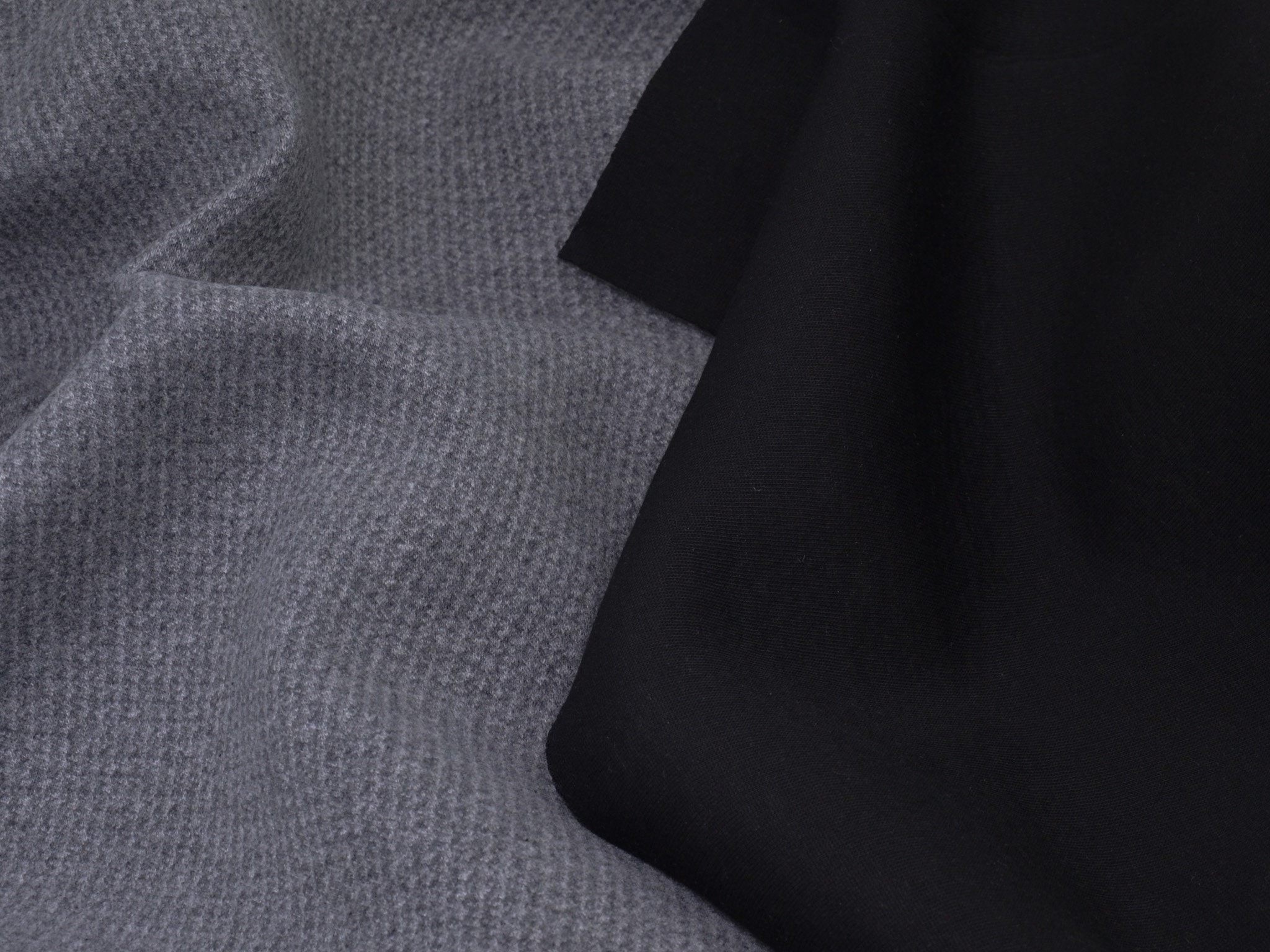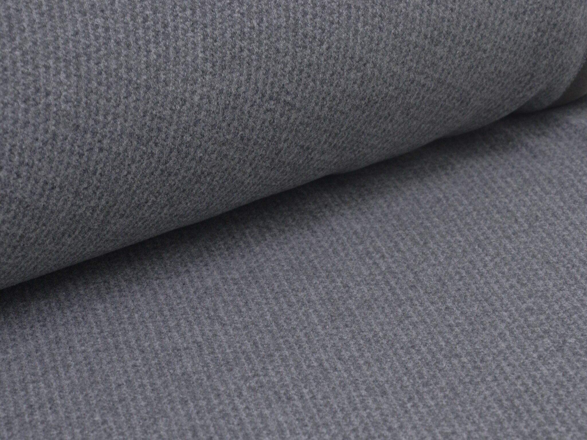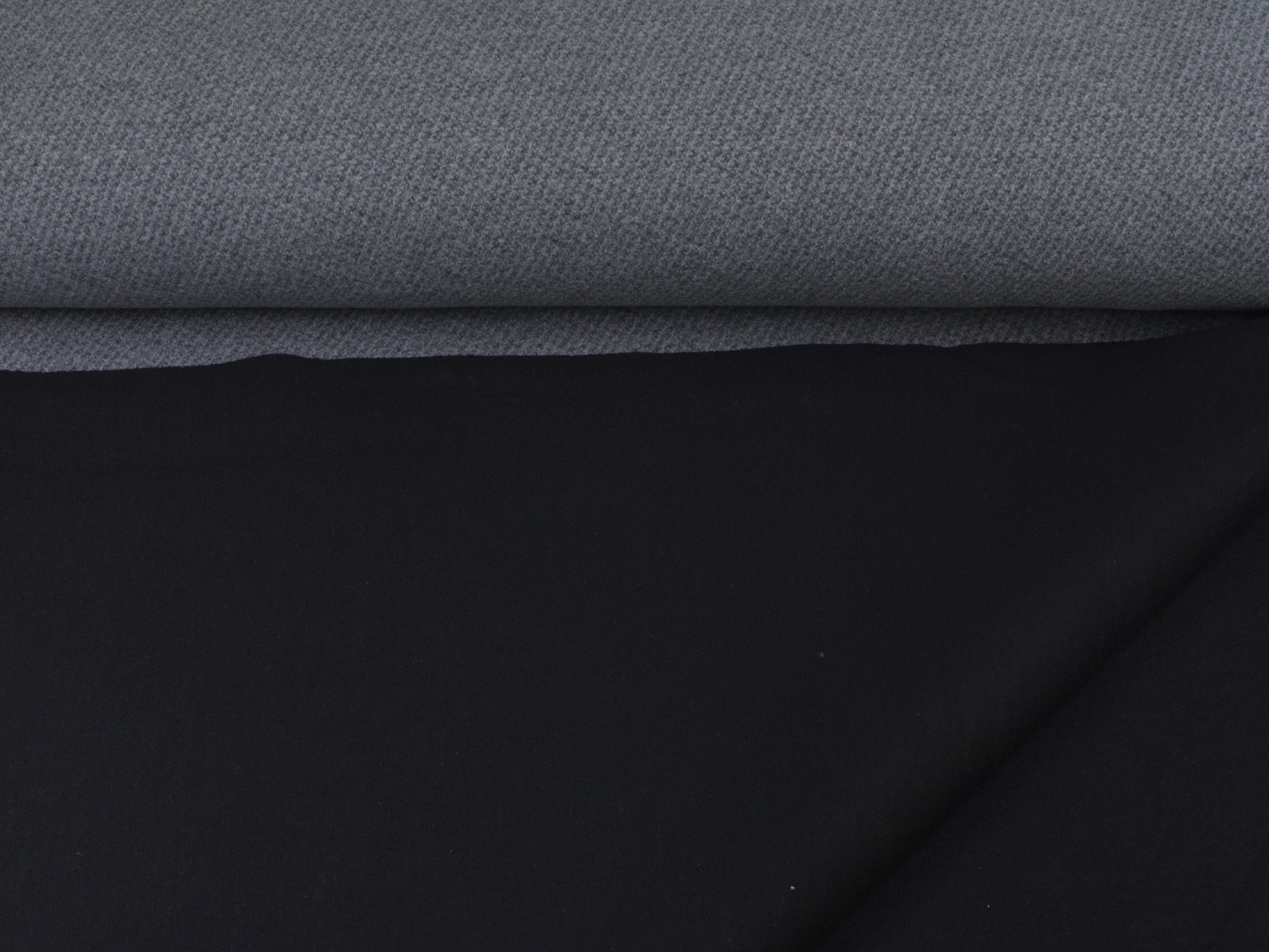 Einzigartiger Scuba in grau meliert. Der Stoff ist leicht und geschmeidig. Er fühlt sich weich an. Die rechte Stoffseite ist grau meliert, die linke Stoffseite ist glatt, uni schwarz. Der Stoff eignet sich wunderbar zum Nähen von Sportbekleidung, denn er ist leicht und atmungsaktiv