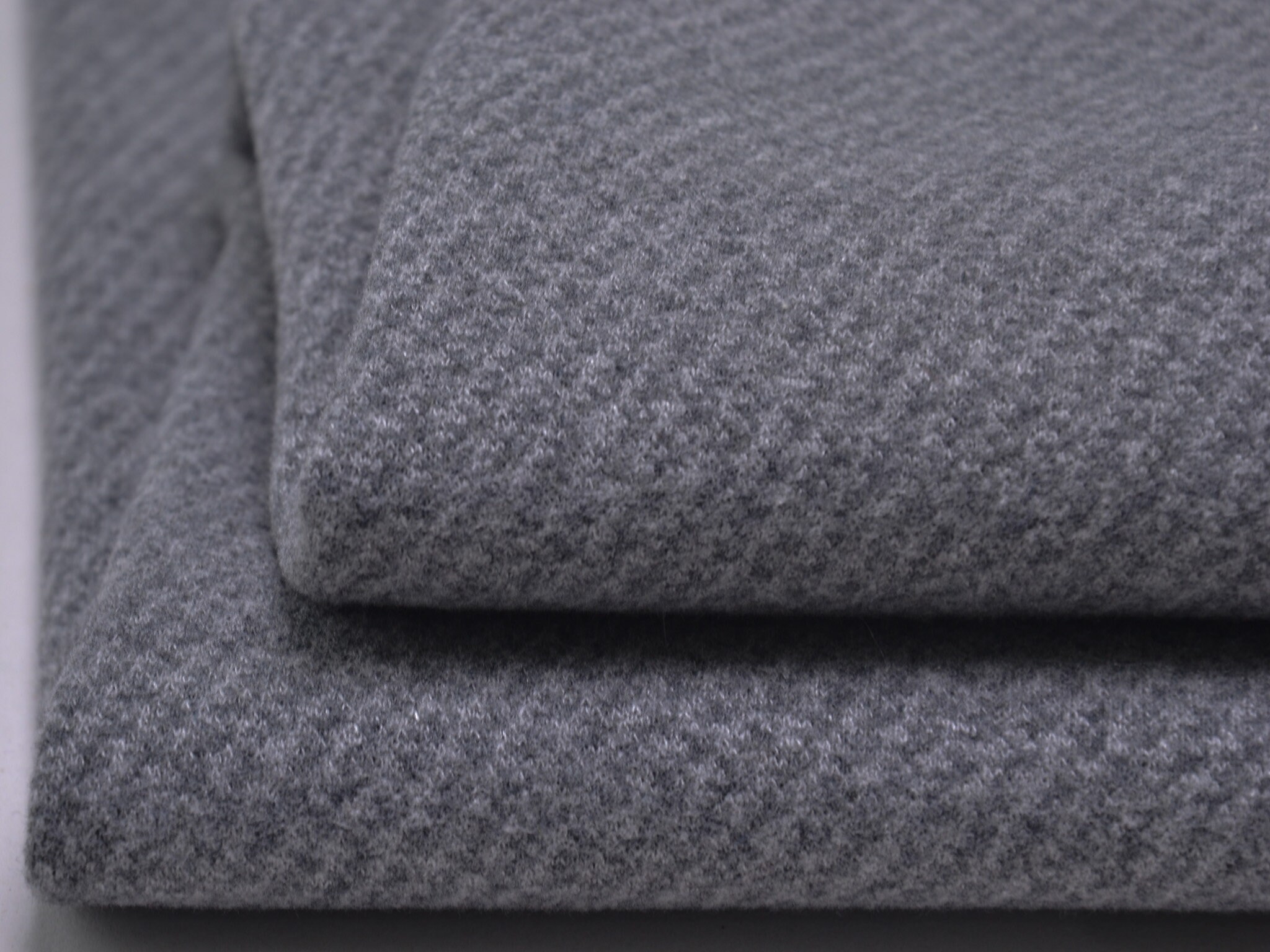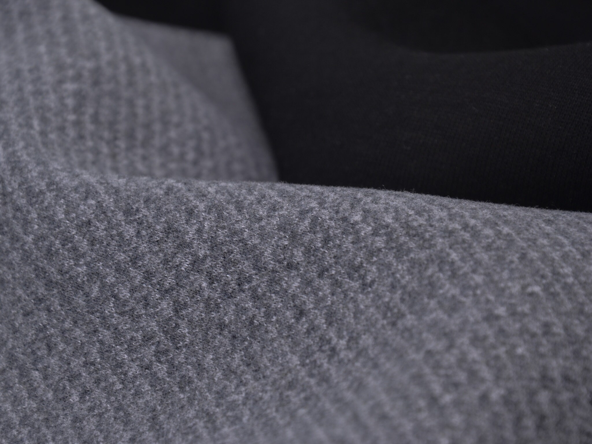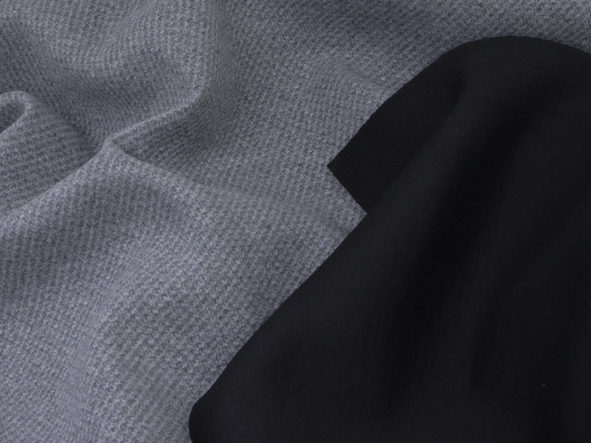 Einzigartiger Scuba in grau meliert. Der Stoff ist leicht und geschmeidig. Er fühlt sich weich an. Die rechte Stoffseite ist grau meliert, die linke Stoffseite ist glatt, uni schwarz. Der Stoff eignet sich wunderbar zum Nähen von Sportbekleidung, denn er ist leicht und atmungsaktiv